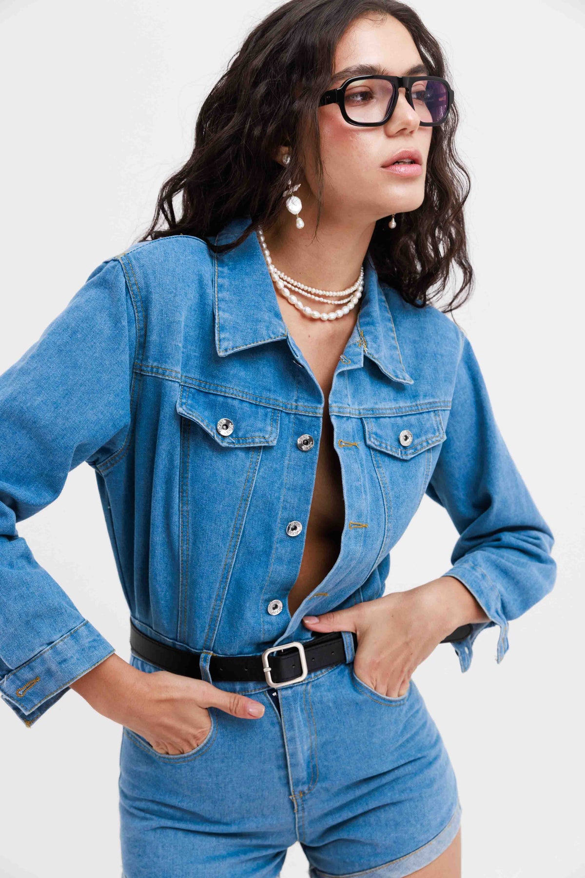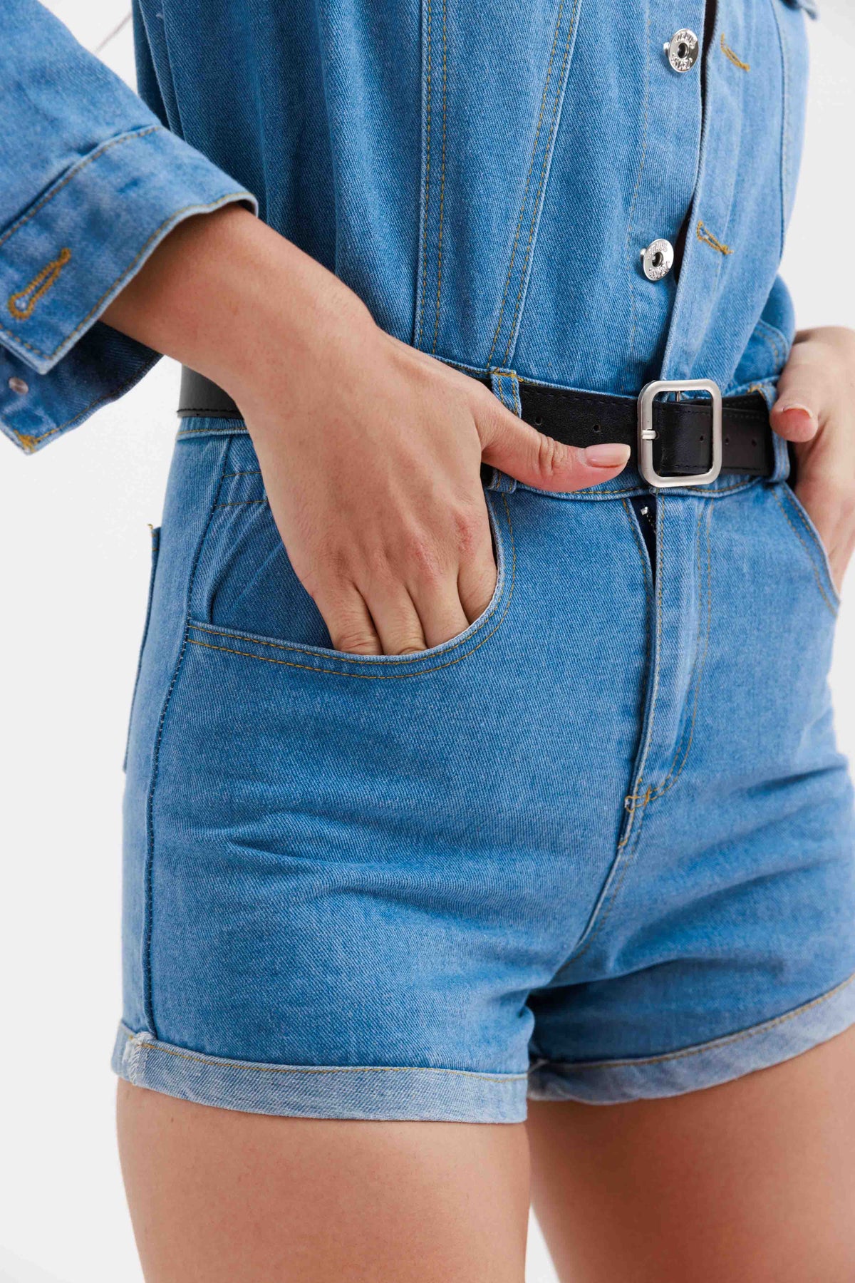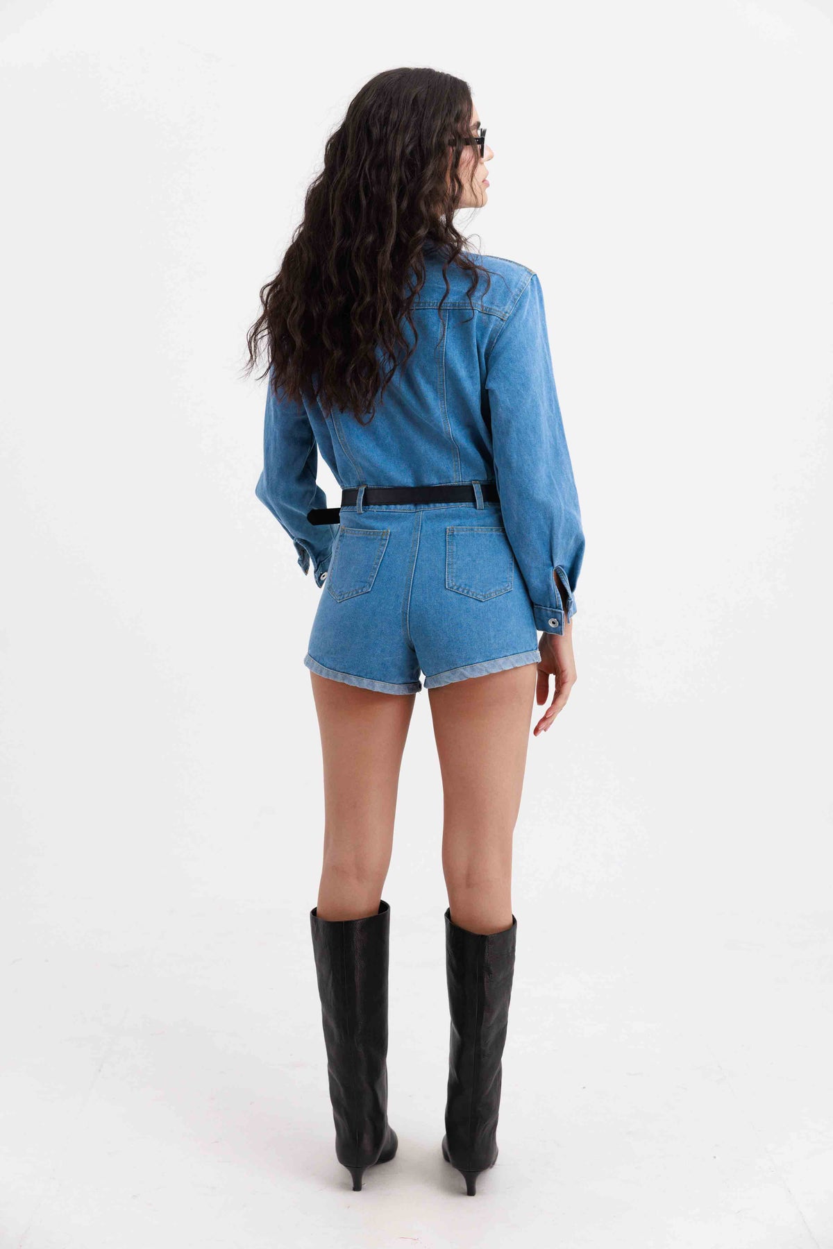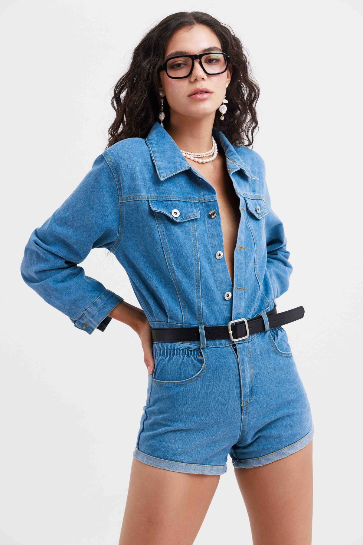 אוברול דנים שרוול ארוך ומכנסיים קצרים בגזרה מחויטת, עשוי מבד ג׳ינס נעים בגוון כחול