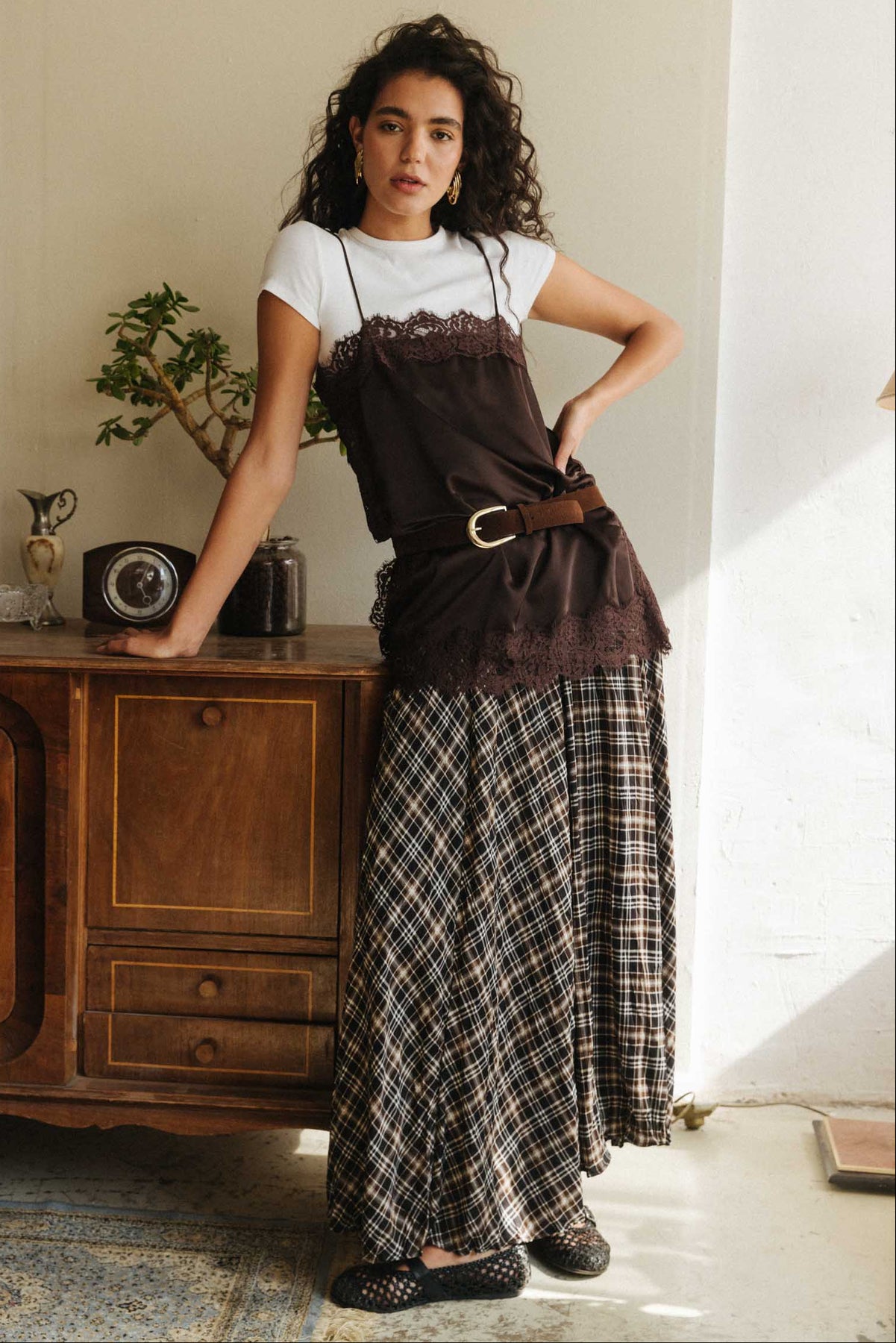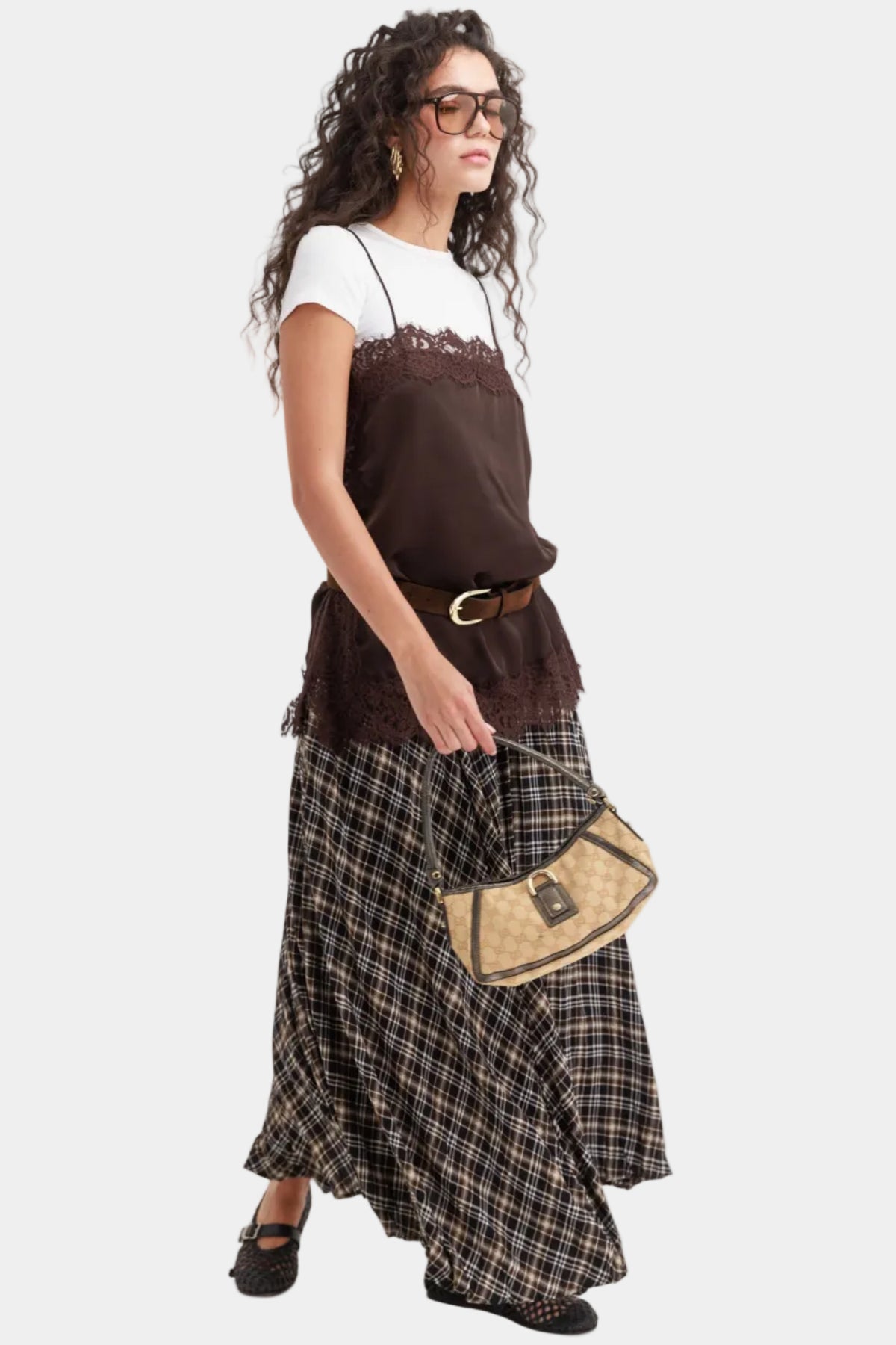 גופיית כתפיות עדינה עם שילובי תחרה בחלק העליון והסיומת, בגזרה רפויה ונשפכת.