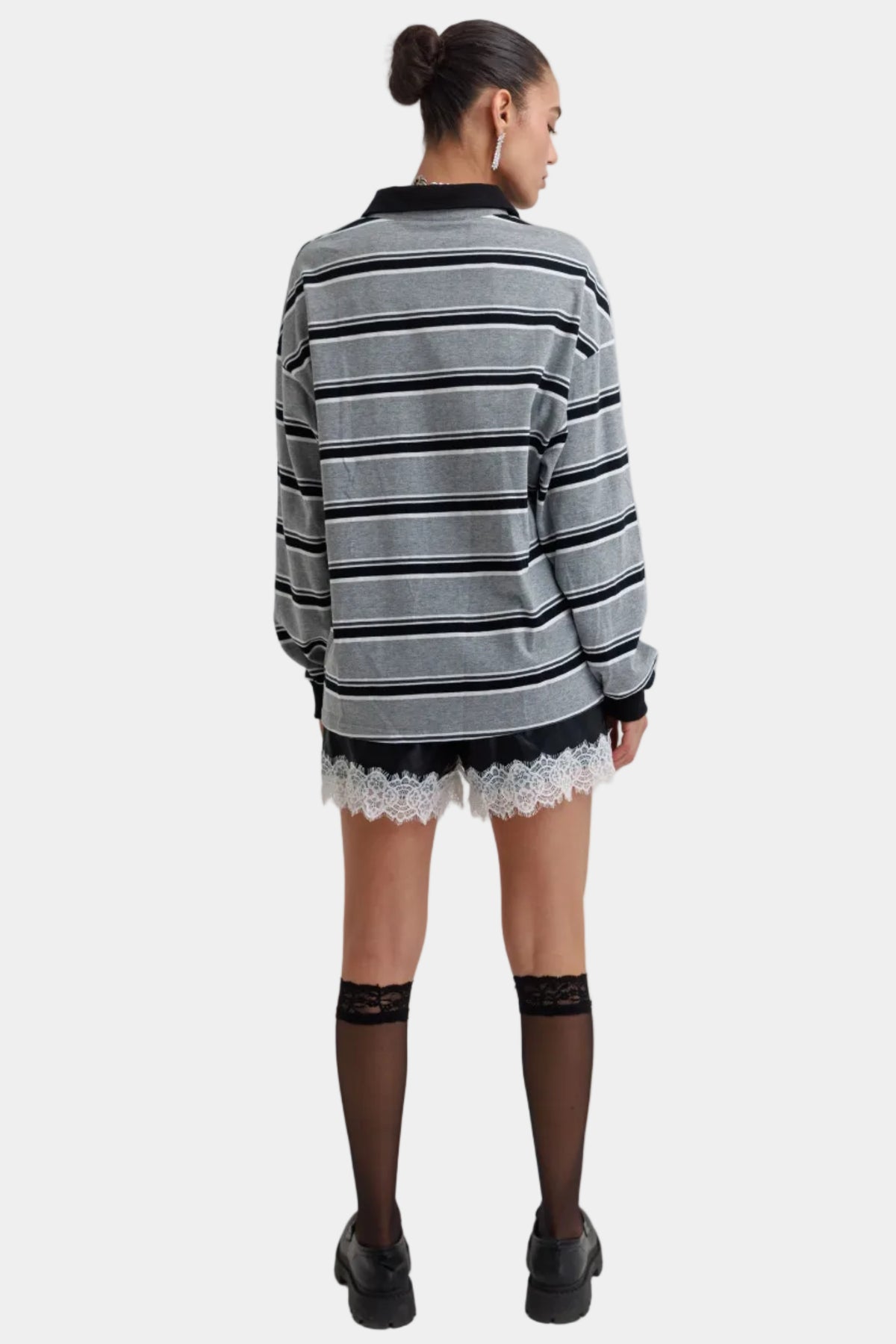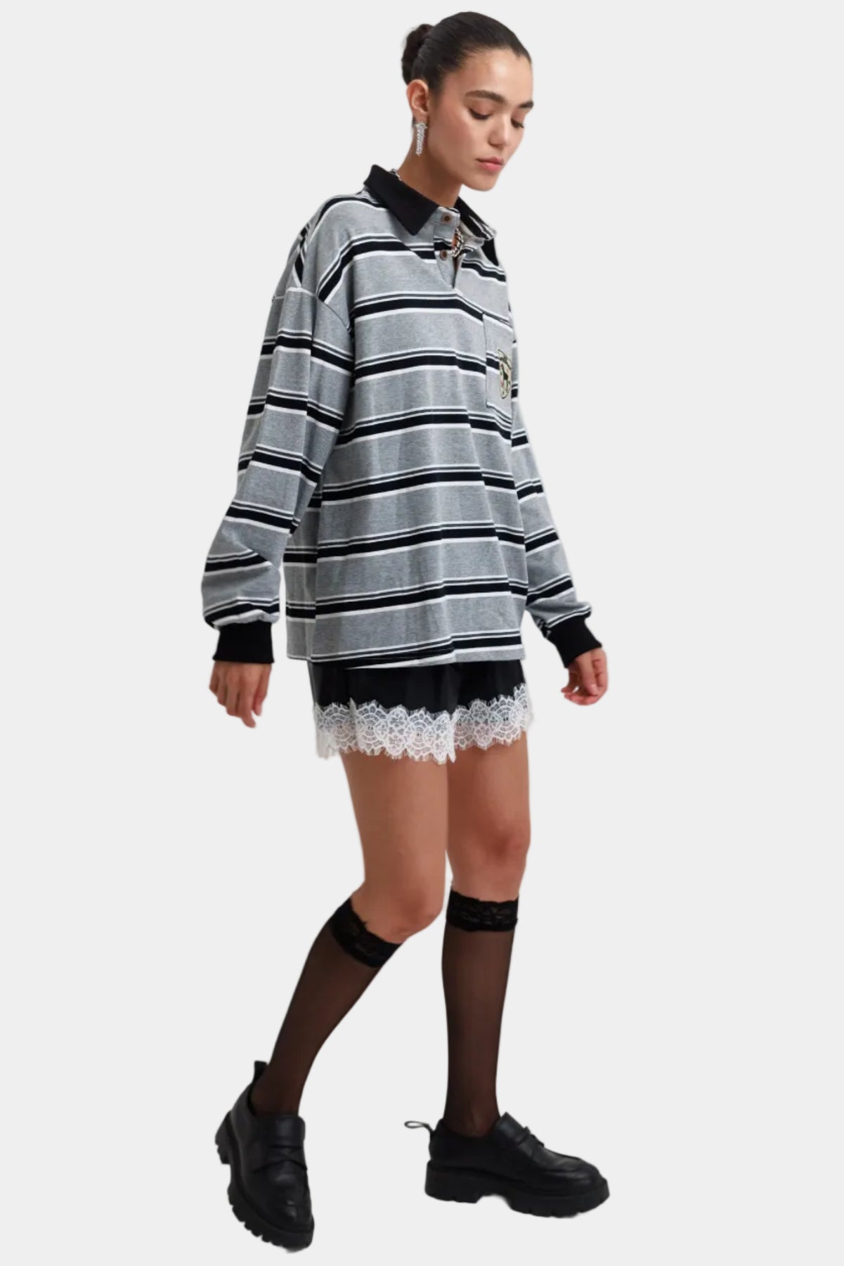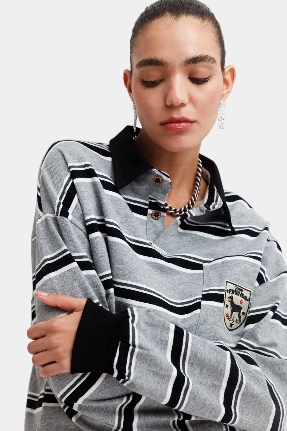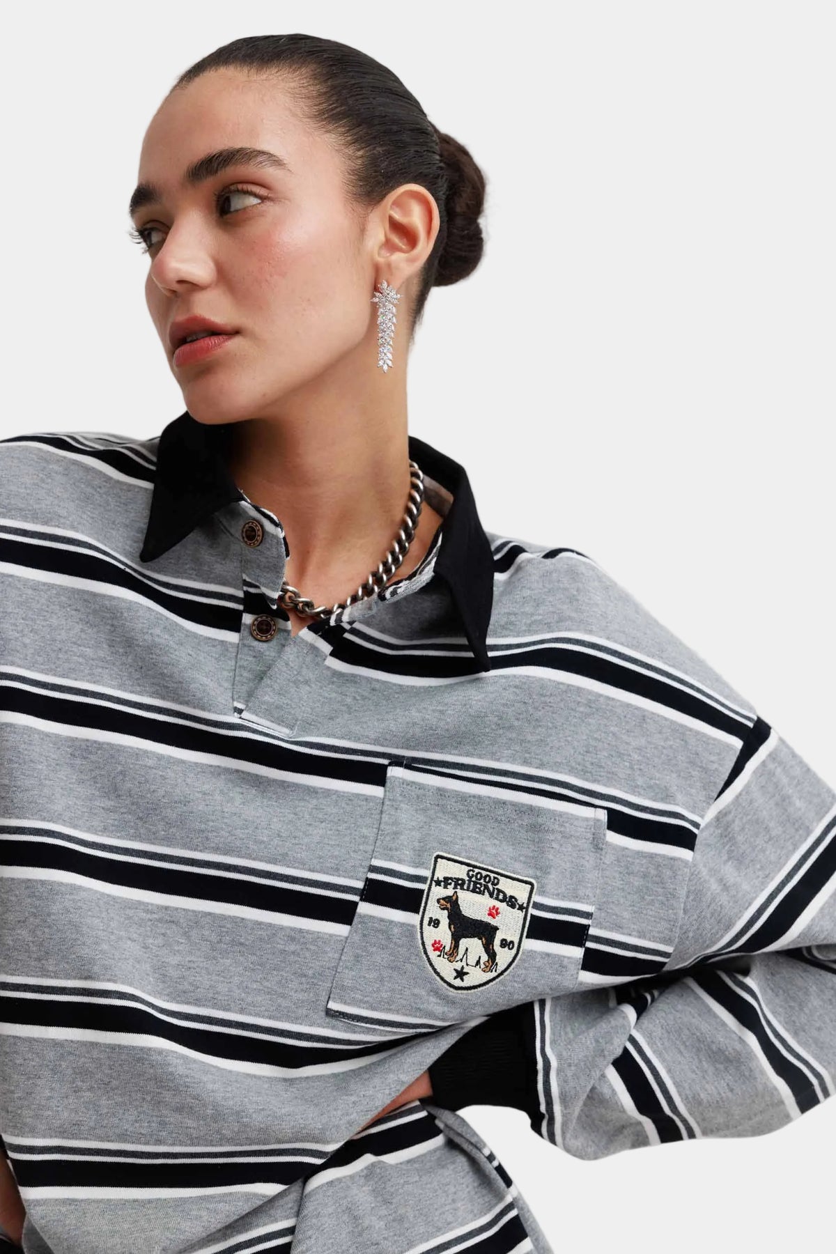 חולצת פולו פסים בגזרה משוחררת עם צווארון וכפתורים, לוק קז׳ואל-רטרו ונוח ליום-יום.