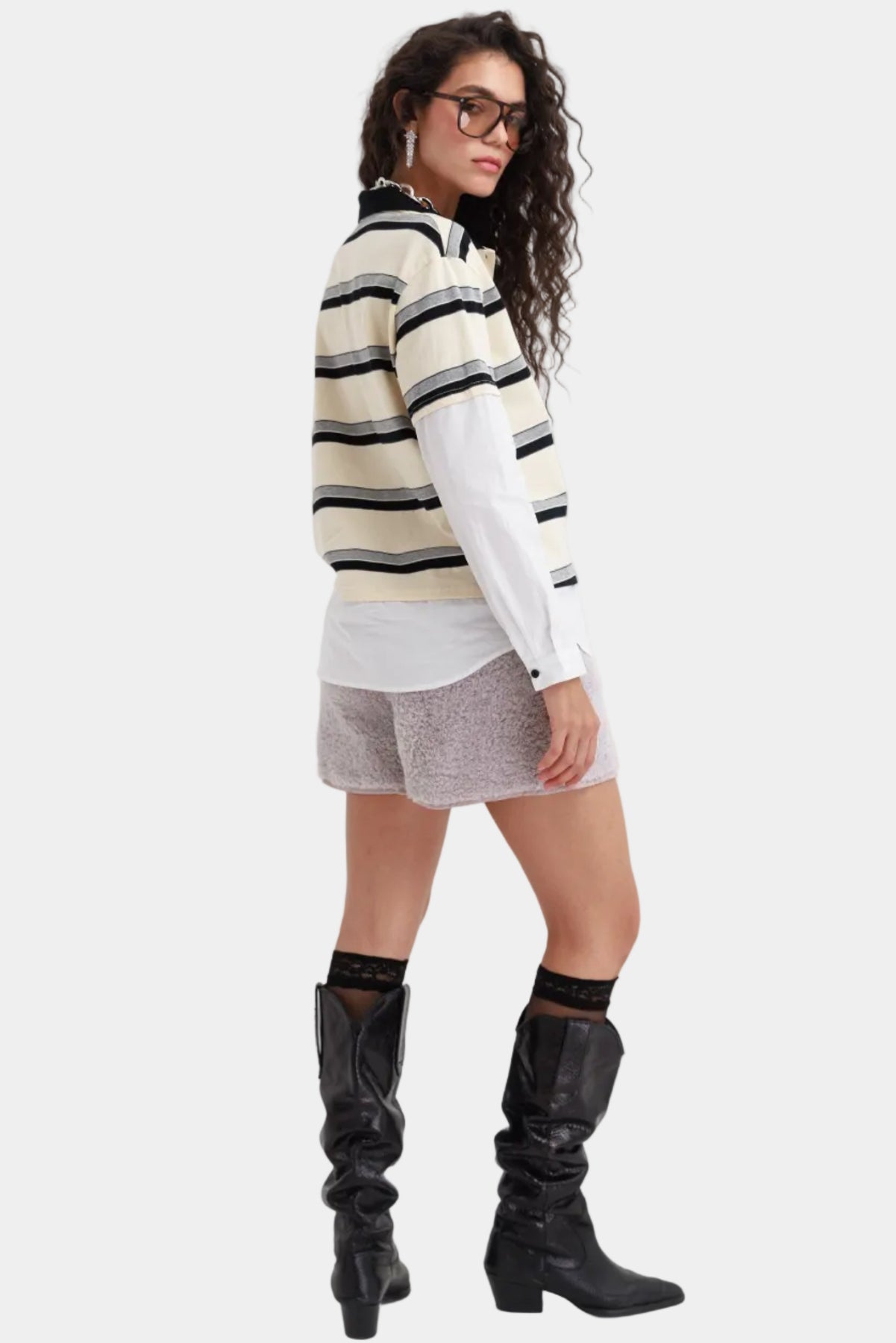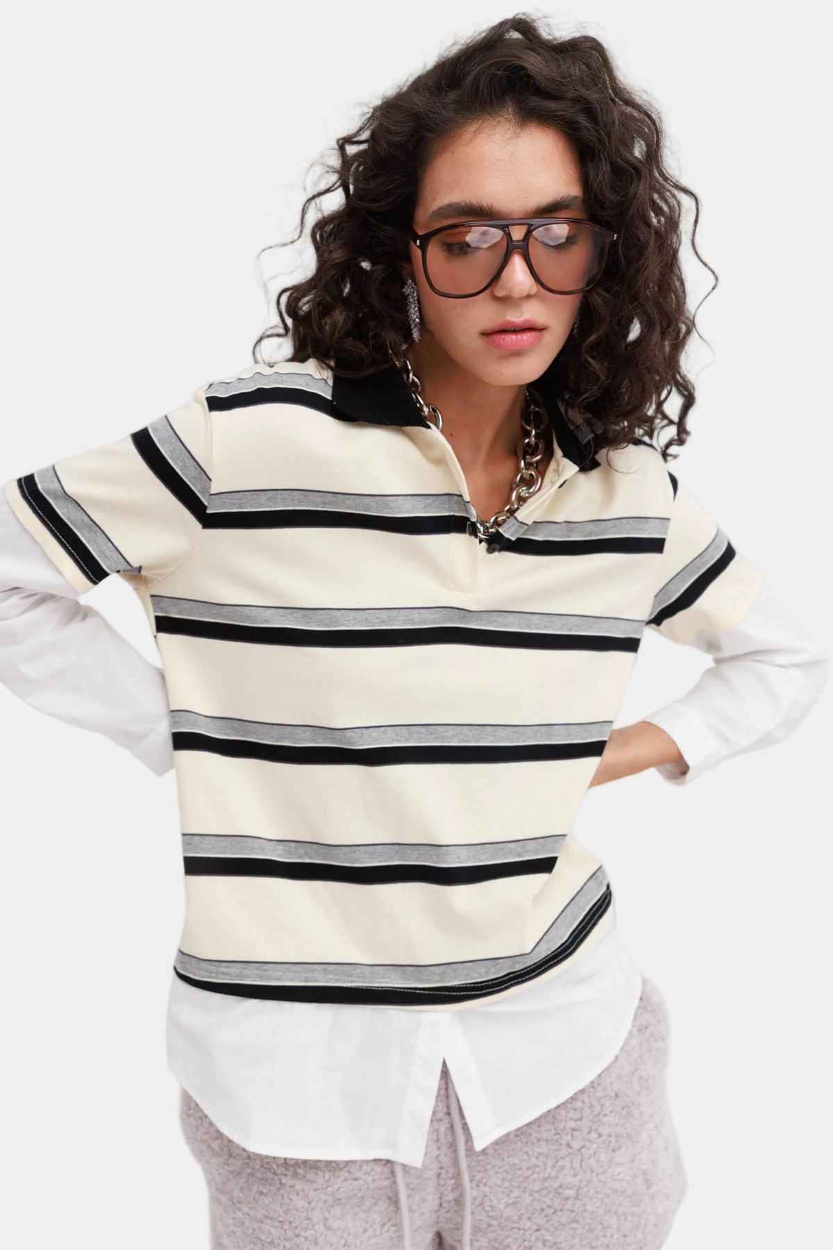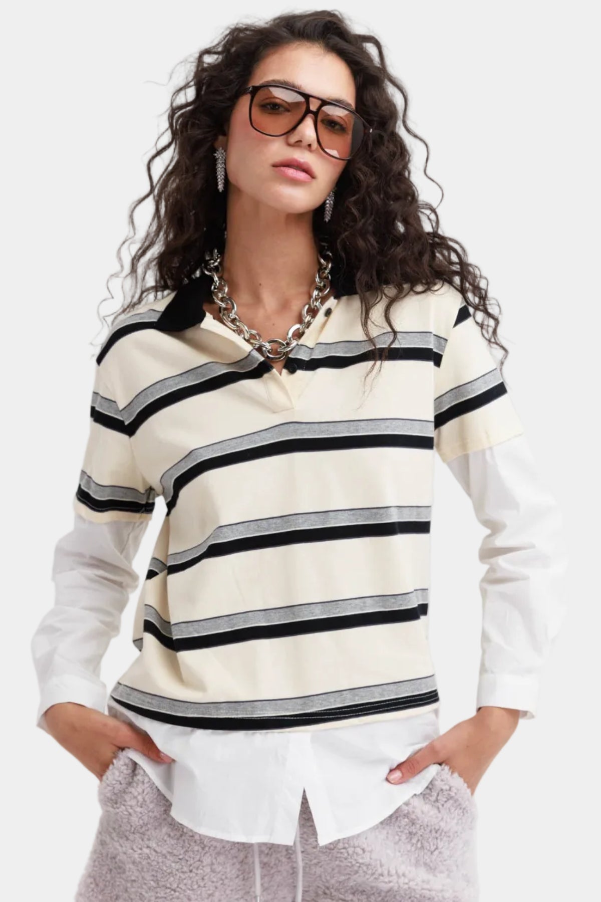 חולצה בגזרת שכבות עם מראה פולו מפוספס, שילוב שרוולים וחלק תחתון במראה חולצה מכופתרת ללוק ייחודי ומעודכן.