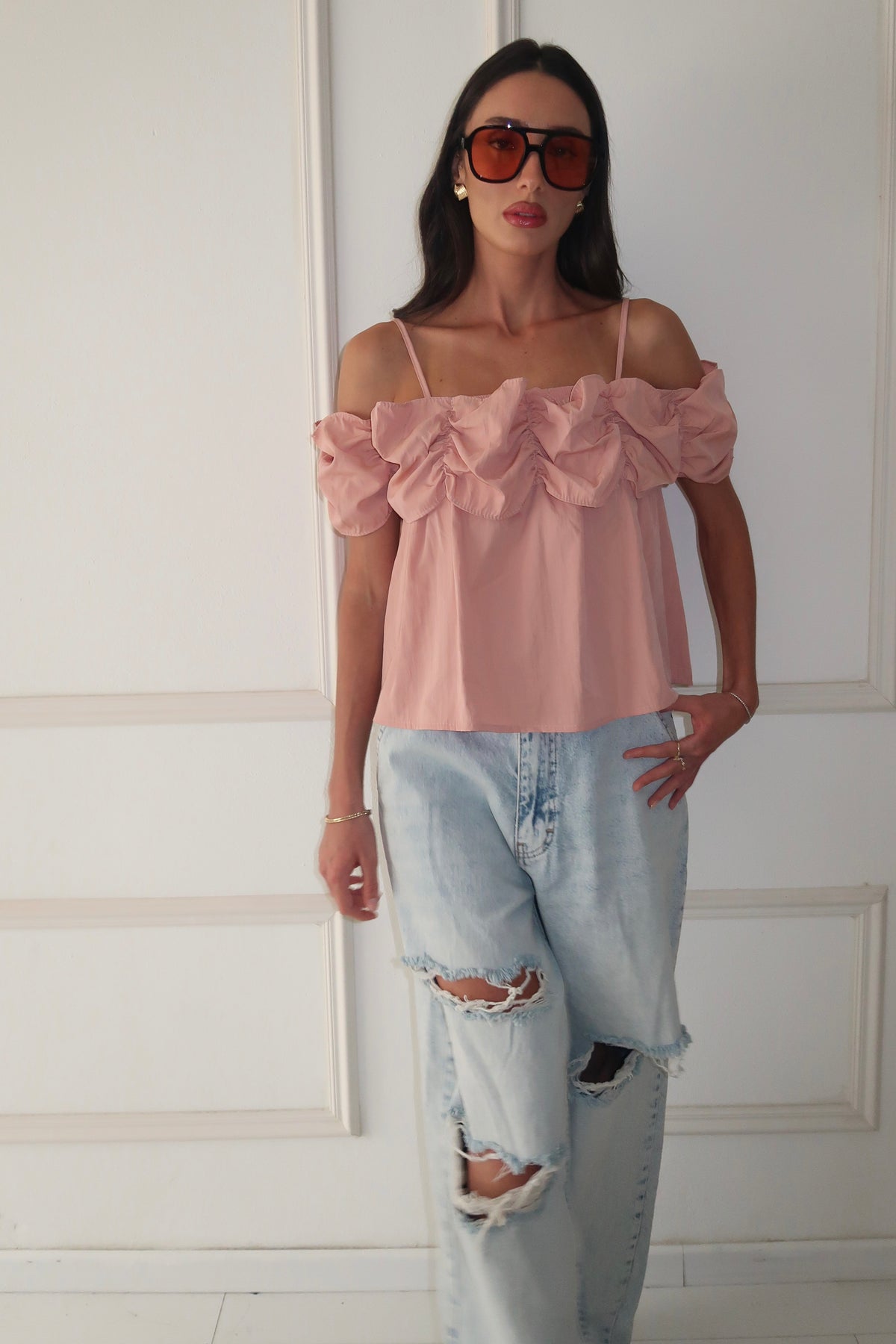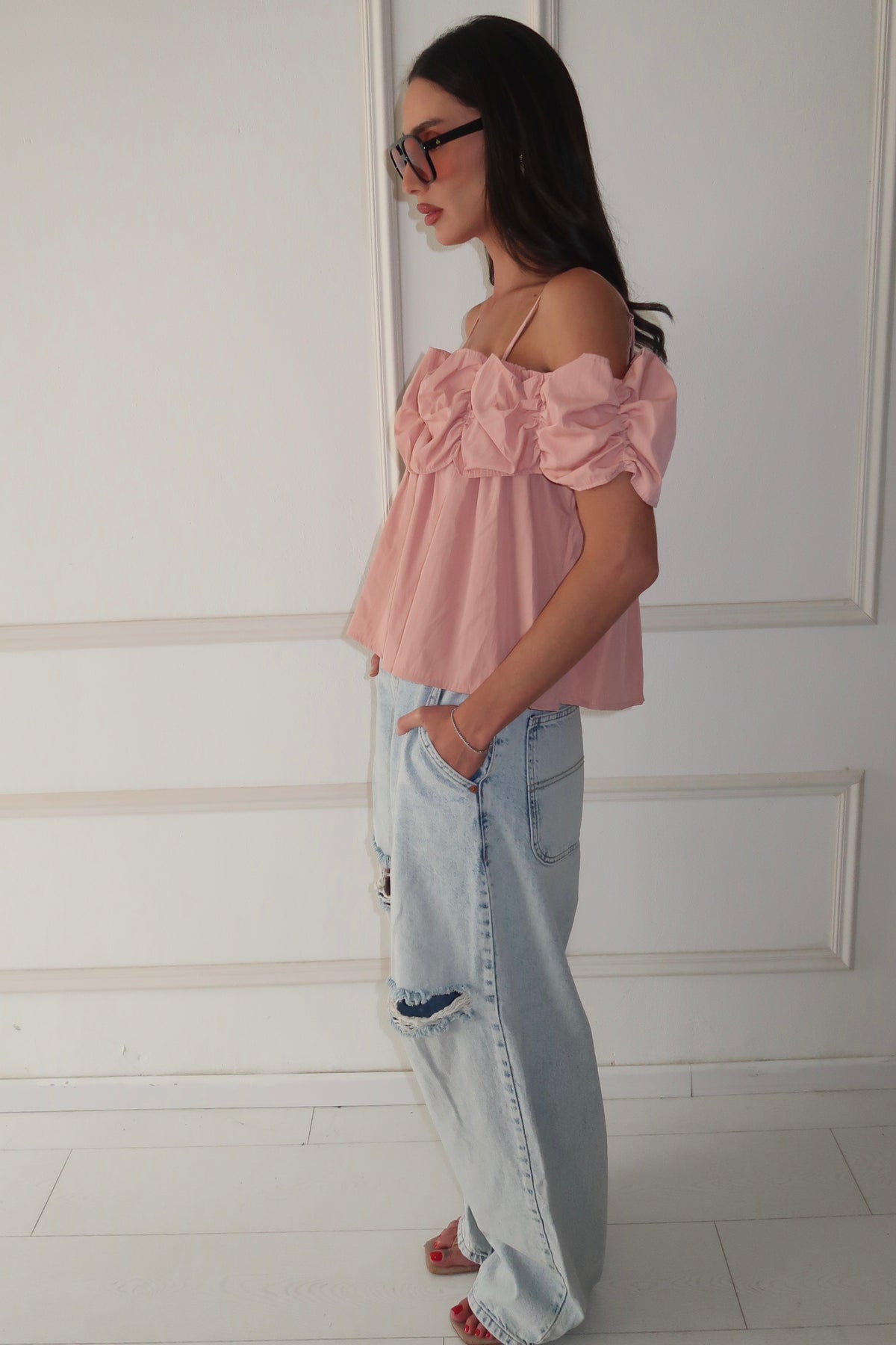 מתיקות עם טוויסט. טופ ורוד עם רפלסים דרמטיים + דנים משוחרר וקרוע = הלוק האורבני המנצח. 🌸
