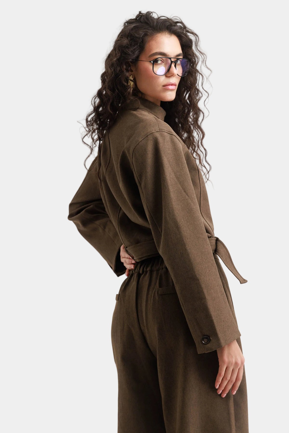 חליפה בגזרה משוחררת עם ז’קט קצר ומכנסי ברמודה רחבים למראה מודרני ונקי.