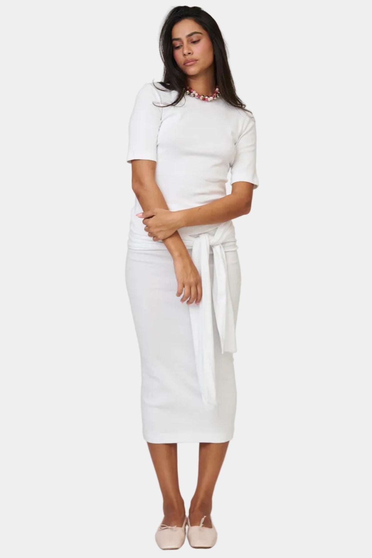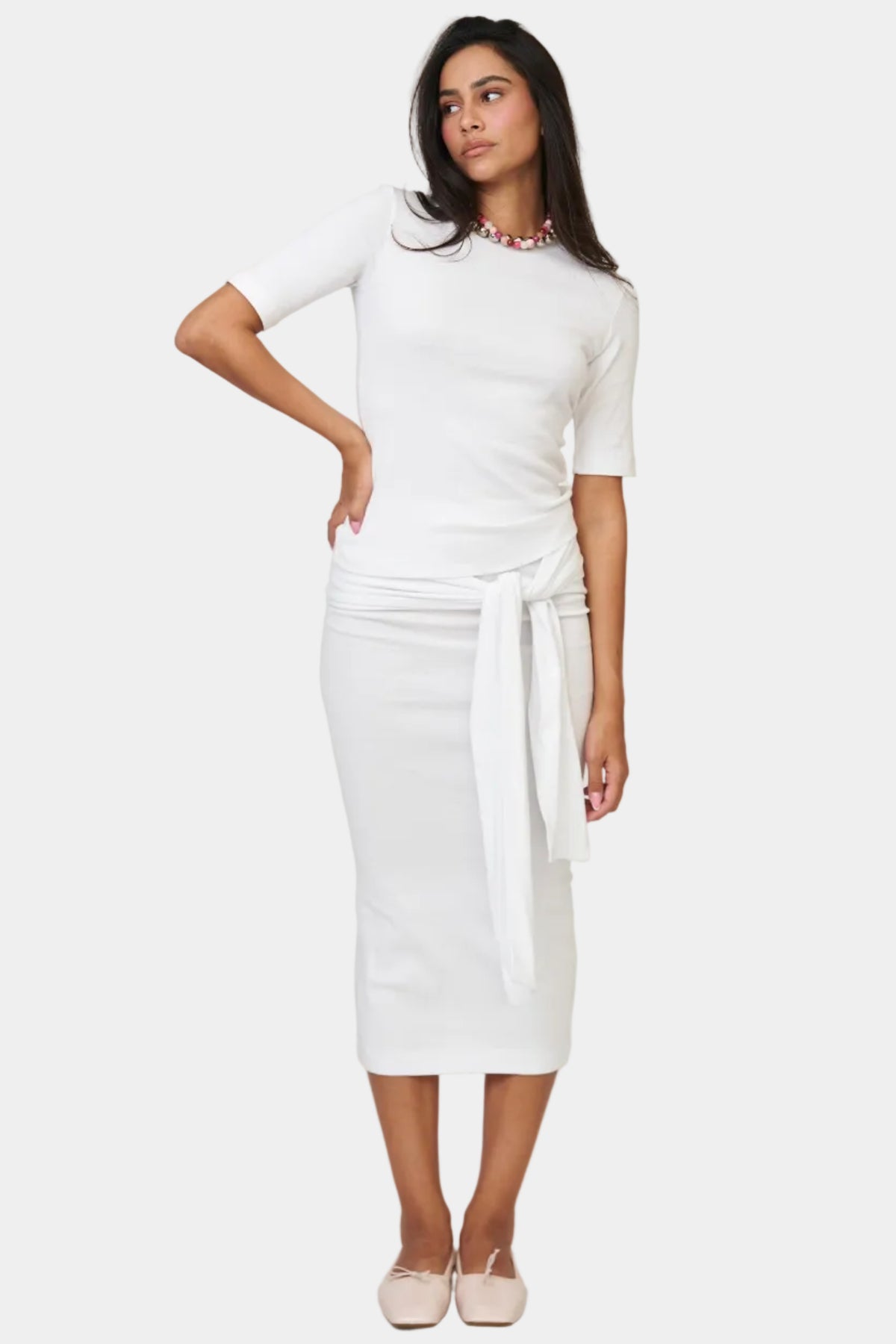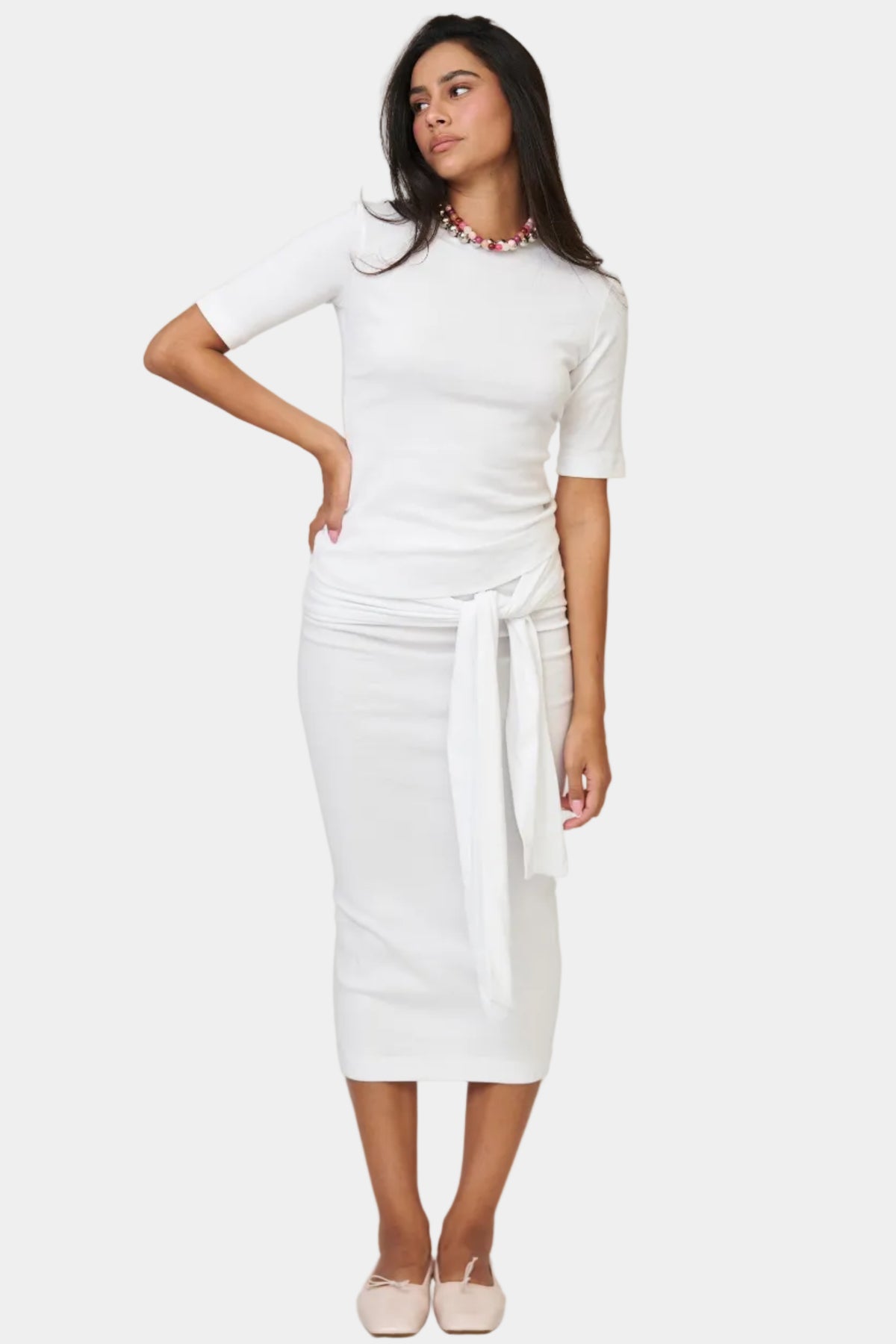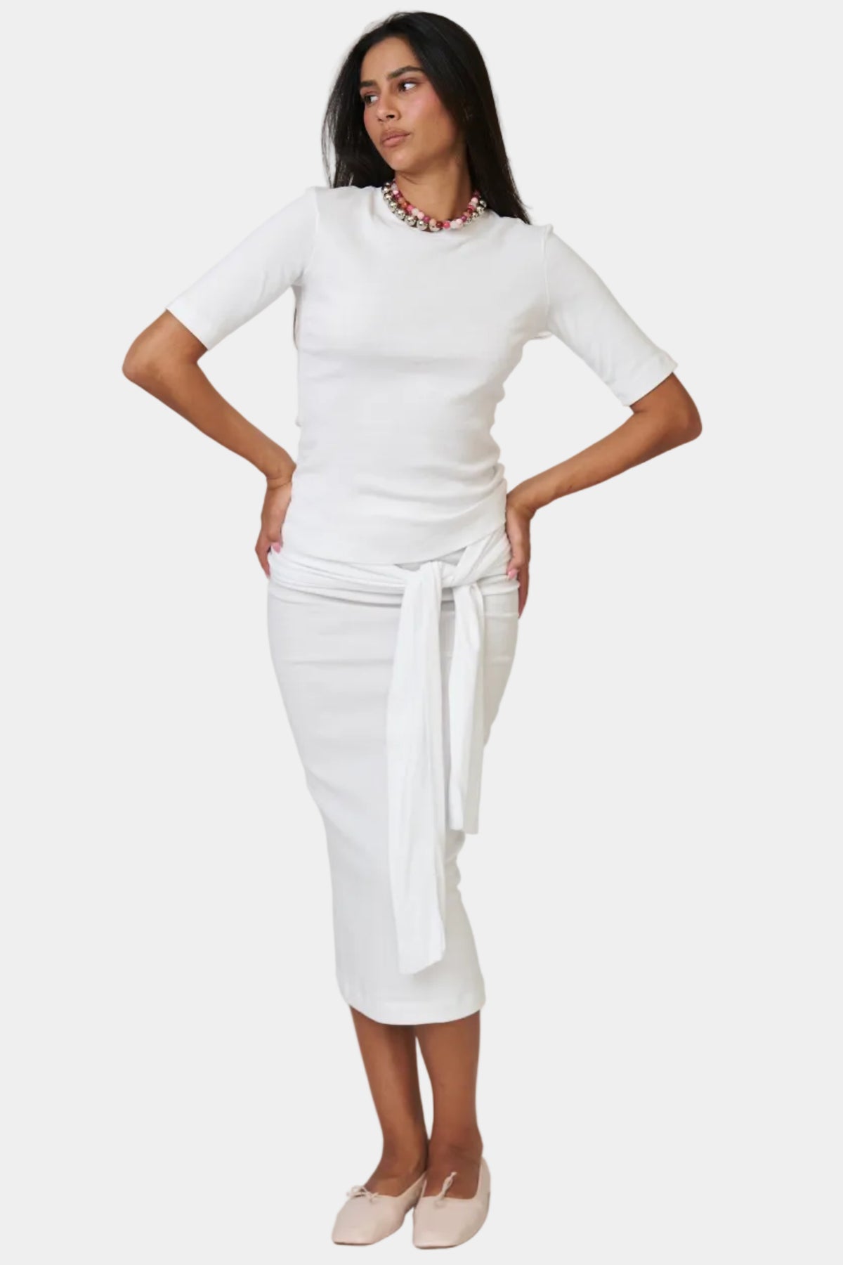 חליפת חצאית בגזרה נקייה עם טופ תואם, קשירה בצד ומראה אלגנטי ומדויק.
