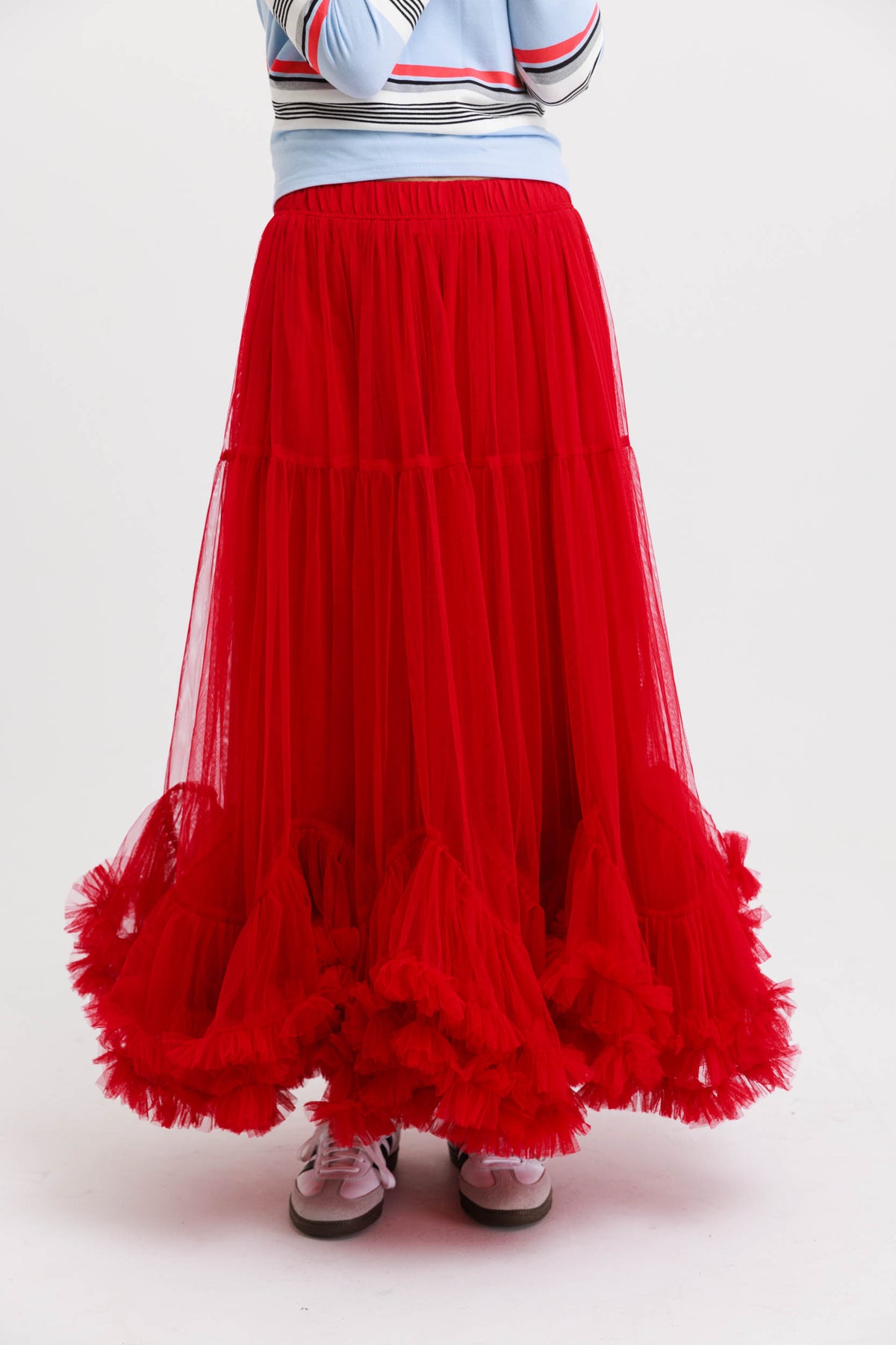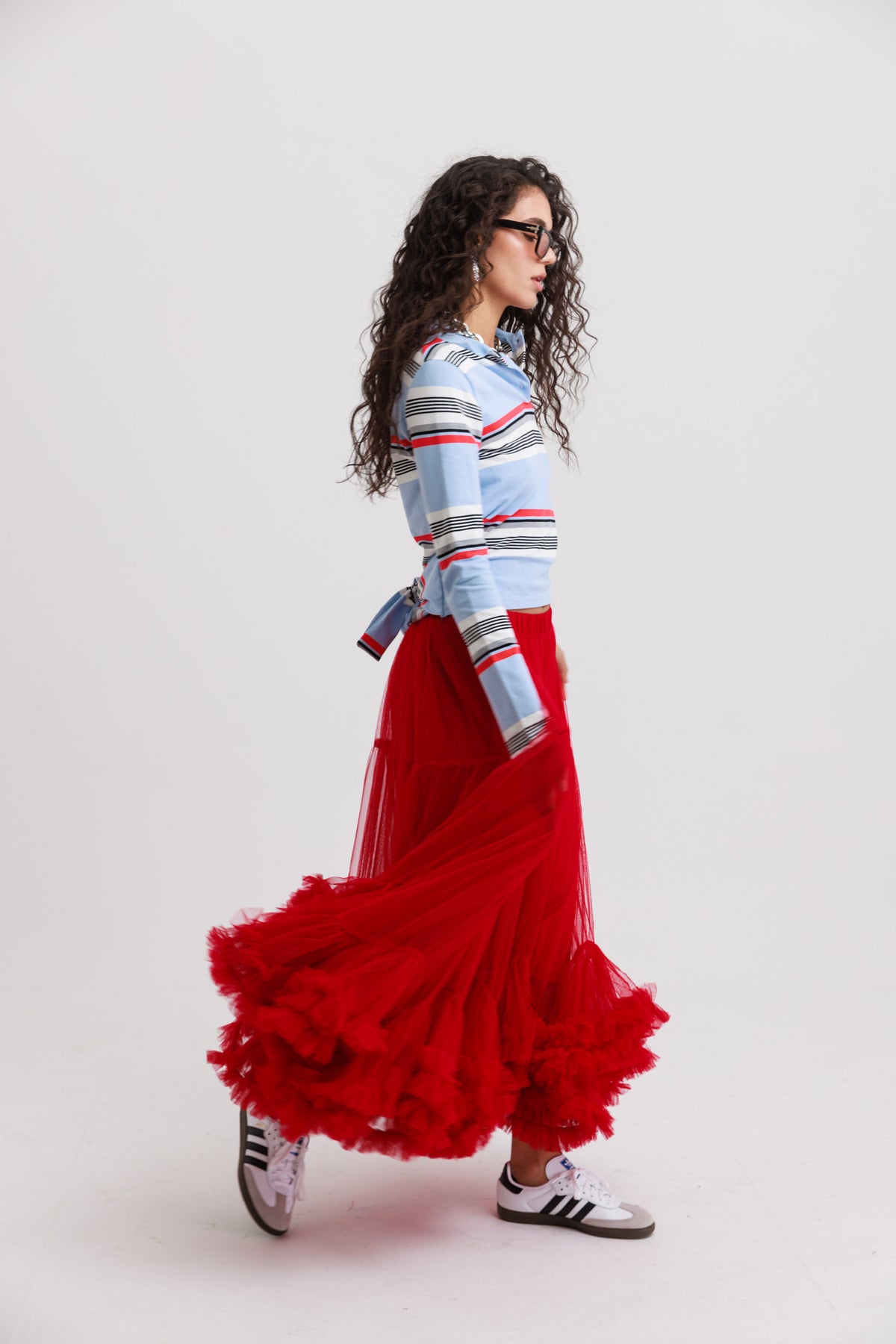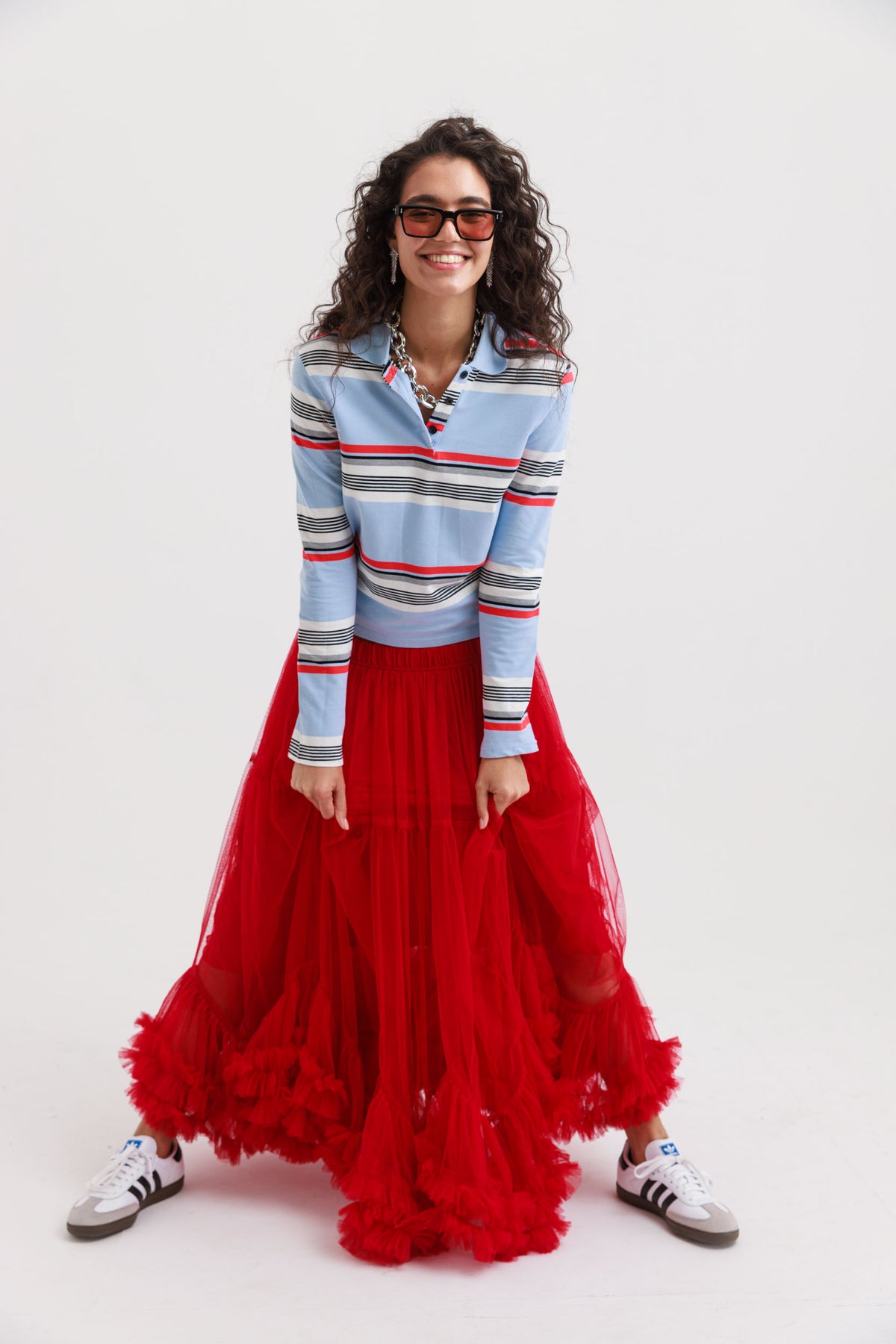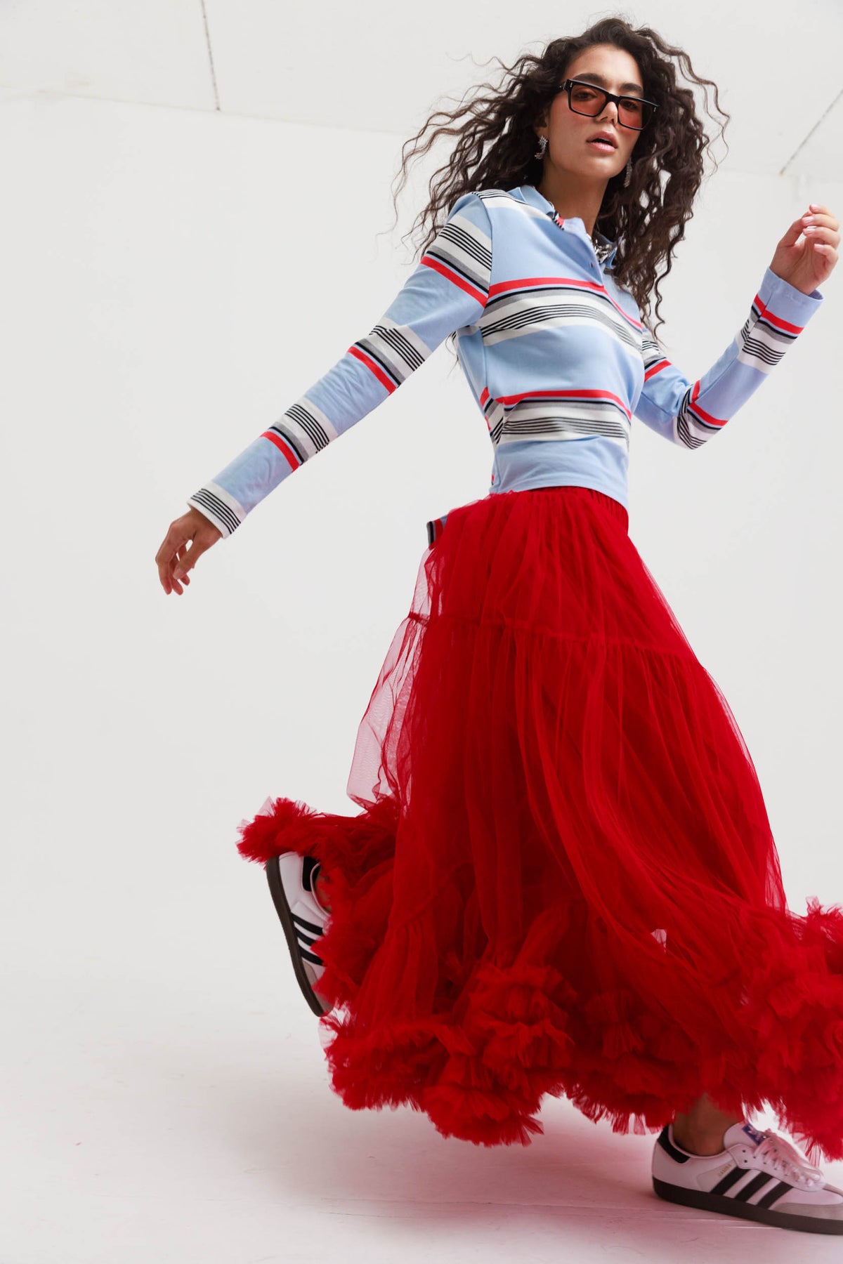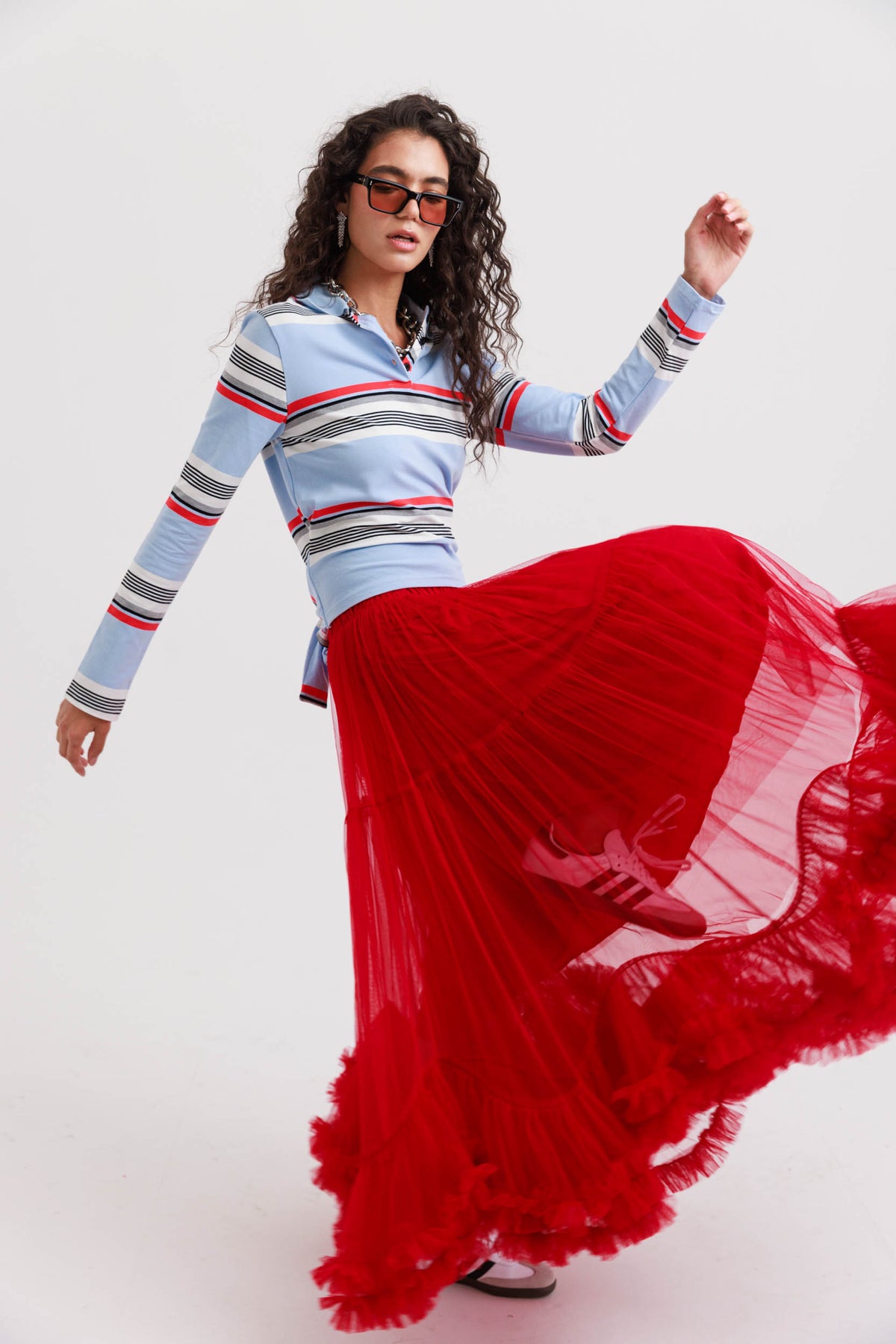 חצאית טול ארוכה עם שכבות עשירות בגזרה נשפכת בעלת נפח מרשים שמעניק תנועה ועניין