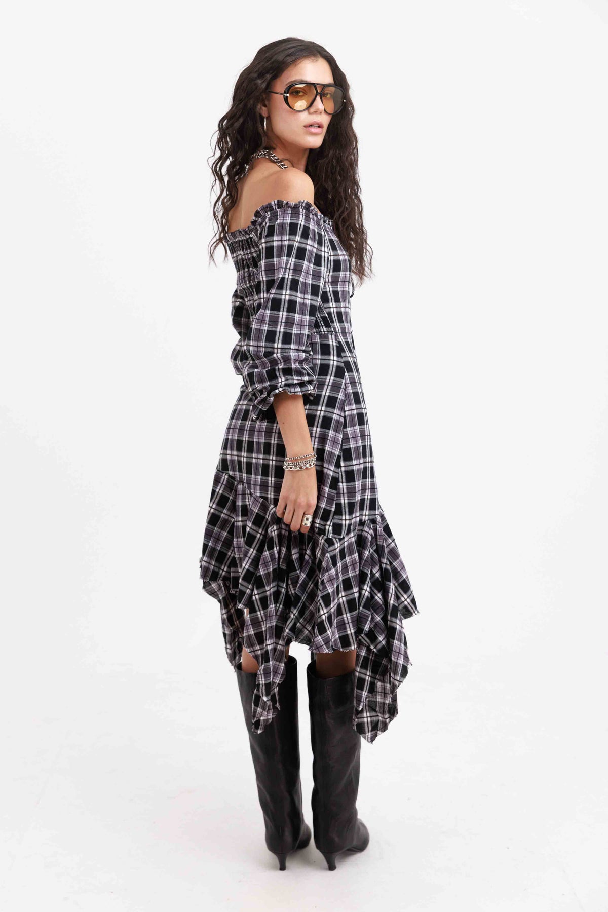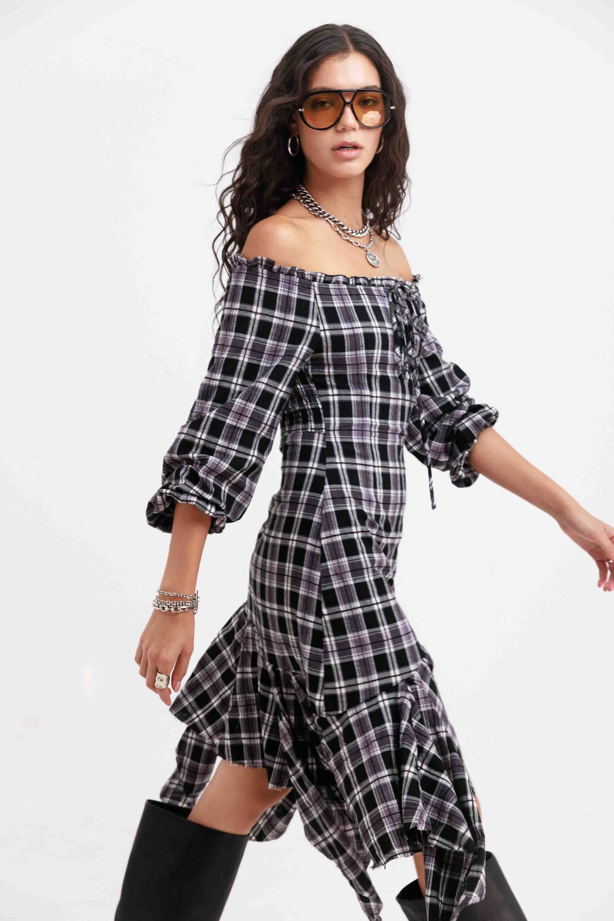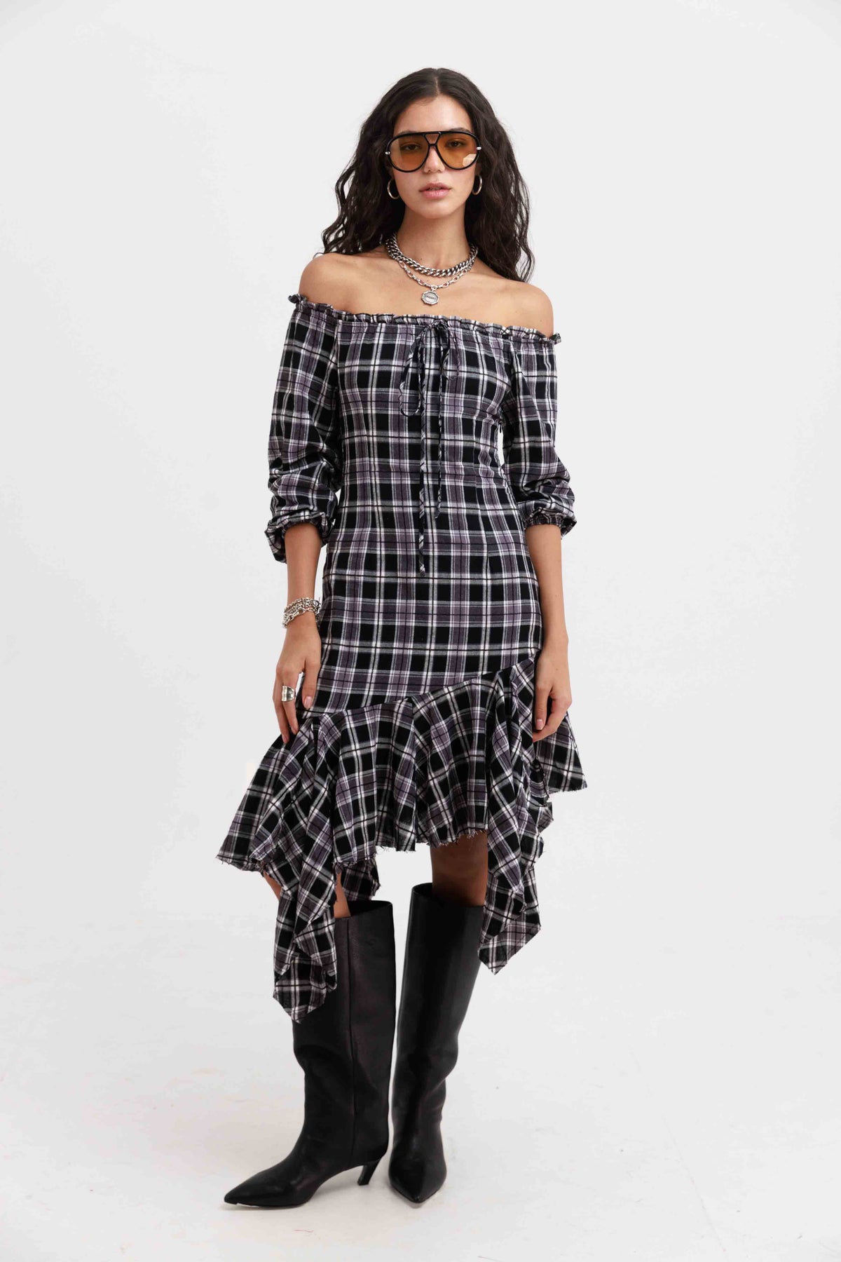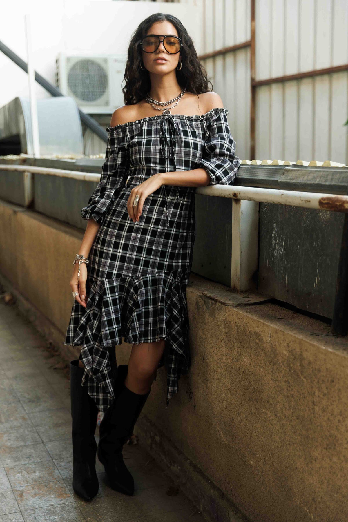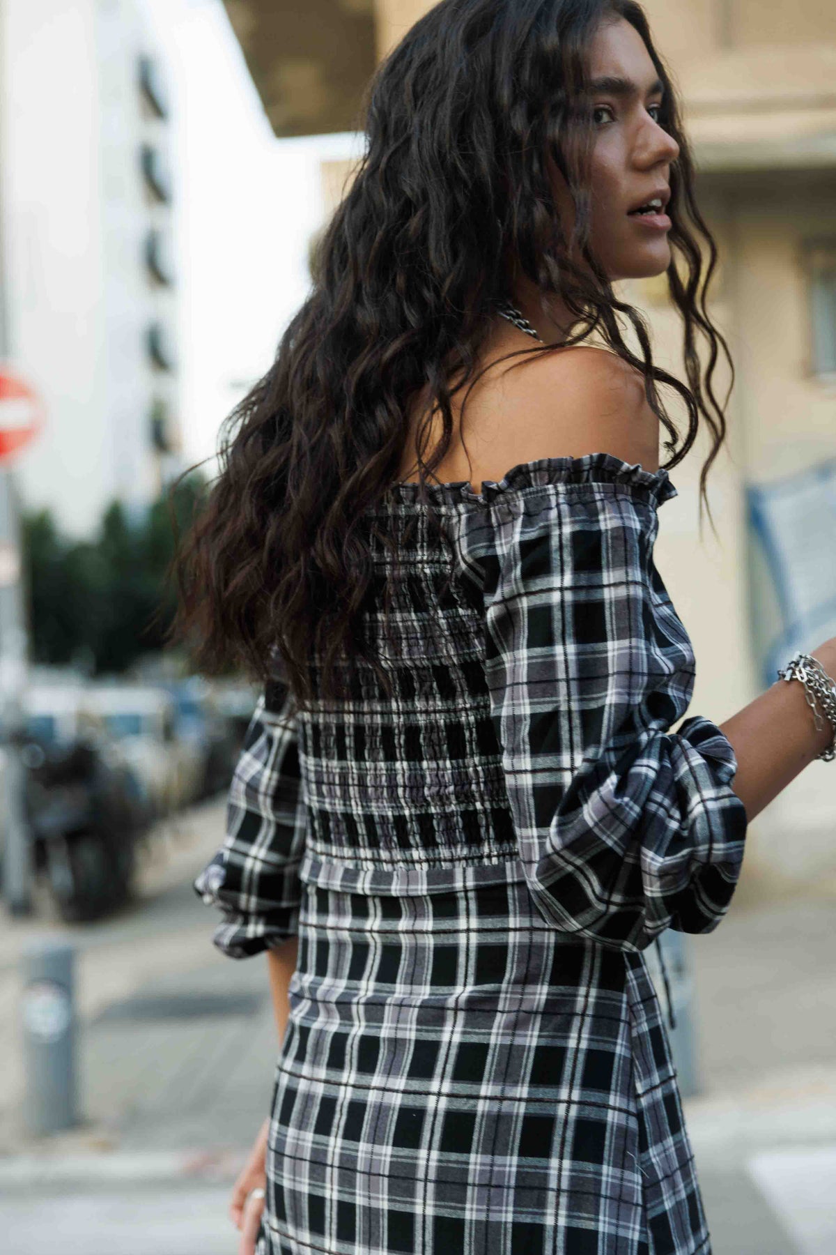 שמלת משבצות בגזרת כתפיים חשופות עם שרוולים נופלים וקשר עדין בחזהחלק תחתון א-סימטרי עם רפלסים שמוסיף תנועה ונפח עדין