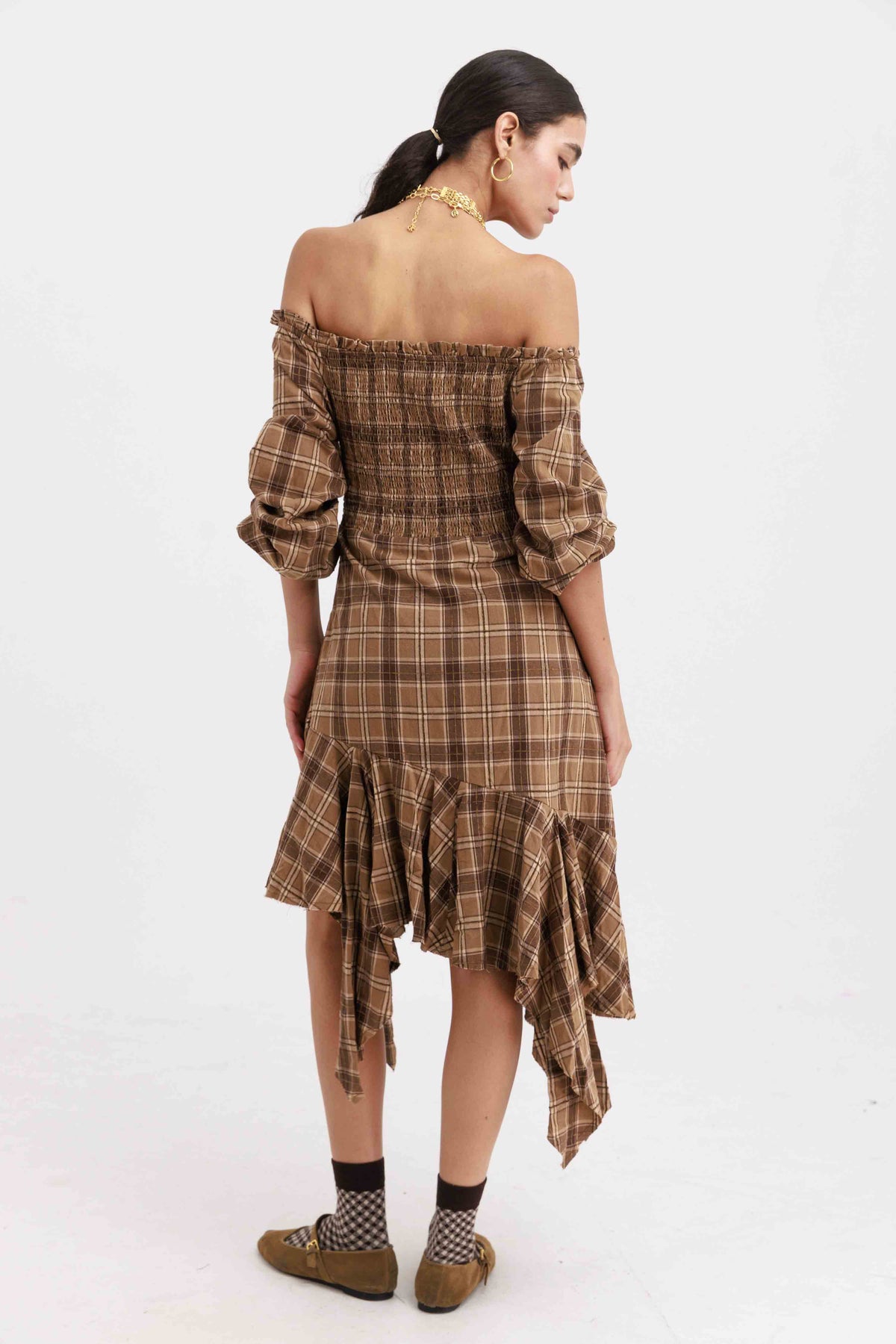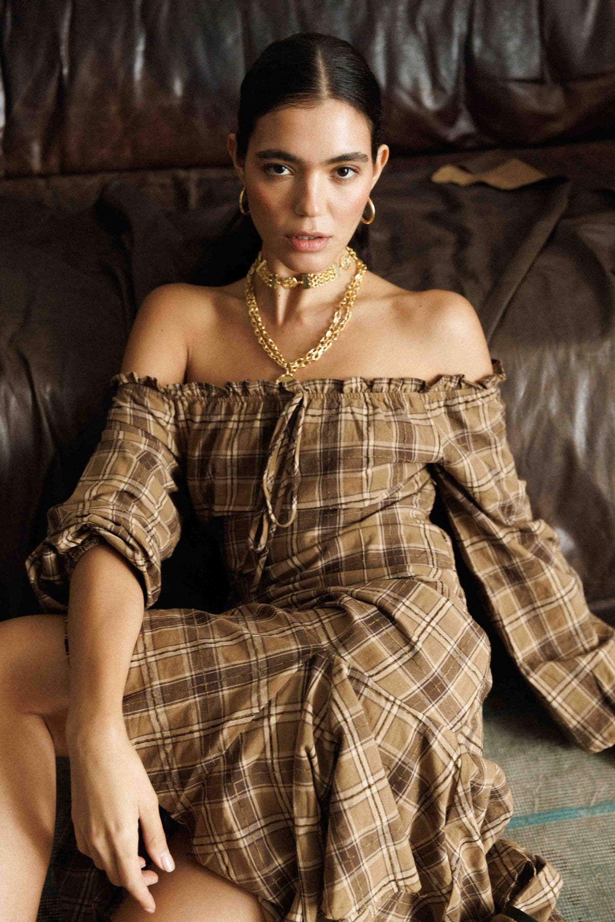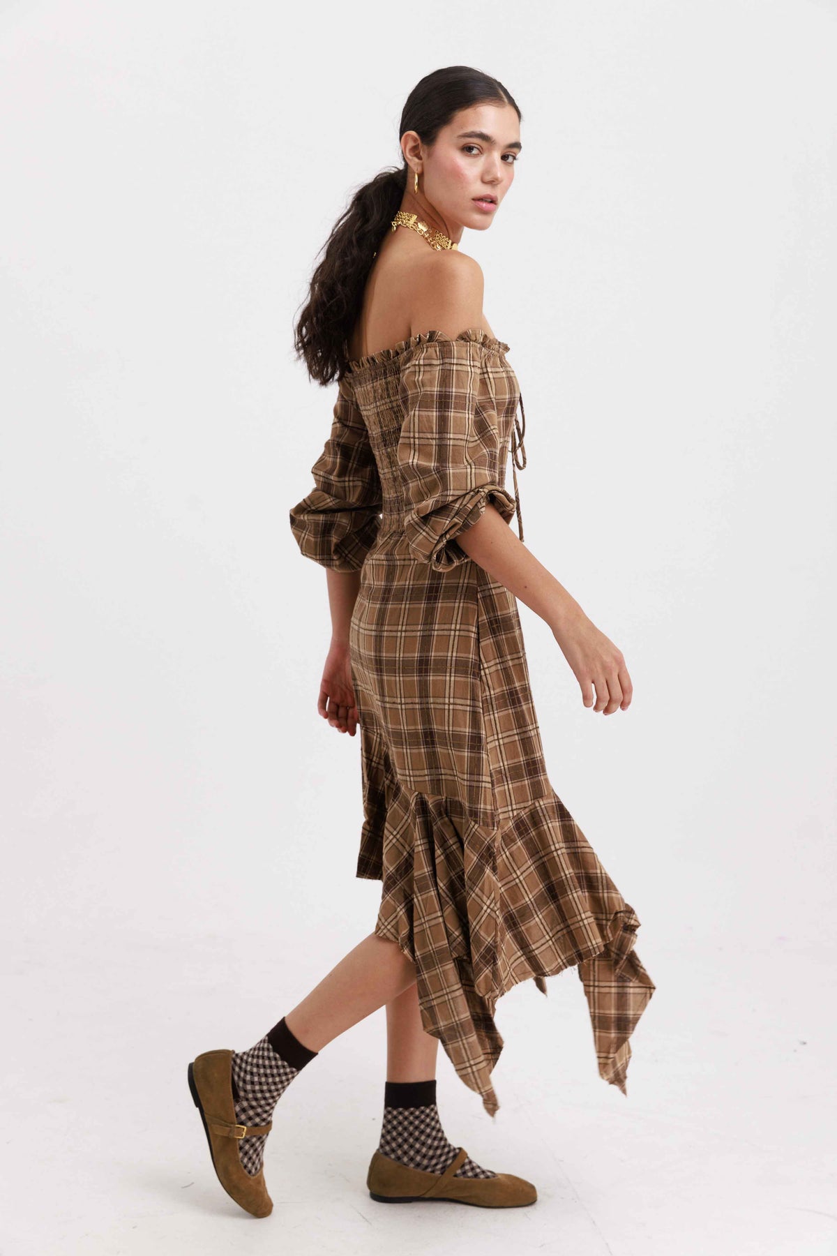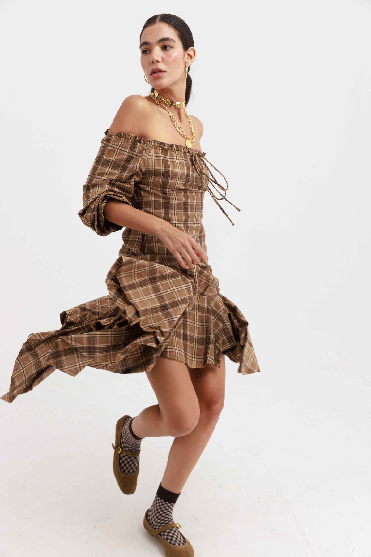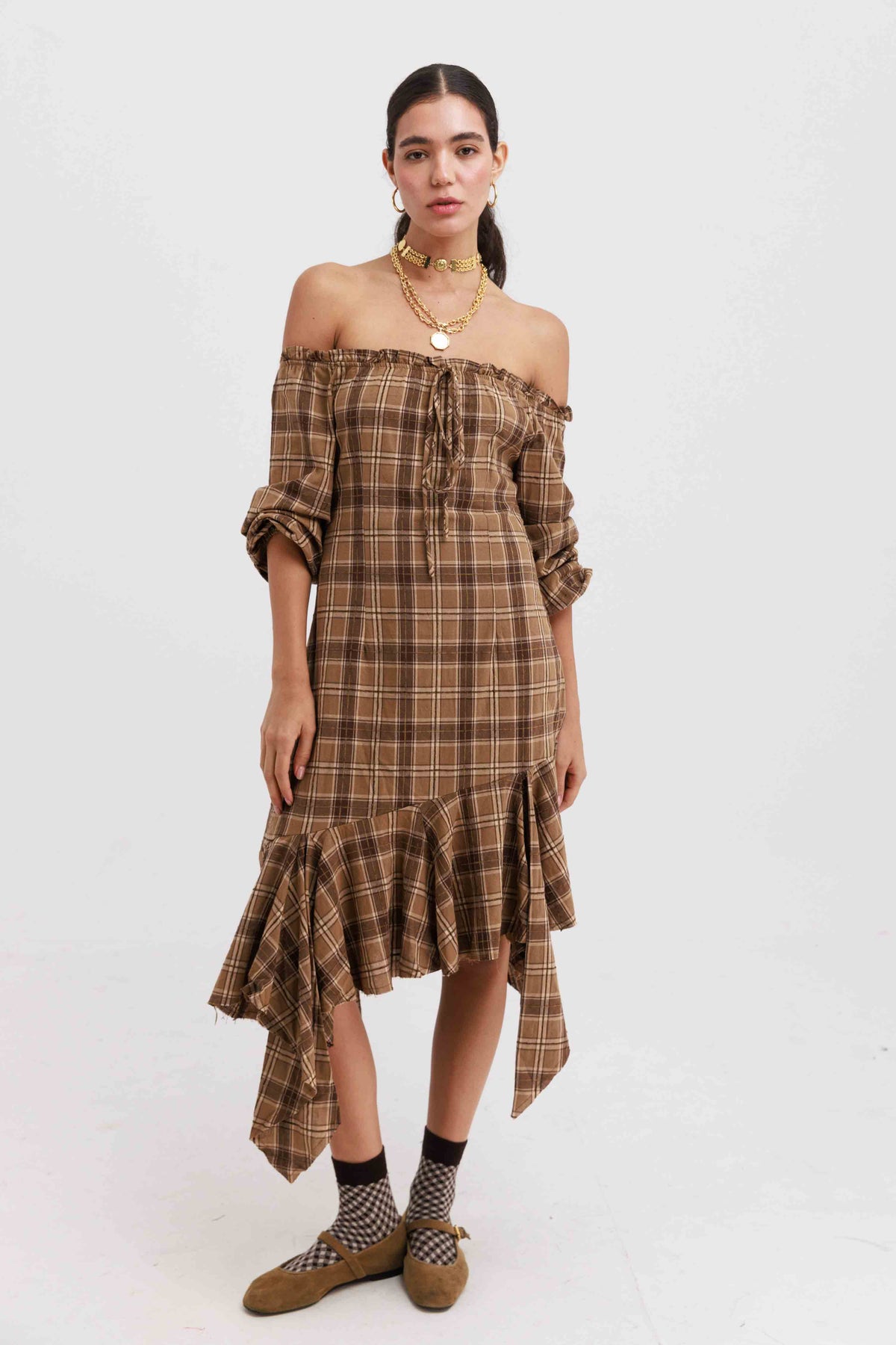 שמלת משבצות בגזרת כתפיים חשופות עם שרוולים נופלים וקשר עדין בחזהחלק תחתון א-סימטרי עם רפלסים שמוסיף תנועה ונפח עדין
