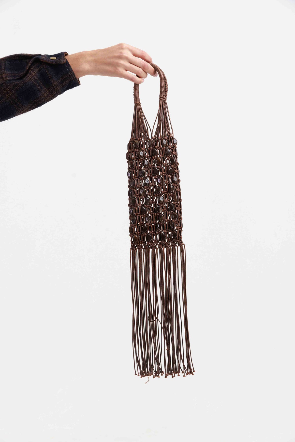 תיק יד סרוג בשילוב חרוזים כהים בסיומת פרנזים ארוכים