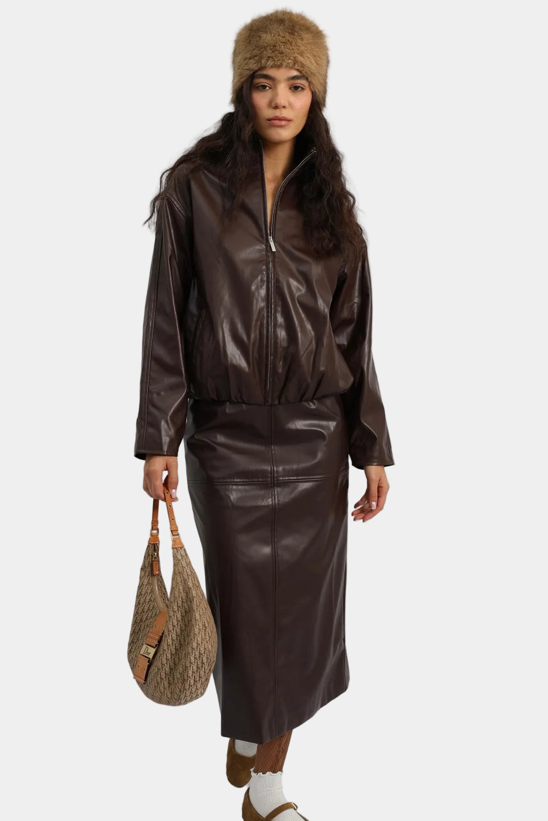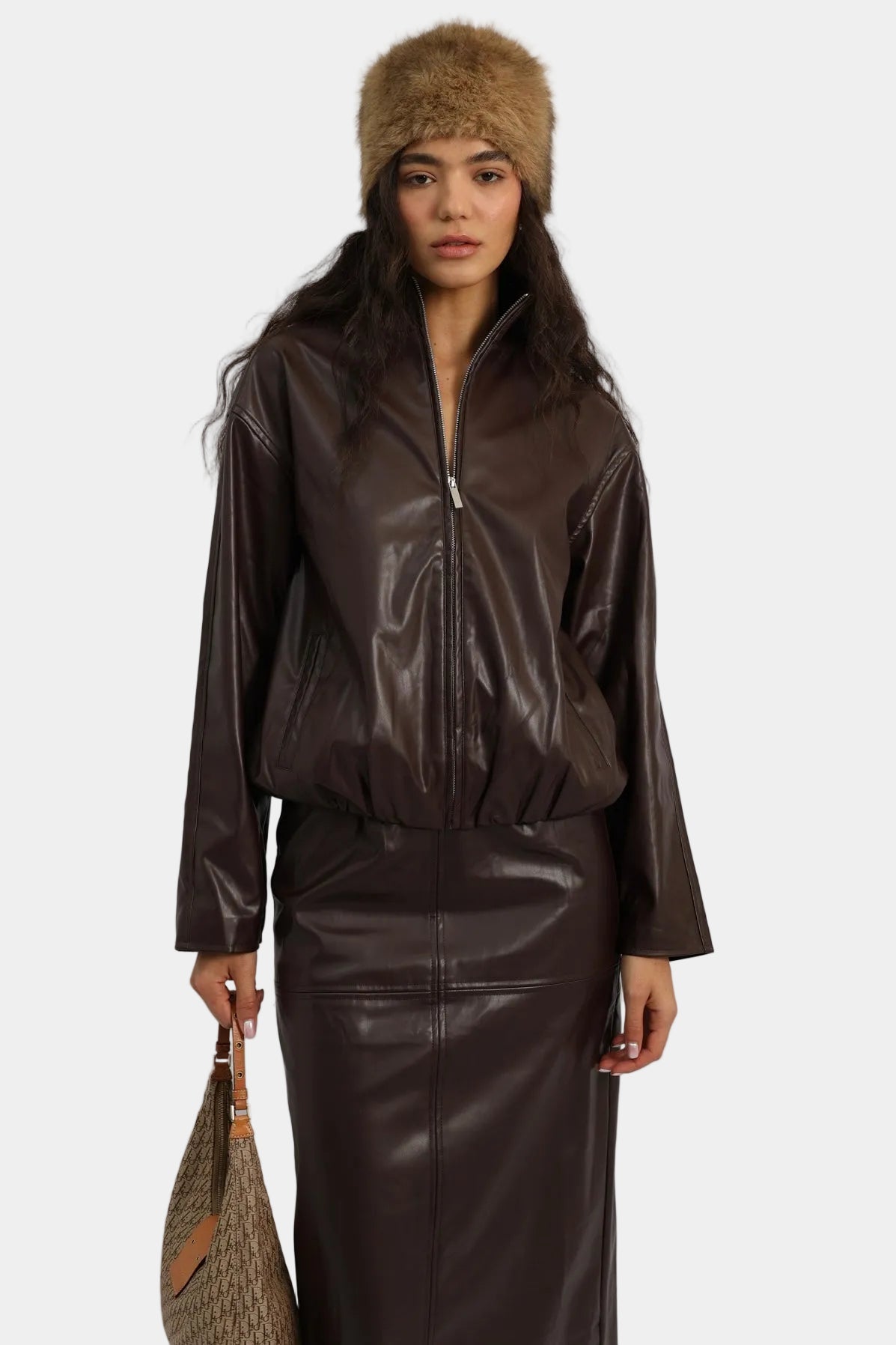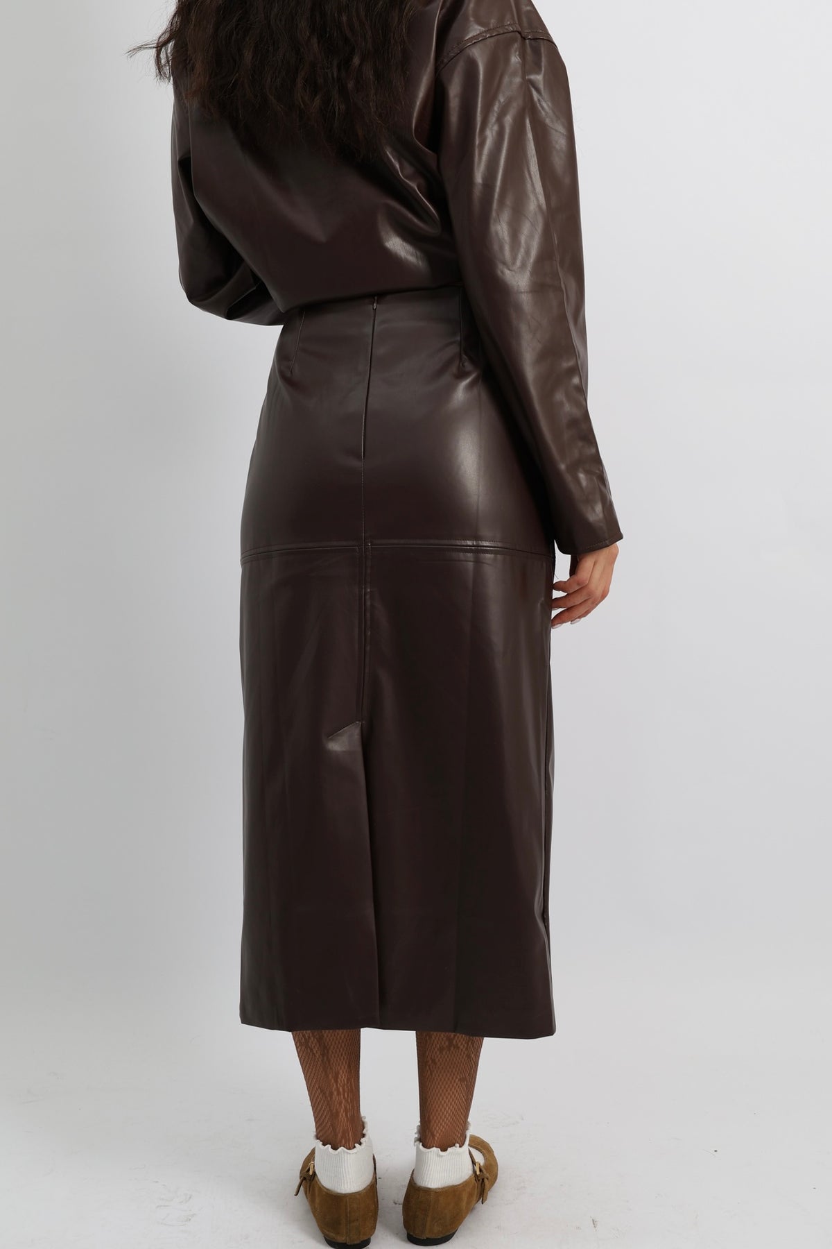 חליפת חצאית דמוי עור בגזרה משוחררת עם ז’קט תואם וסגירת רוכסן.