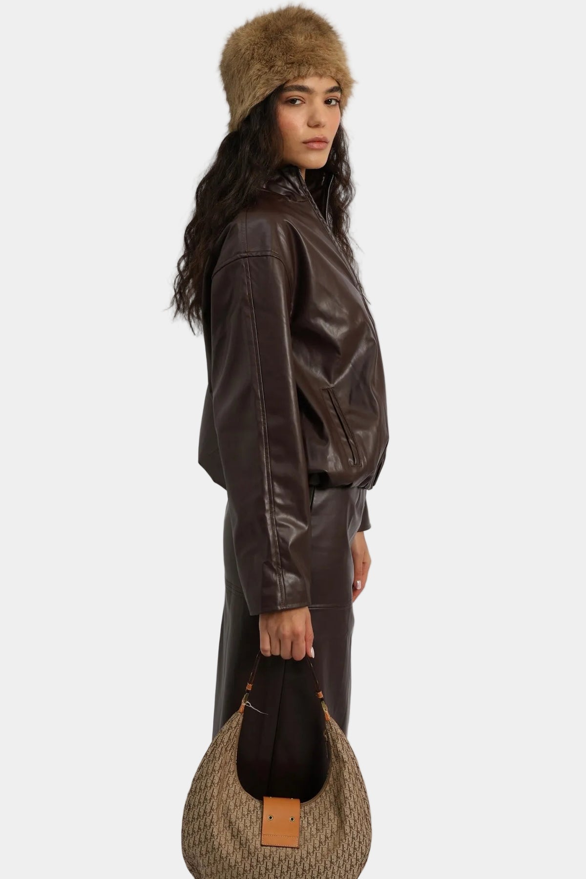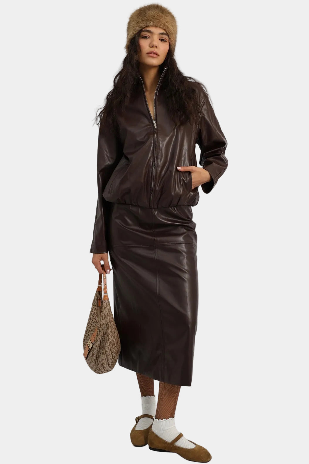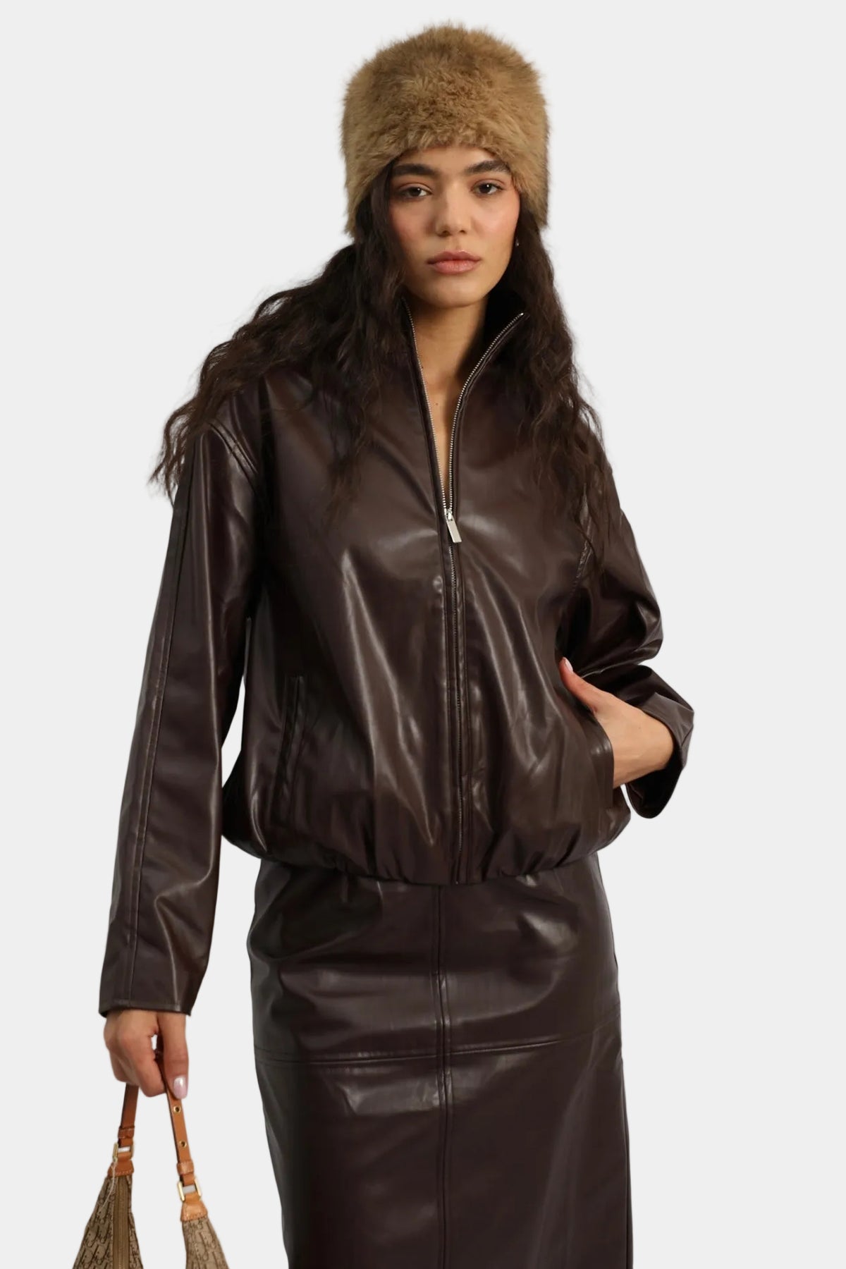 חליפת חצאית דמוי עור בגזרה משוחררת עם ז’קט תואם וסגירת רוכסן.