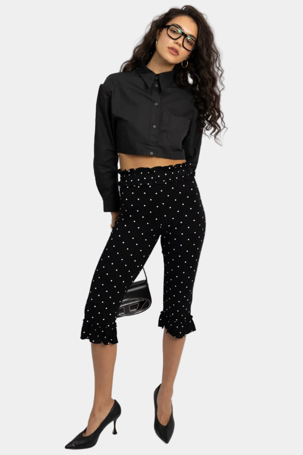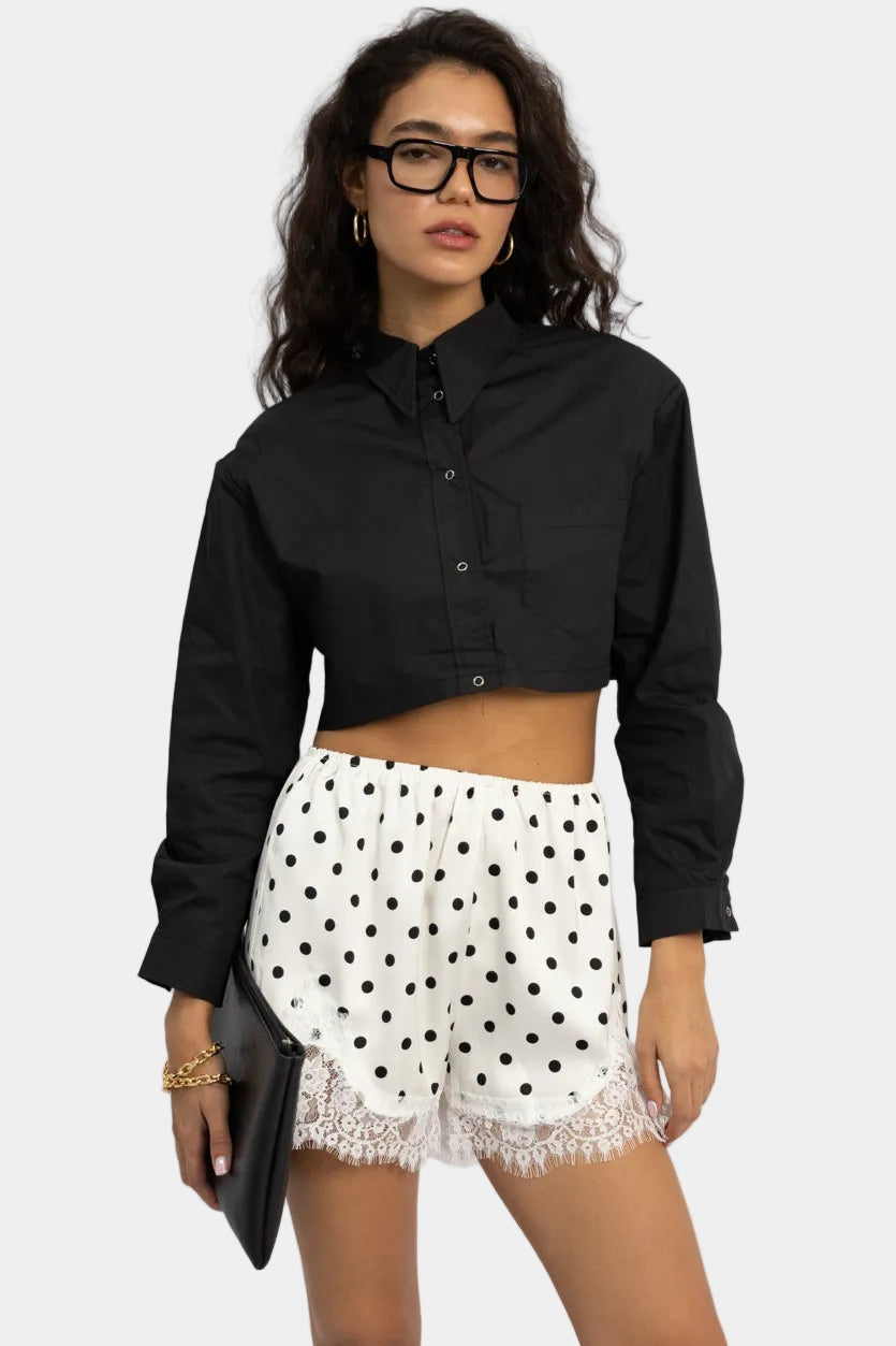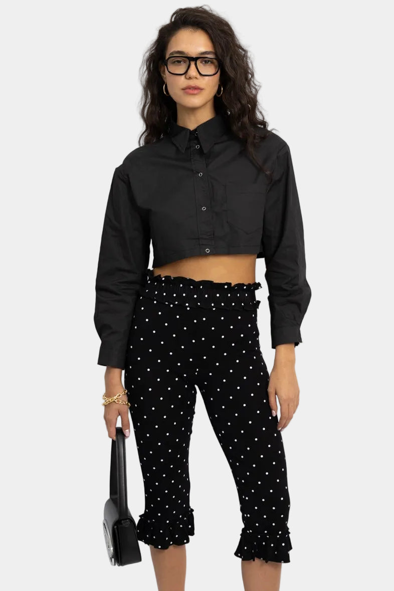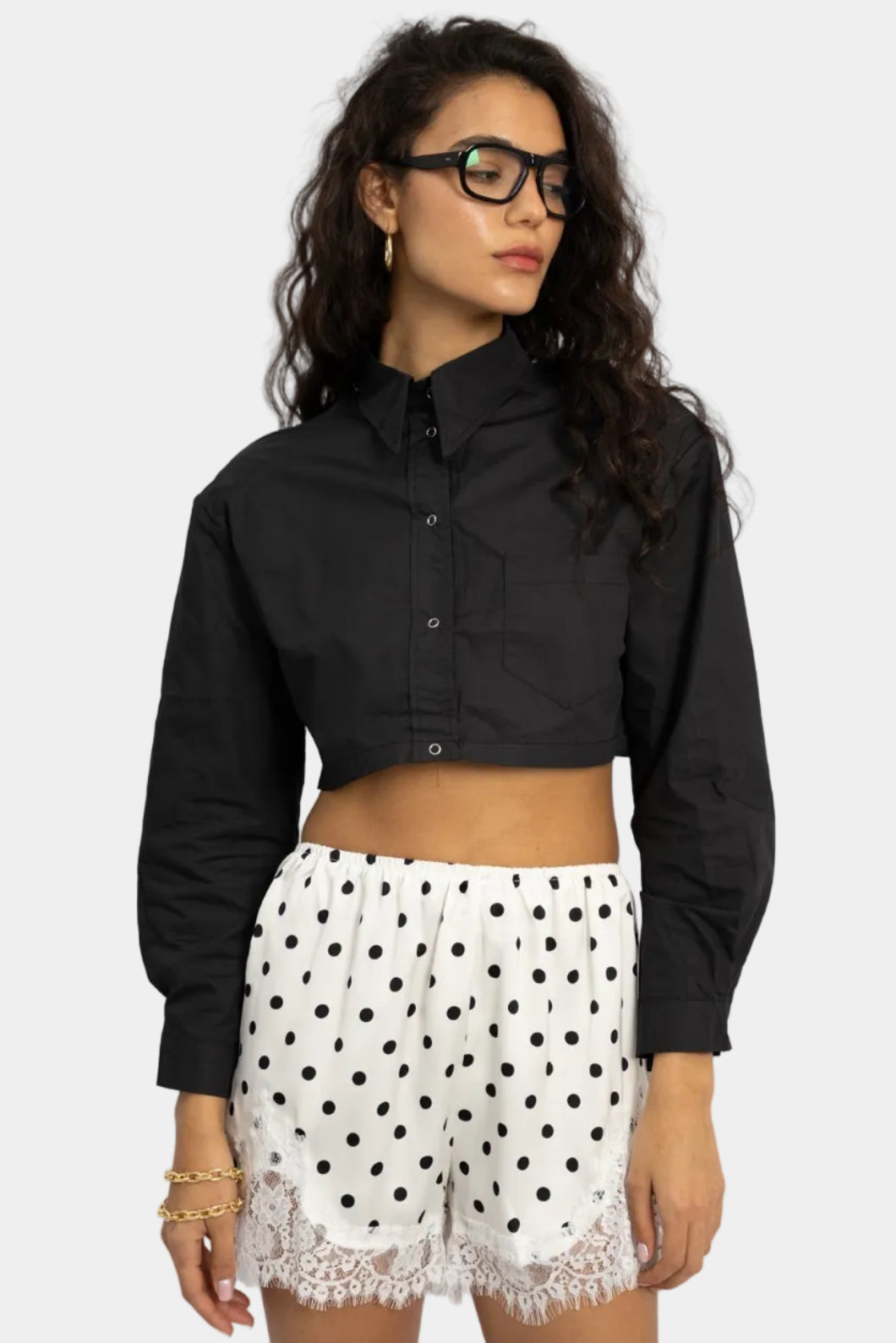 חולצת קרופ מכופתרת בגזרה מחויטת עם צווארון קלאסי, מראה נקי ומדויק שמשדר סטייל מודרני.