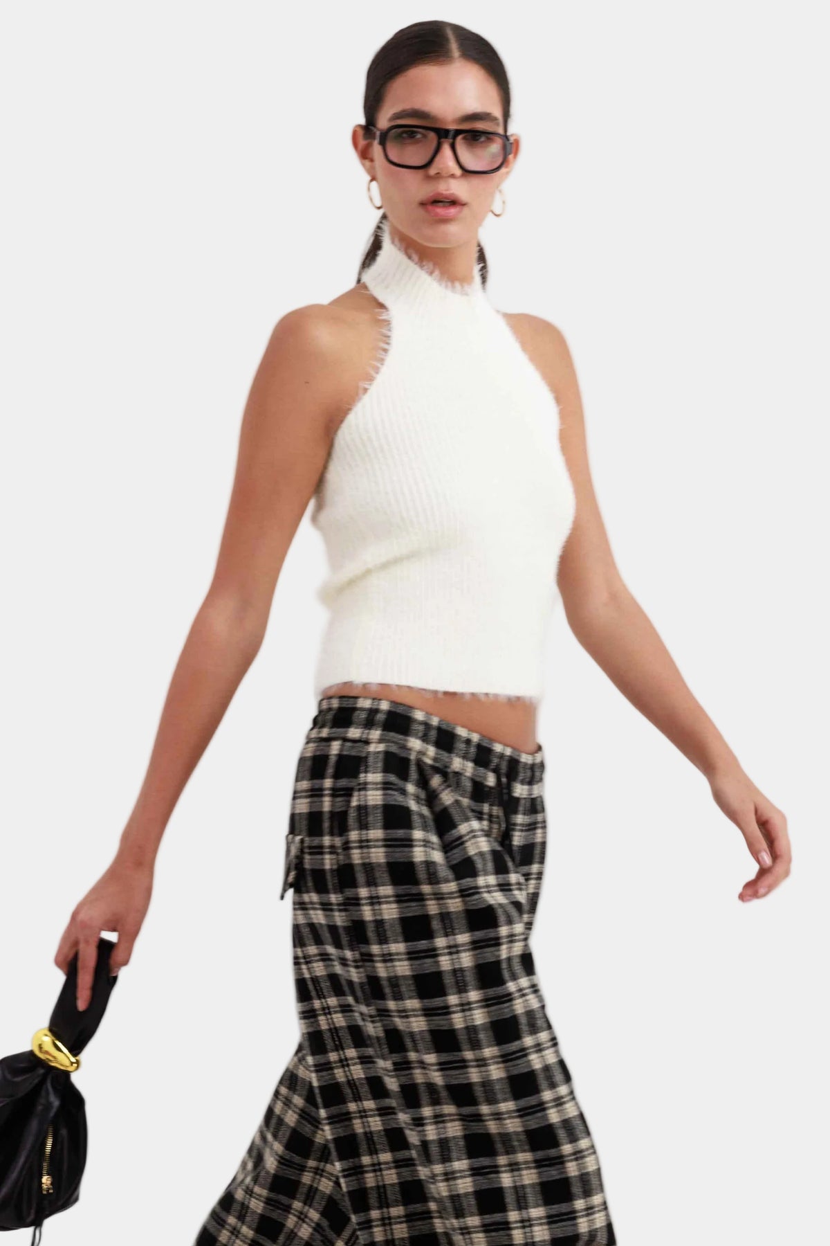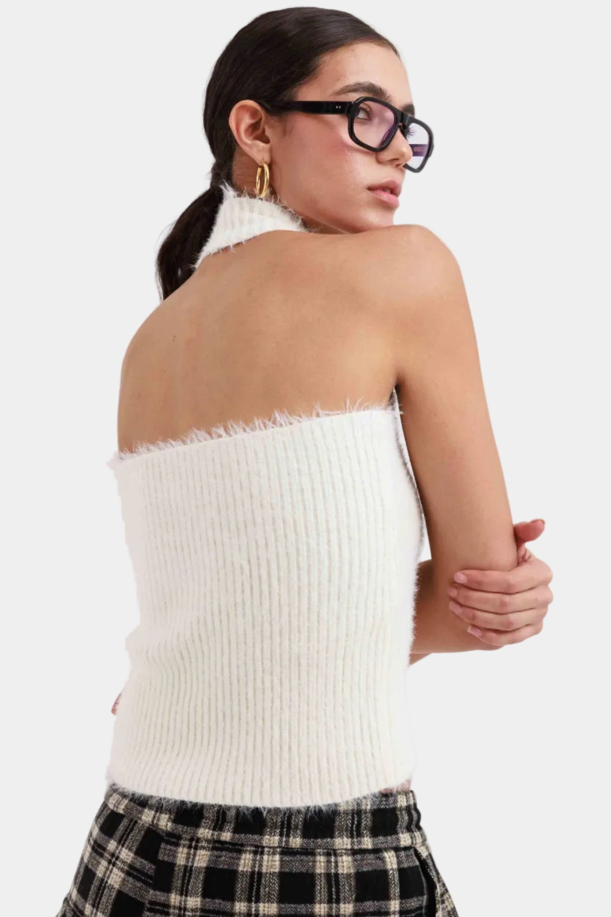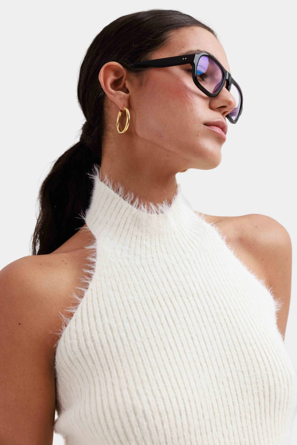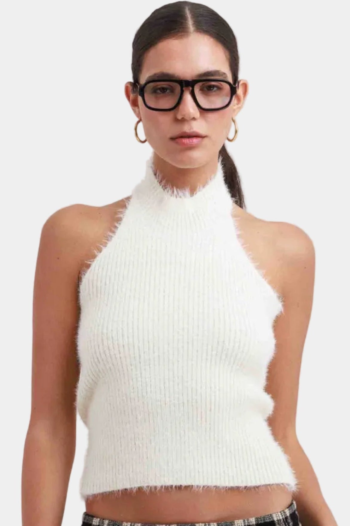 טופ סריג בגזרה צמודה עם מפתח צוואר גבוה וללא שרוולים, בד רך ומלטף עם מראה נקי ומדויק.