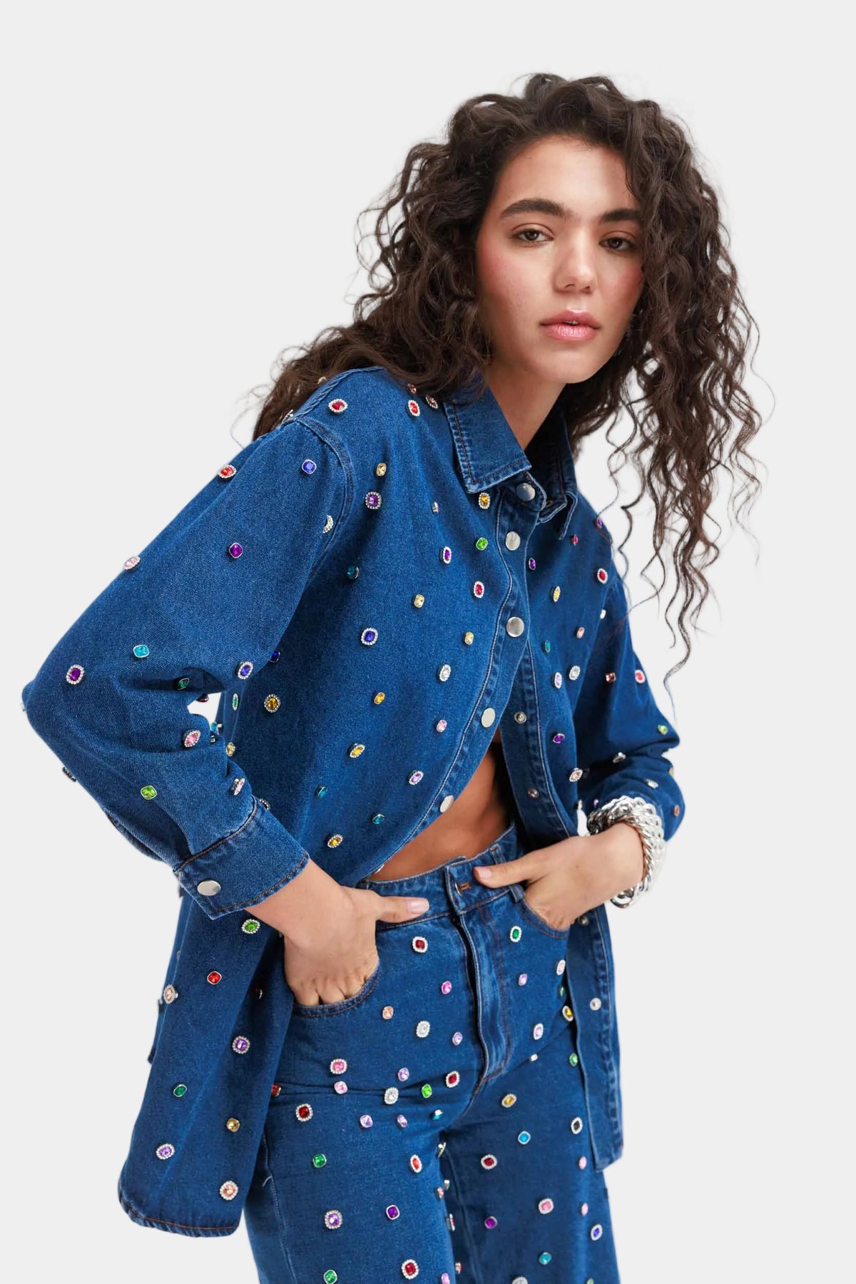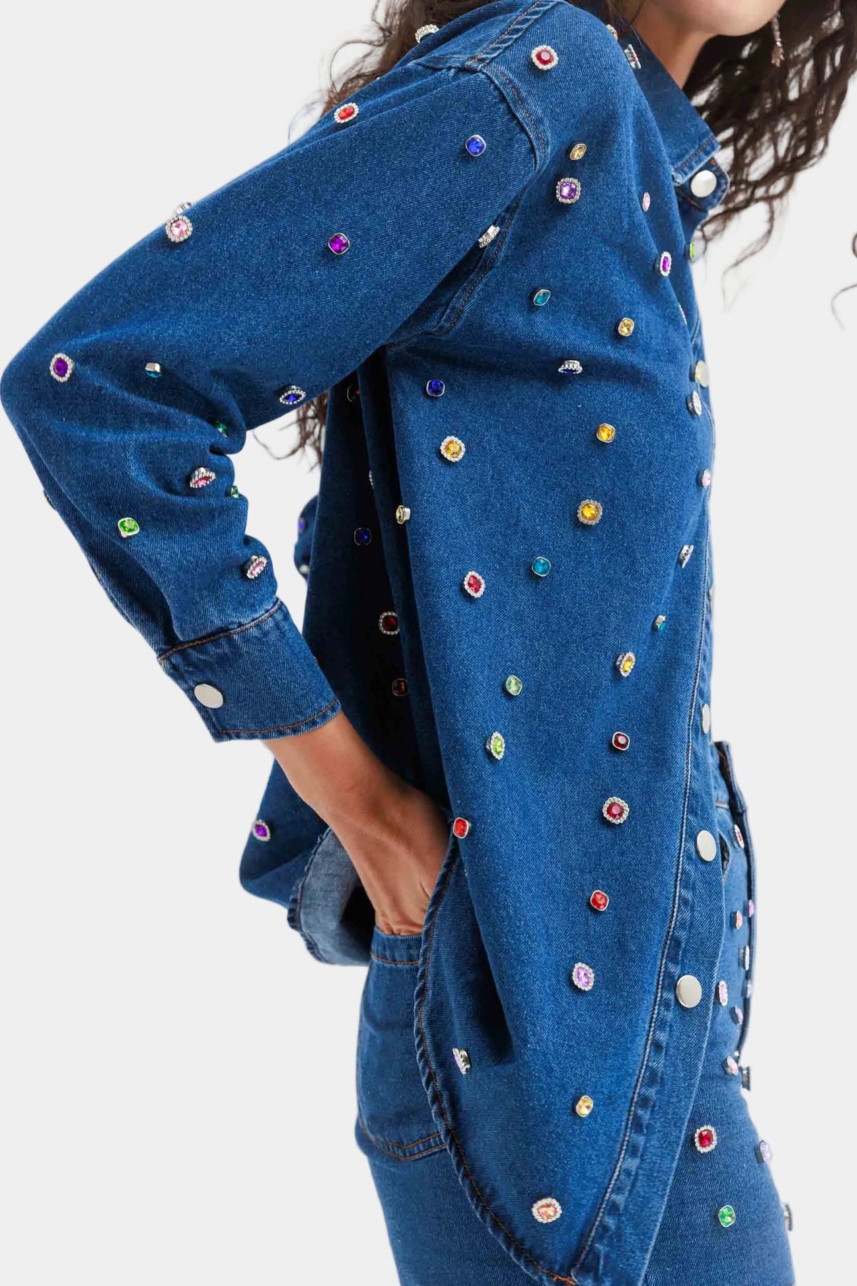 חולצת ג׳ינס מכופתרת בגזרה ישרה עם עיטורי אבנים צבעוניות לכל אורכה, מראה בולט ומלא סטייל שמשדרג כל הופעה.