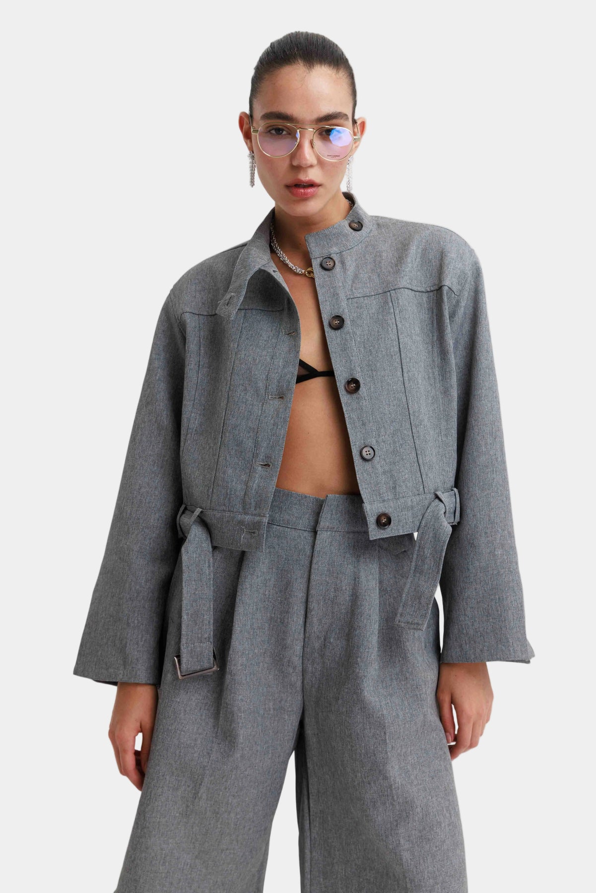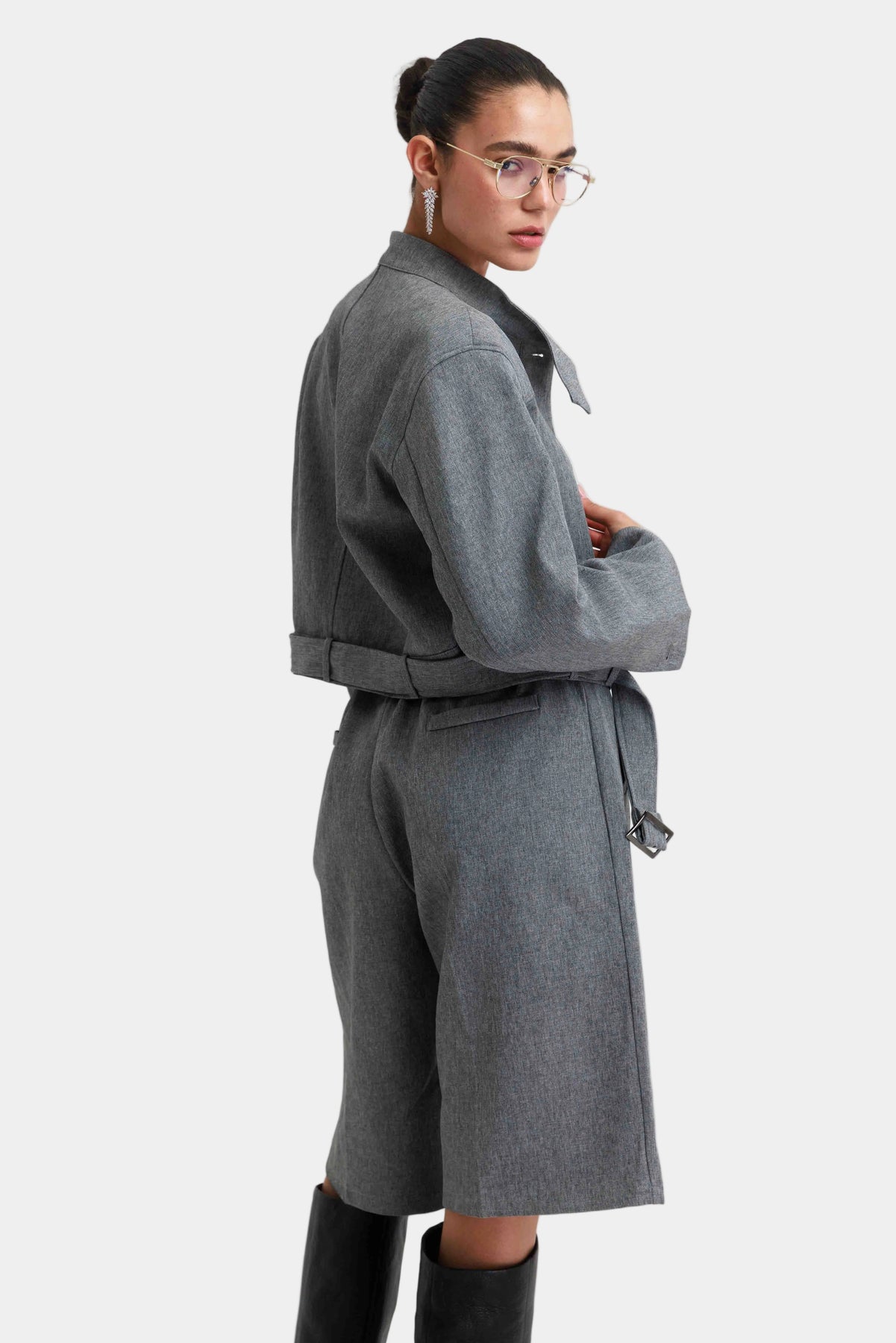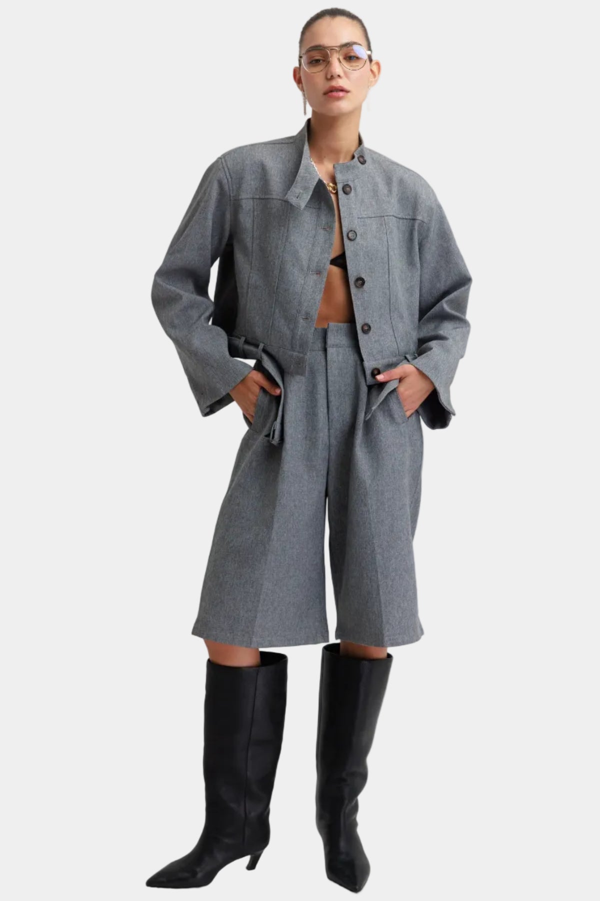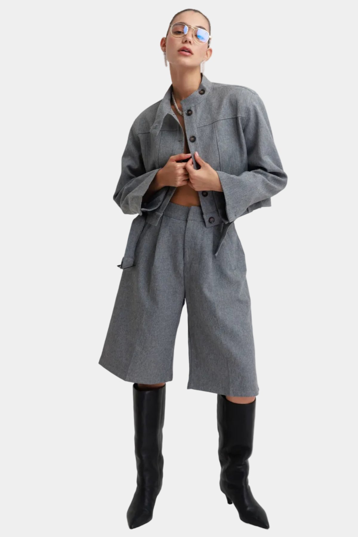 חליפה בגזרה משוחררת עם ז’קט קצר ומכנסי ברמודה רחבים למראה מודרני ונקי.