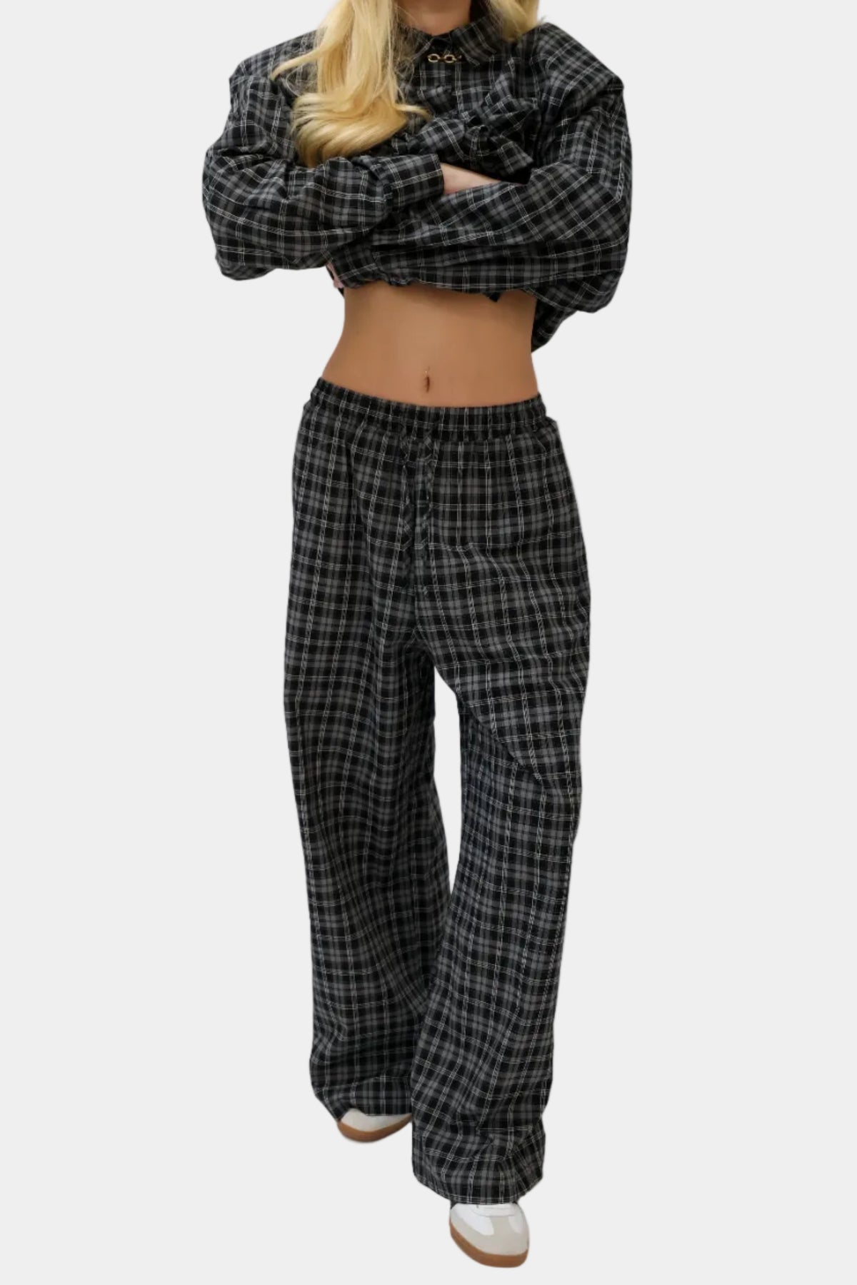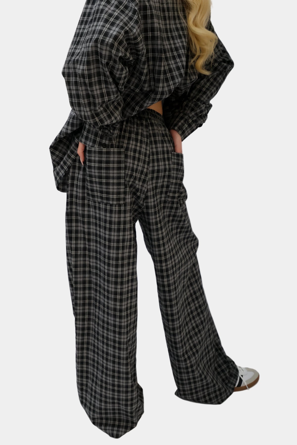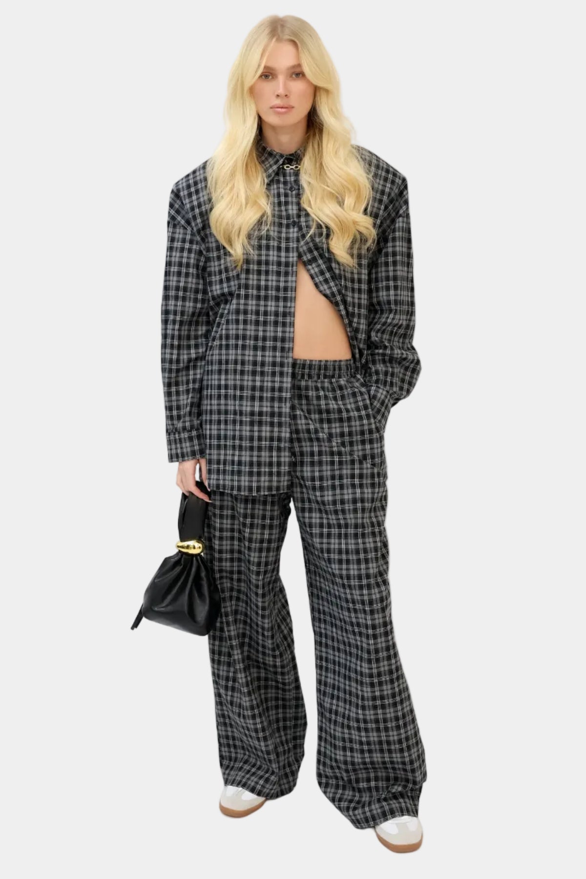 חליפה משובצת בגזרה משוחררת עם חולצה מכופתרת בגזרת אוברסייז ומכנסיים רחבים תואמים.