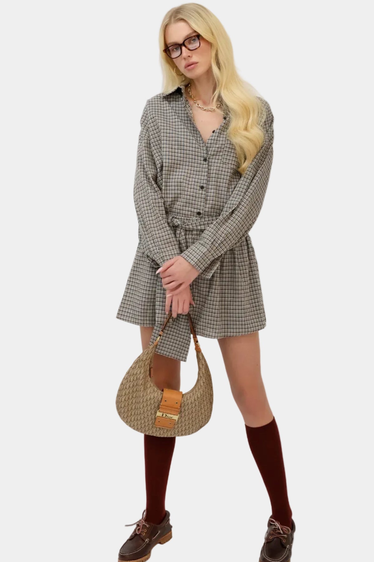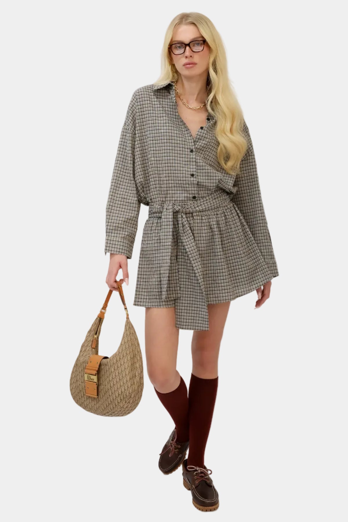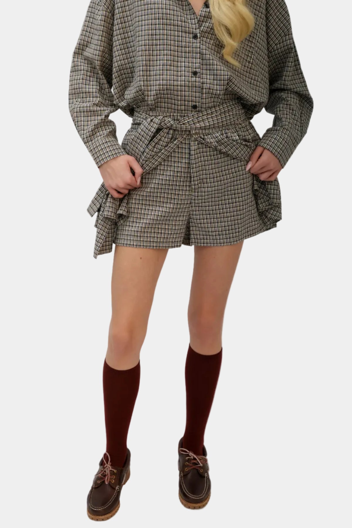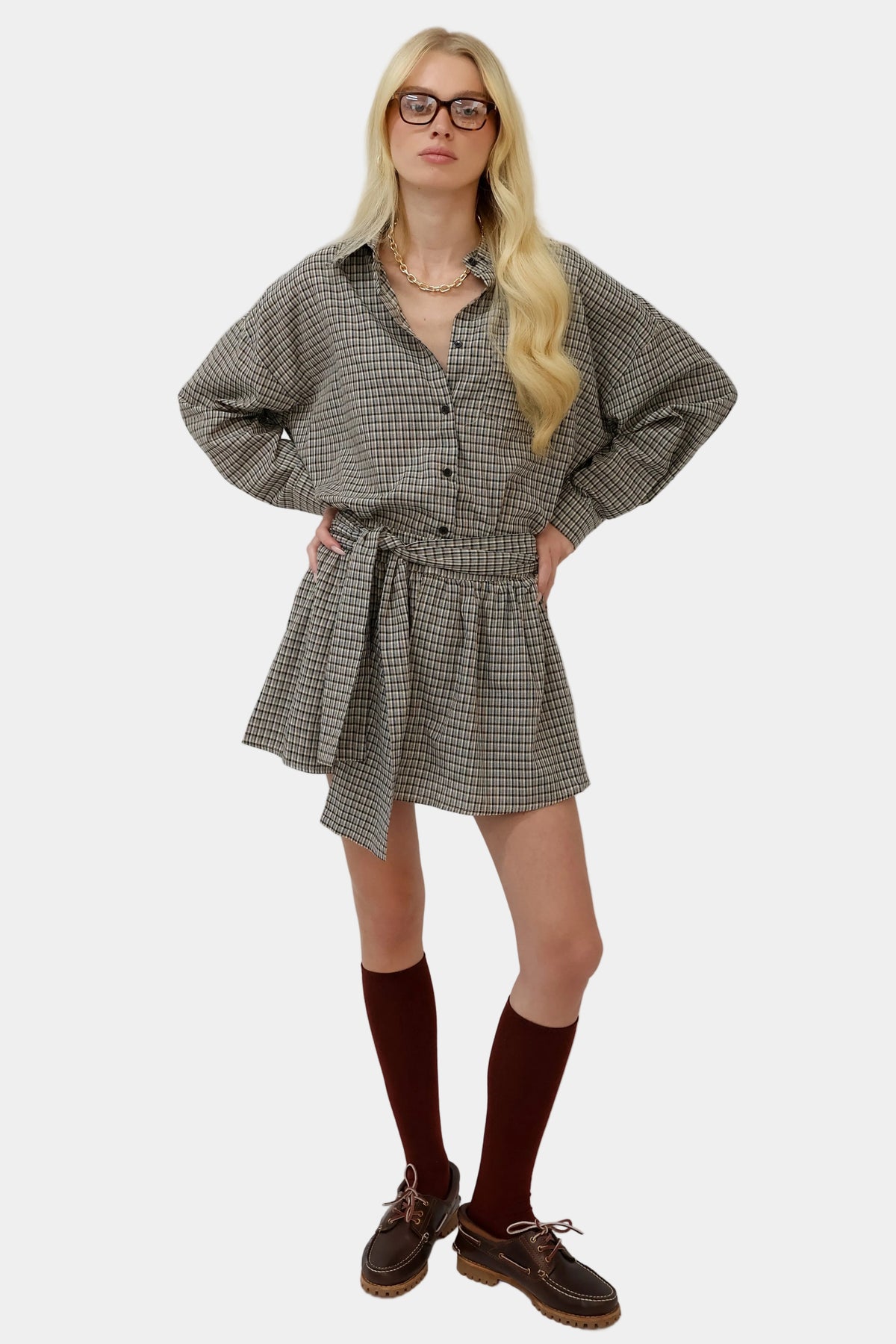 חליפת חצאית משובצת בגזרה משוחררת עם חולצה תואמת, חגורת קשירה ומראה קלאסי־אורבני.