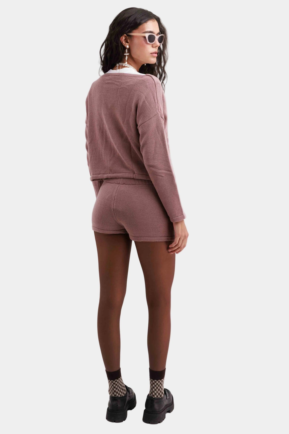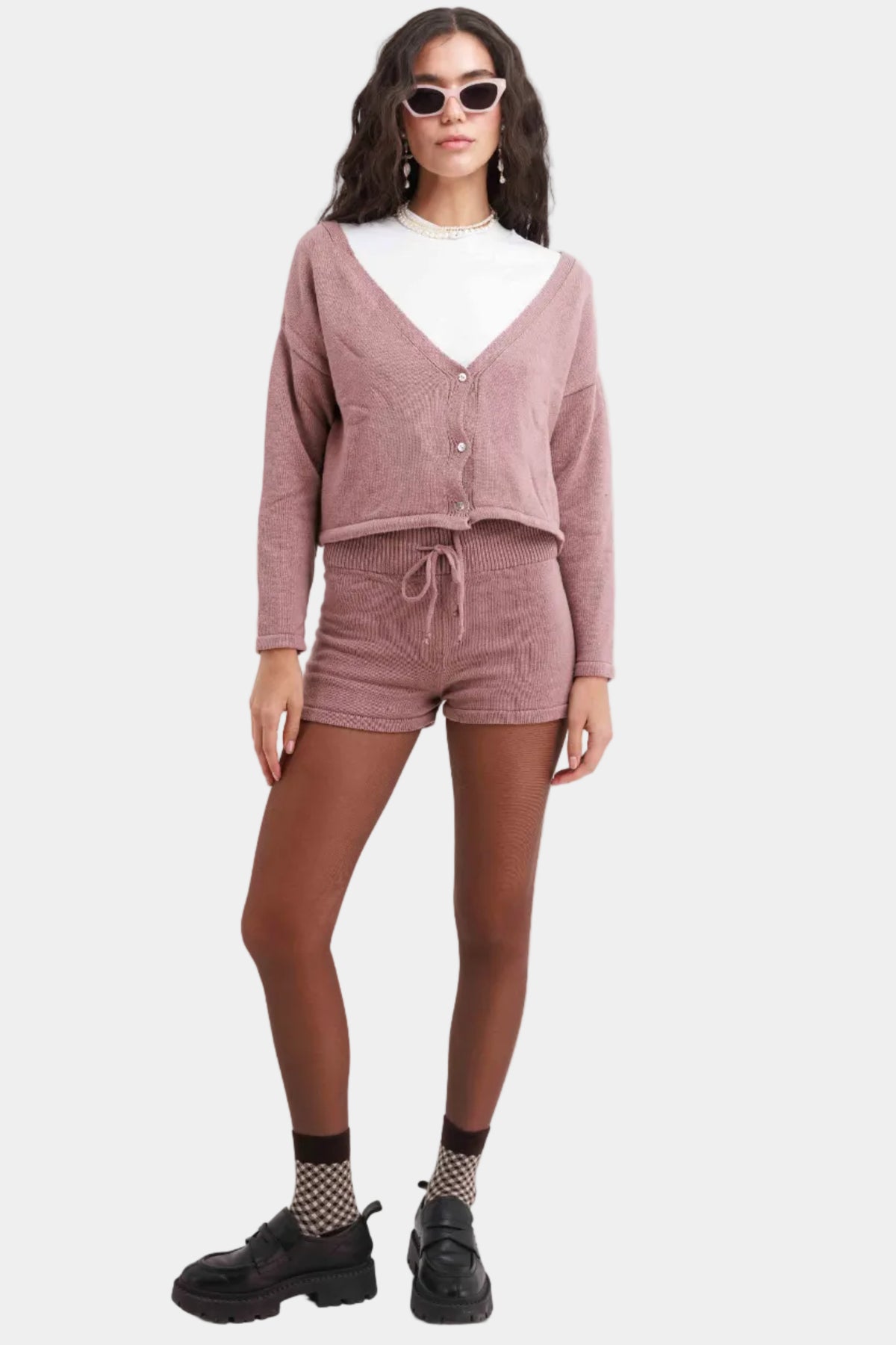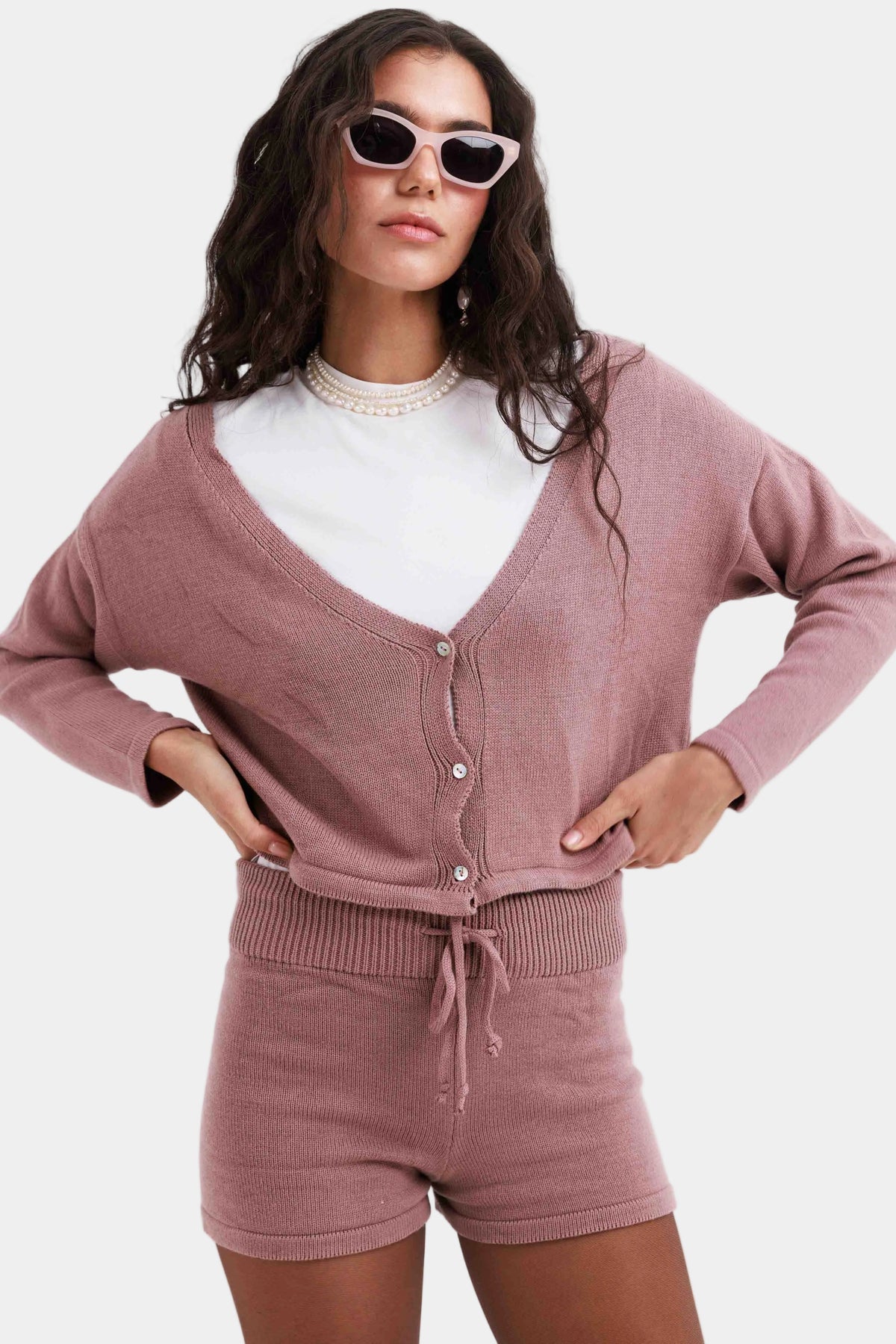 חליפת מכנס קצר בגזרה נינוחה עם קרדיגן תואם, שרוך קשירה ומראה קז’ואלי ונוח.
