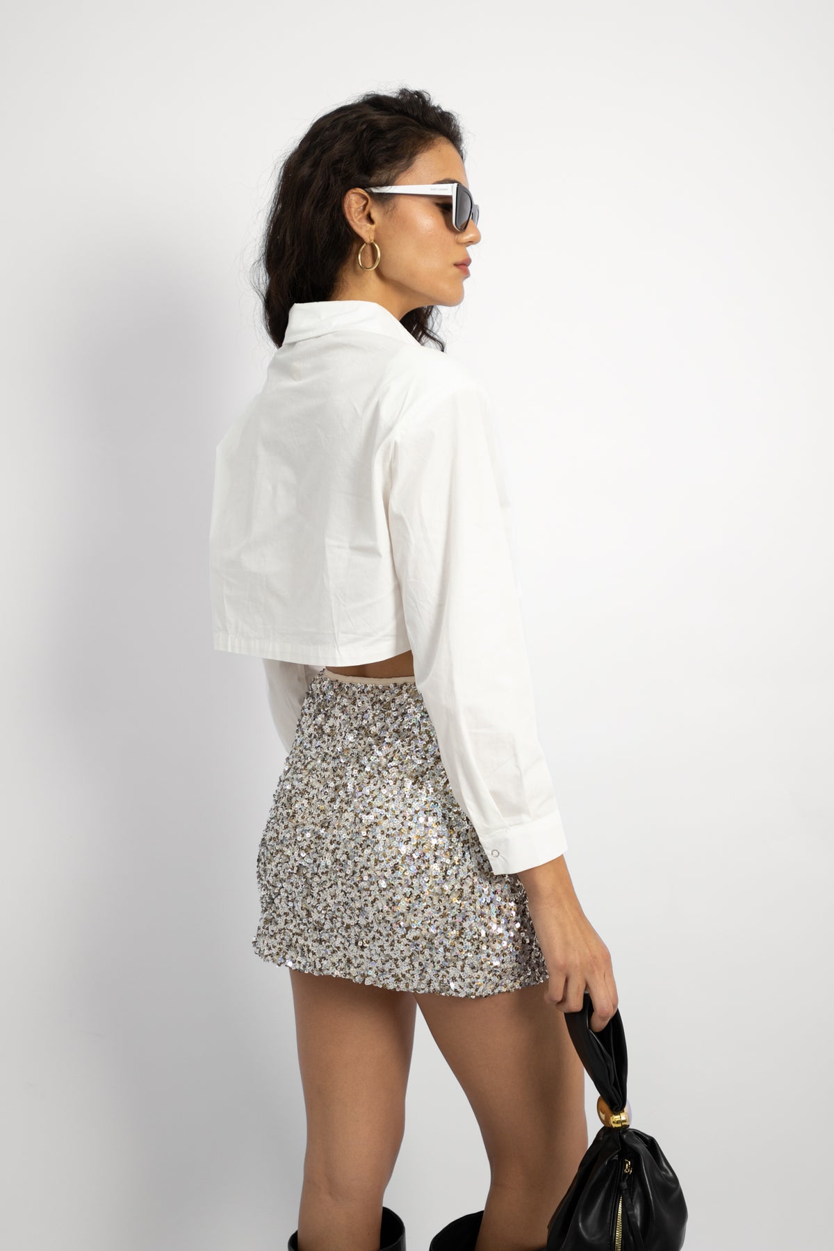 חצאית פאייטים קצרה ונוצצת בגזרה מחמיאה, מוסיפה ברק ולוק ערב מושלם בכל שילוב