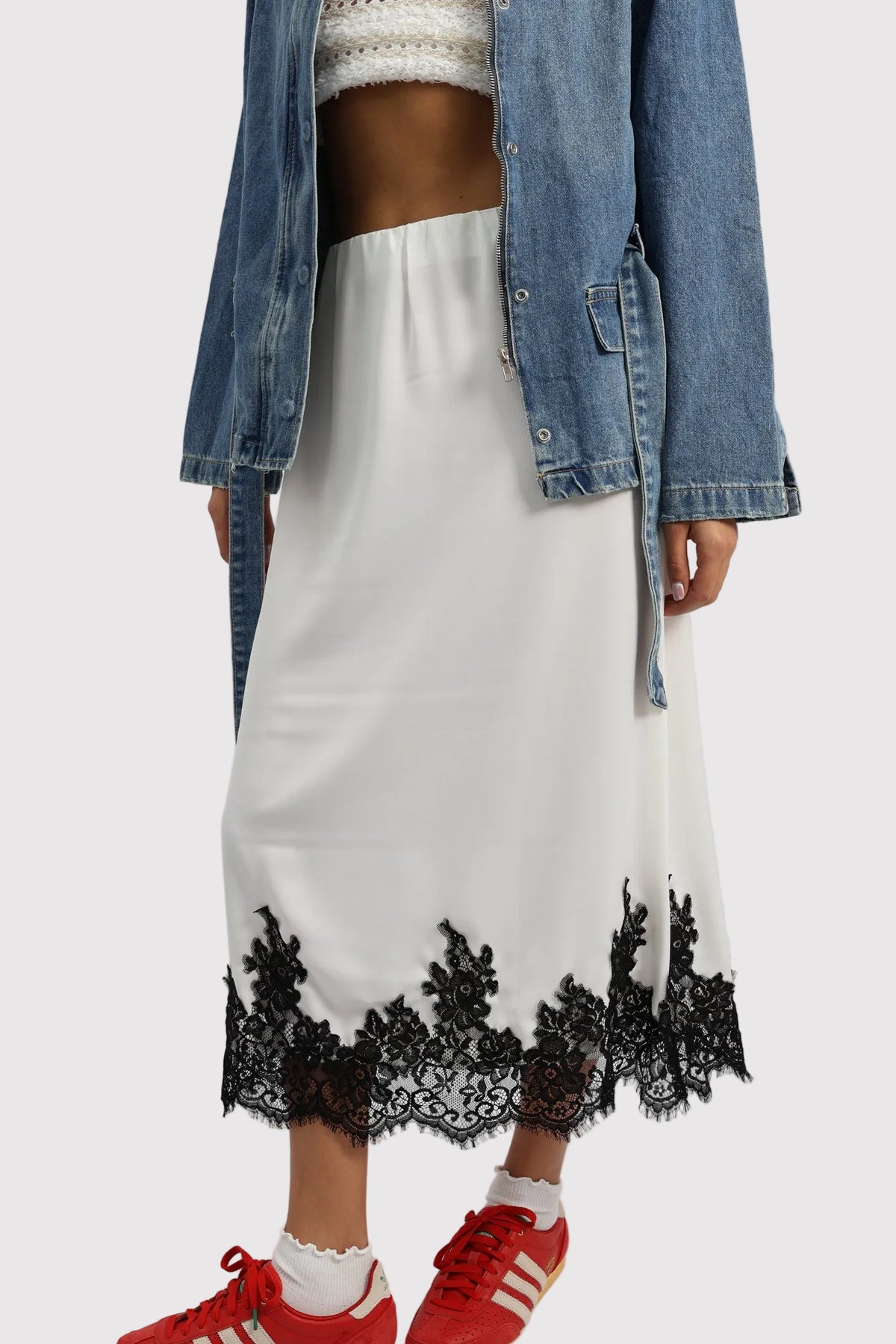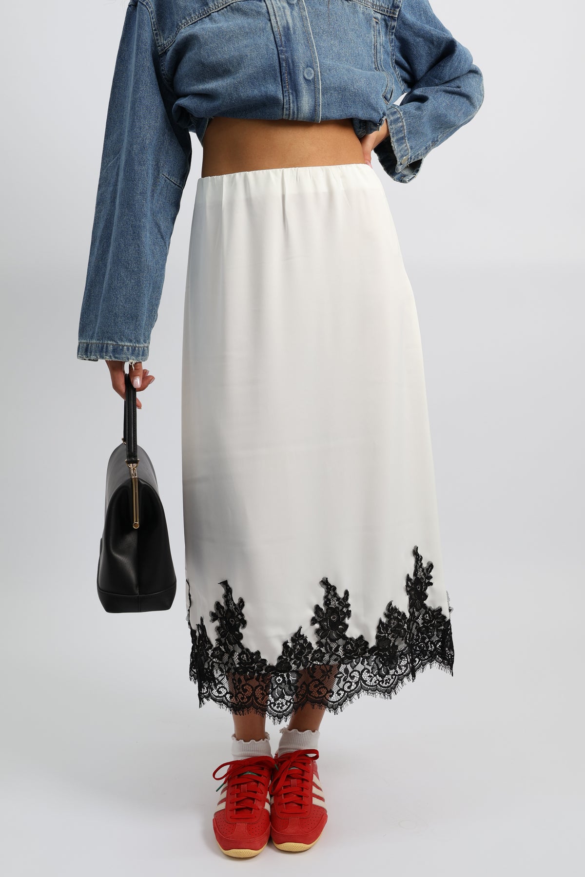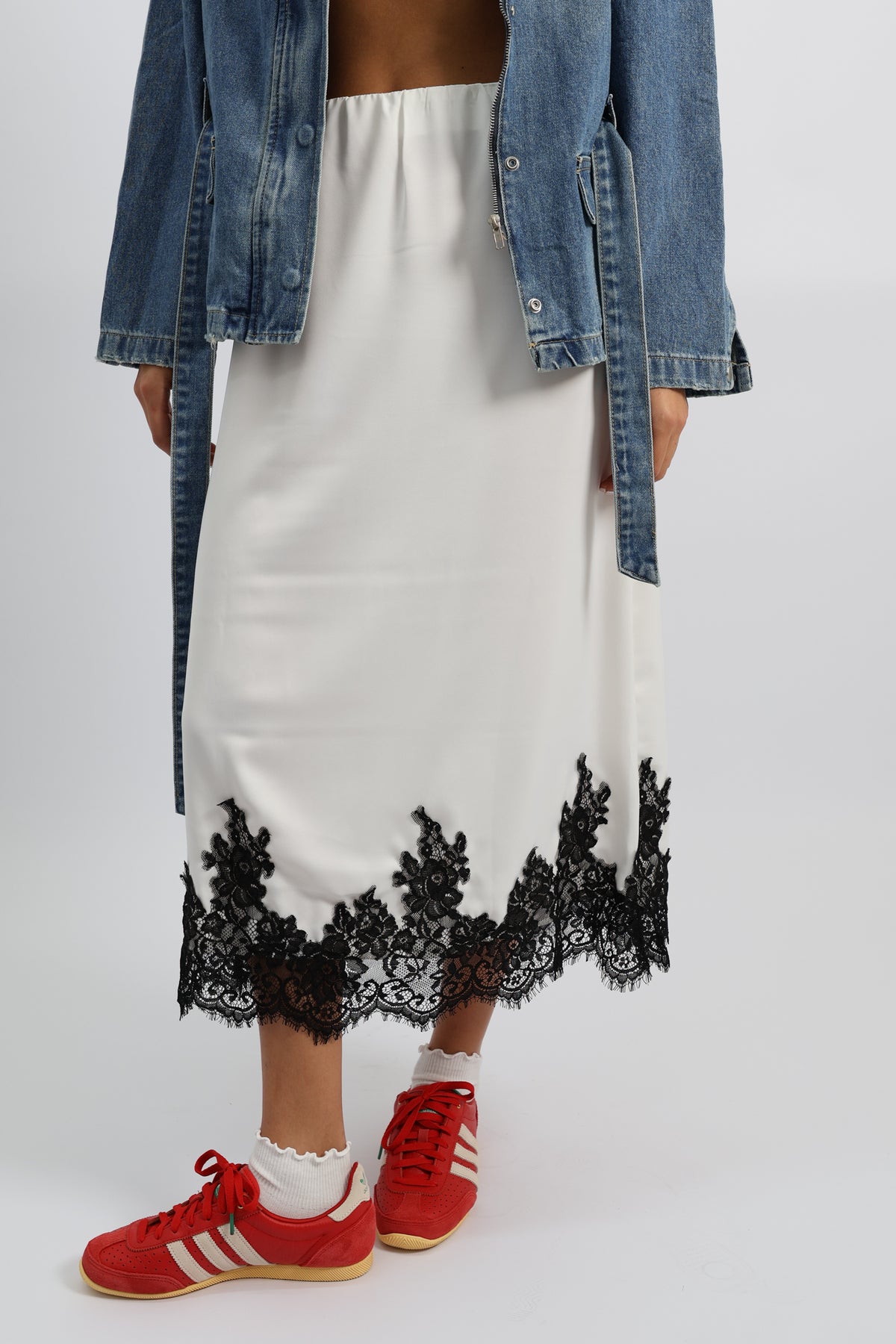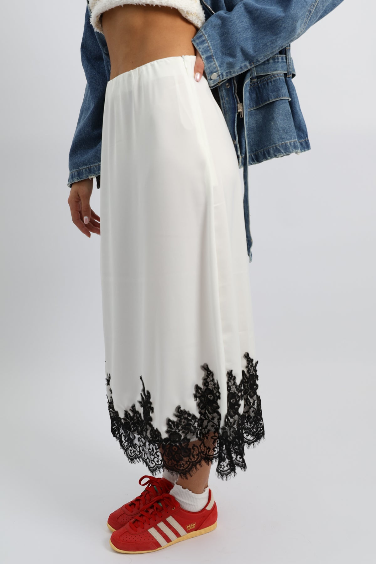 חצאית נשפכת בגזרה נקייה עם סיומת תחרה דרמטית, משלבת אלגנטיות רכה עם טוויסט יומיומי.