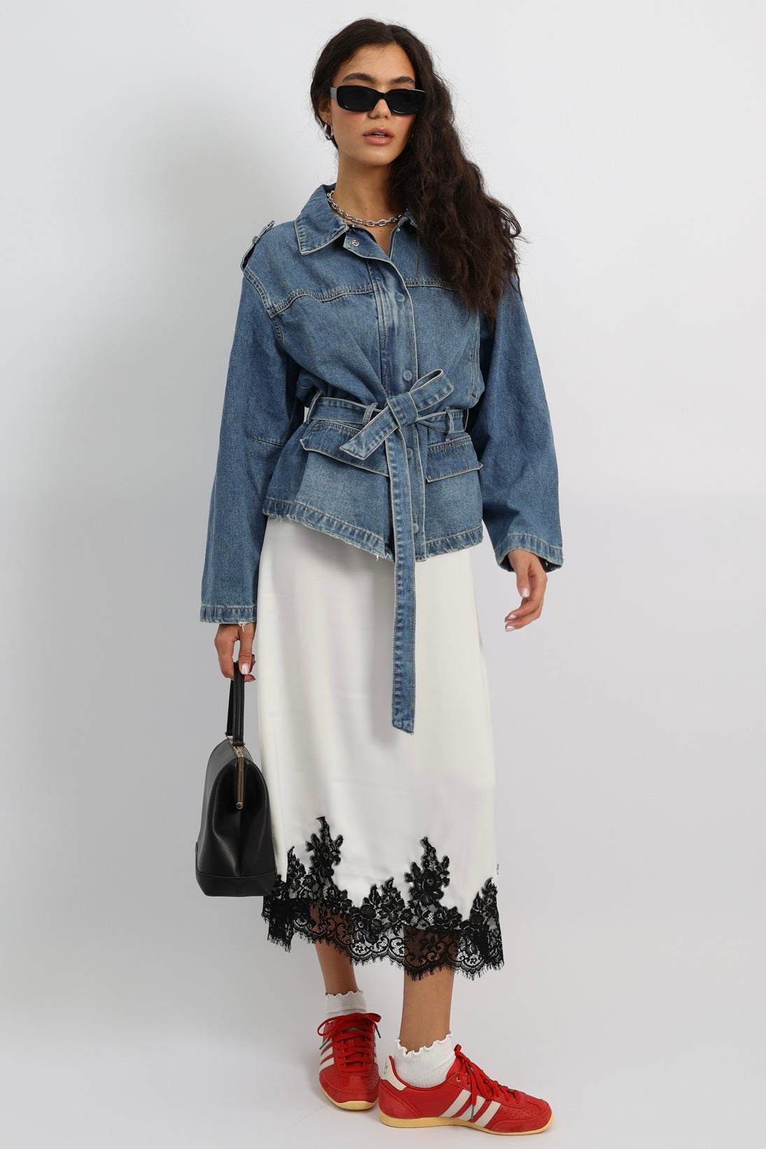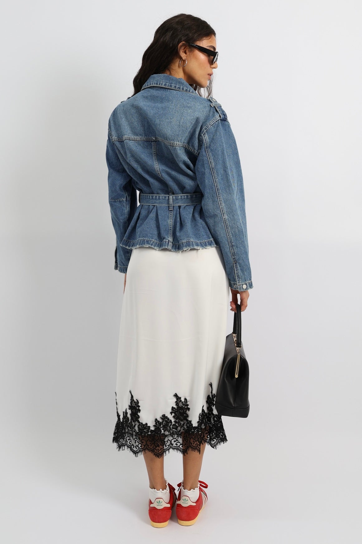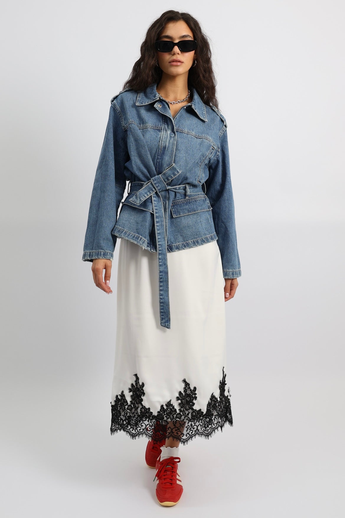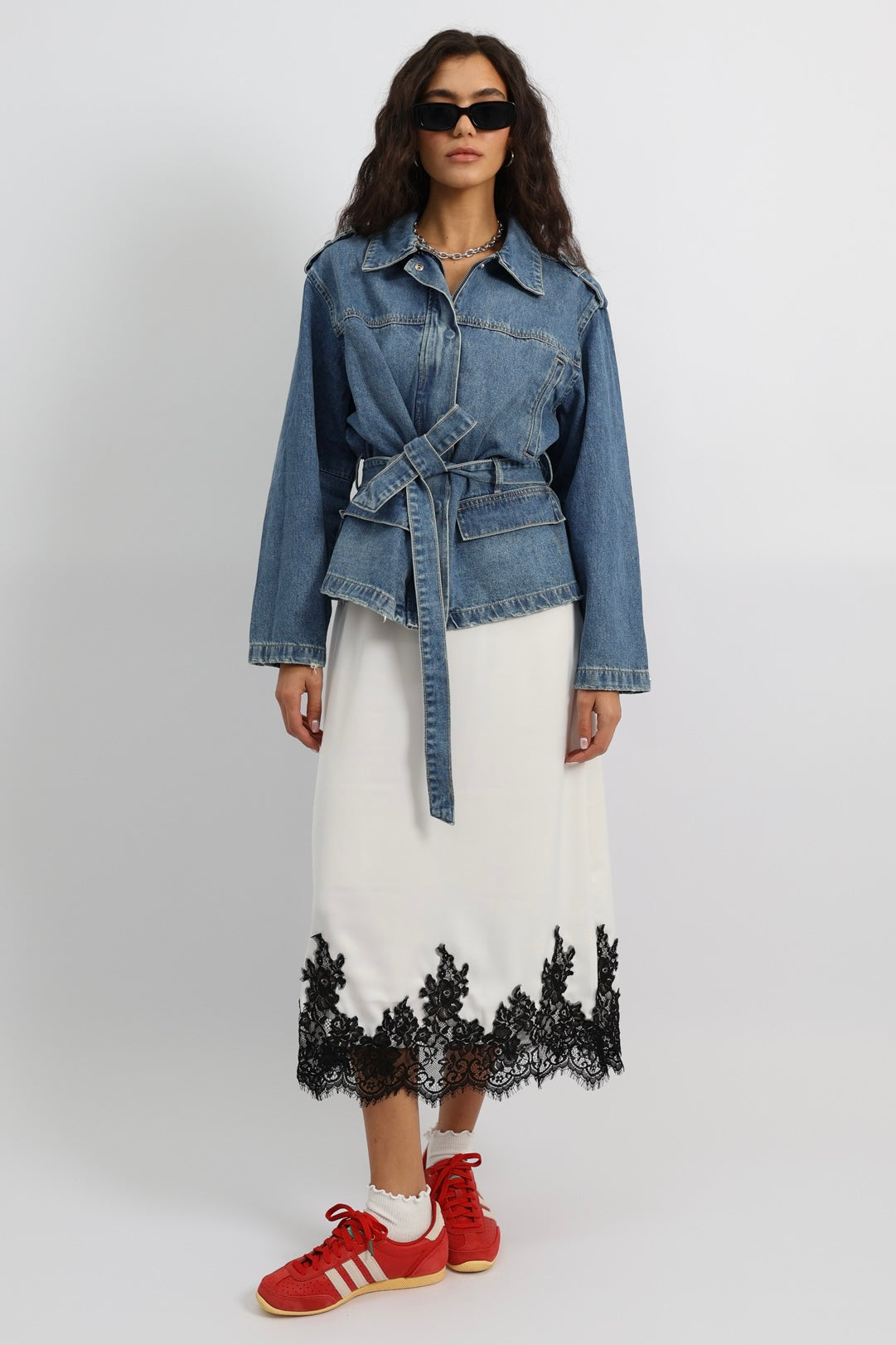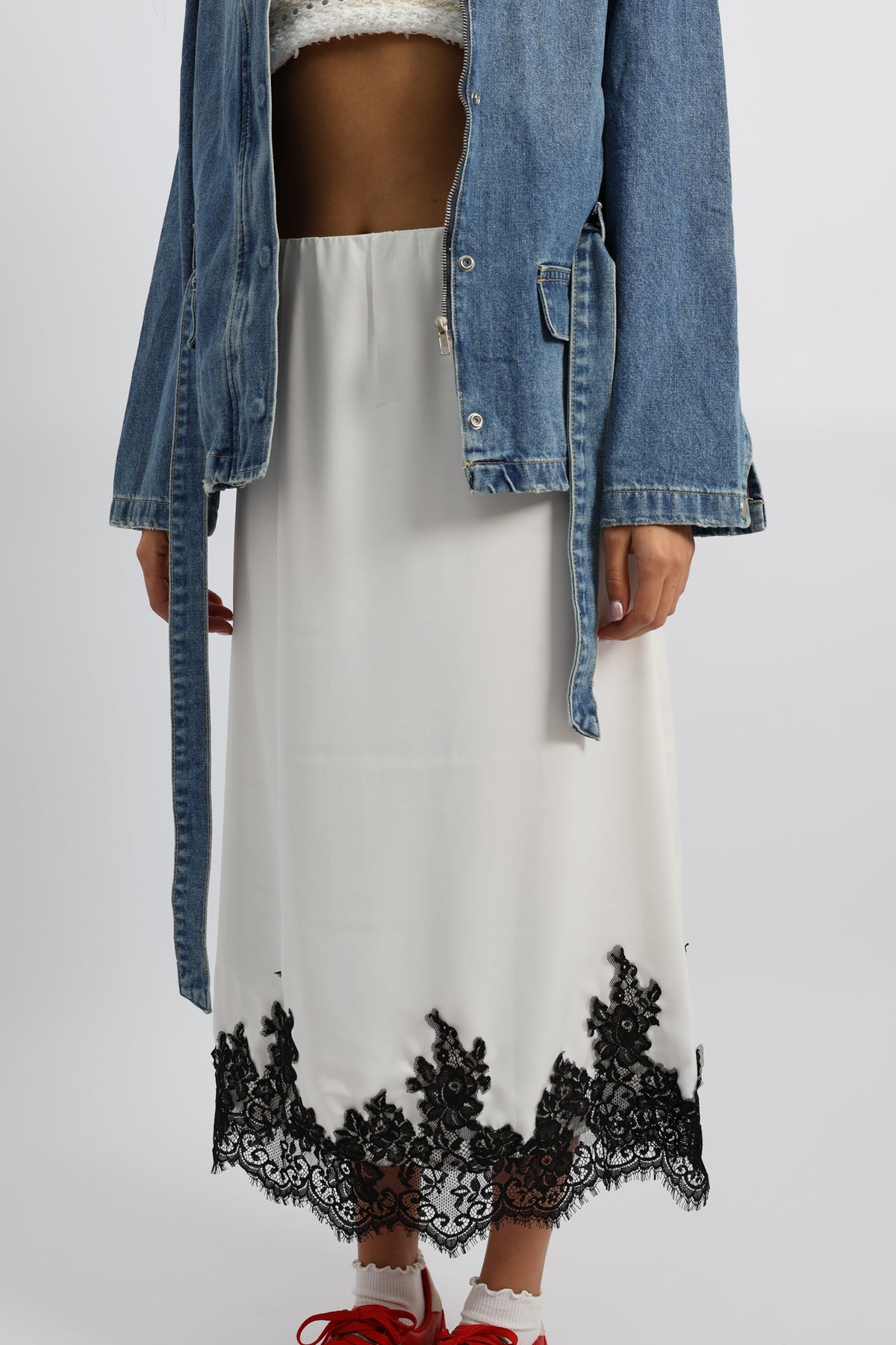 חצאית נשפכת בגזרה נקייה עם סיומת תחרה דרמטית, משלבת אלגנטיות רכה עם טוויסט יומיומי.