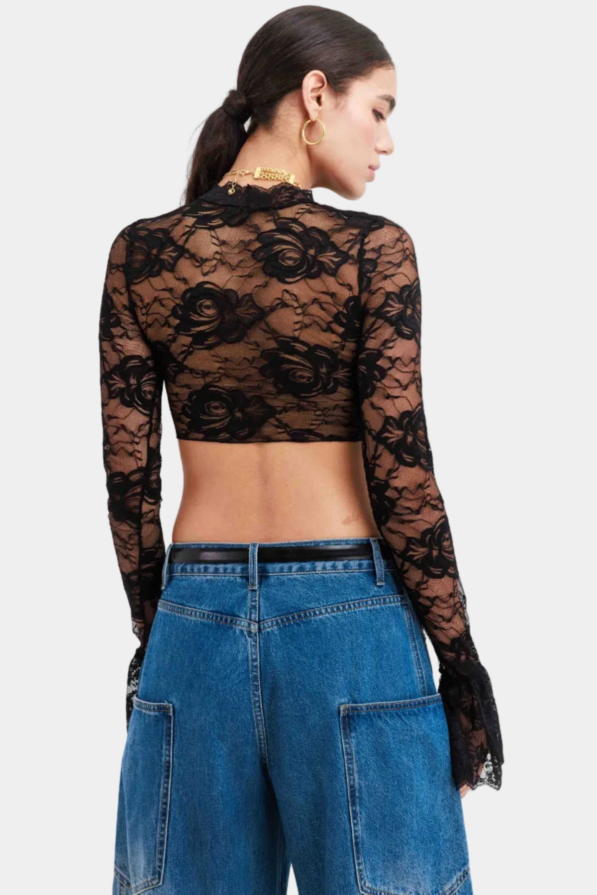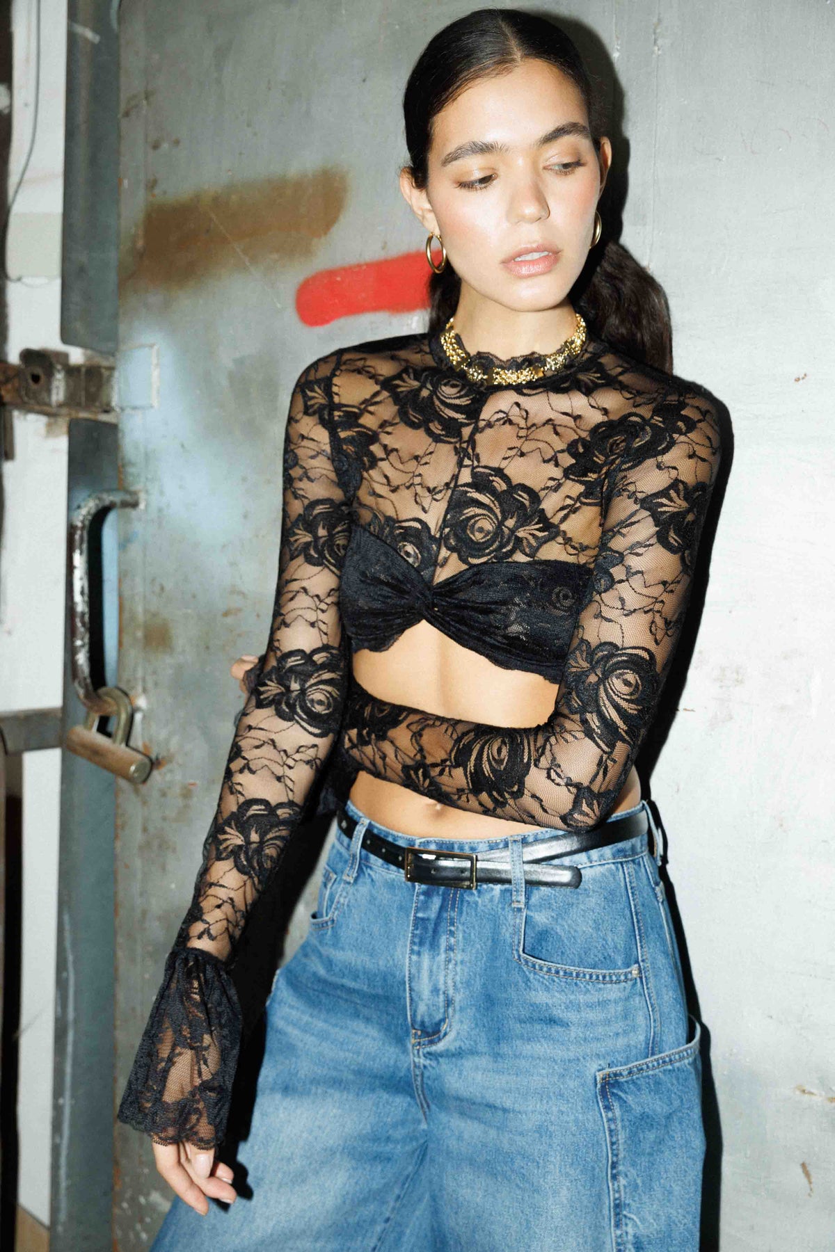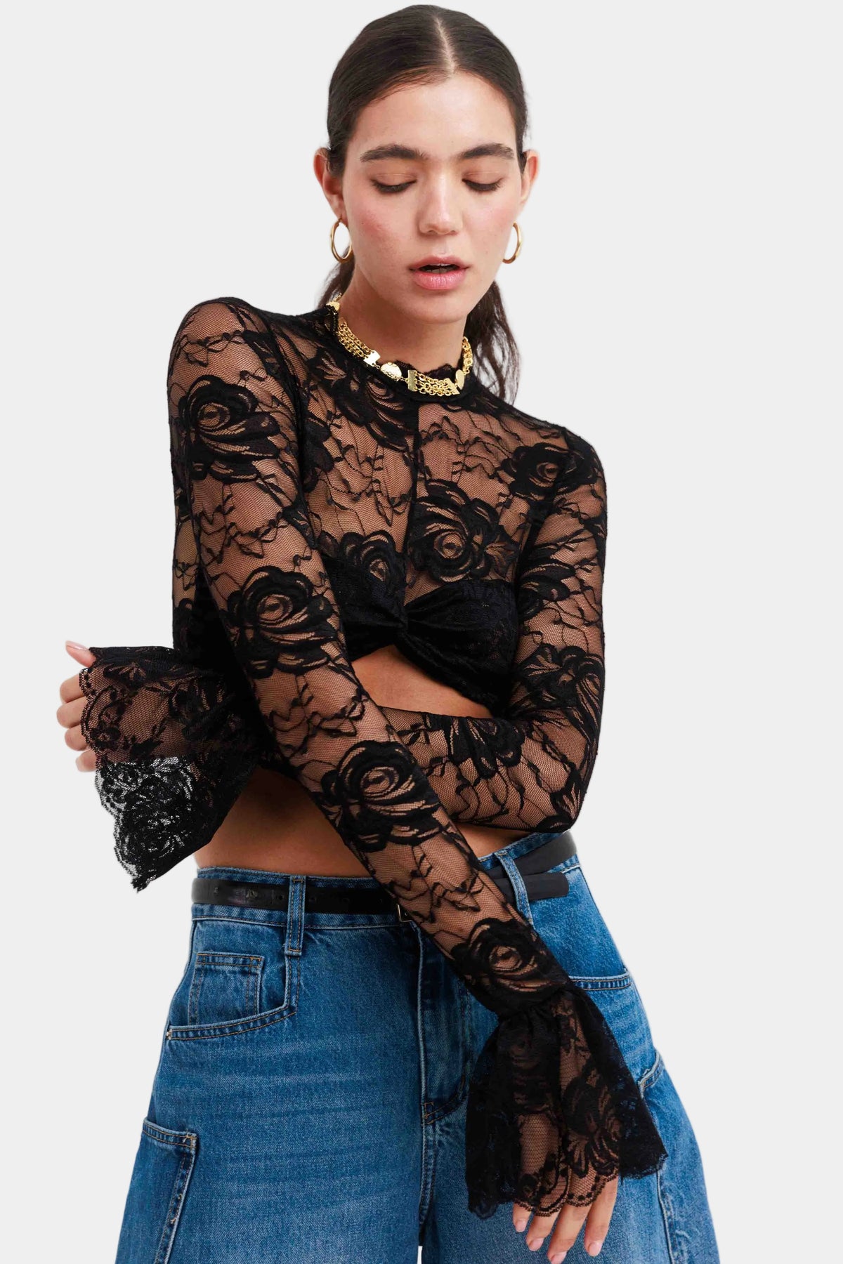 טופ תחרה בגזרה נשית עם עיטורי פרחים עדינים, כיווצים באזור החזה וסיומת מלמלה רחבה.