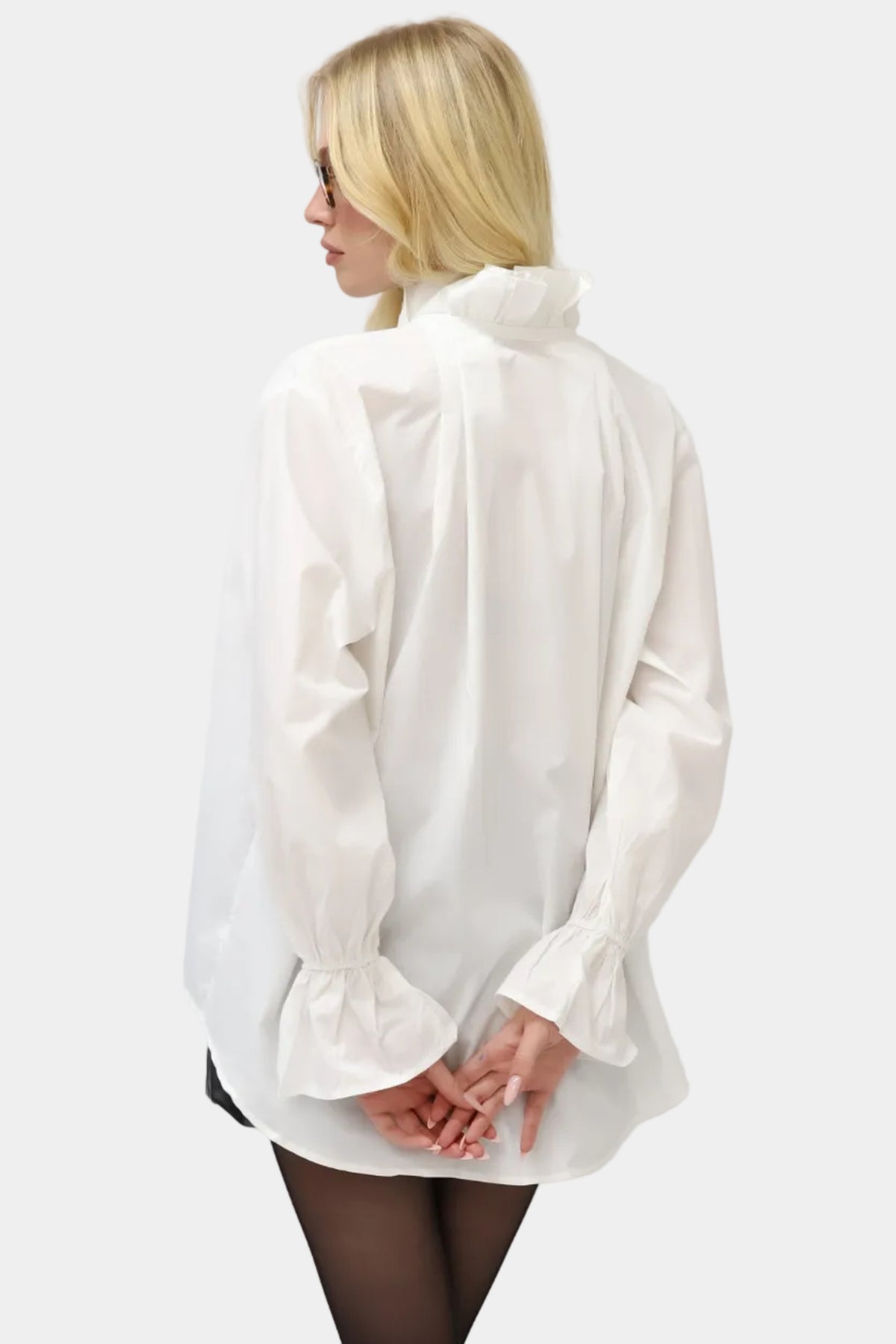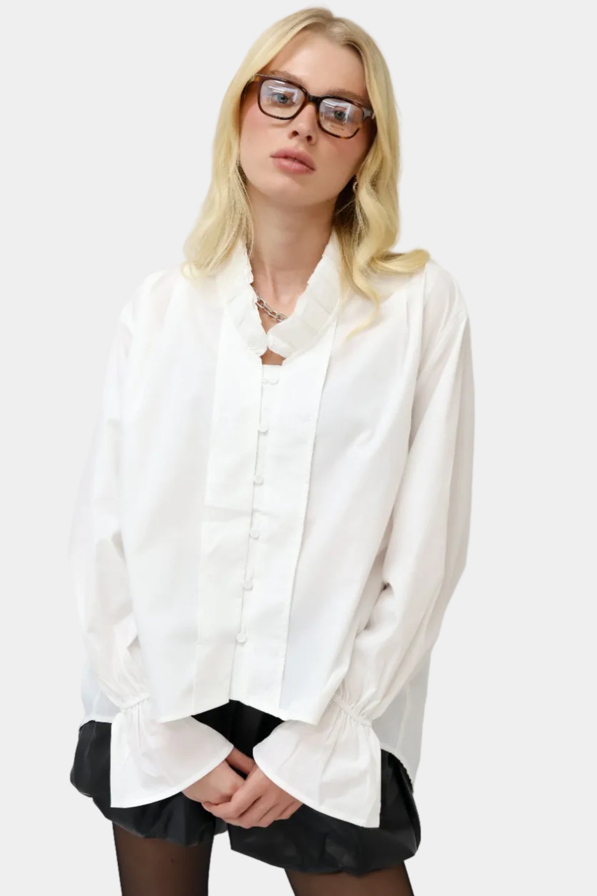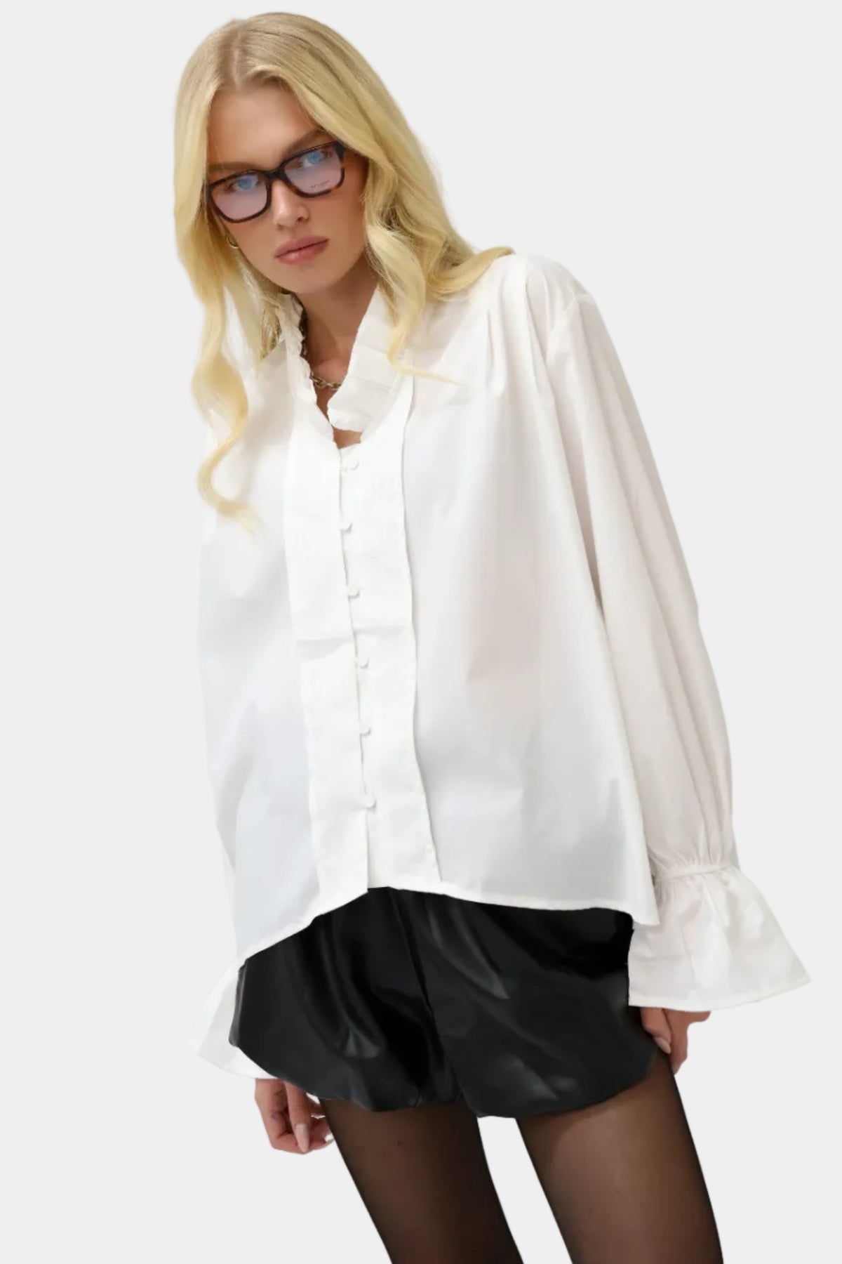 חולצה מכופתרת בגזרה רכה ונשפכת, עם מראה נקי ואלגנטי שמתאים ליום ולערב.