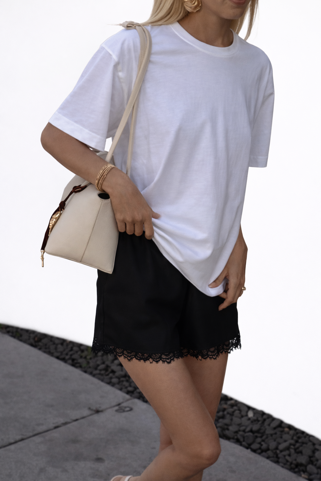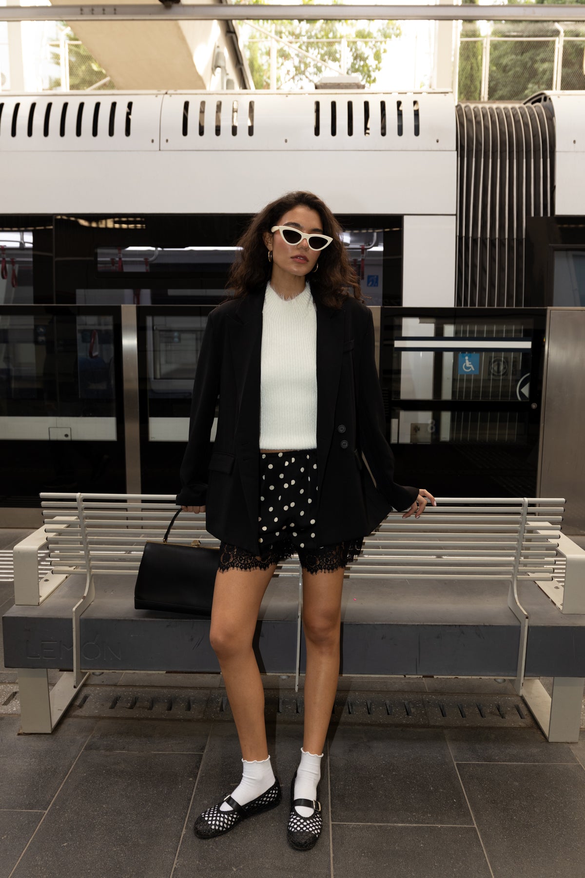 מכנס שורט קליל עם גומי במותן, בד נשפך ותחרה עדינה למראה אלגנטי ונוח ליום ולערב. OS מתאים ל־34–40 | צבעים: שחור עם נקודות לבן, לבן עם נקודות שחור