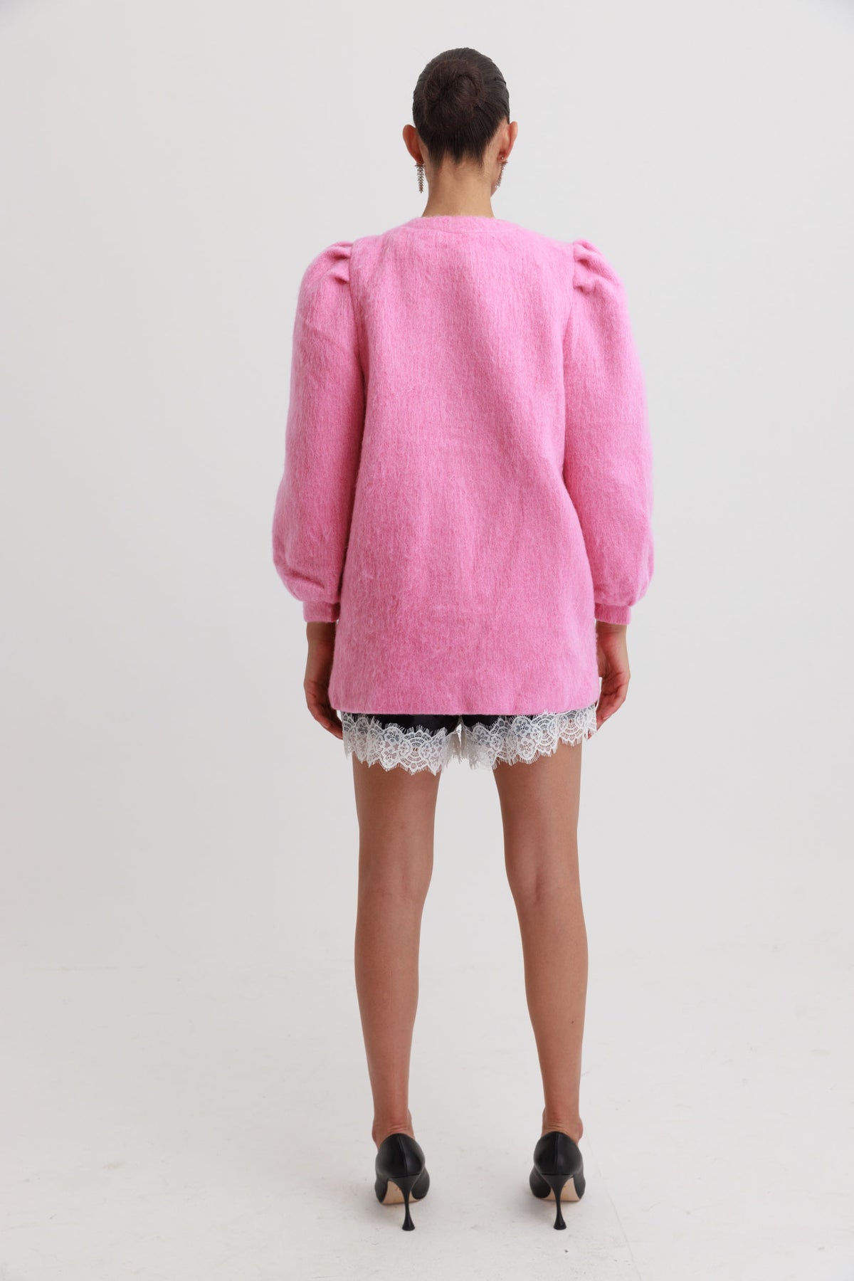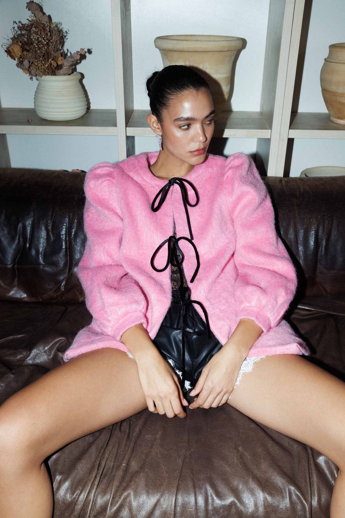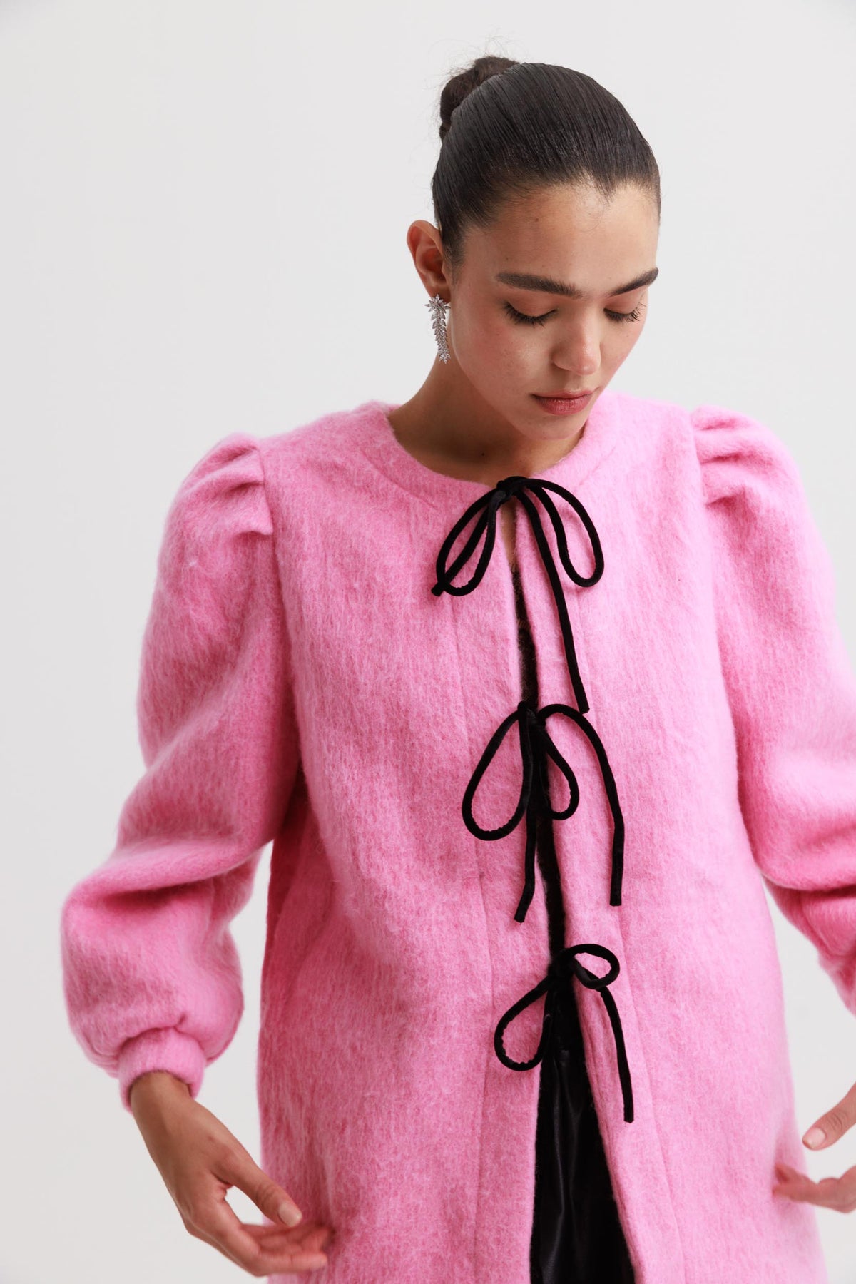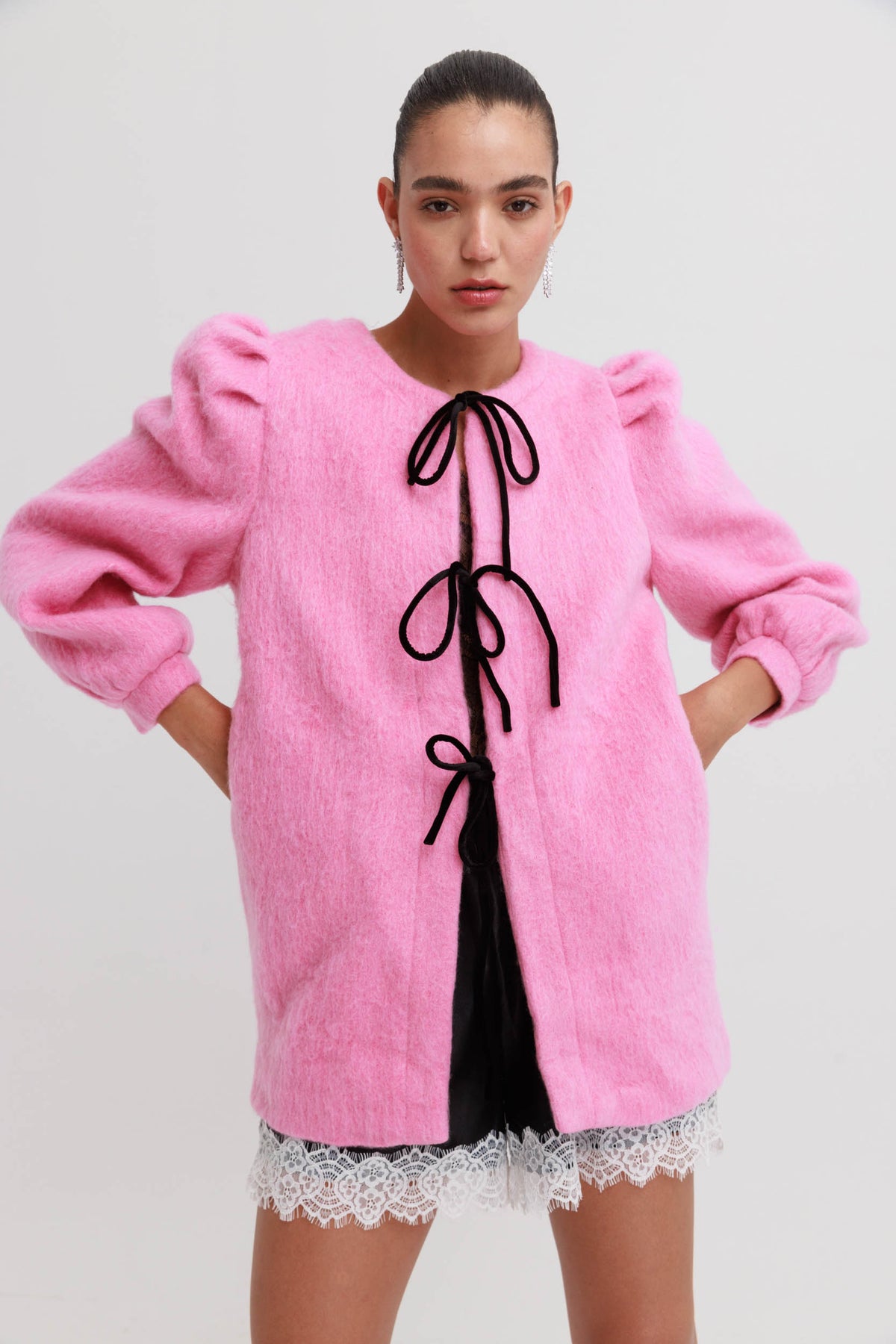 מעיל צמר רך עם שרוולים תפוחים עדינים שלוש קשירות סרט שחורות לסגירה בחזית למראה בובתי ומלא שיק