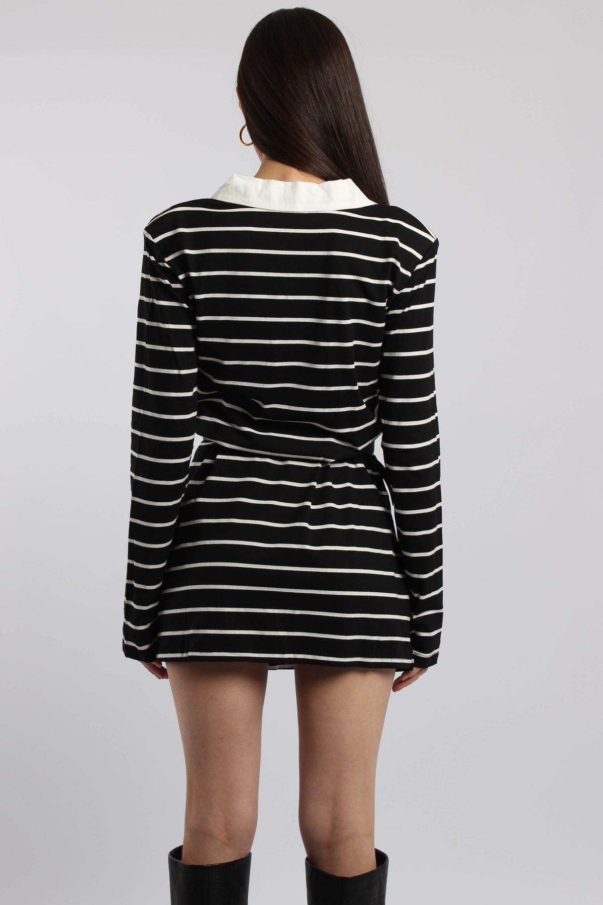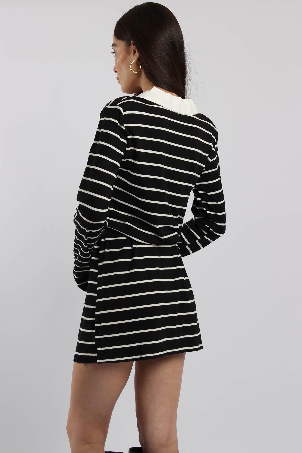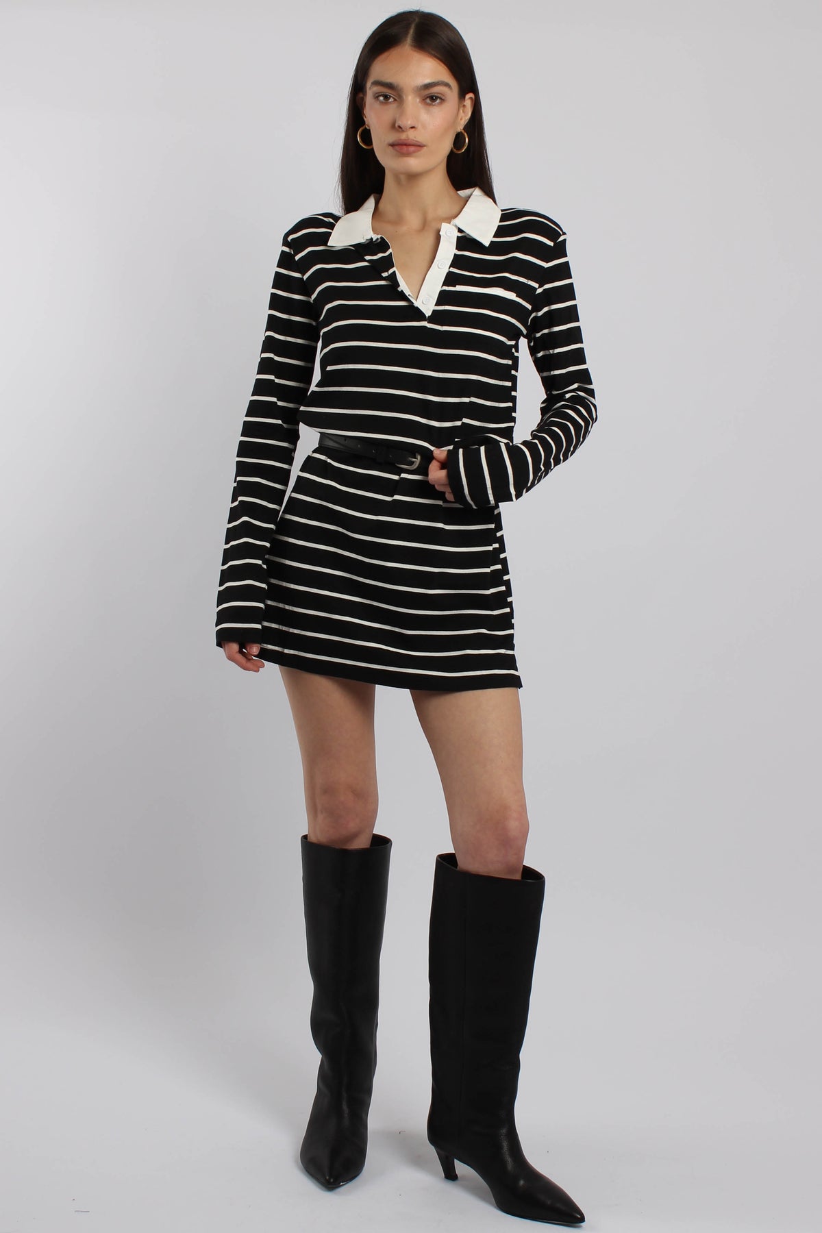 שמלת היילי בגזרת מיני עם פסים עדינים, מגיעה עם חגורה להדגשת המותן ויוצרת מראה נשי ומאוזן שמתאים ליום או ערב.