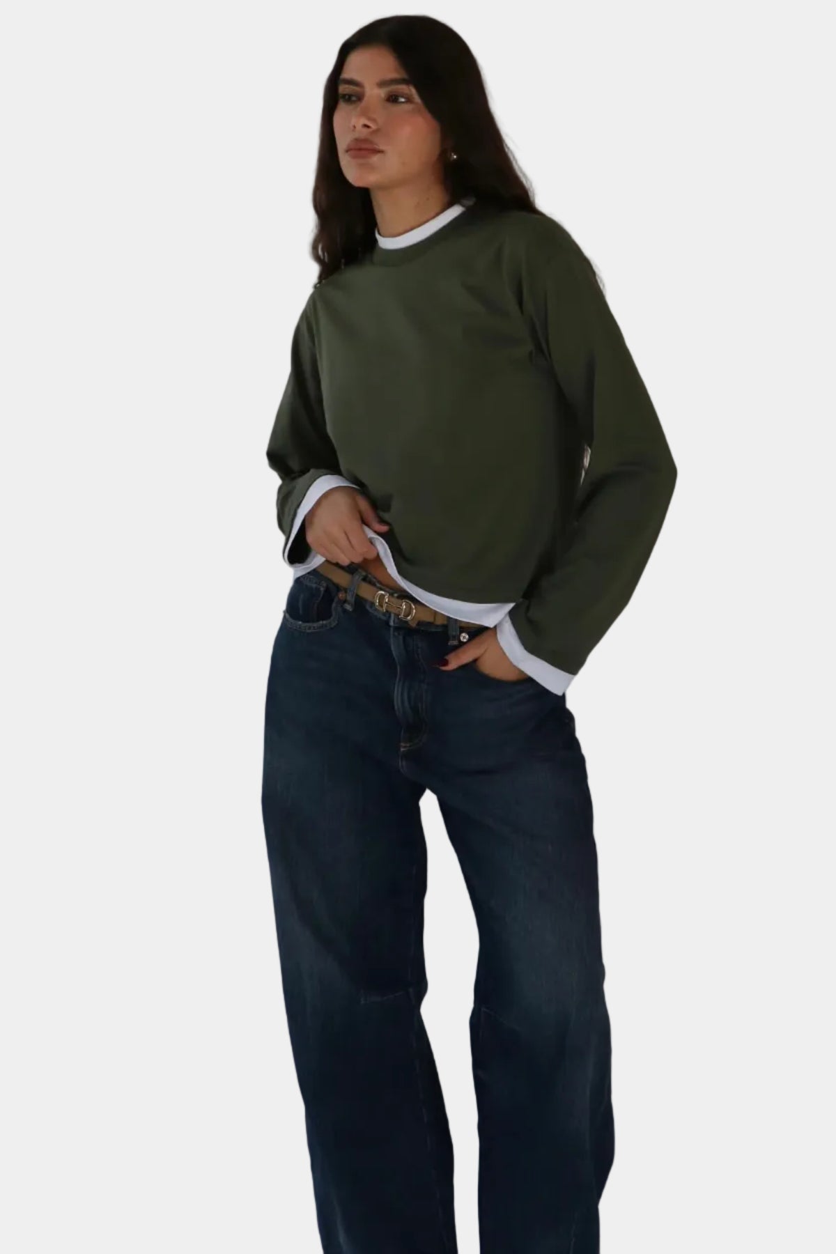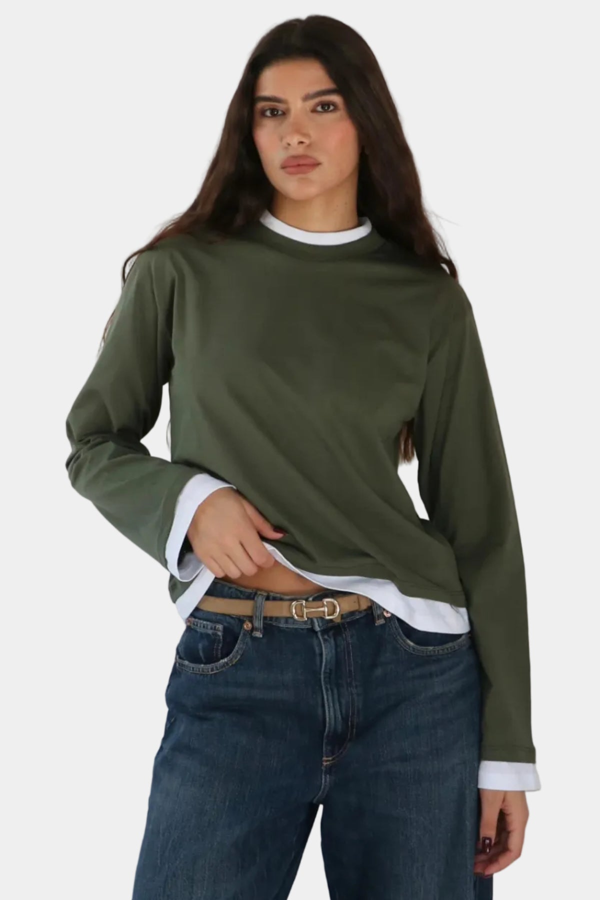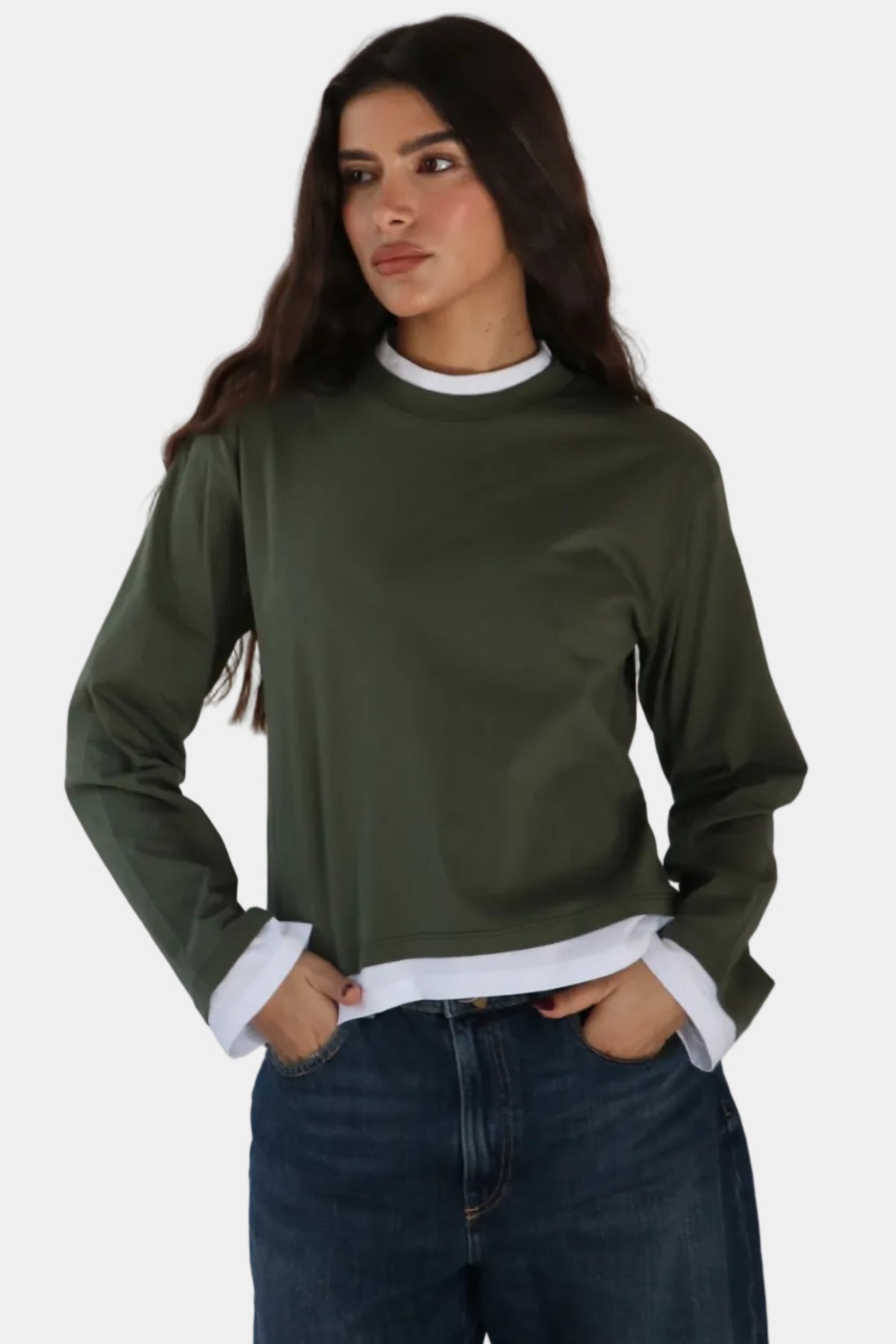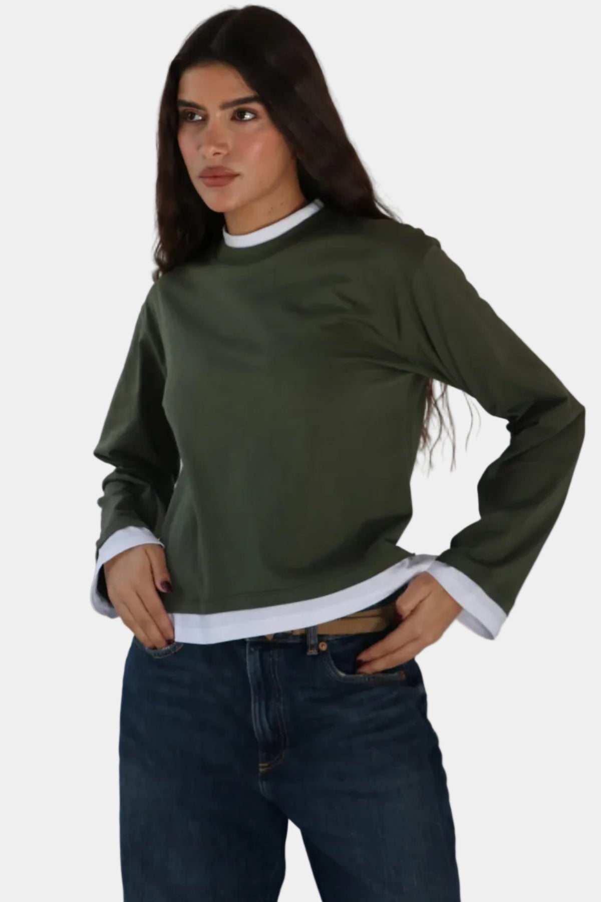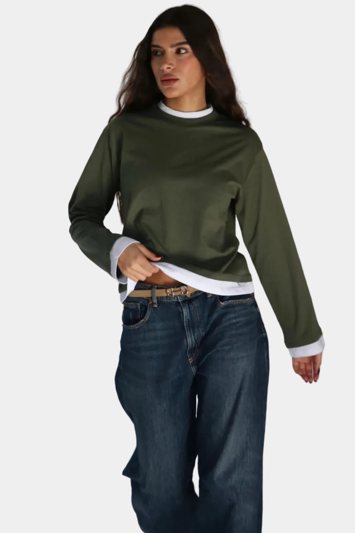 חולצה ארוכה בגזרה נקייה עם מראה שכבות מובנה, צווארון עגול ושרוולים ארוכים עם סיומת לבנה. לוק מינימליסטי ומדויק שמתאים ליום־יום.