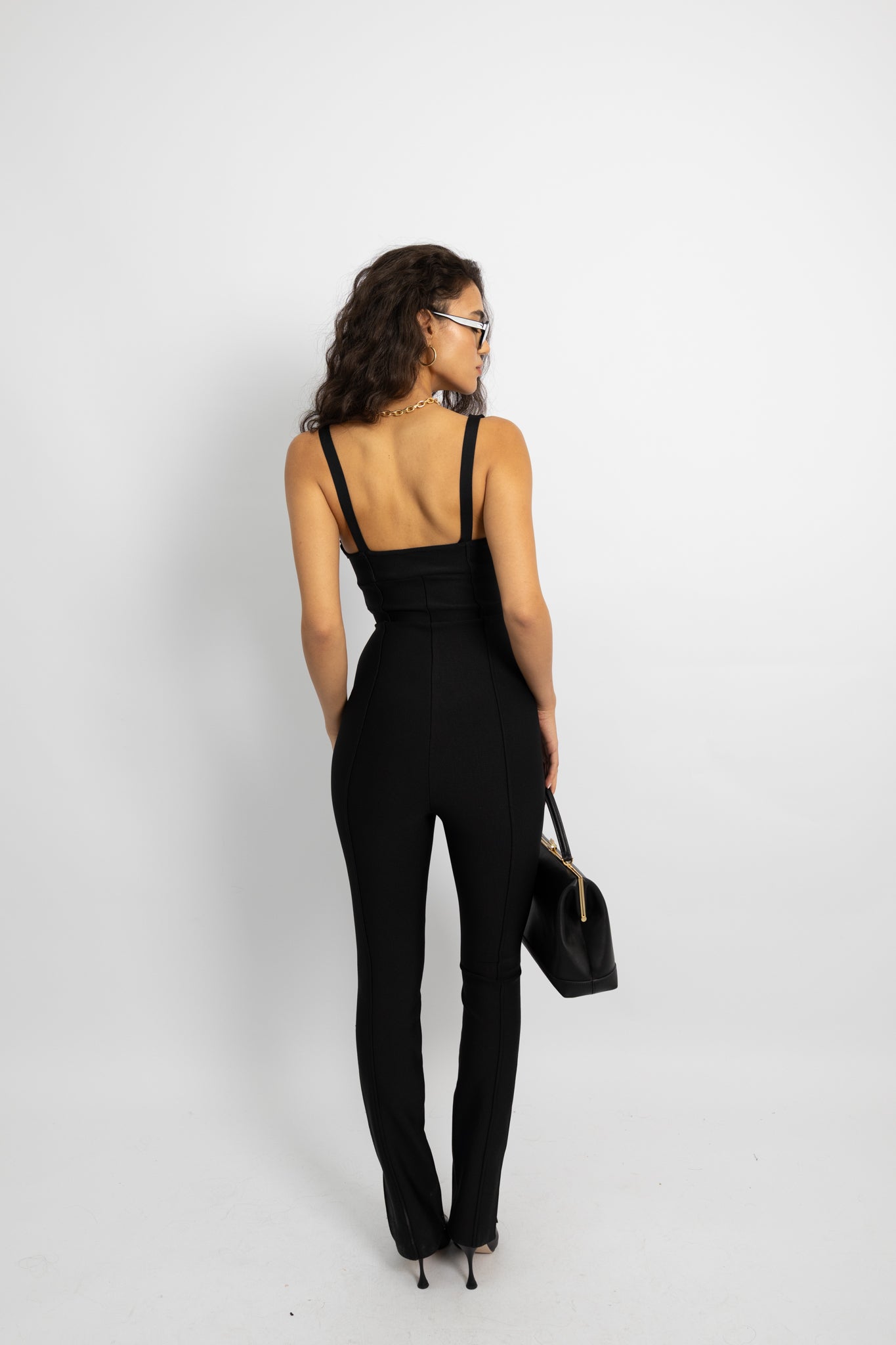 אוברול שחור מחטב עם פתיחה עדינה בחזה, בד נמתח, יושב צמוד במידה מחמיאה זה הסגנון