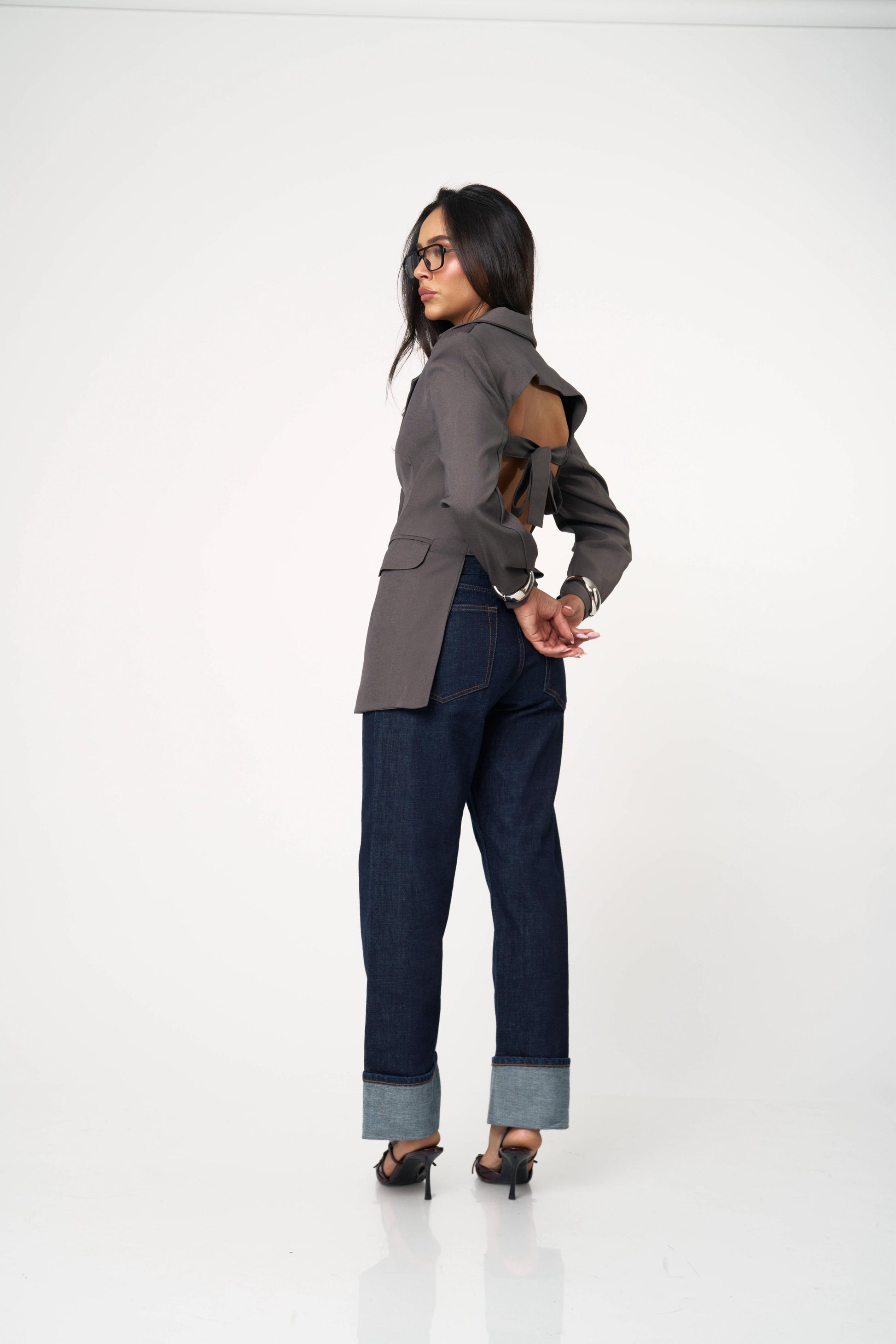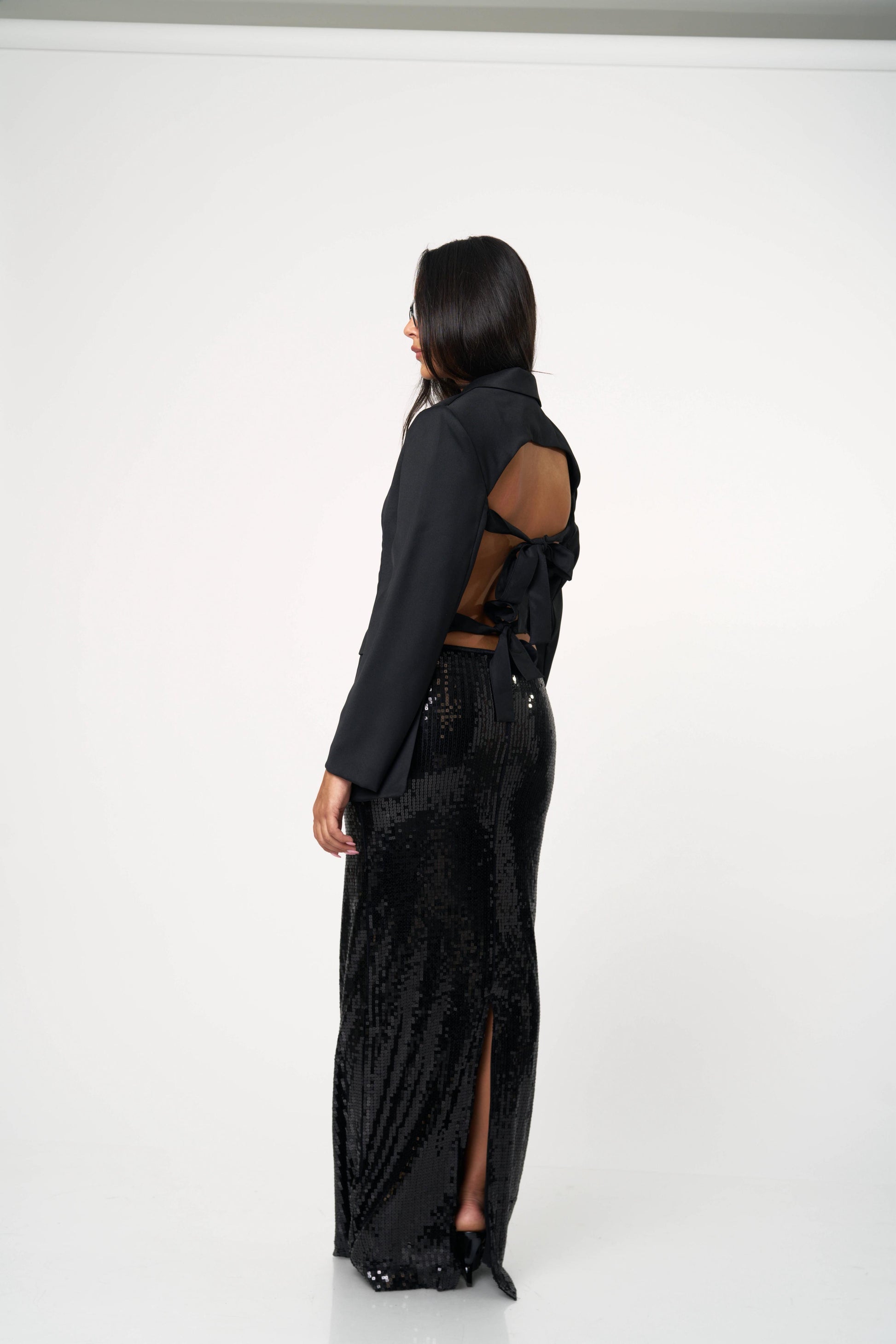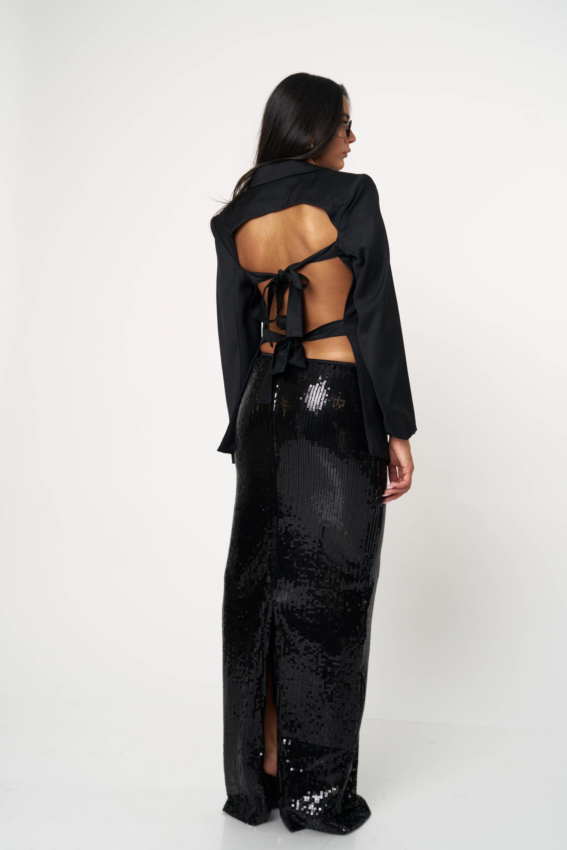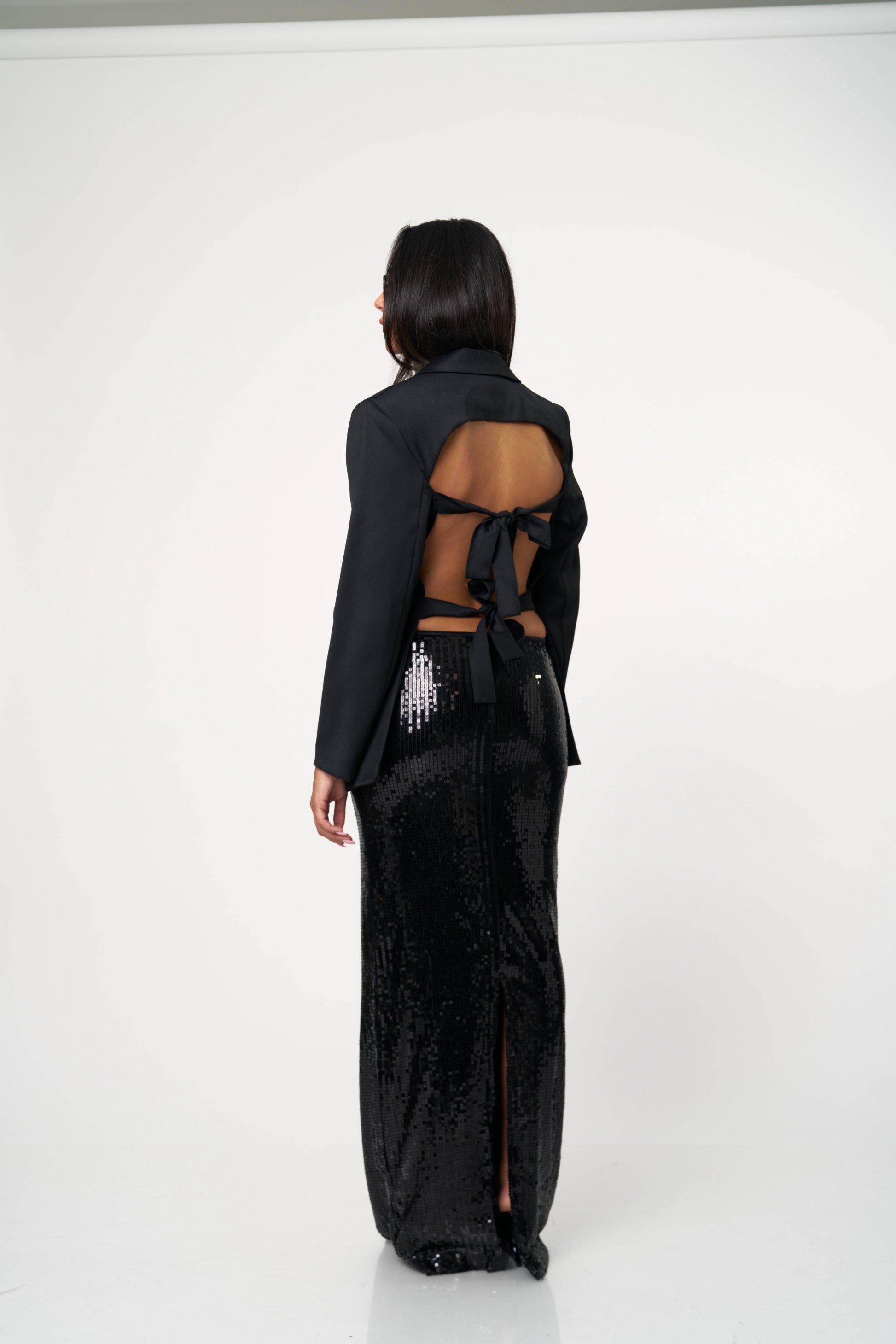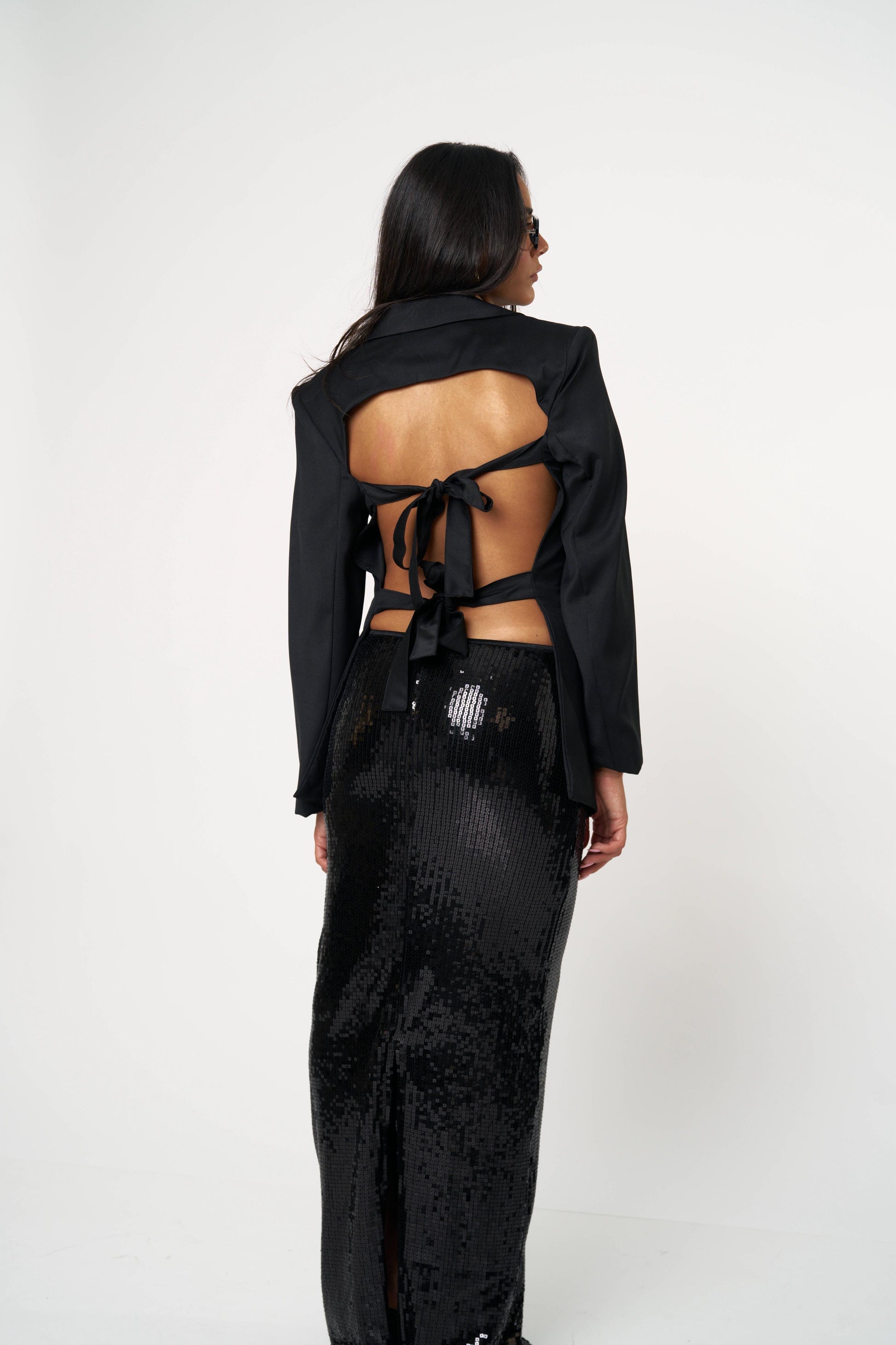 בלייזר קלאסי עם טוויסט נועז ואלגנטי — גזרה מחויטת בחזית ומראה דרמטי מאחור עם גב פתוח וקשירות כפולות. שילוב מושלם בין לוק רשמי לנשיות חושנית. מתאים גם ליום עם ג’ינס וגם לערב עם חצאית נוצצת.