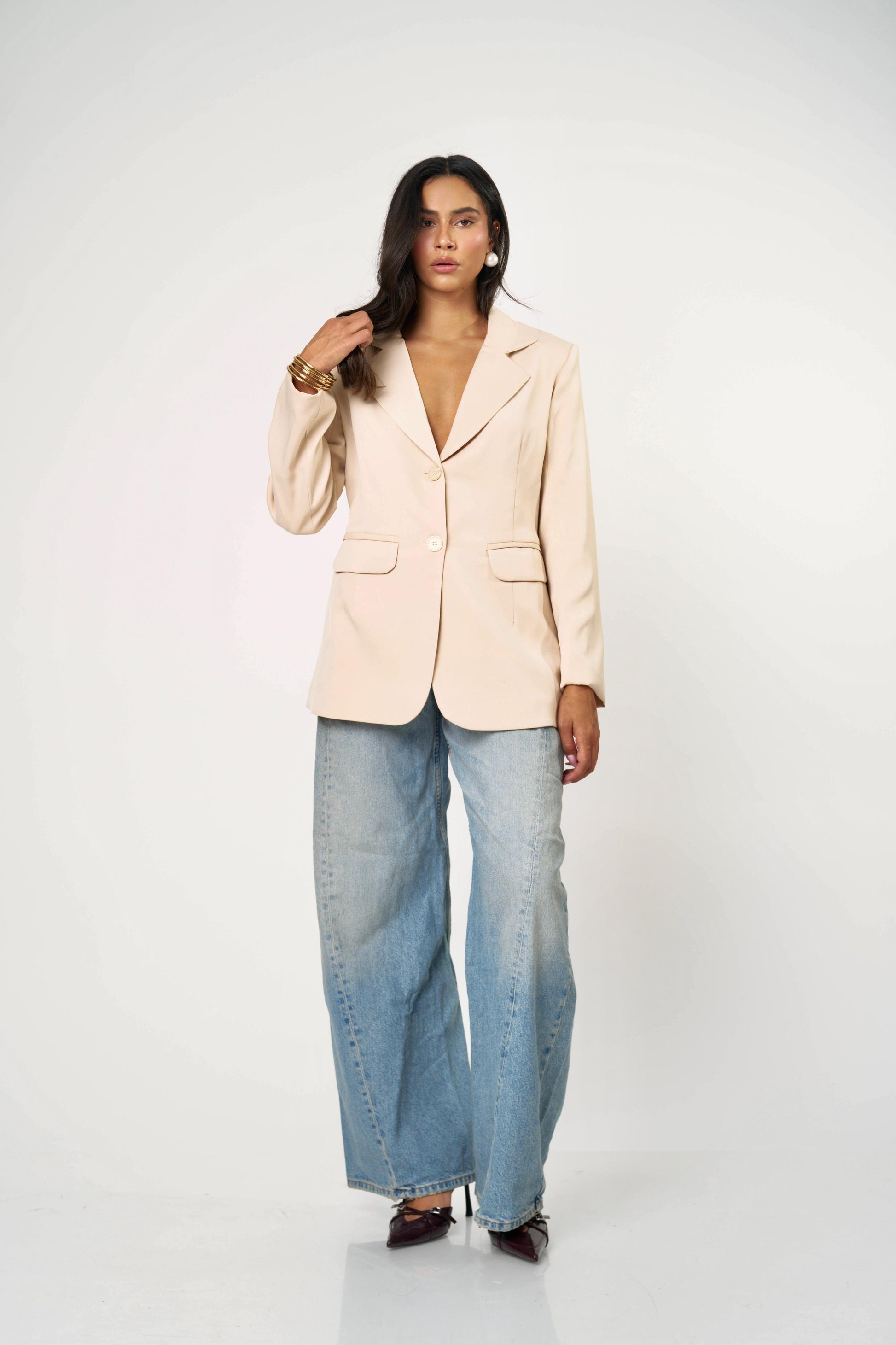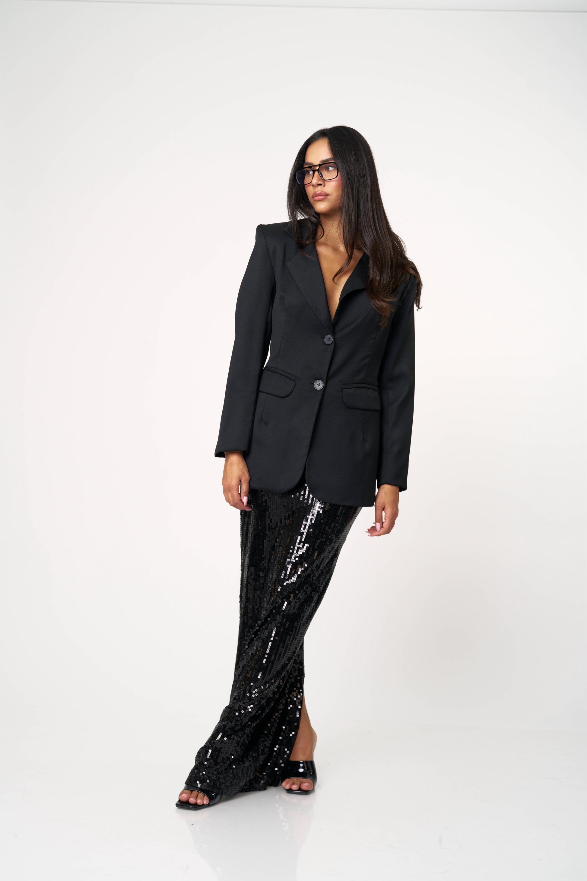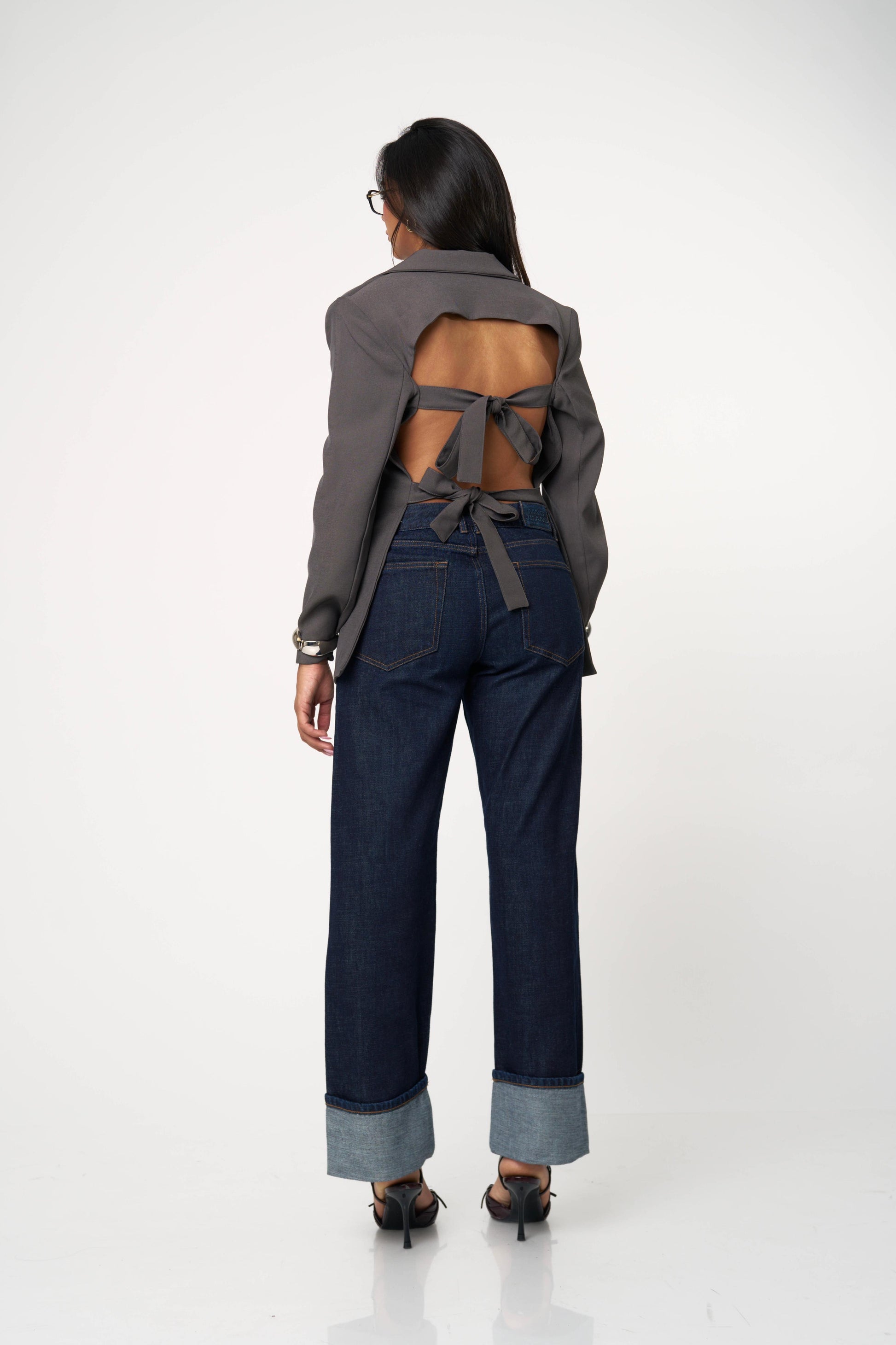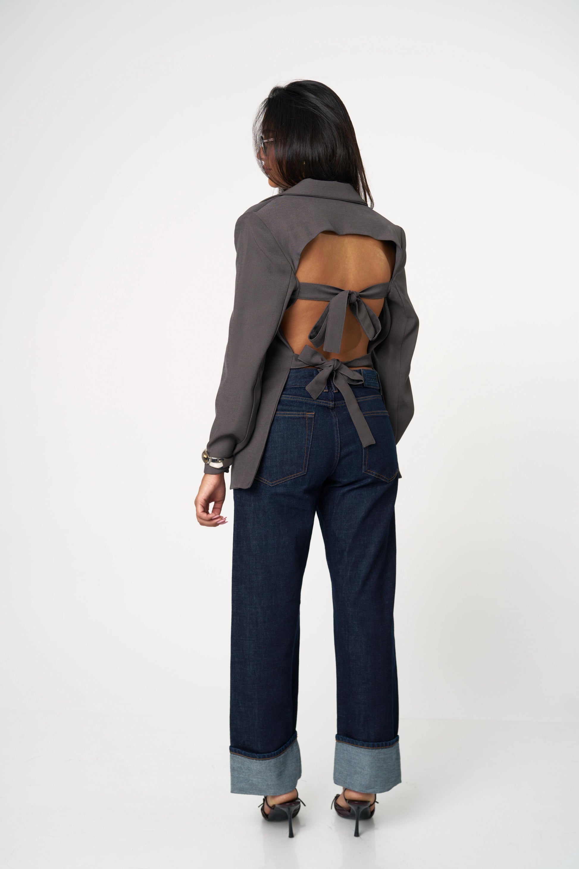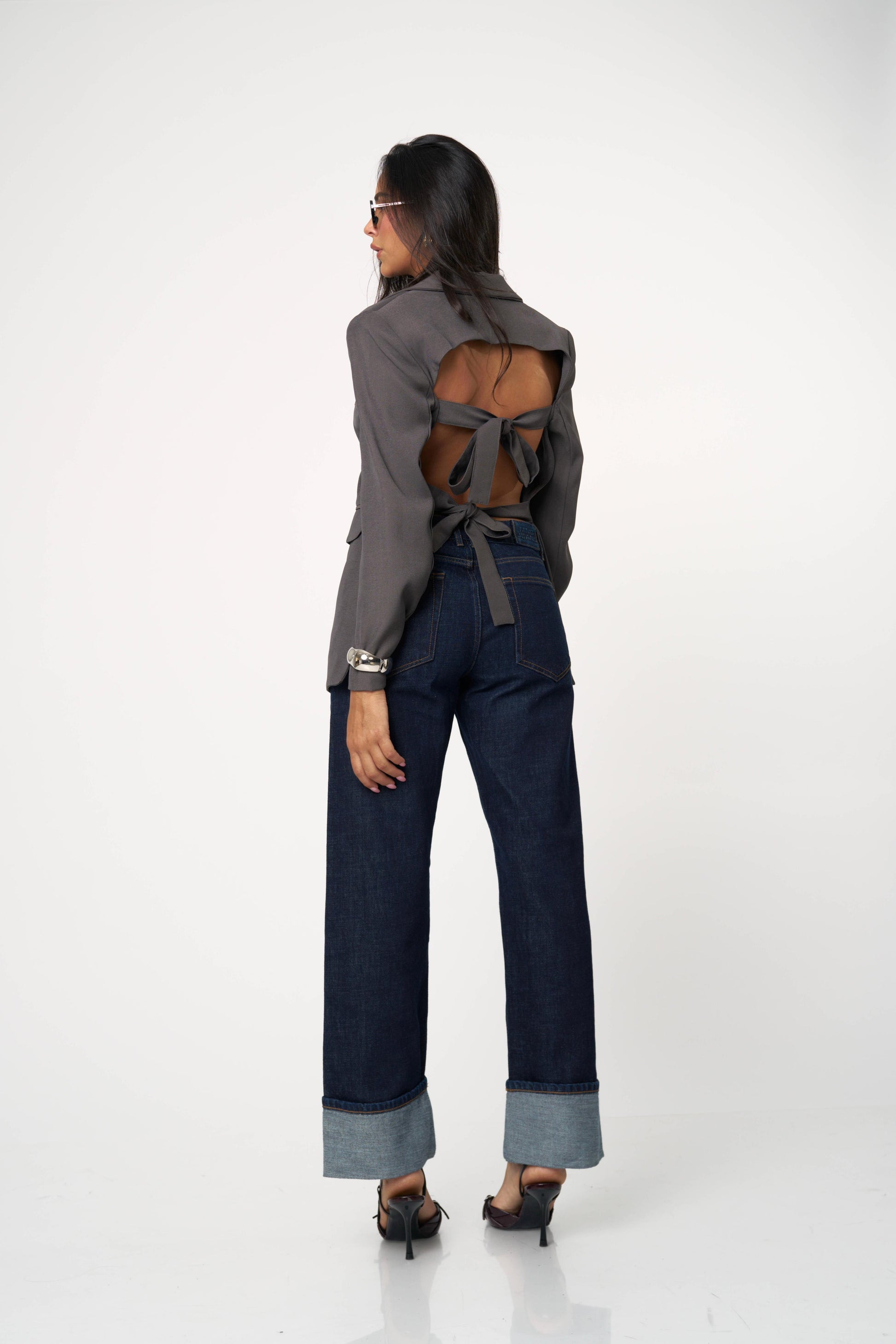 בלייזר קלאסי עם טוויסט נועז ואלגנטי — גזרה מחויטת בחזית ומראה דרמטי מאחור עם גב פתוח וקשירות כפולות. שילוב מושלם בין לוק רשמי לנשיות חושנית. מתאים גם ליום עם ג’ינס וגם לערב עם חצאית נוצצת.