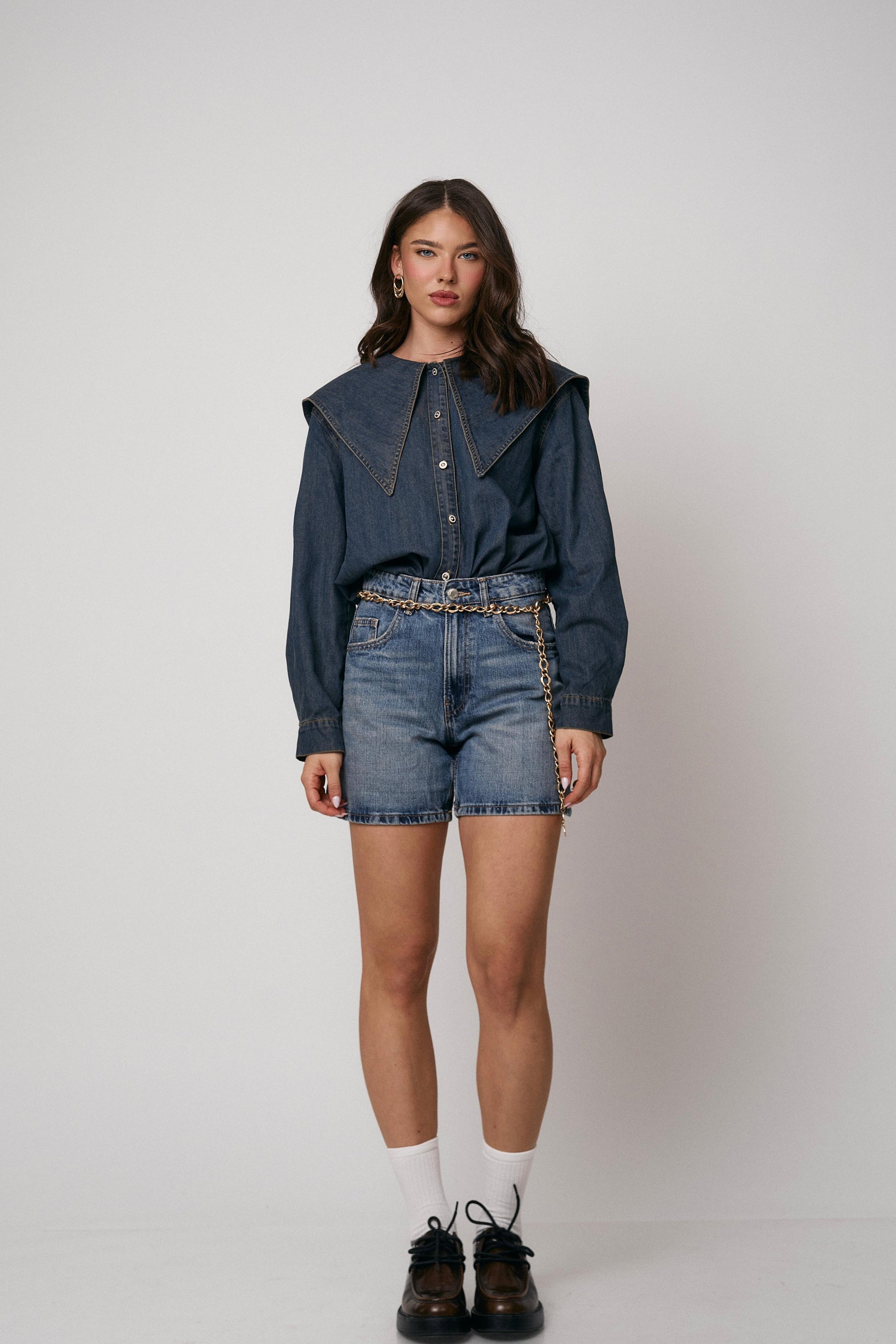 חולצת דנים ייחודית עם צווארון גדול ומודגש, גזרה משוחררת ומדויקת לסטייל אורבני וצעיר
