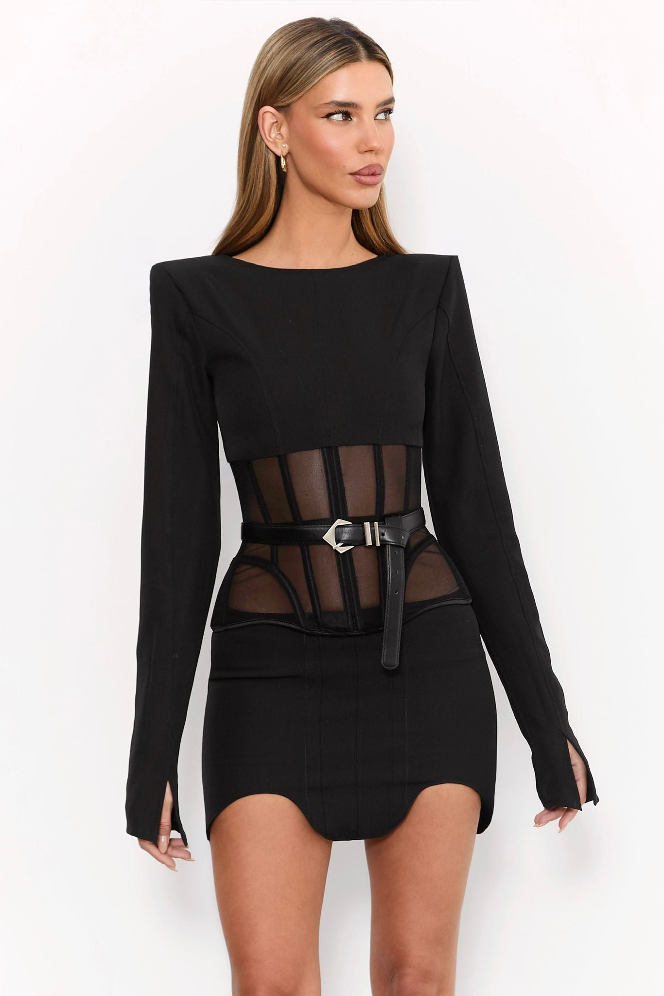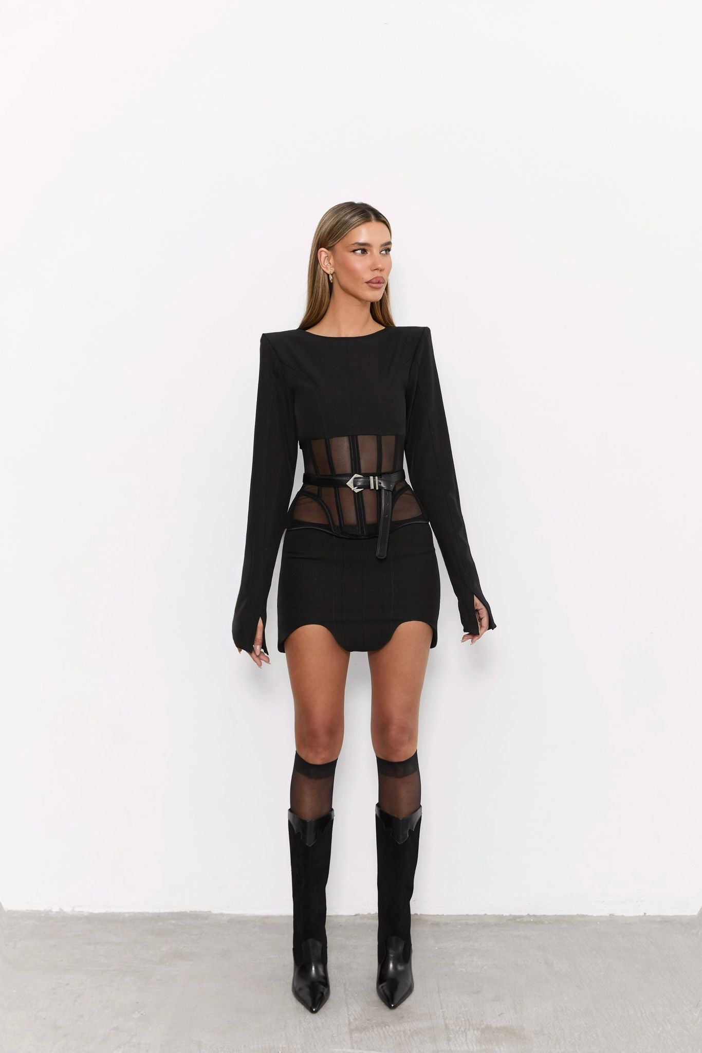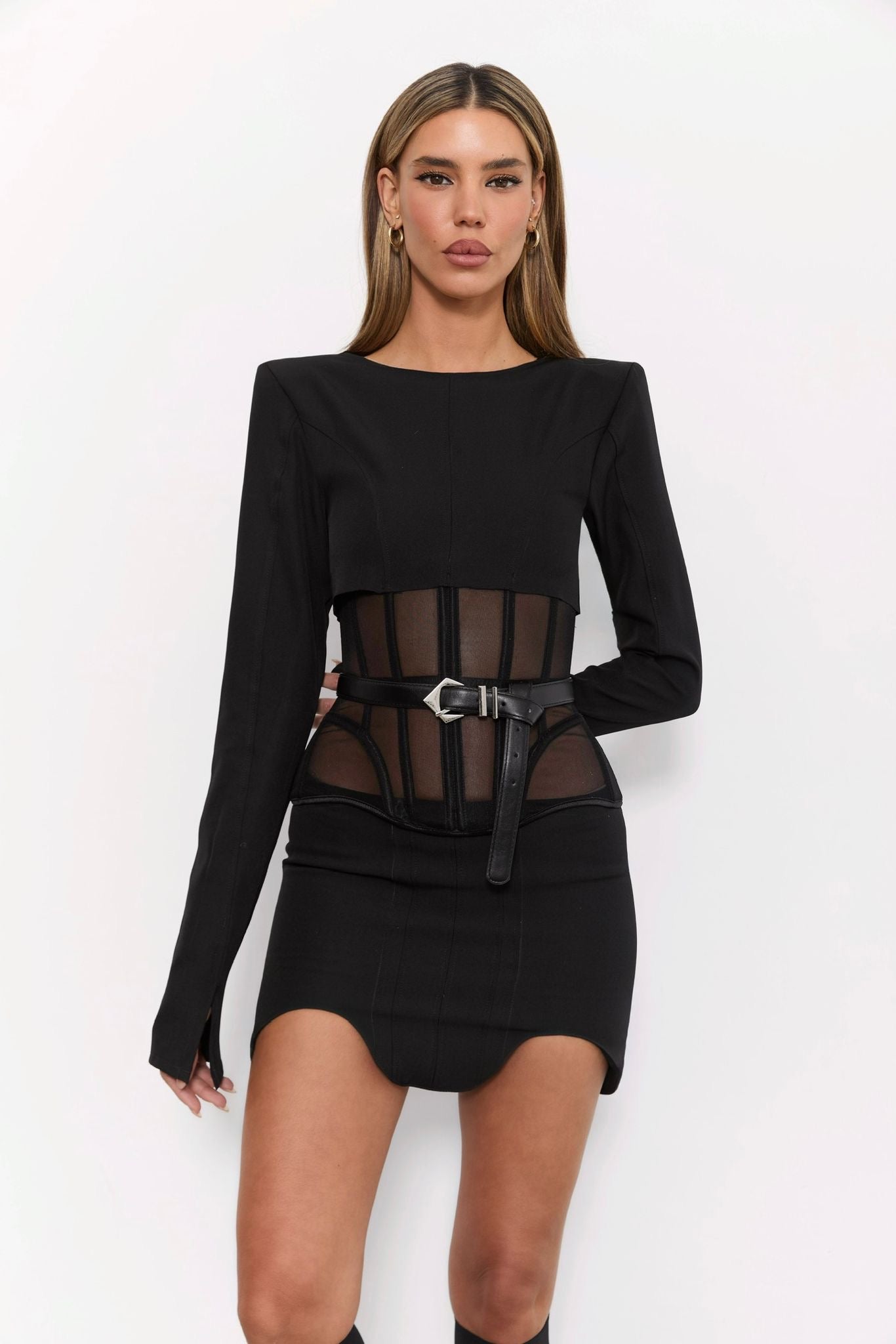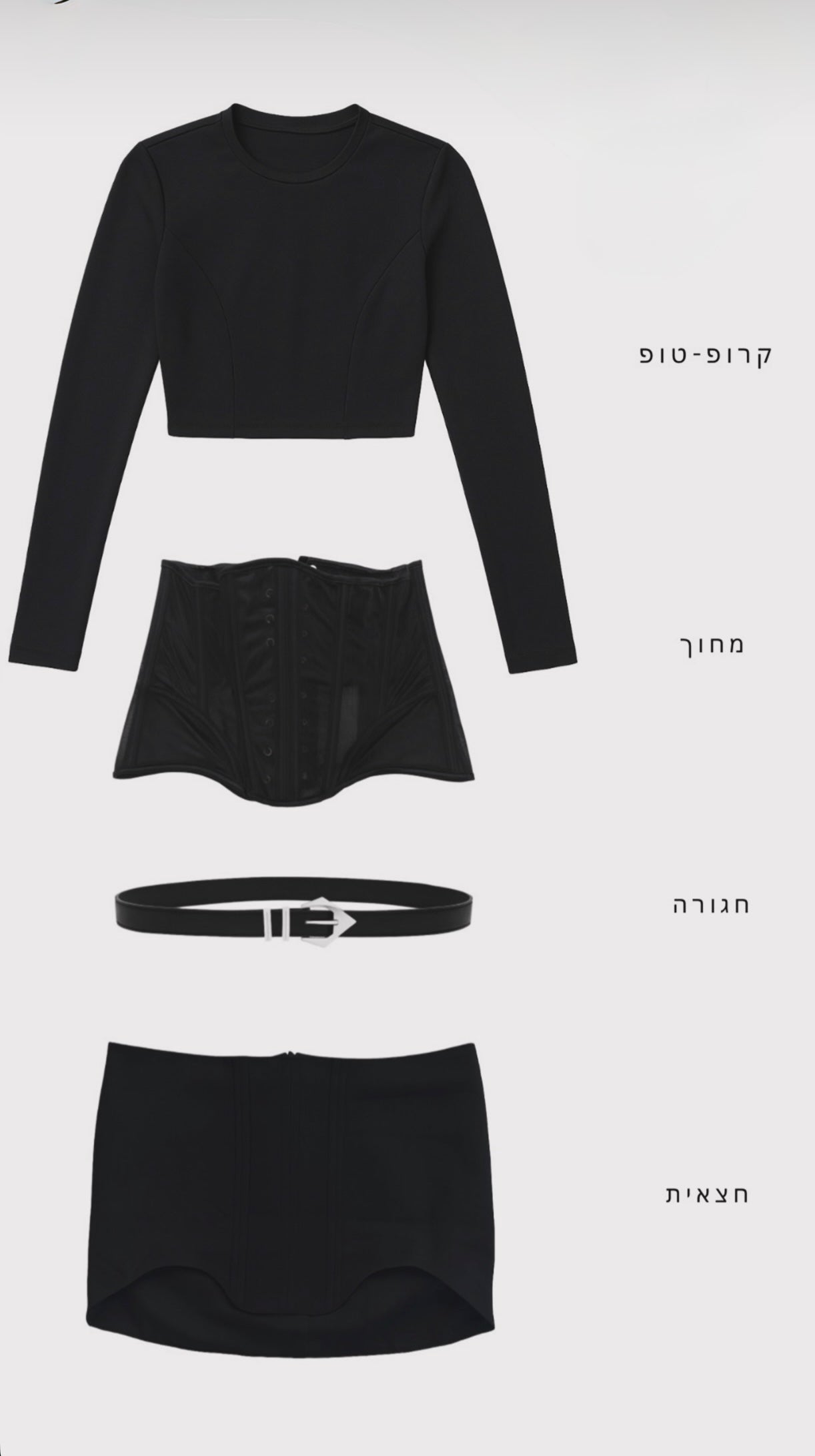 קרופ-טופ, מחוך שקפקף , חצאית מיני וחגורה