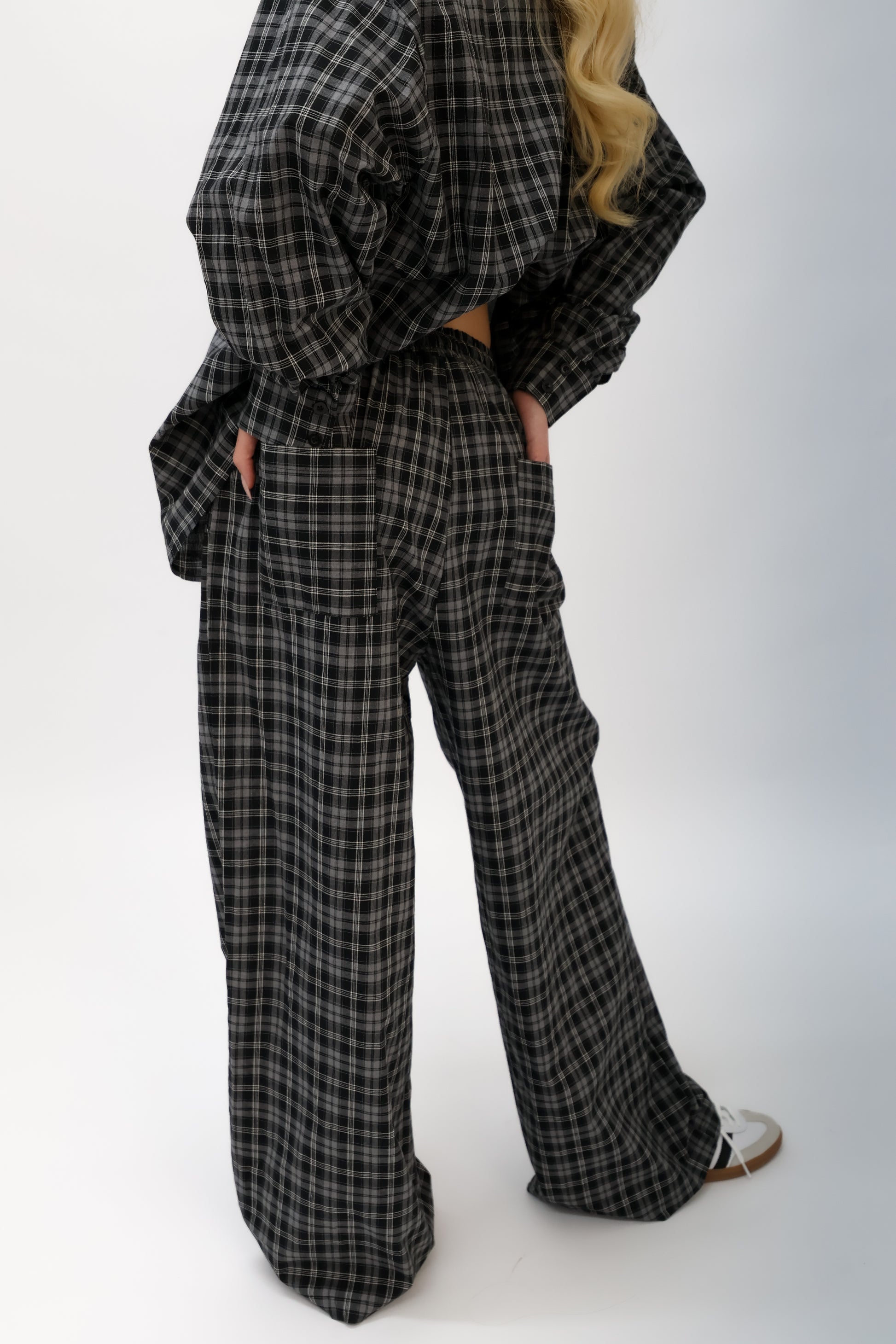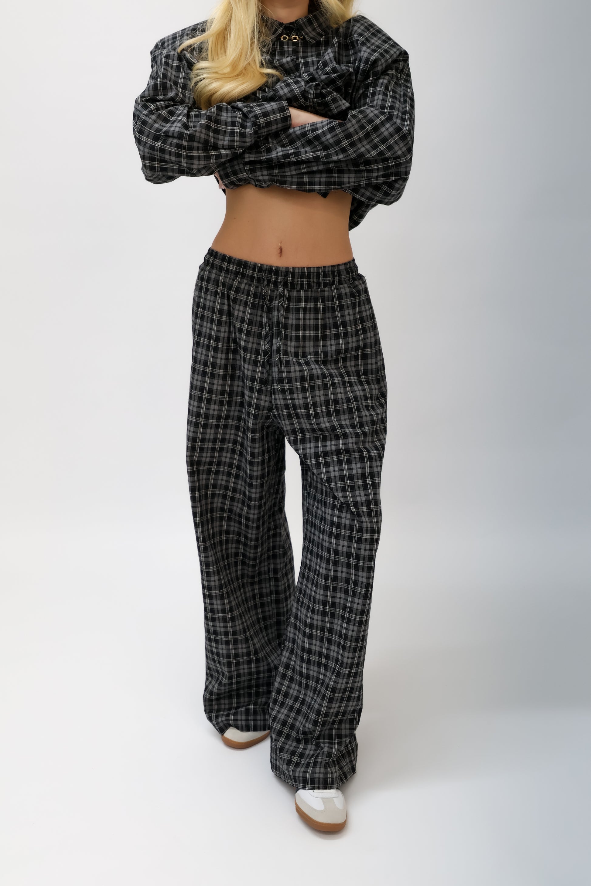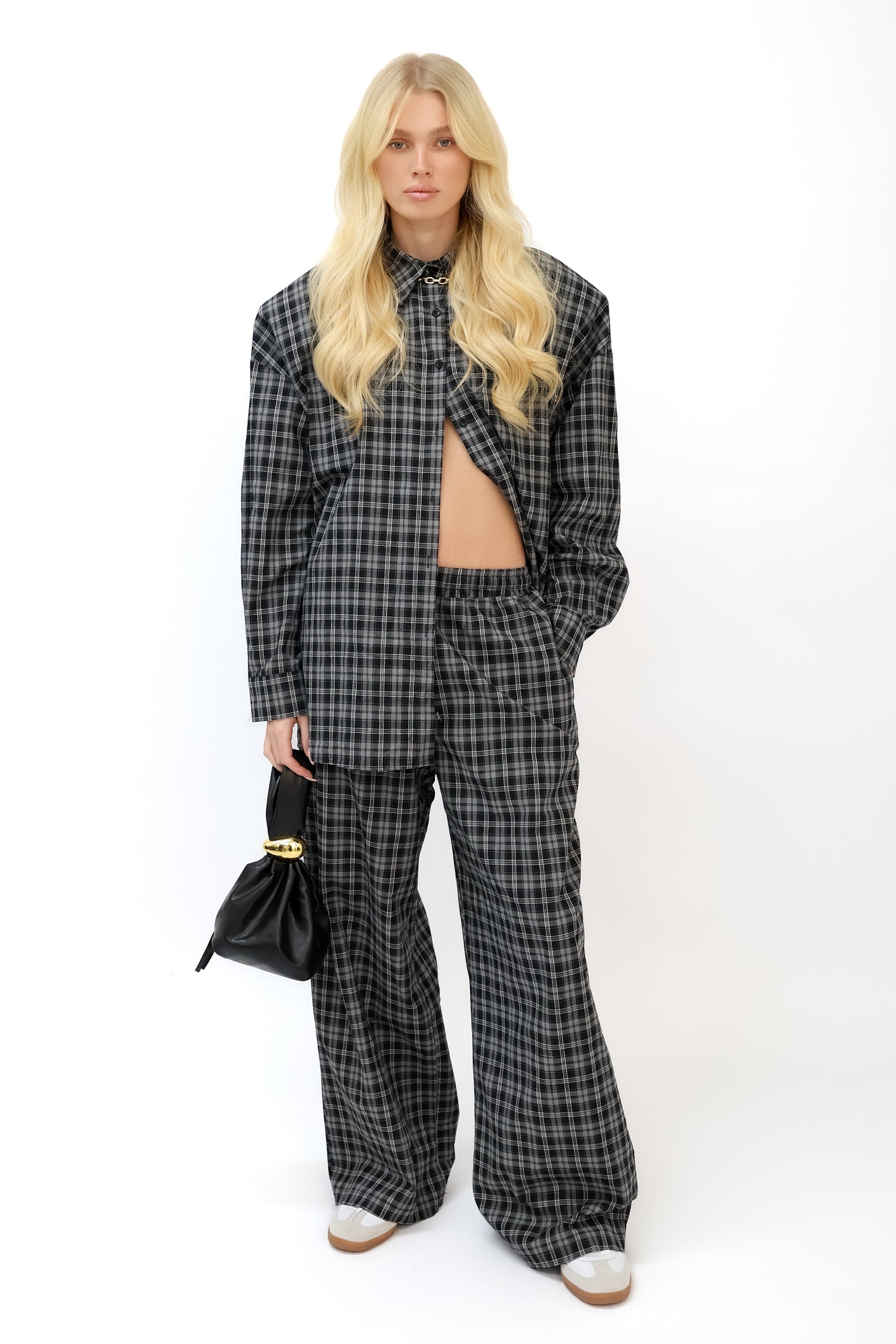 חליפה משובצת בסגנון אוברסייז, עם חולצה ומכנס רחבים למראה נינוח, אופנתי ומלא נוכחות.