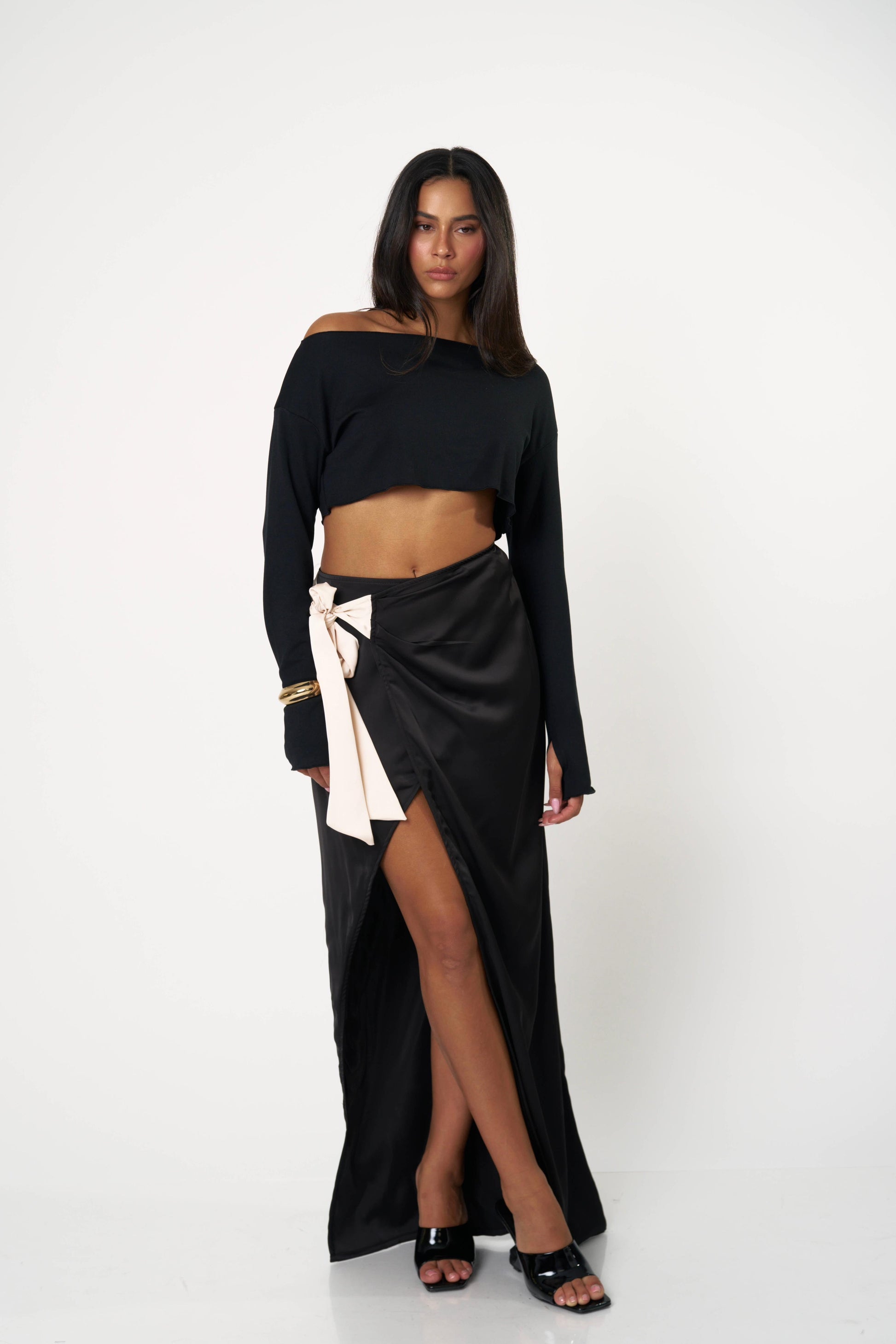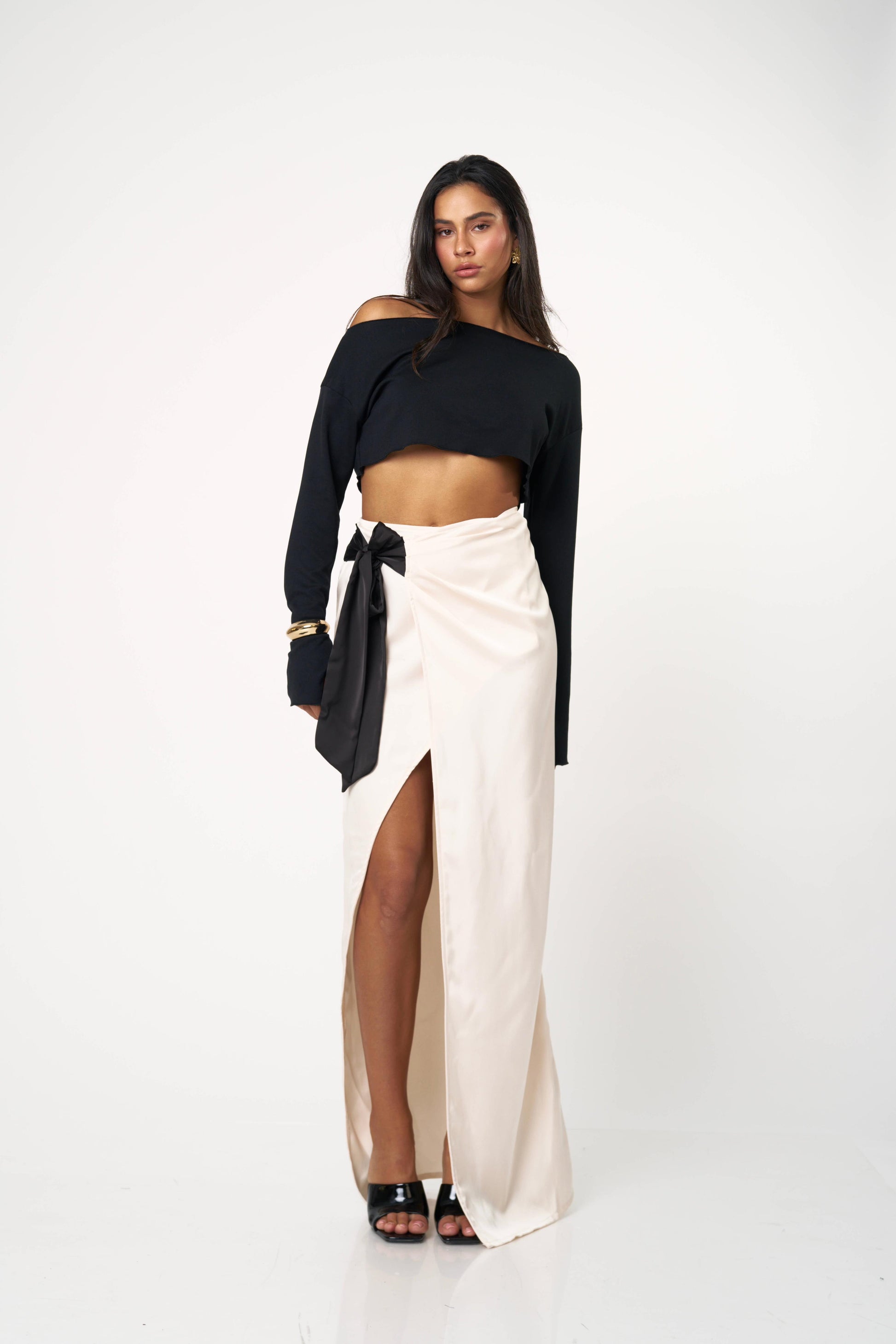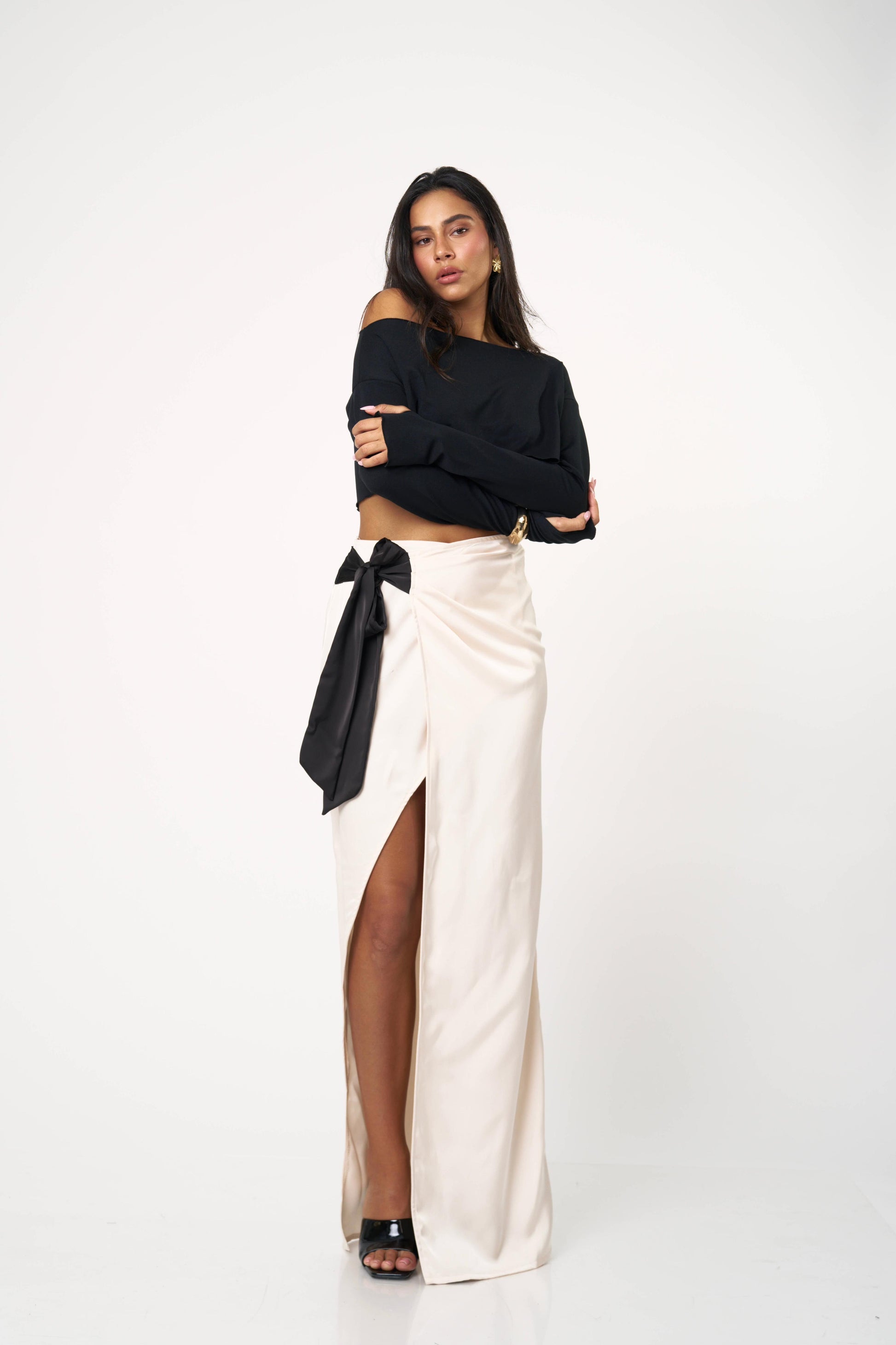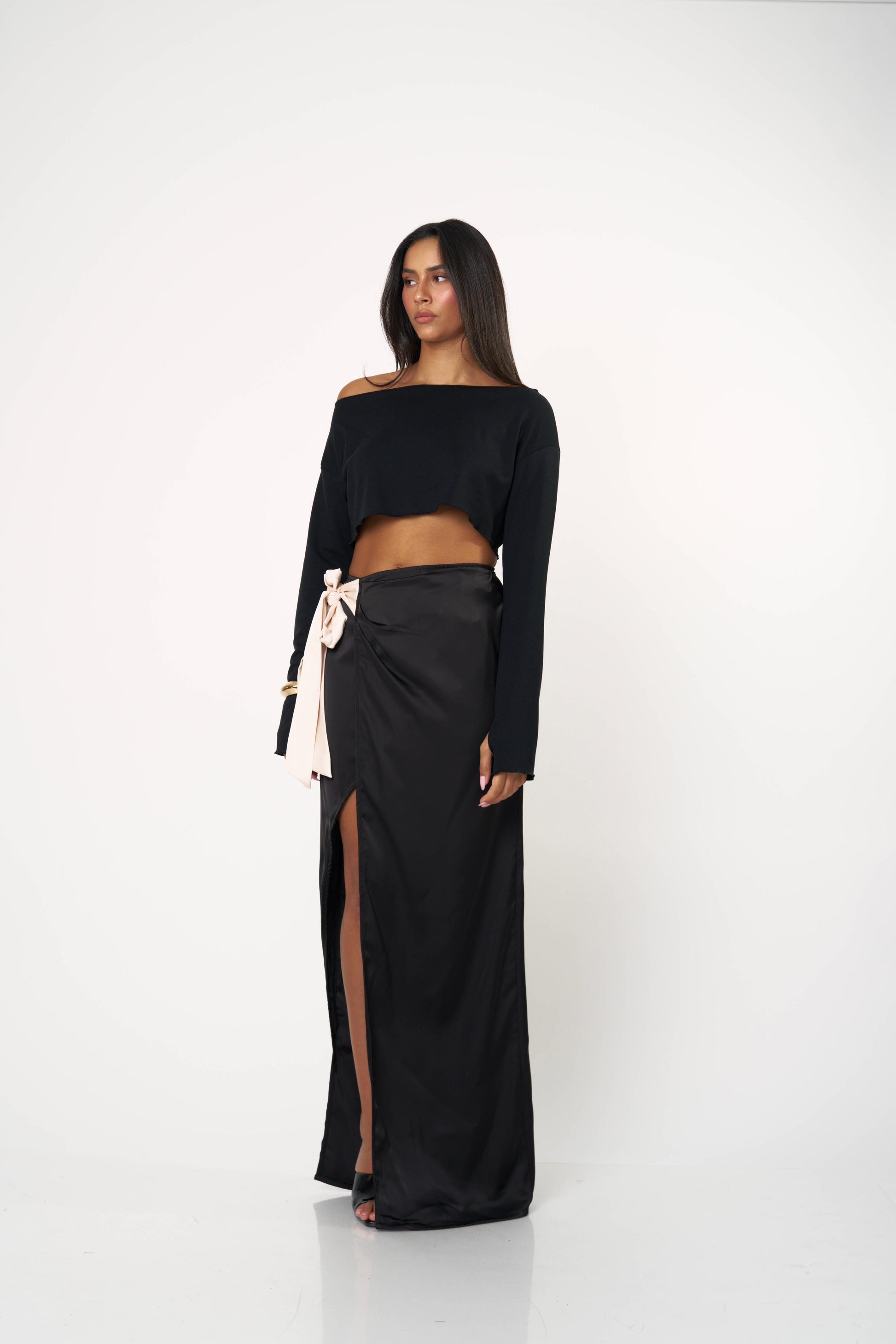 חצאית סאטן ארוכה עם קשירה צדית