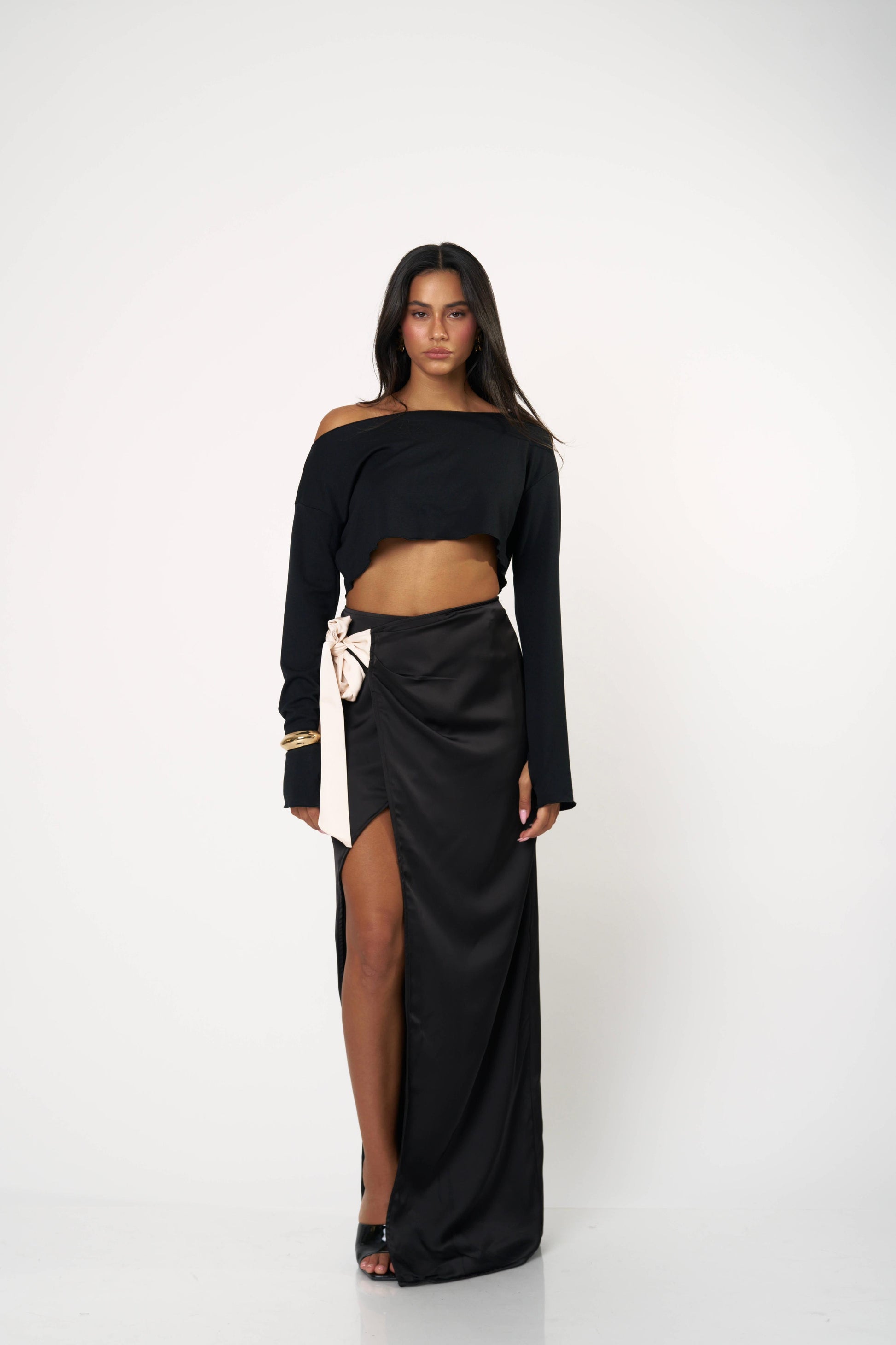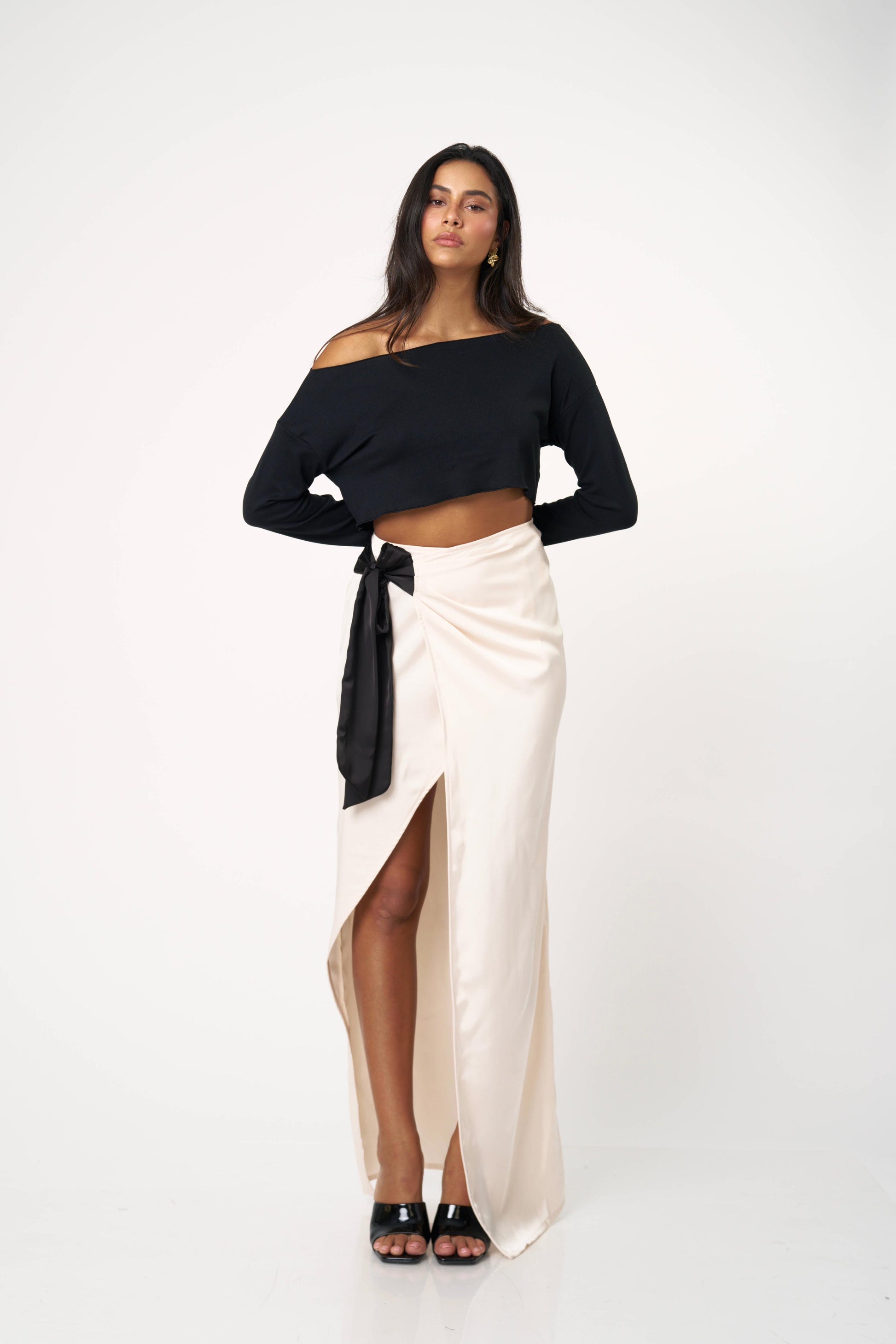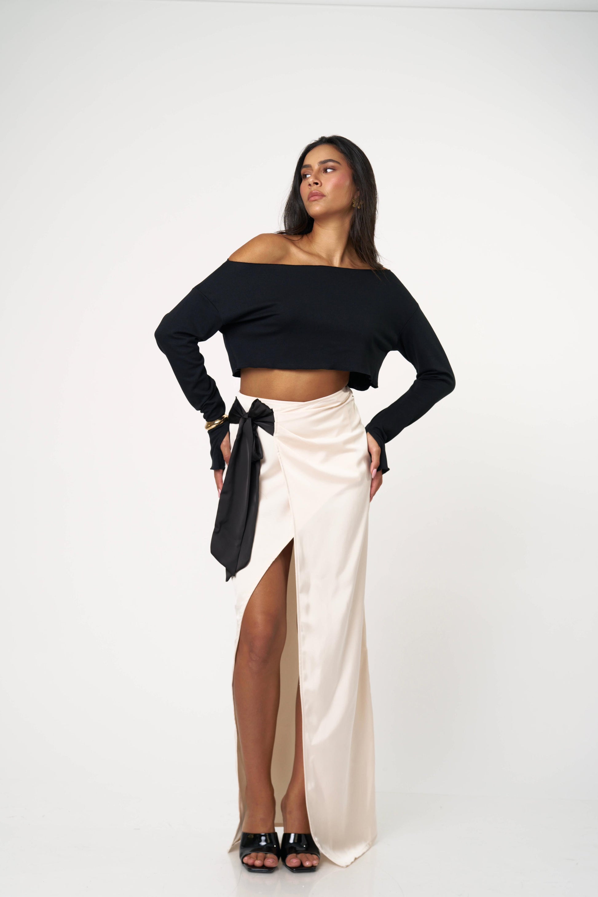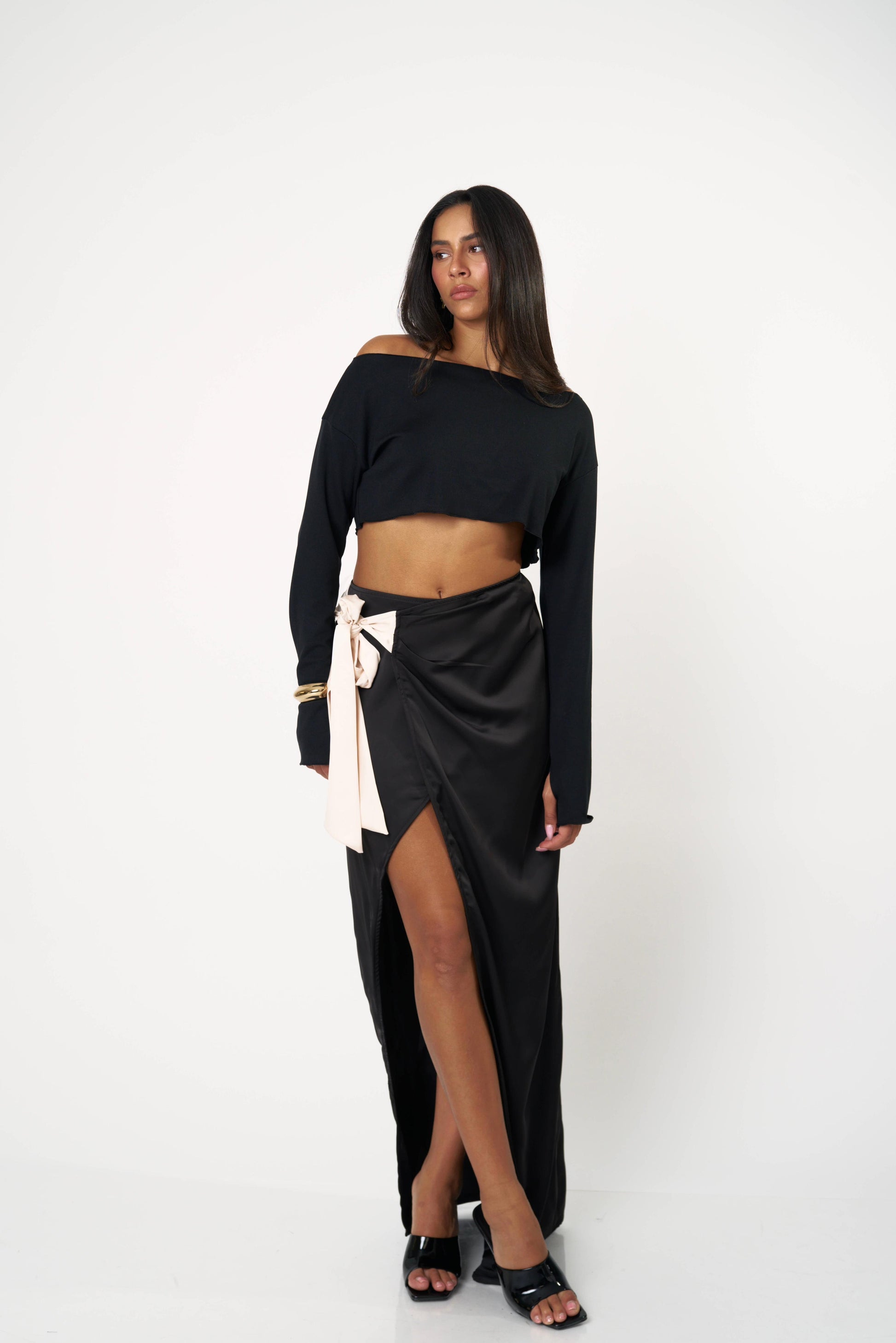 חצאית סאטן ארוכה עם קשירה צדית