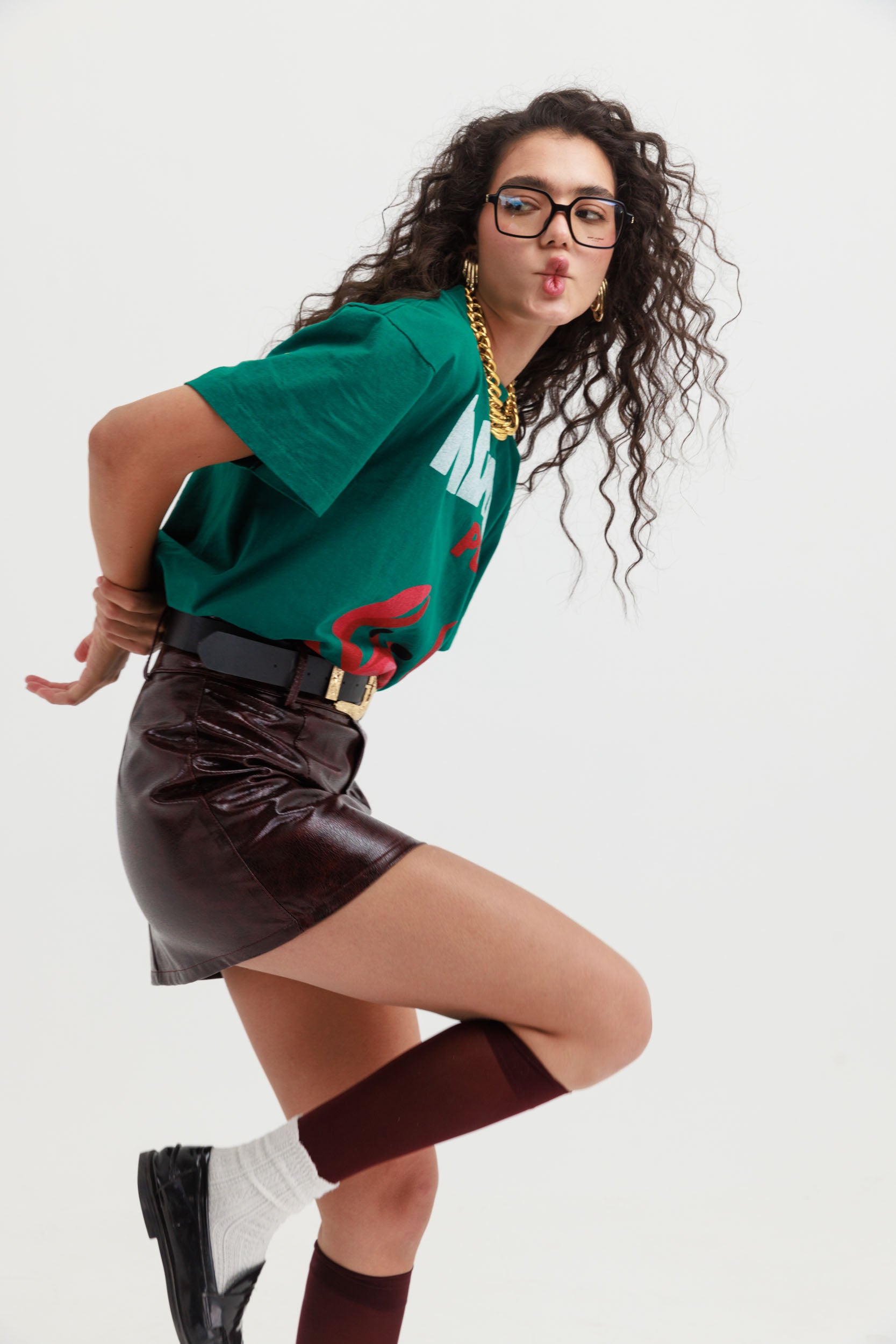 חצאית מיני עשויה בד דמוי־עור איכותי בגוון בורדו עמוק ומבריק בעדינות