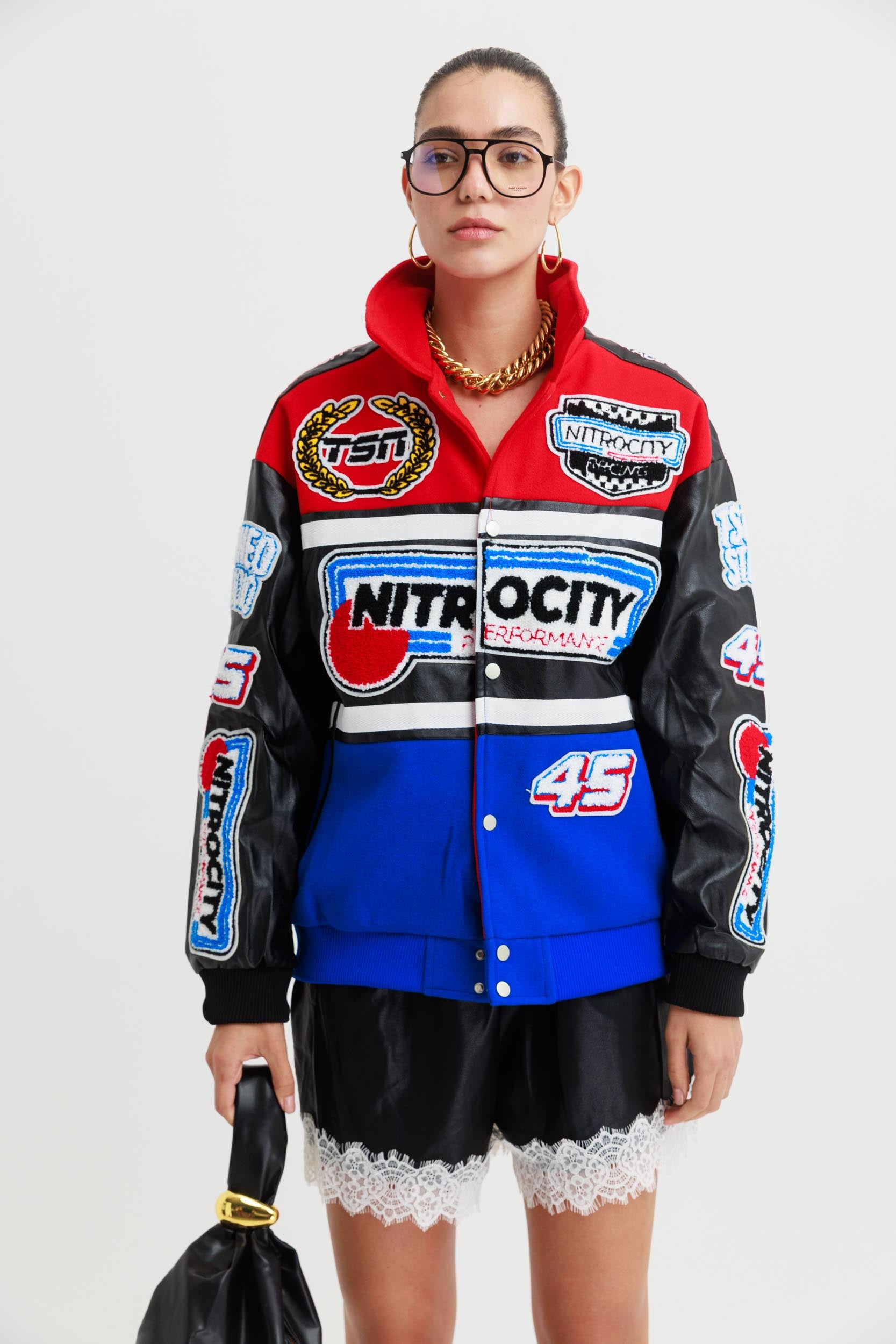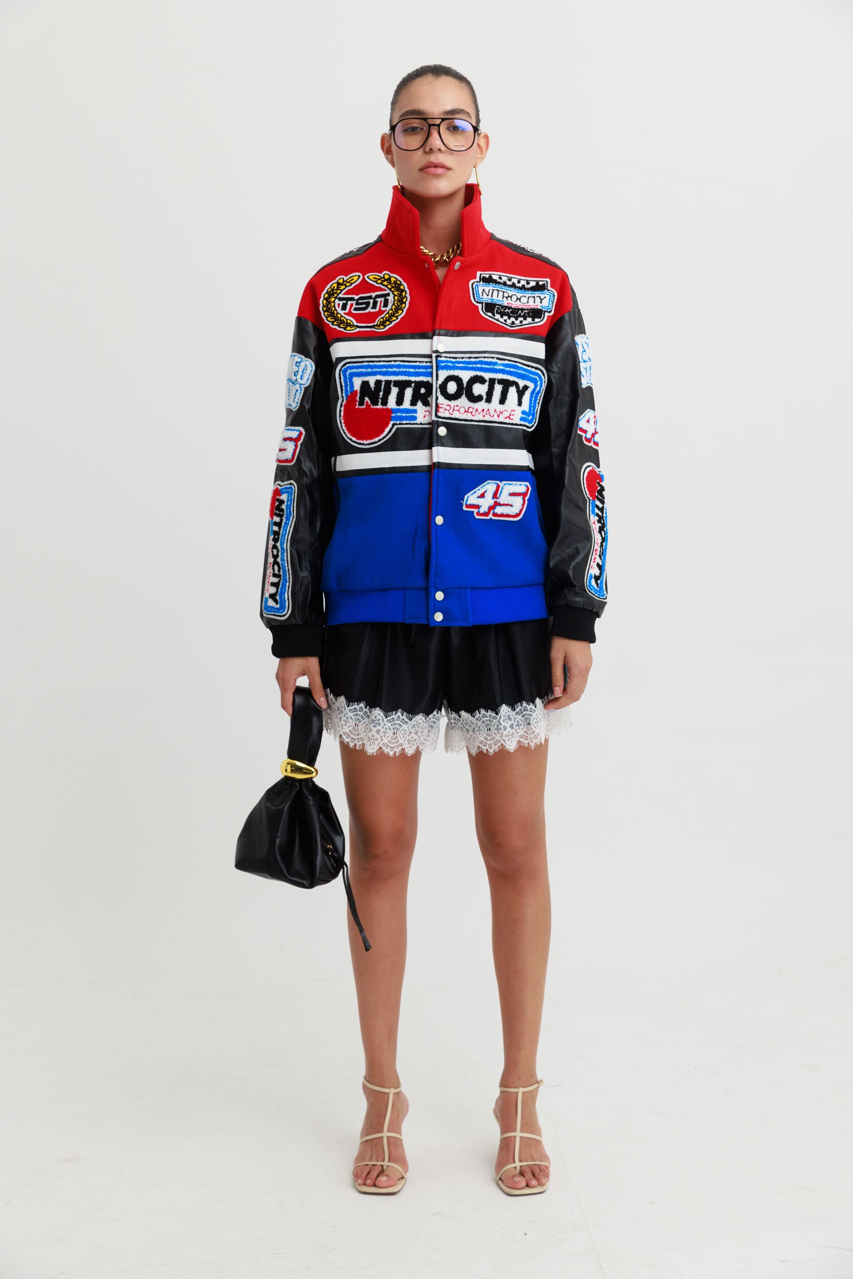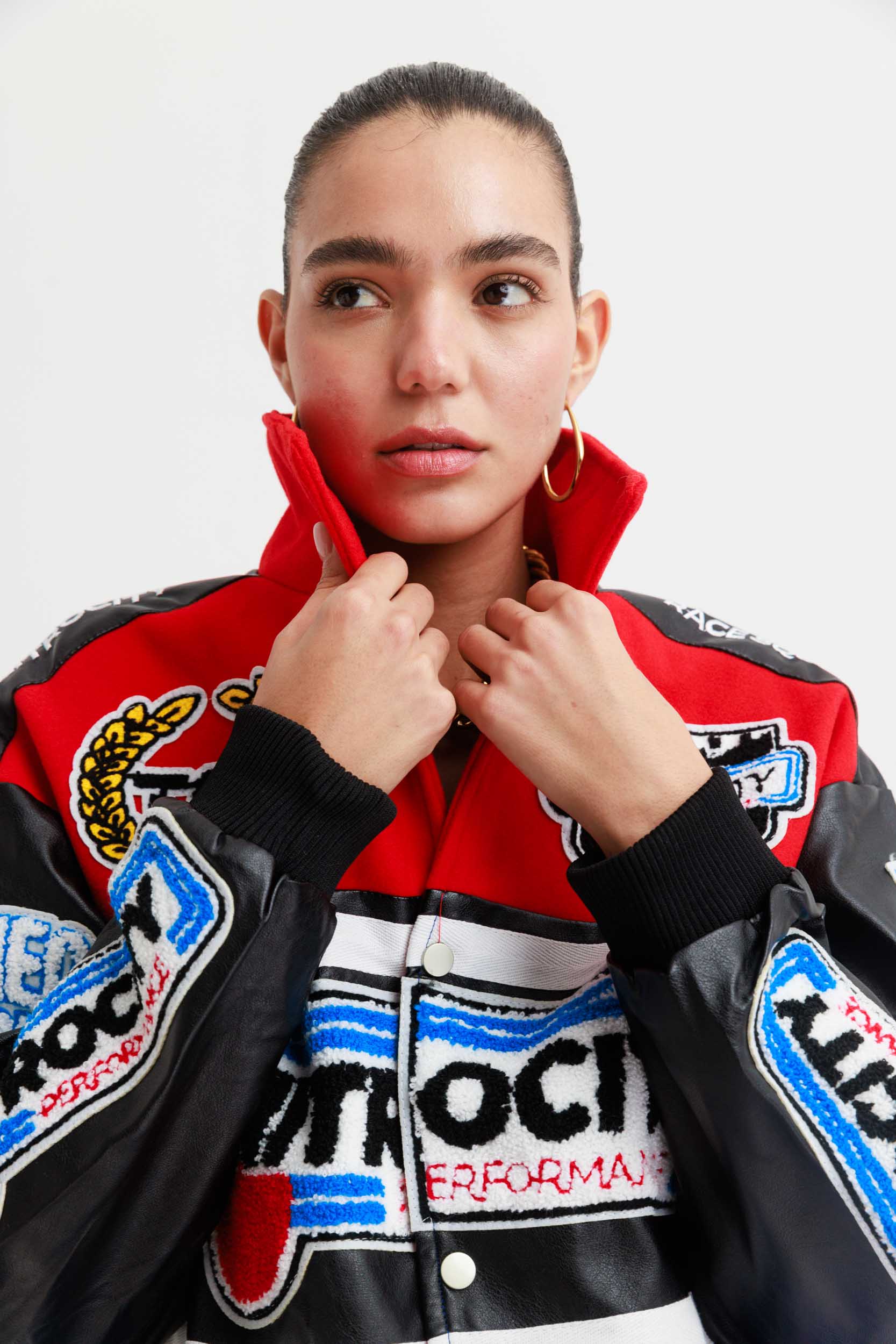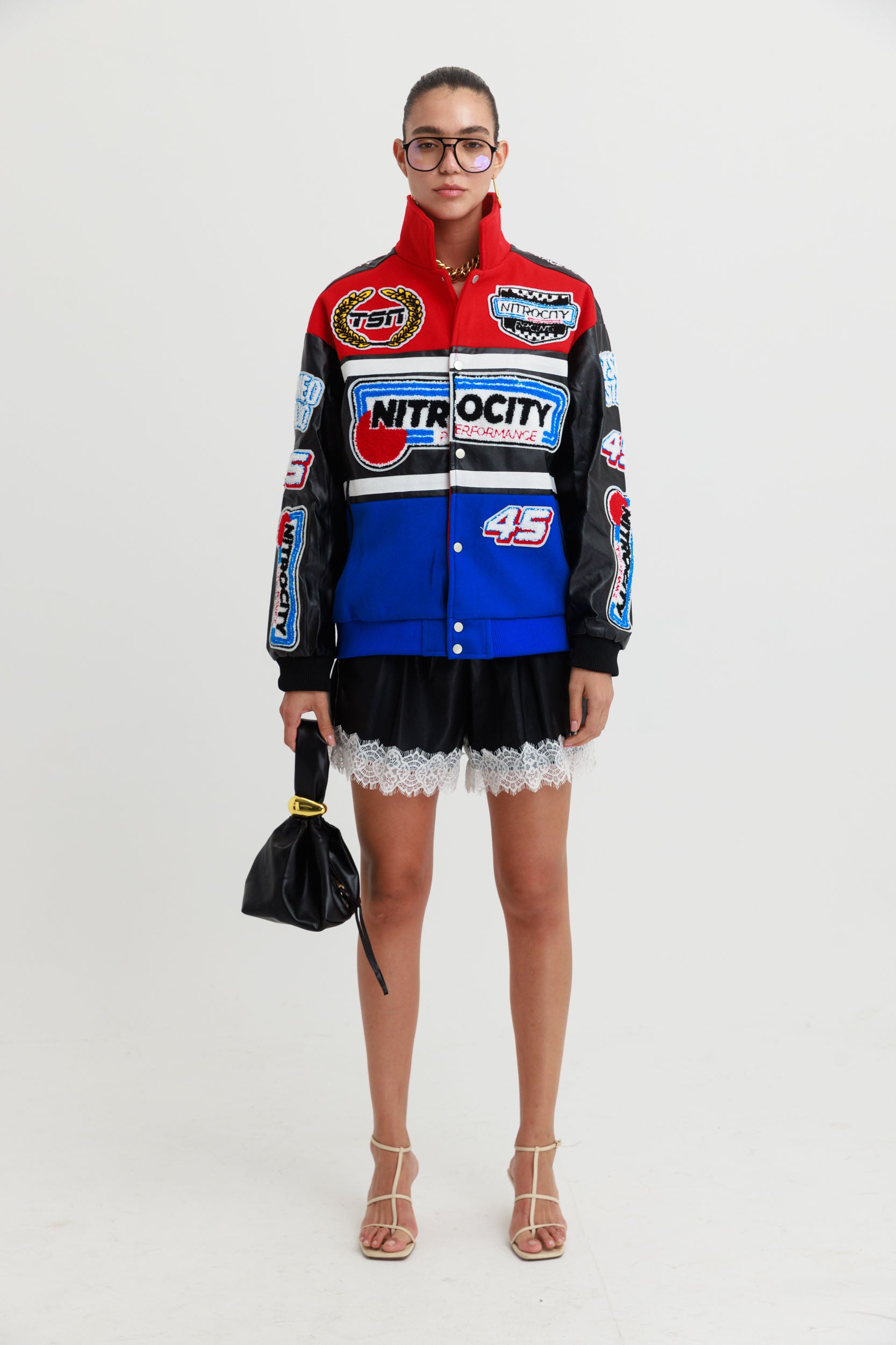 מעיל בייקר אוברסייז עם פאצ׳ים צבעוניים בהשראת עולם המרוצים