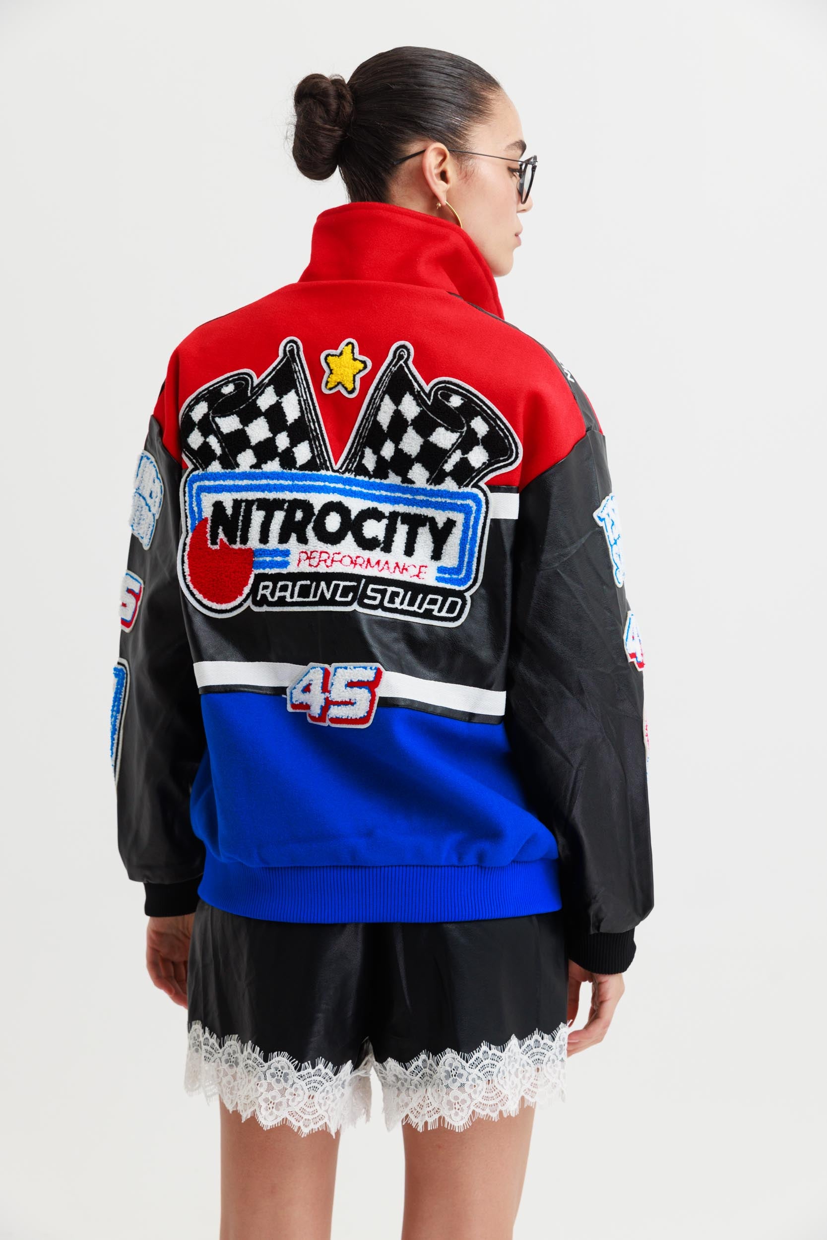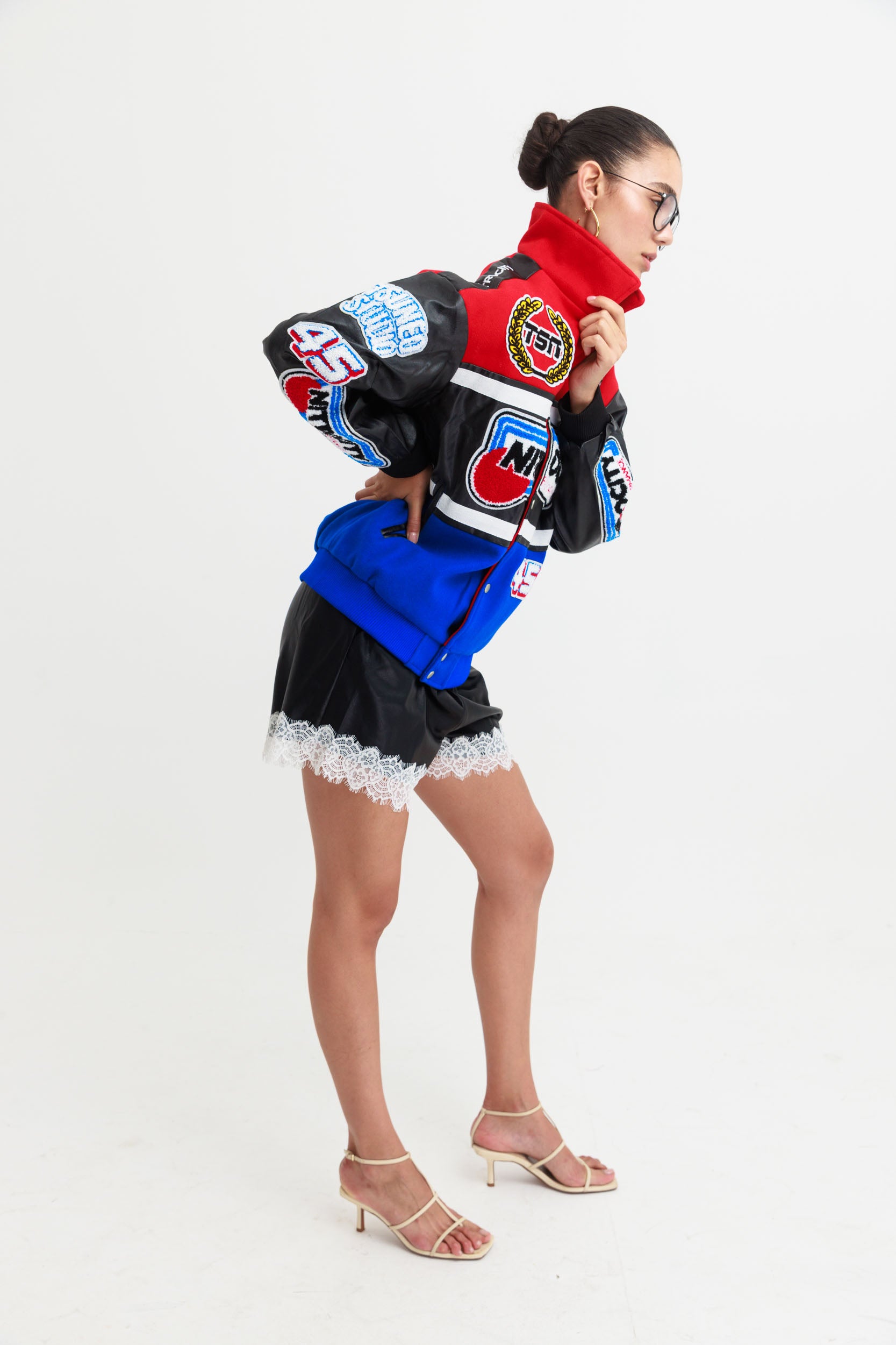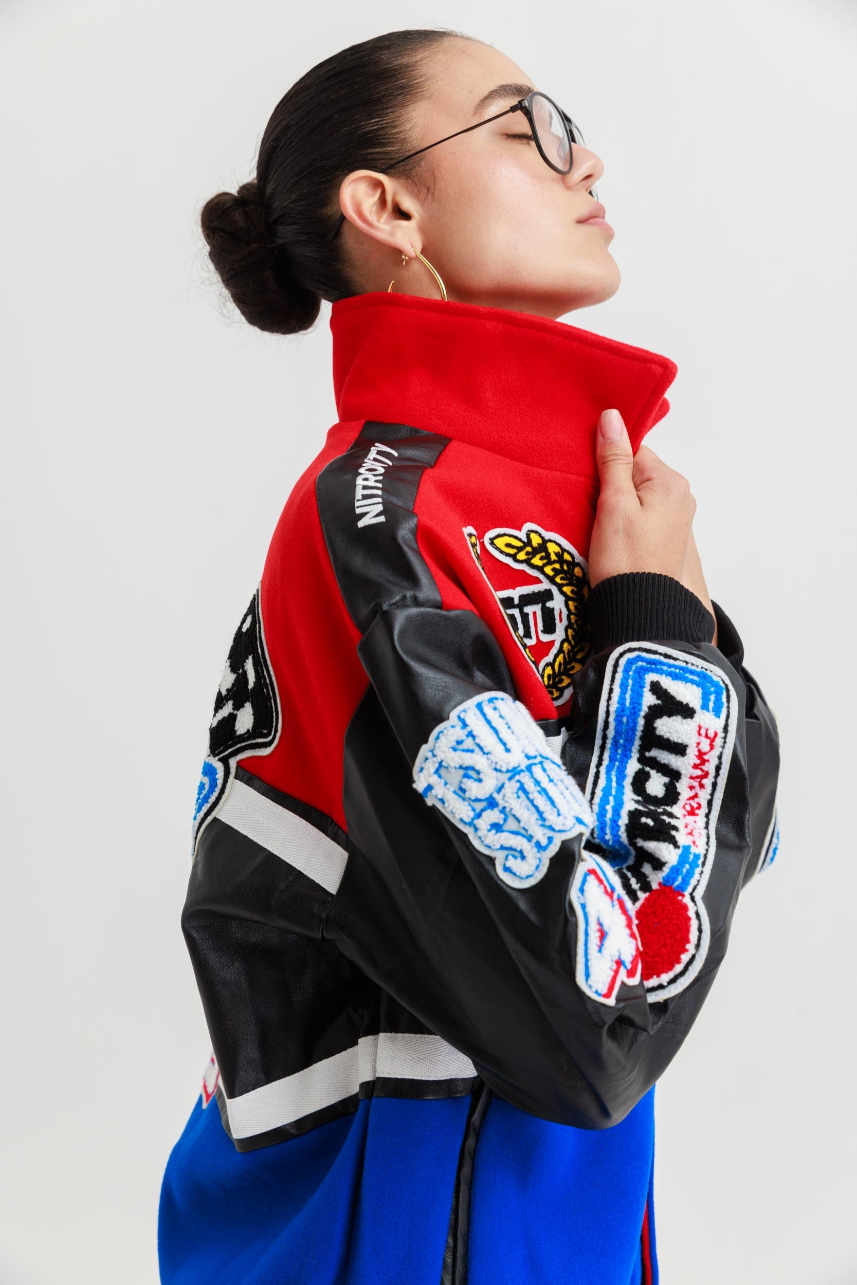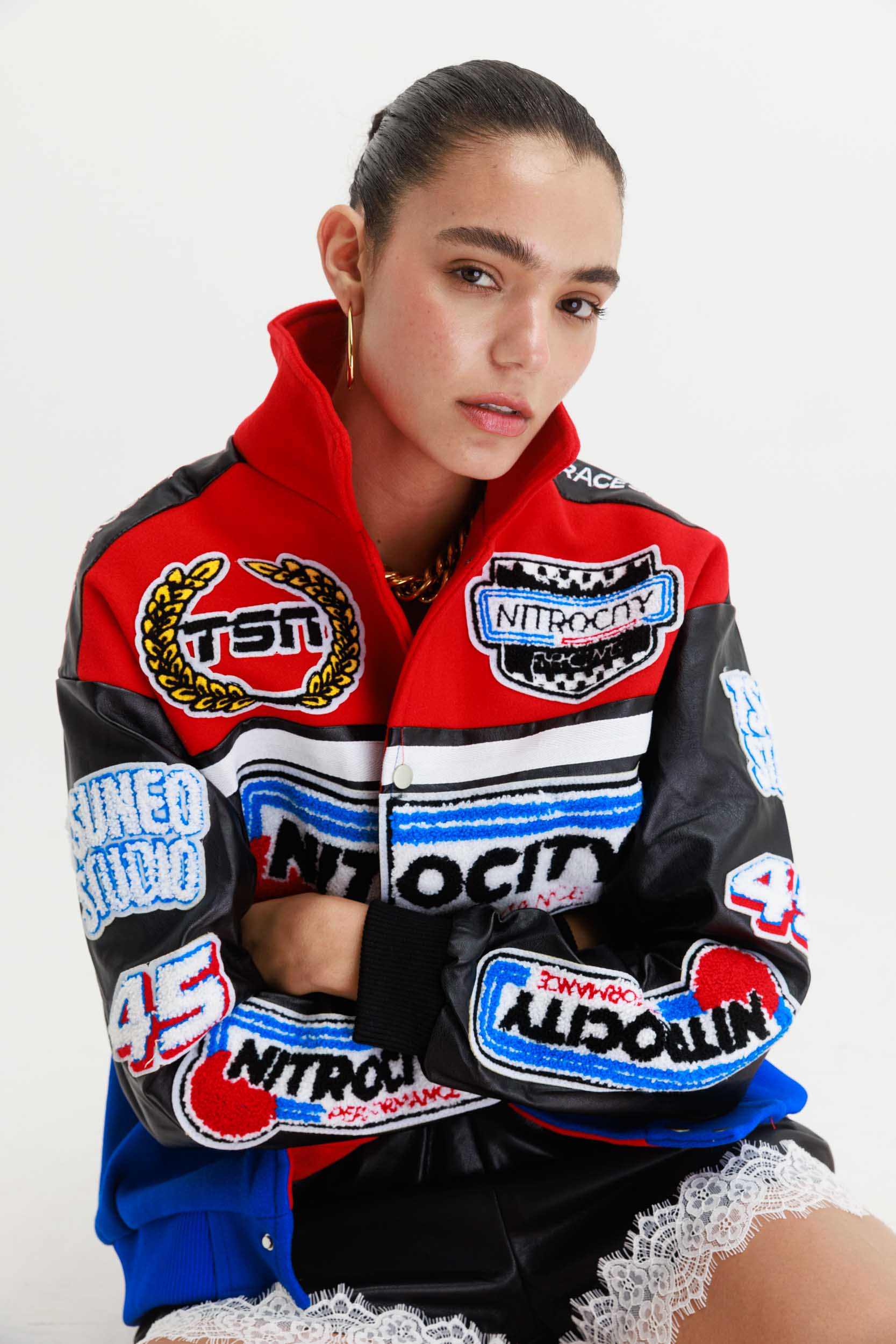 מעיל בייקר אוברסייז עם פאצ׳ים צבעוניים בהשראת עולם המרוצים