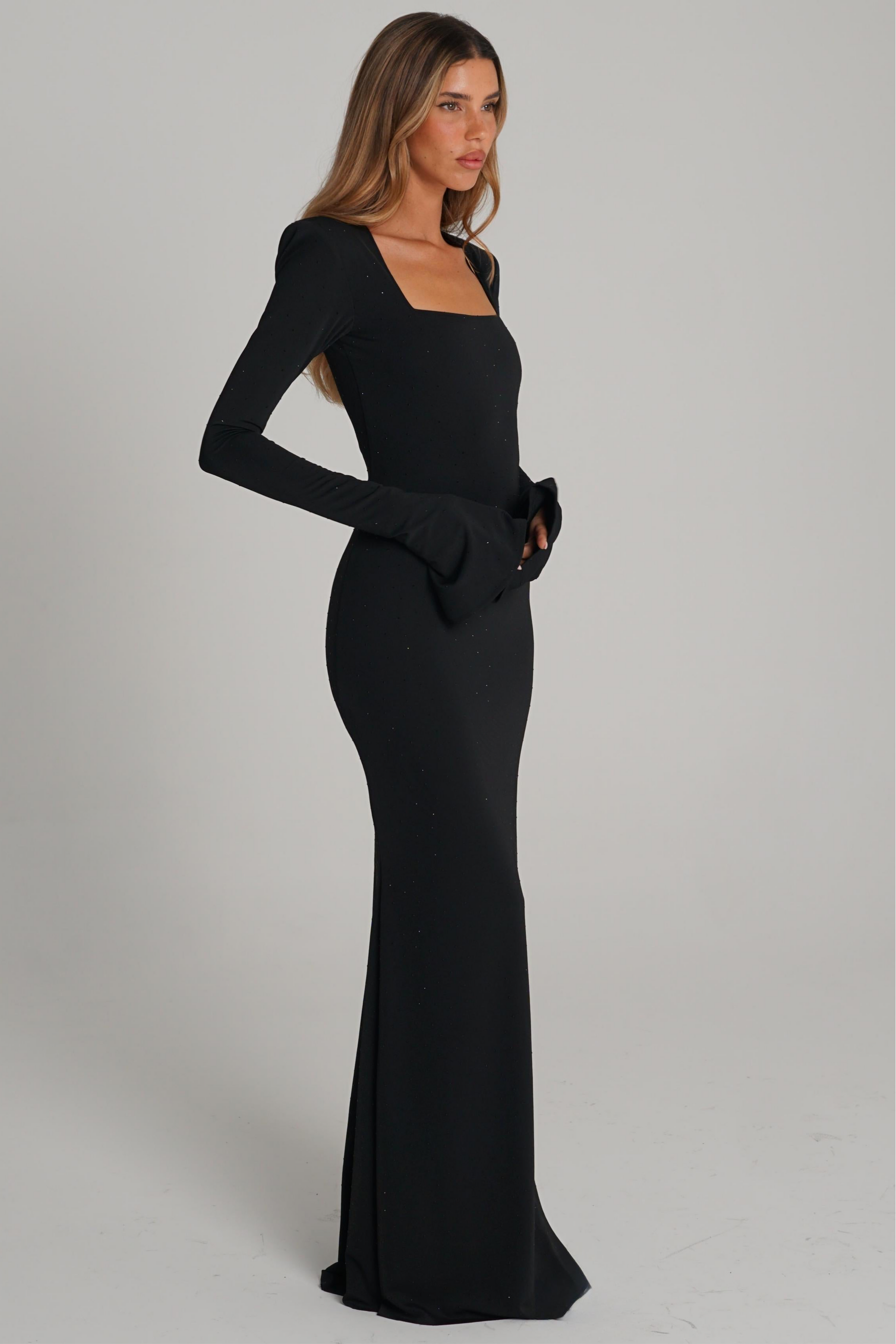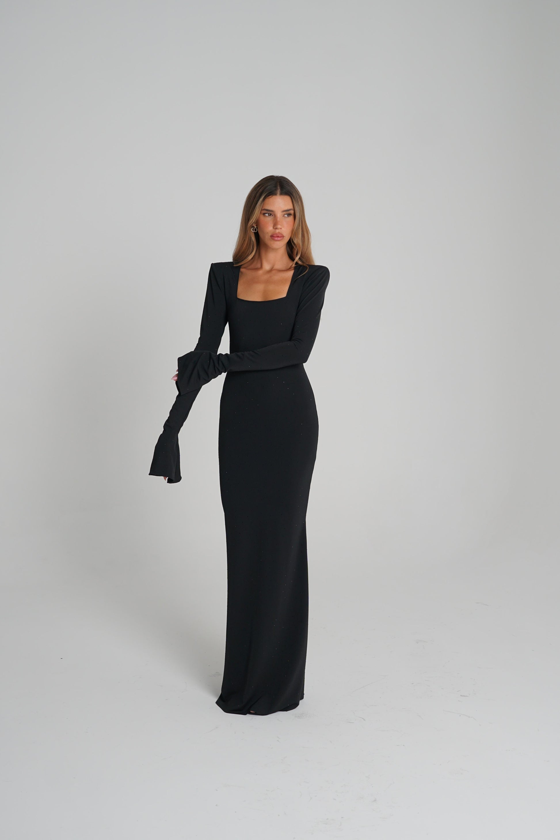 שמלת מקסי צנועה מבד יהלומים שחורים