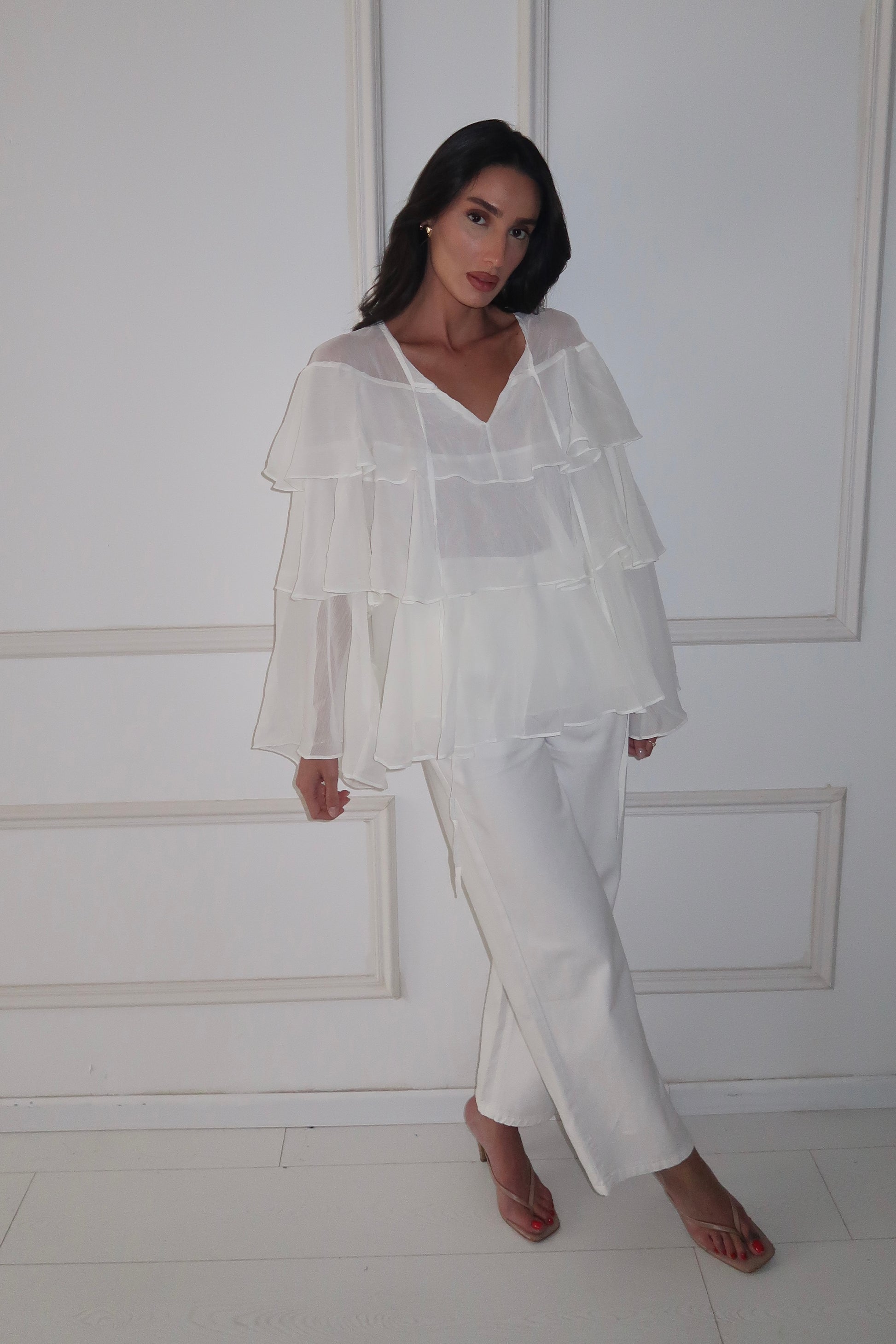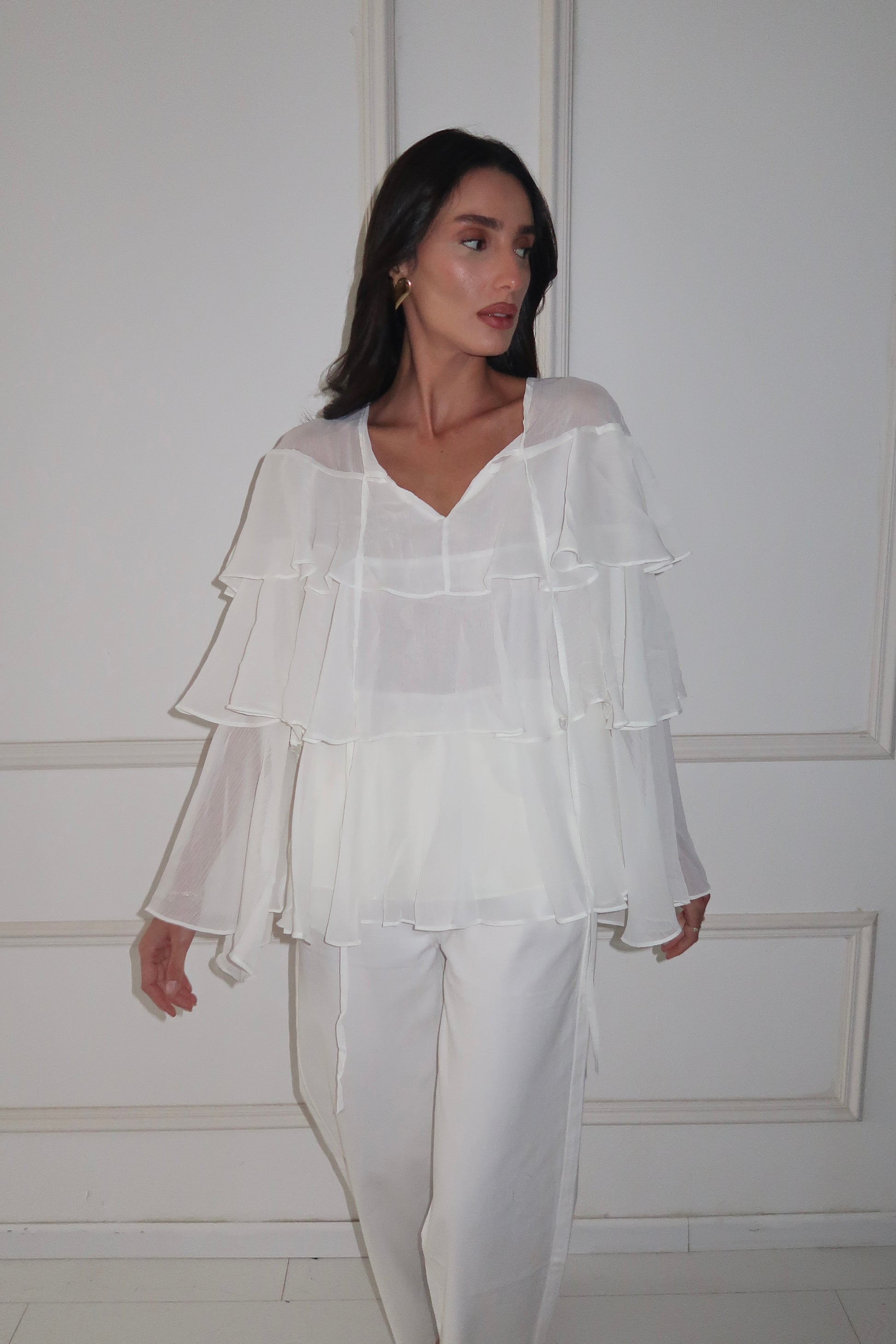 חולצה לבנה עם שכבות רכות של בד שיפון מתנפנף, בגזרה משוחררת ואוורירית. מעניקה מראה רומנטי וקליל, מושלמת לערבי חג או ליום קייצי עם טאצ’ אלגנטי