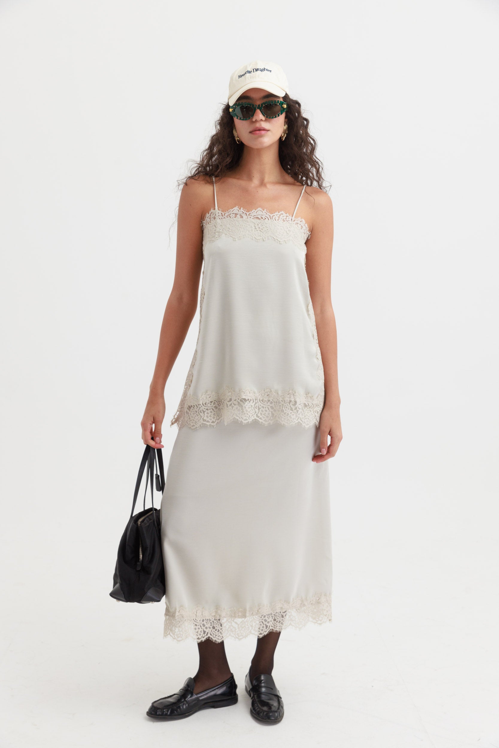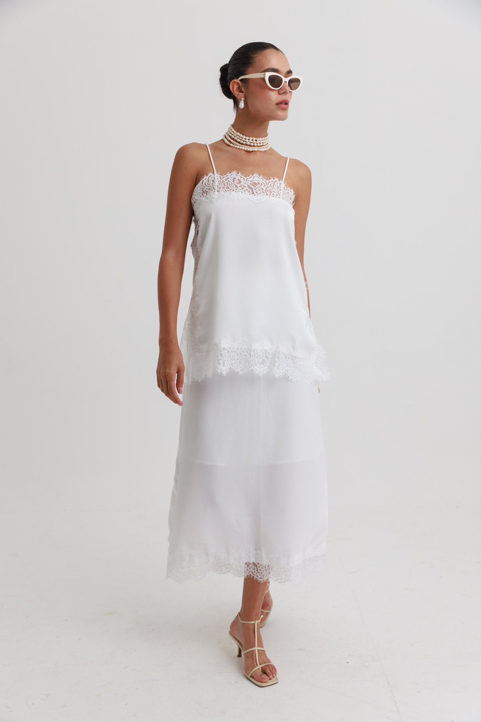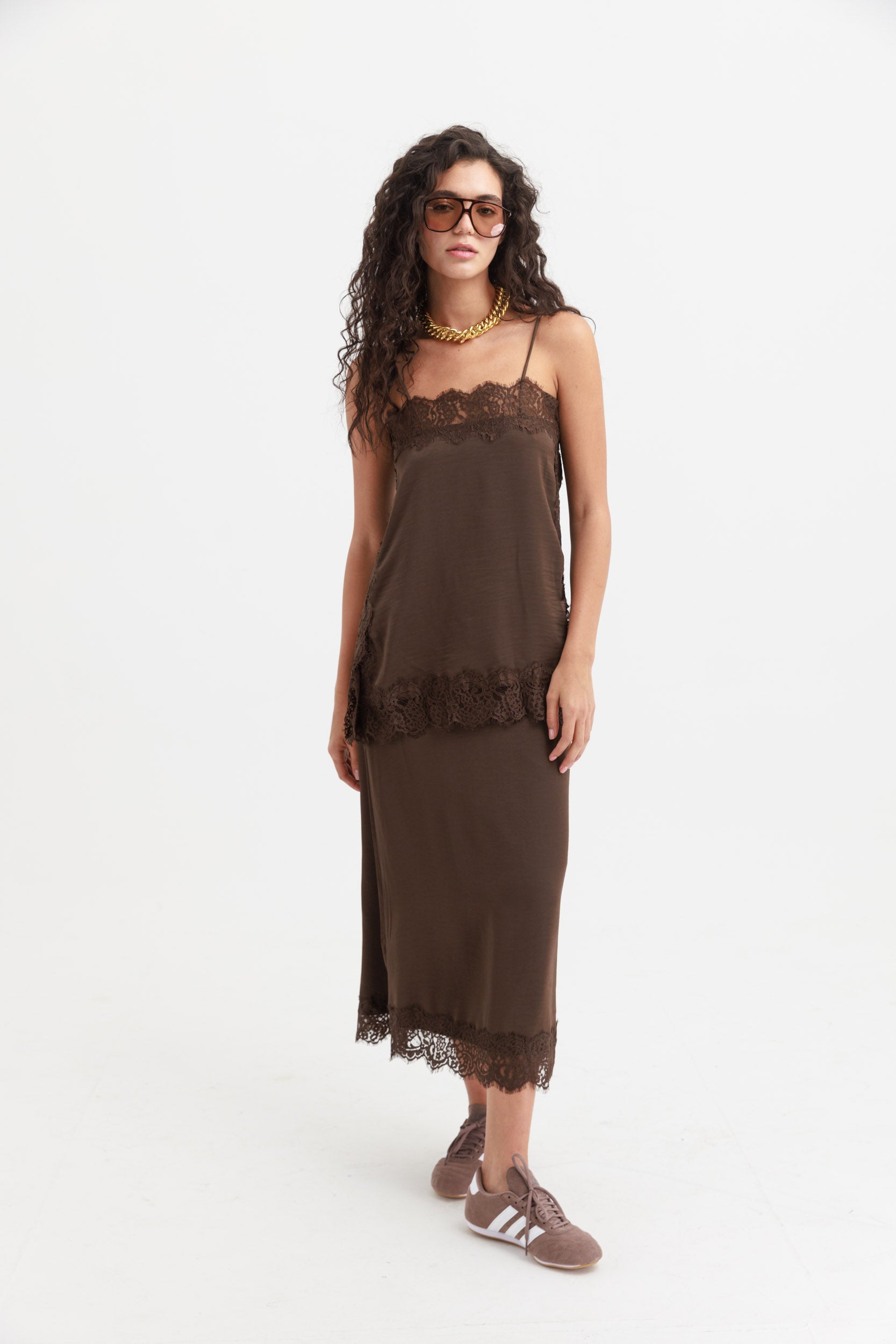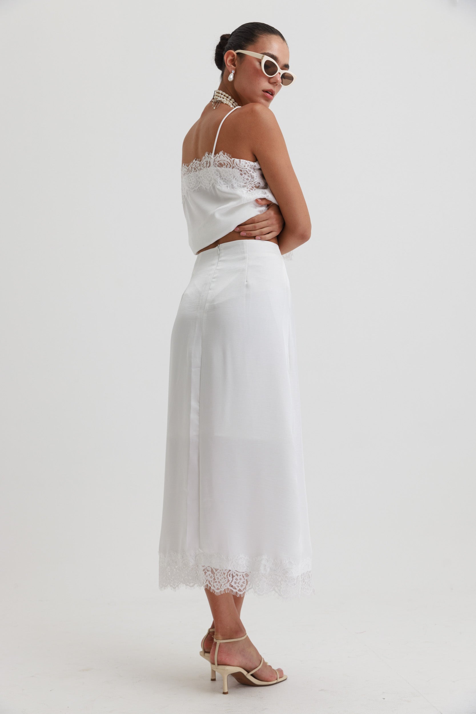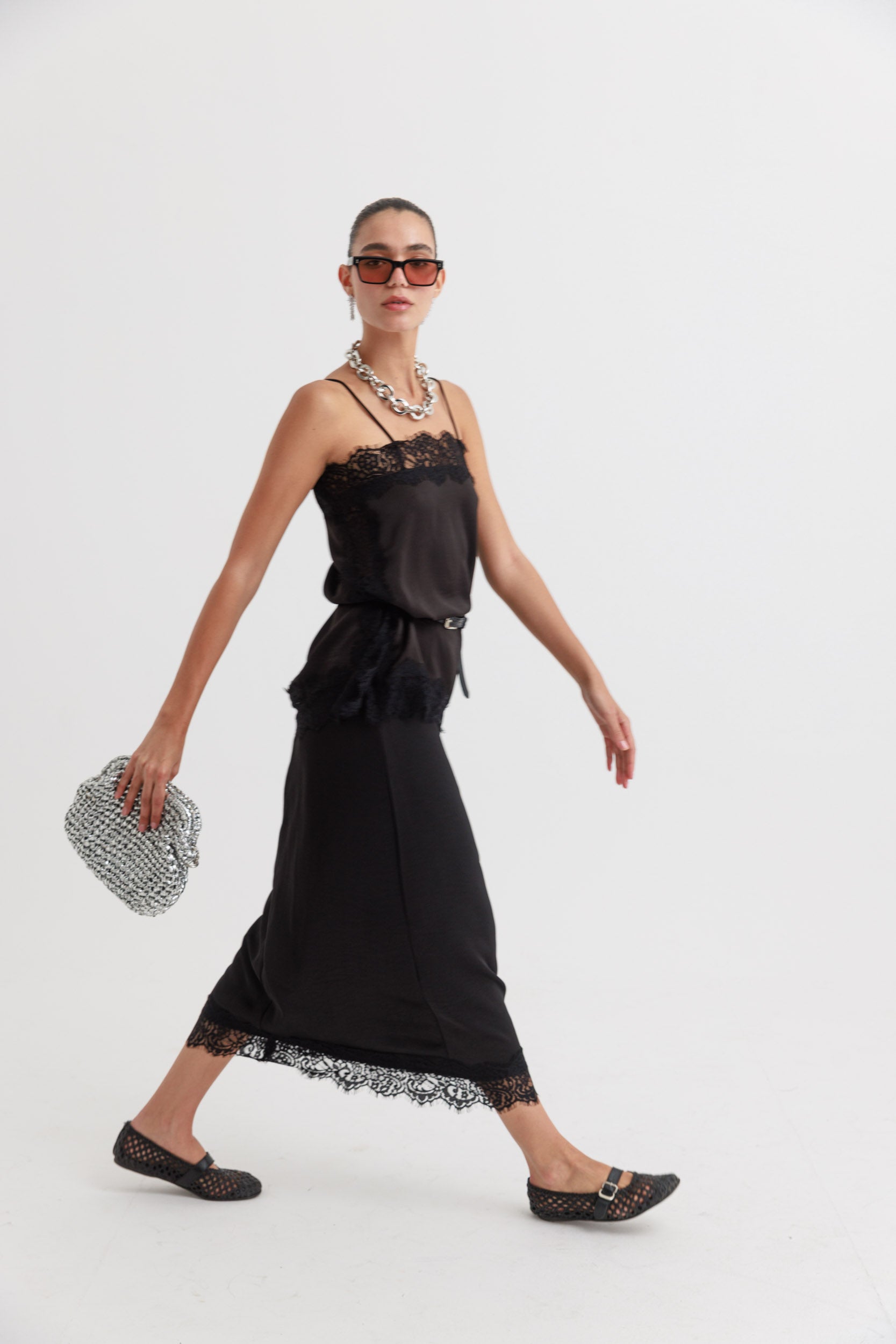 החצאית באורך מידי עם תחרה תואמת בשוליים ליצירת מראה אחיד ונקי