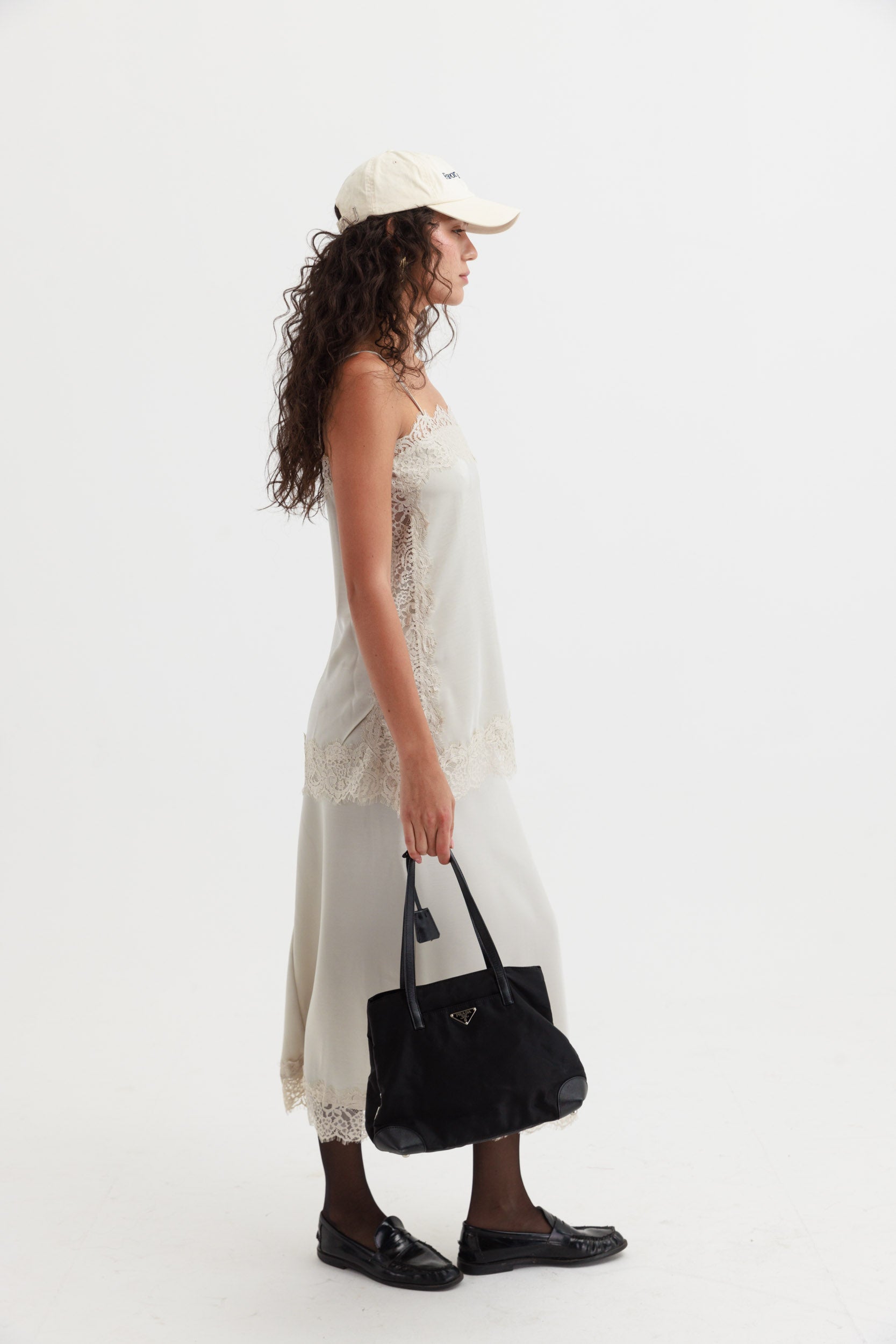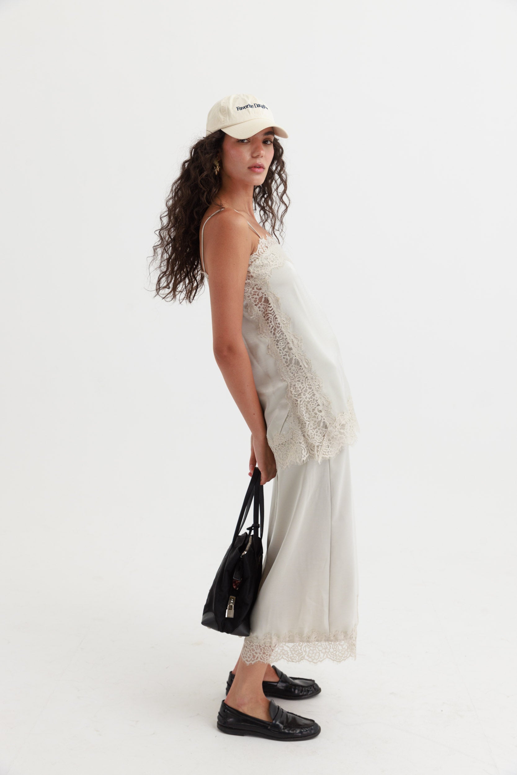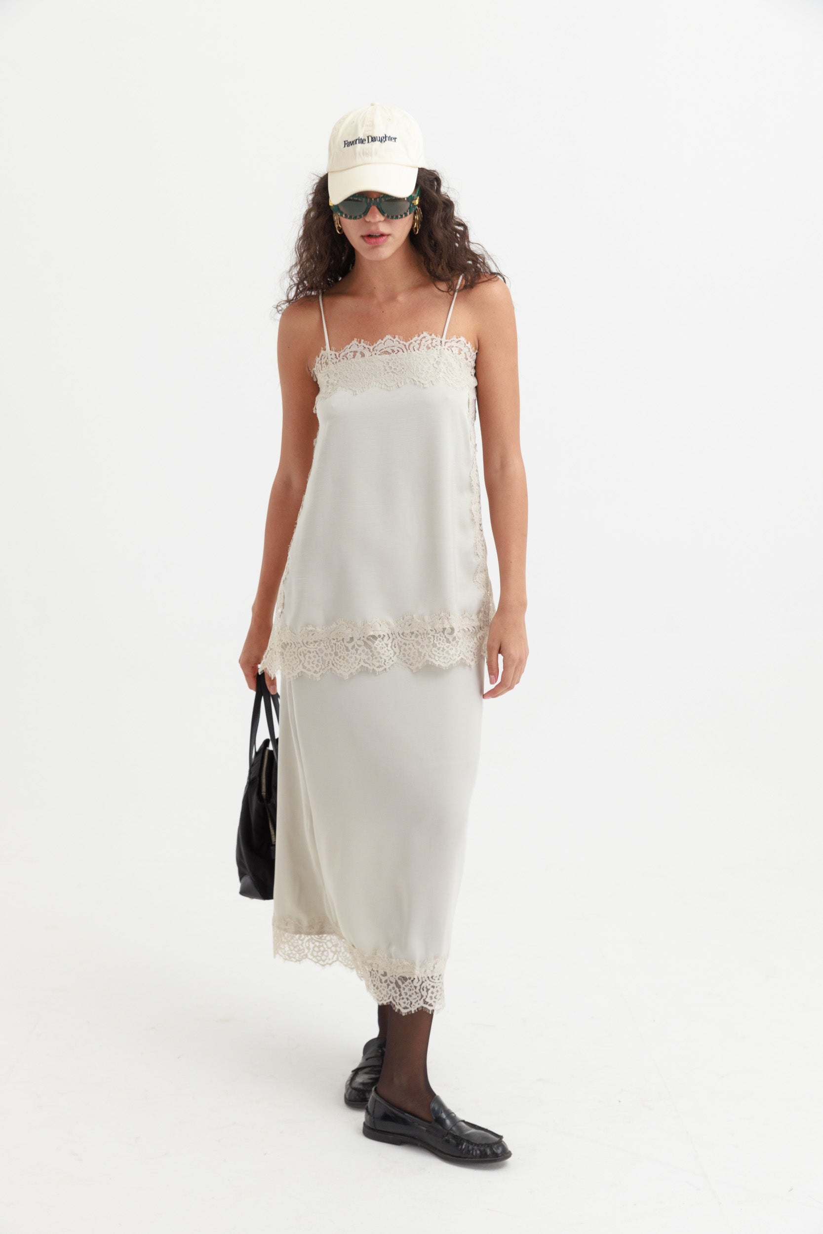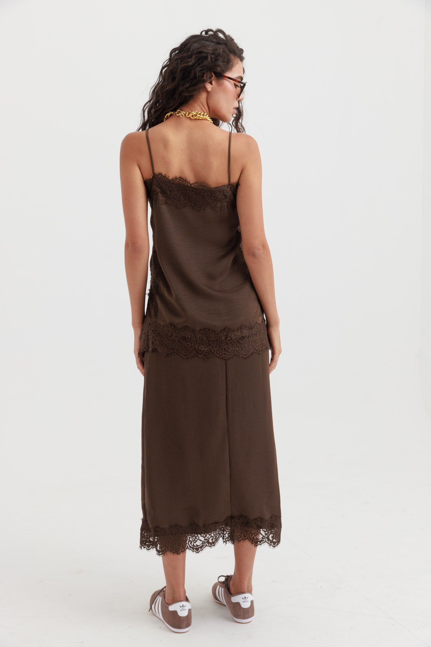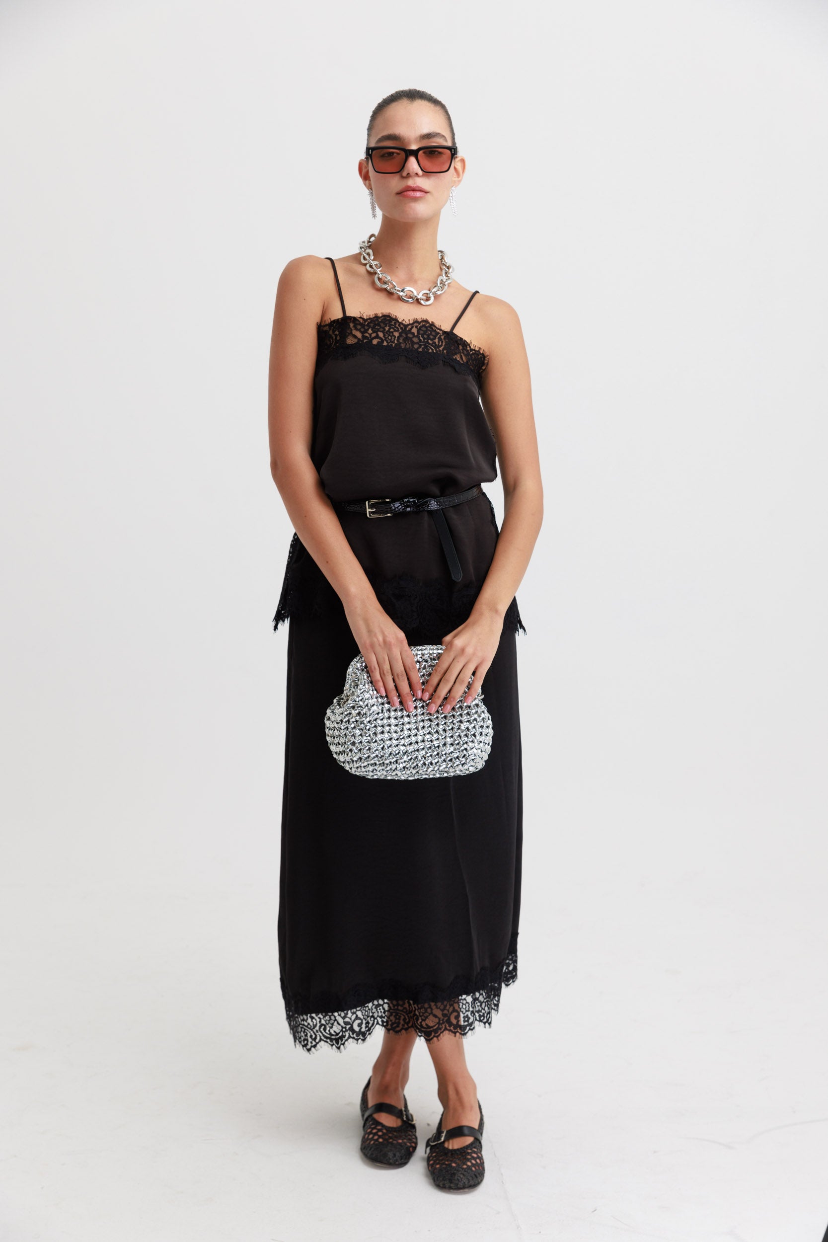 החצאית באורך מידי עם תחרה תואמת בשוליים ליצירת מראה אחיד ונקי