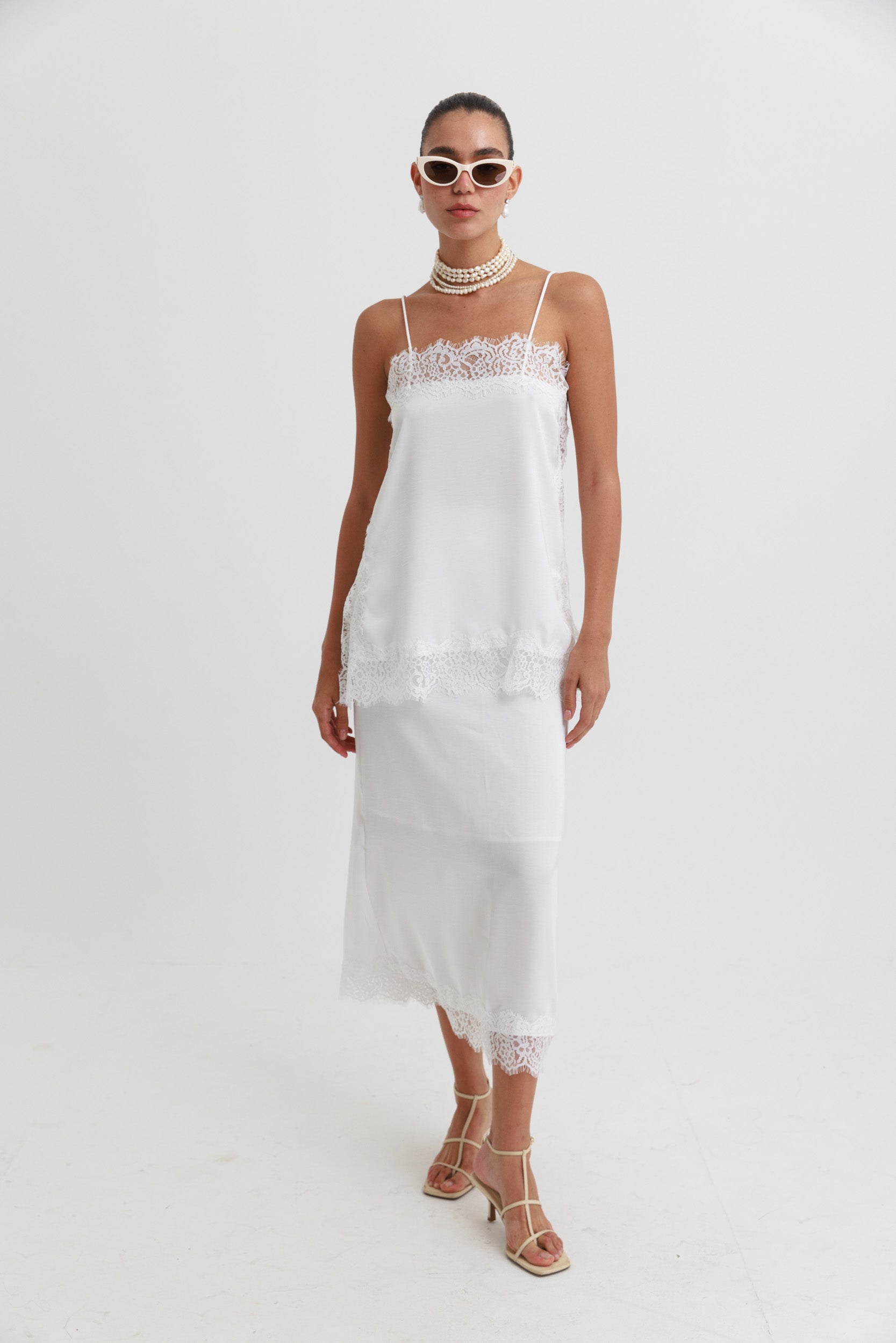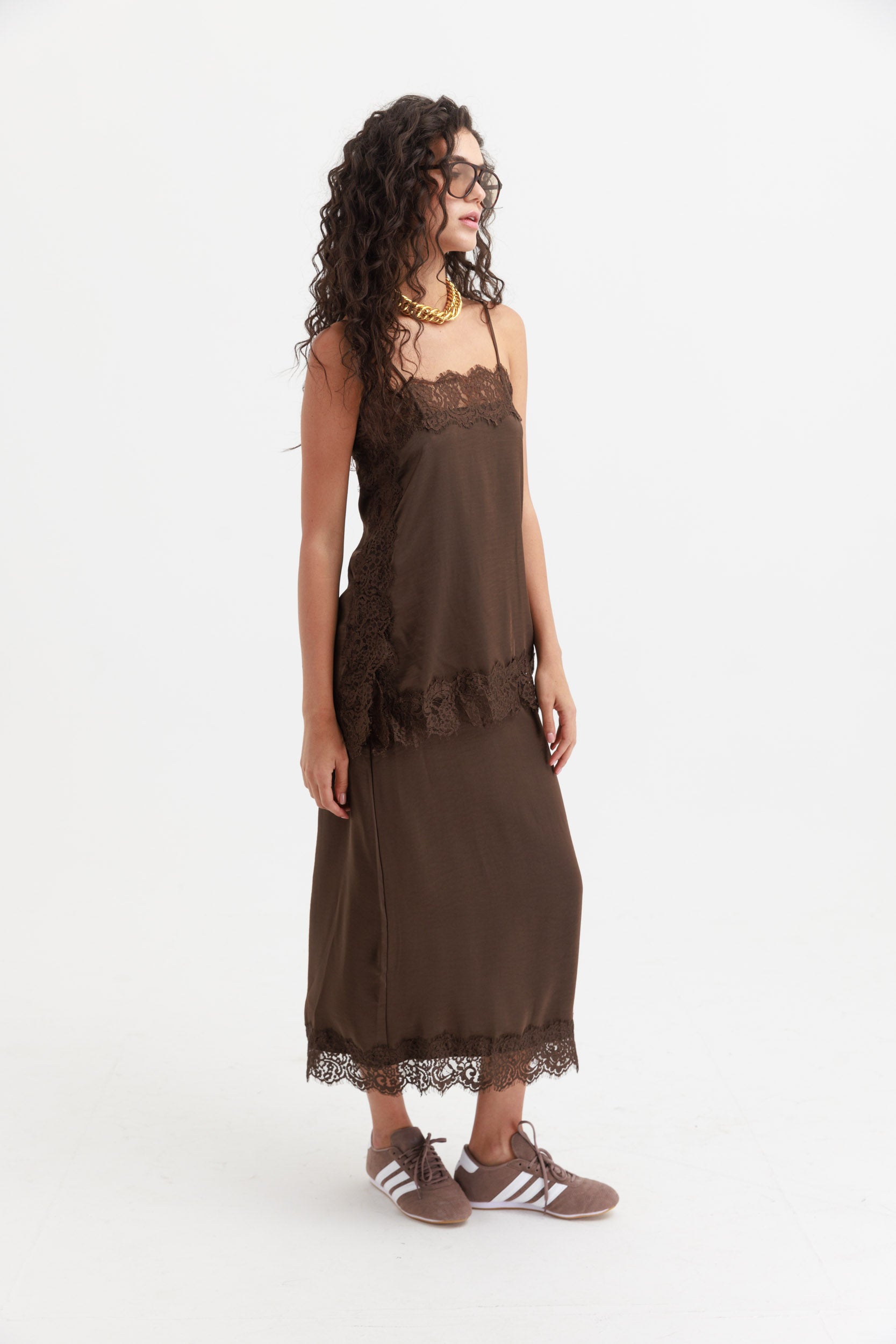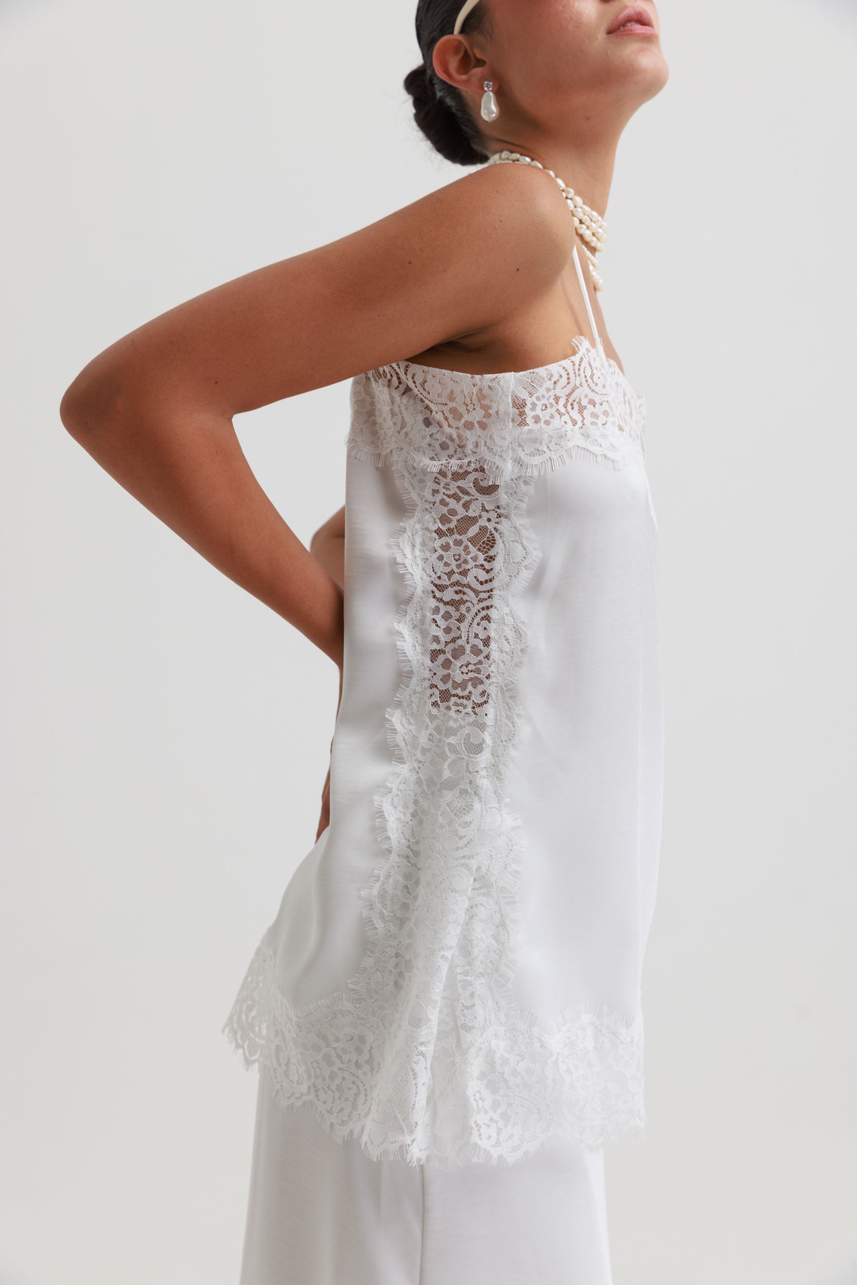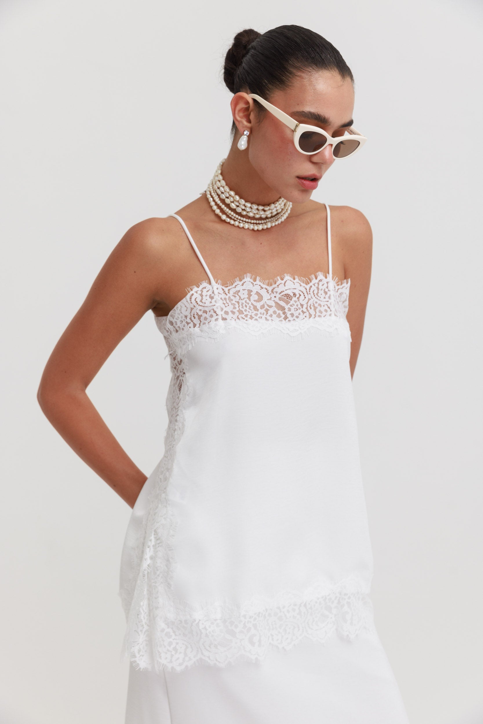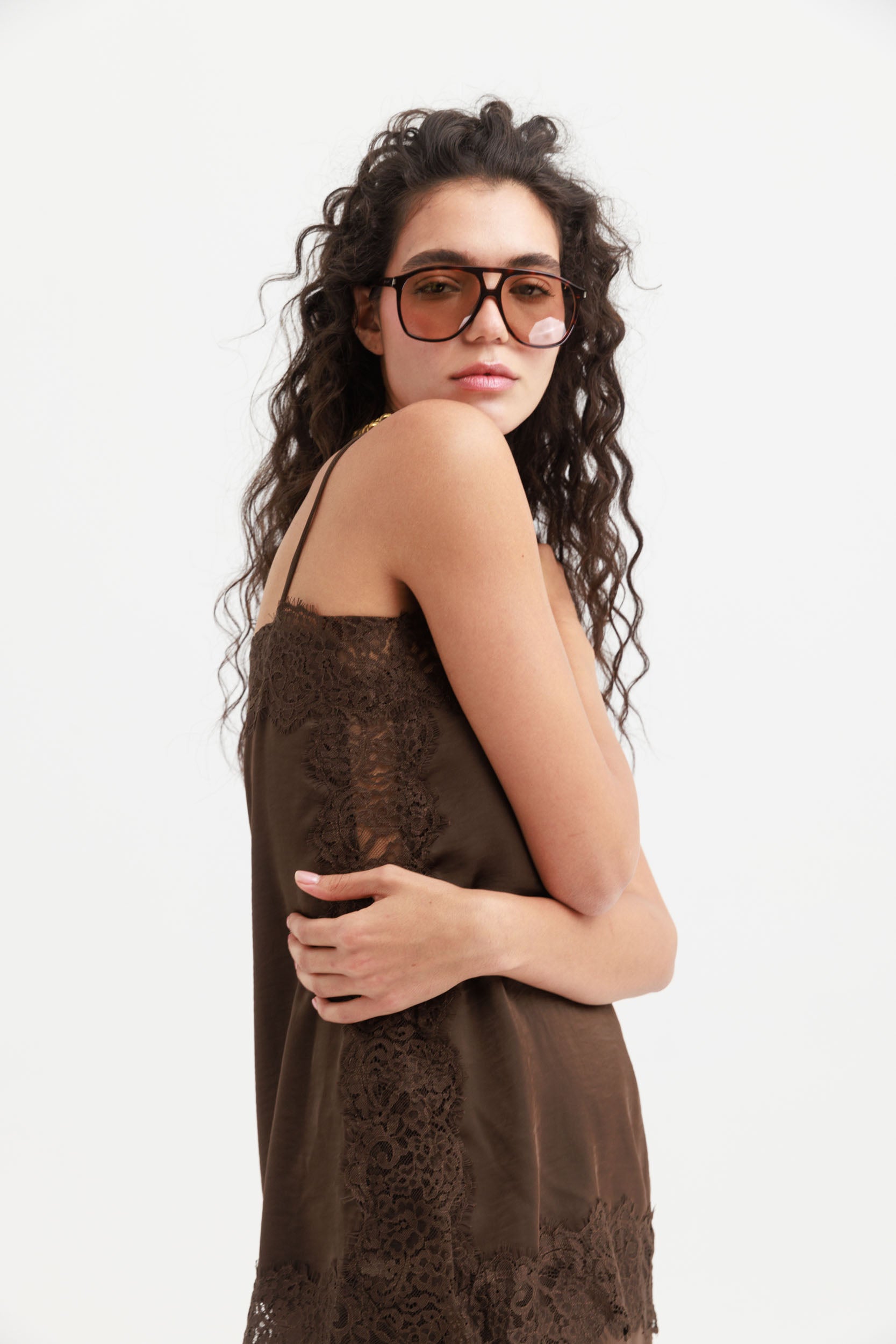 העליונית מגיעה בגזרה ישרה ומשוחררת עם כתפיות דקות ותחרה במפתח החזה ובשולי החלק העליון