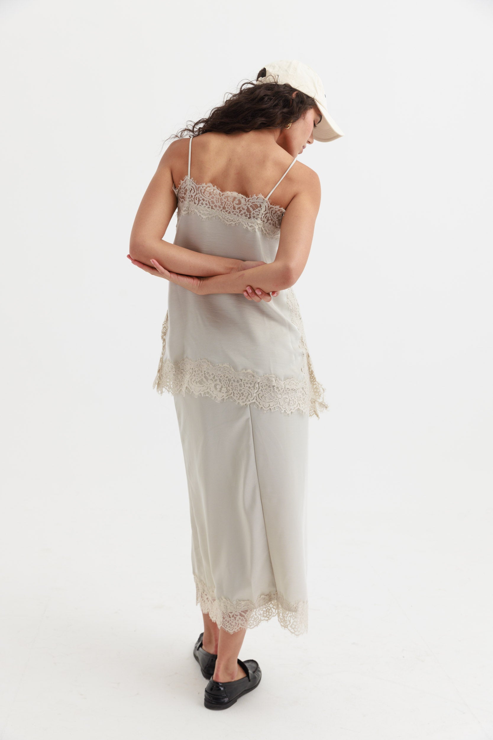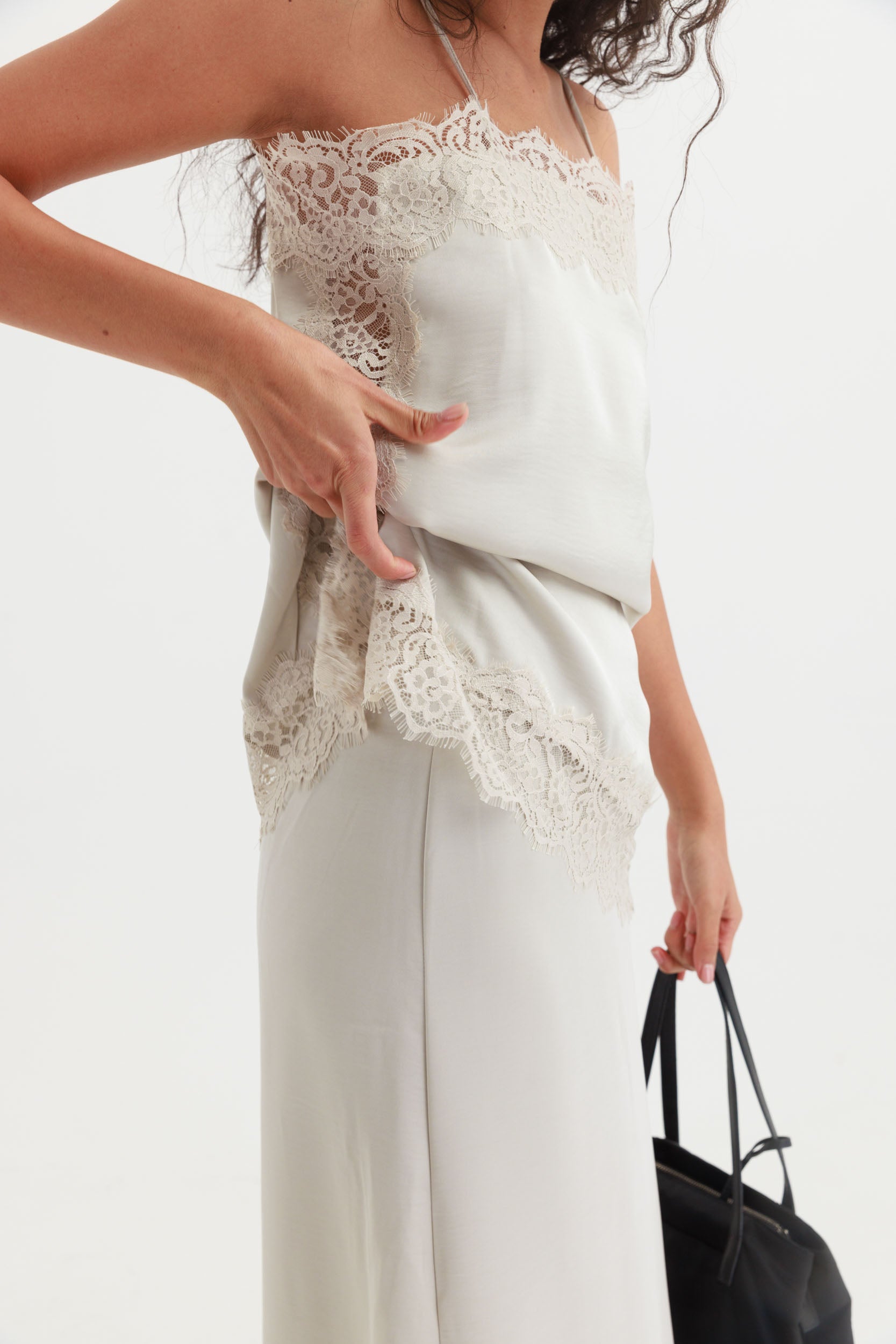 חליפת סט אלגנטית בת 2 חלקים עשויה בד סאטן נשפך ורך עם תחרה עדינה תואמת