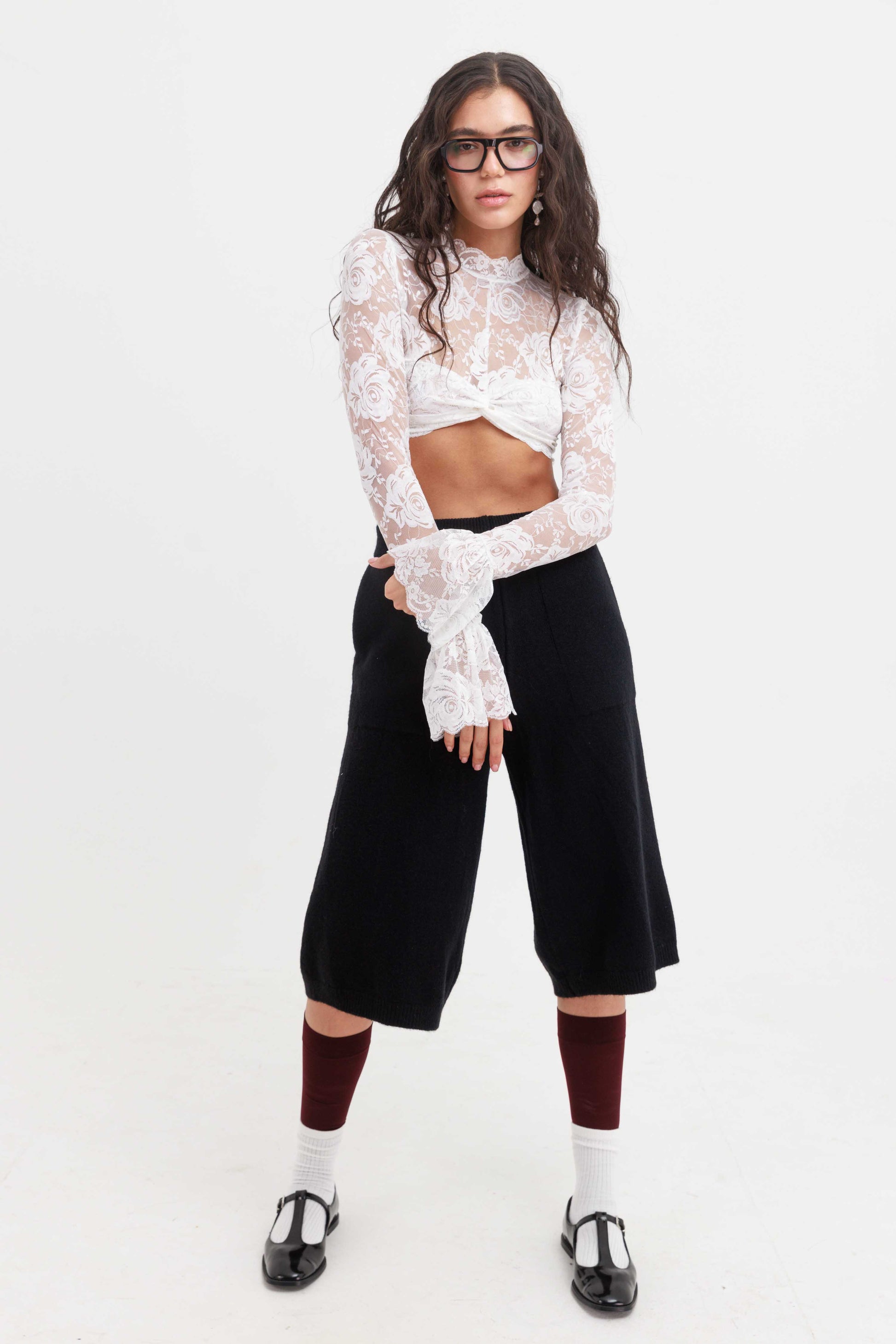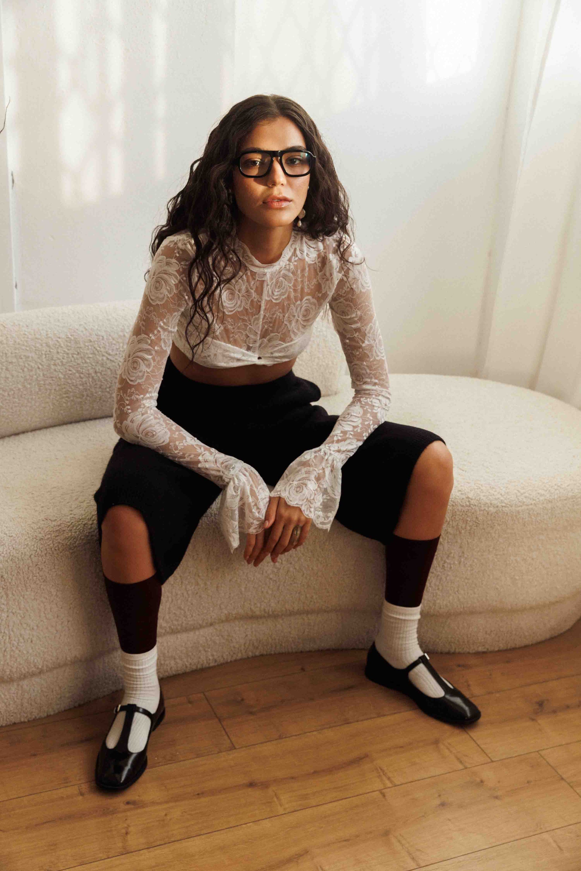 חולצת קרופ צמודה מבד תחרה עם שרוול ארוך עם סיומת מלמלה רחבה, עיטורי פרחים עדינים וכיווצים באזור החזה