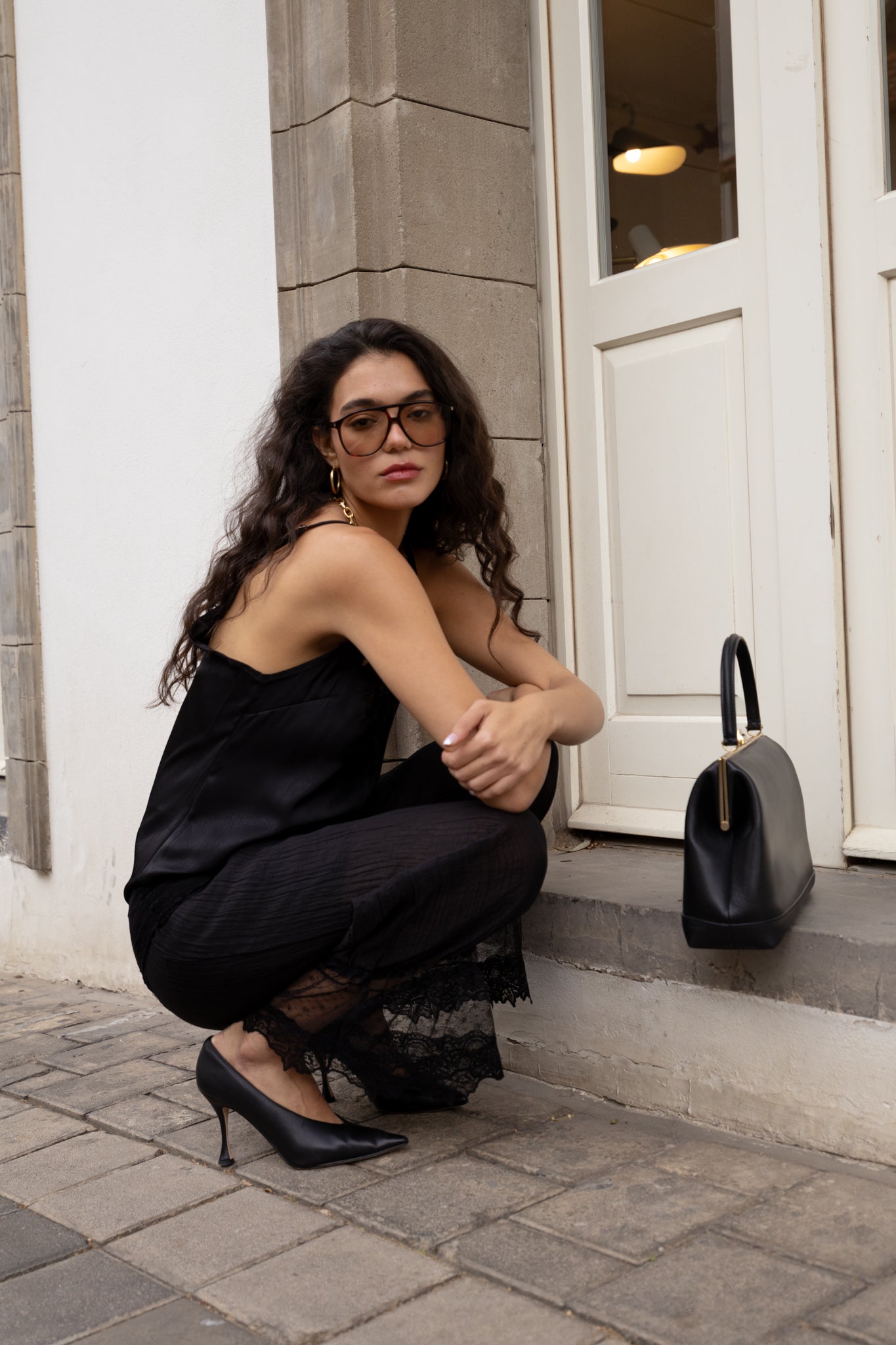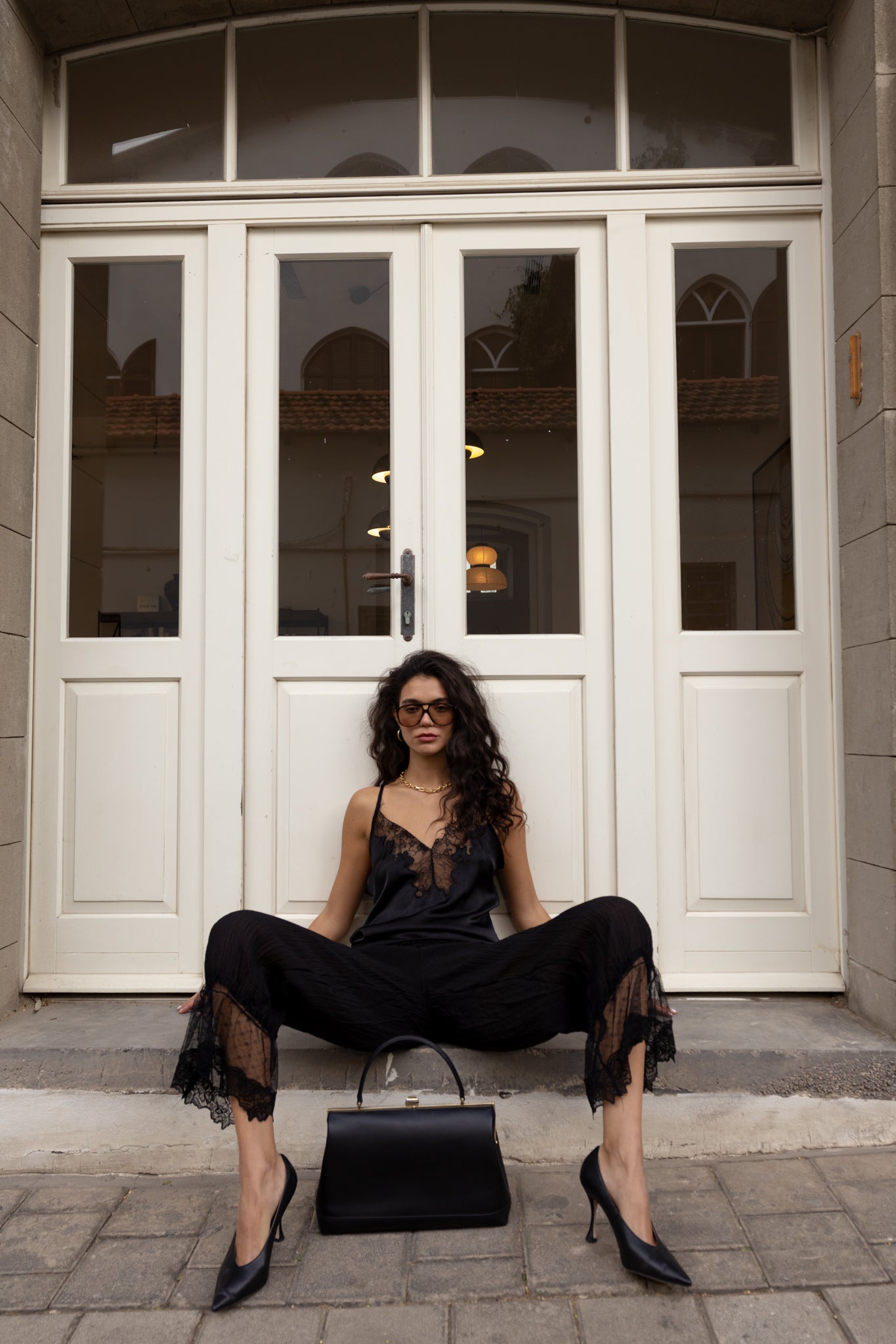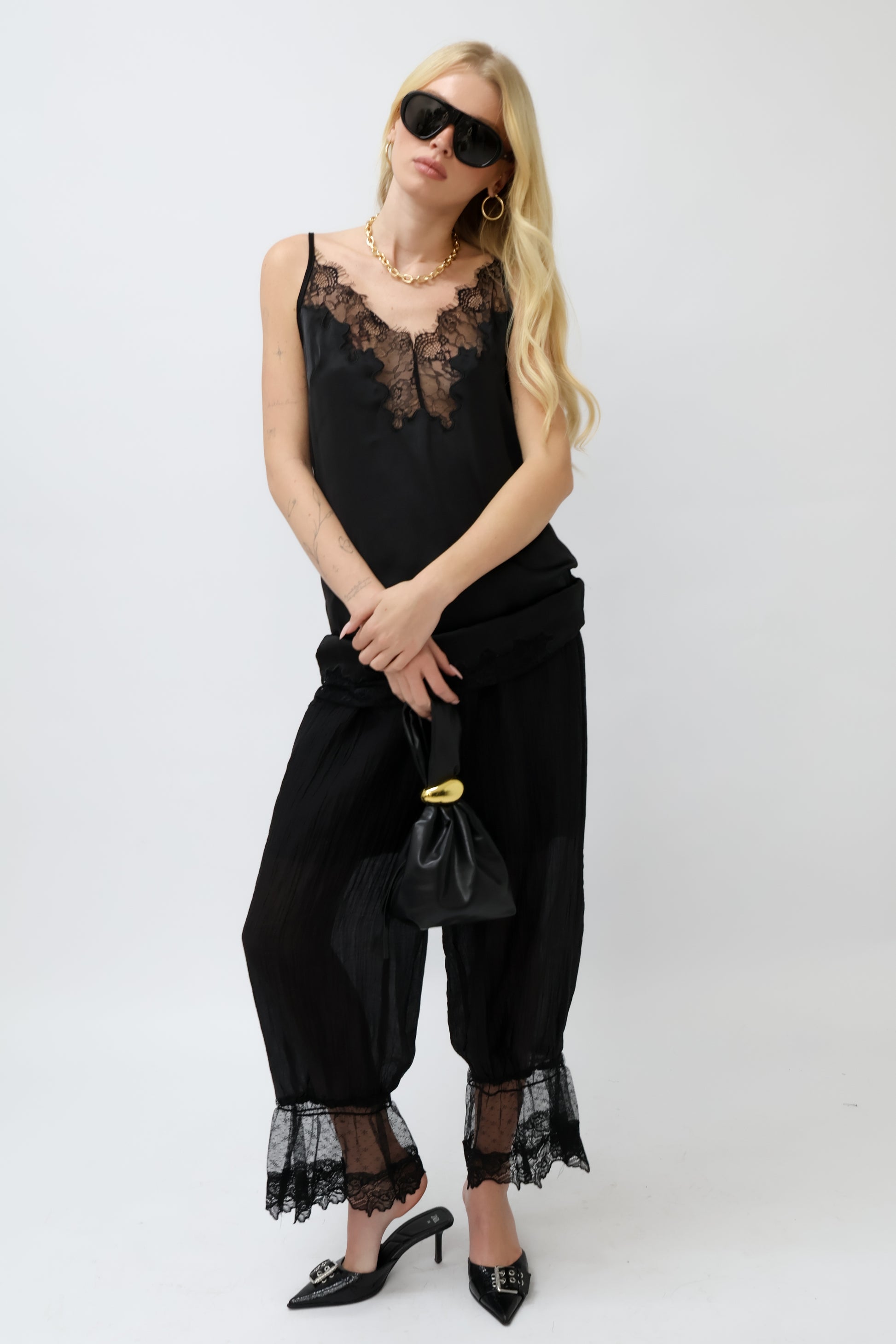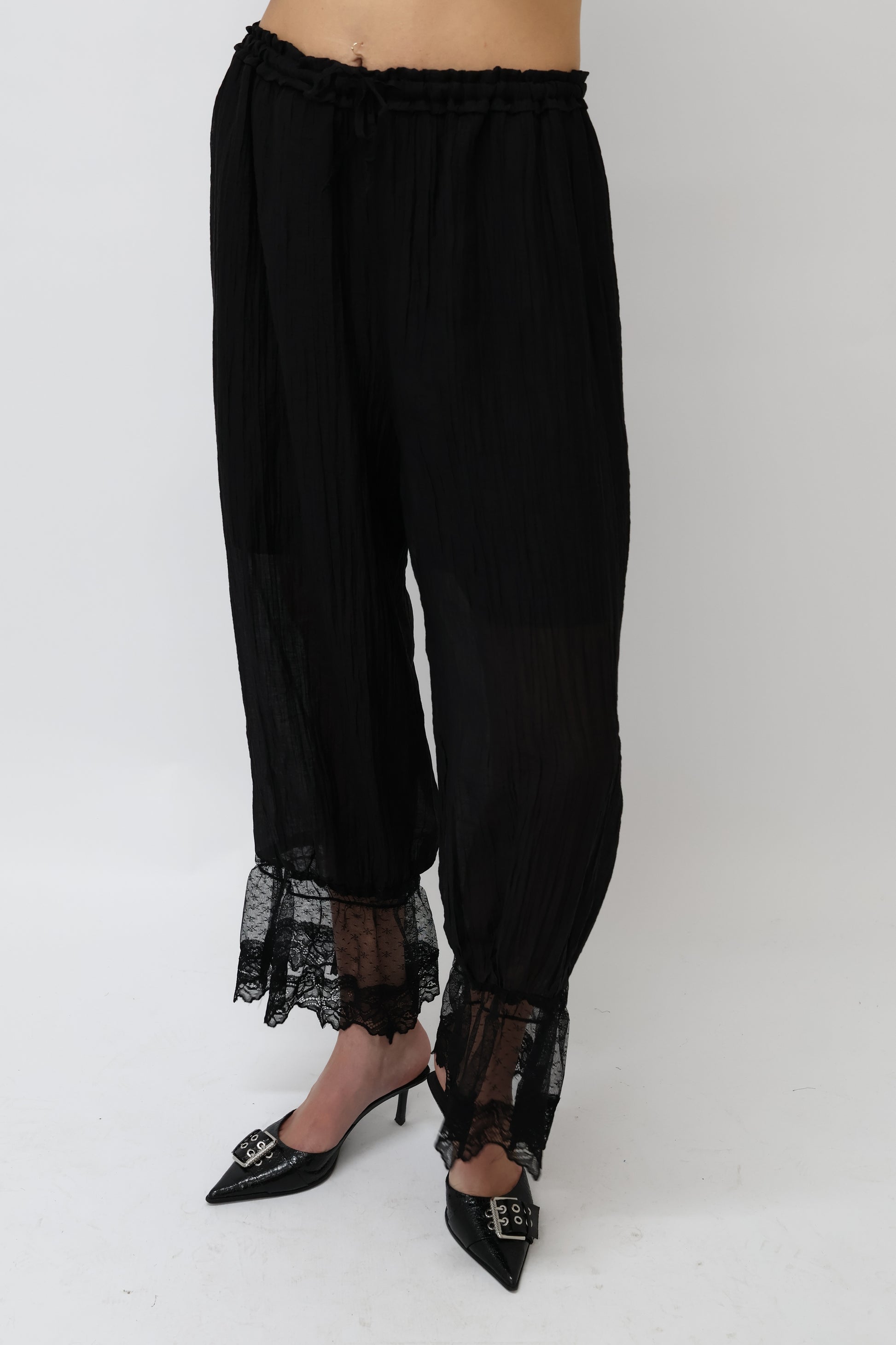 מכנסיים שחורים שקפקפים דקיקים בסגנון בוהו שיק, אורך 7/8 וסיומת תחרה