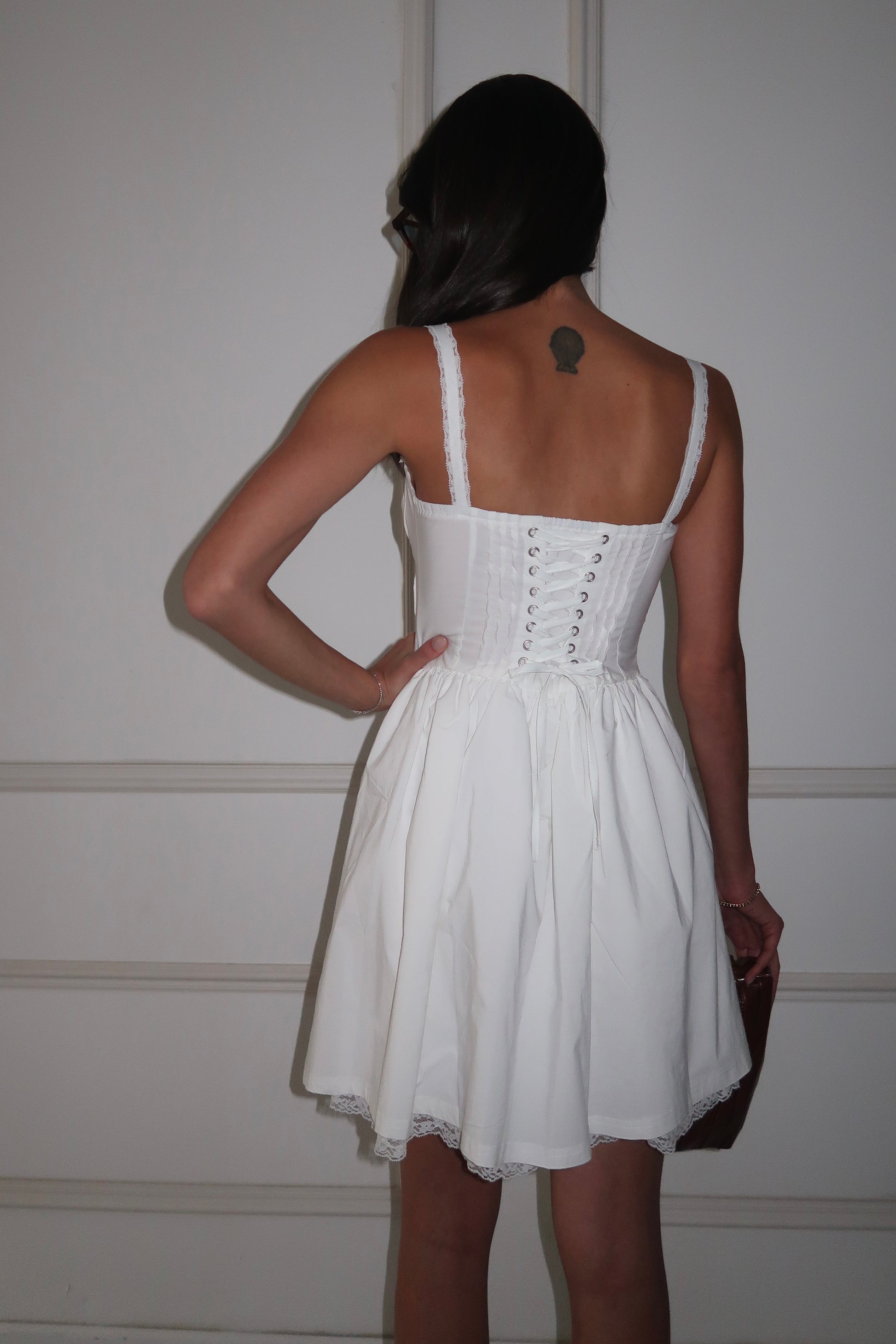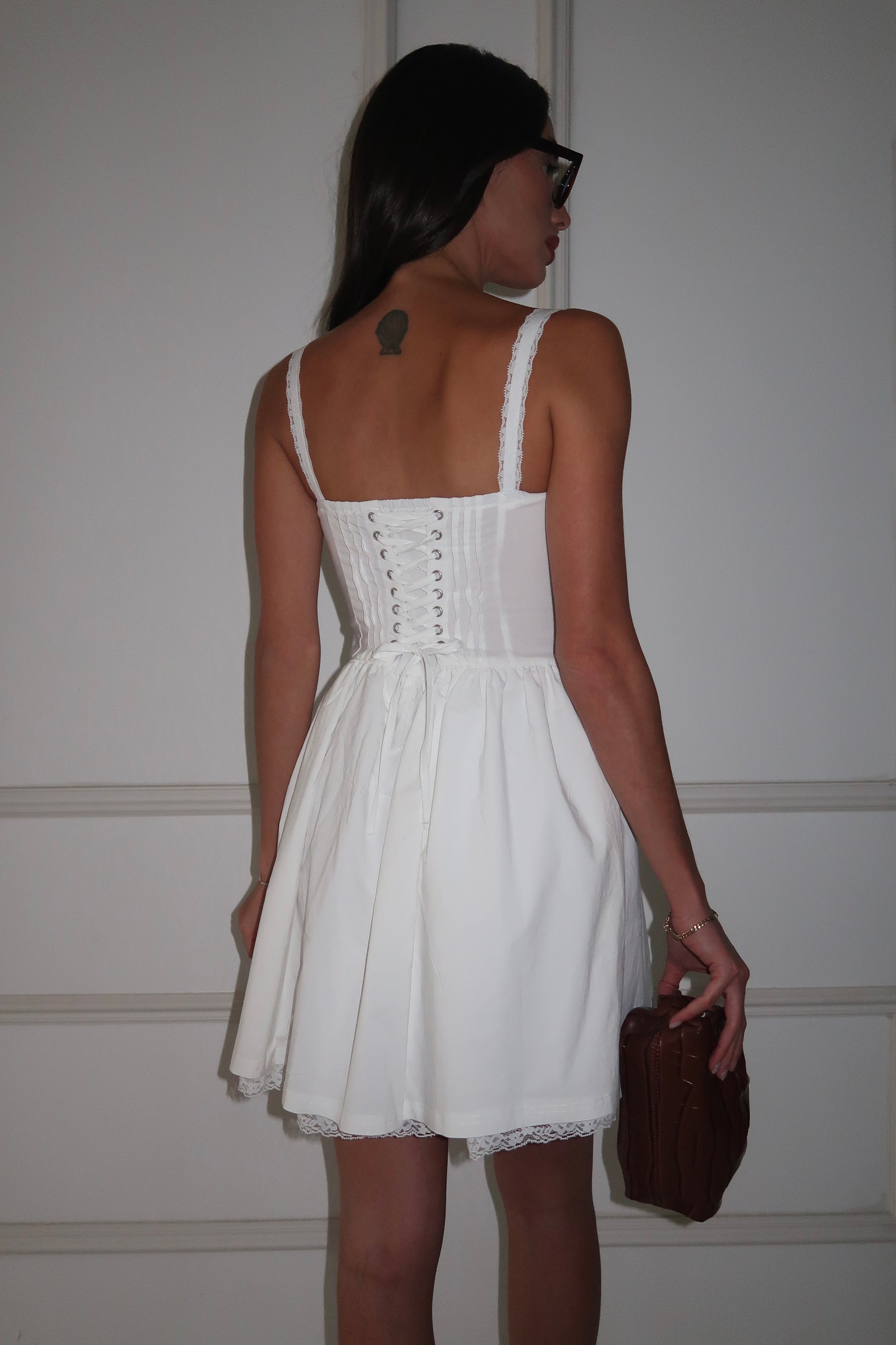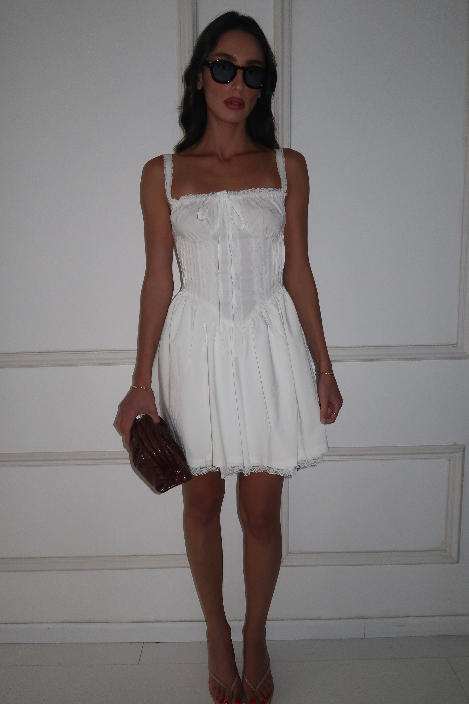 השמלה שכל תשומת הלב עליה. מיני לבנה בגזרת מחוך רכה – חגיגית, נועזת ומדויקת. 🤍