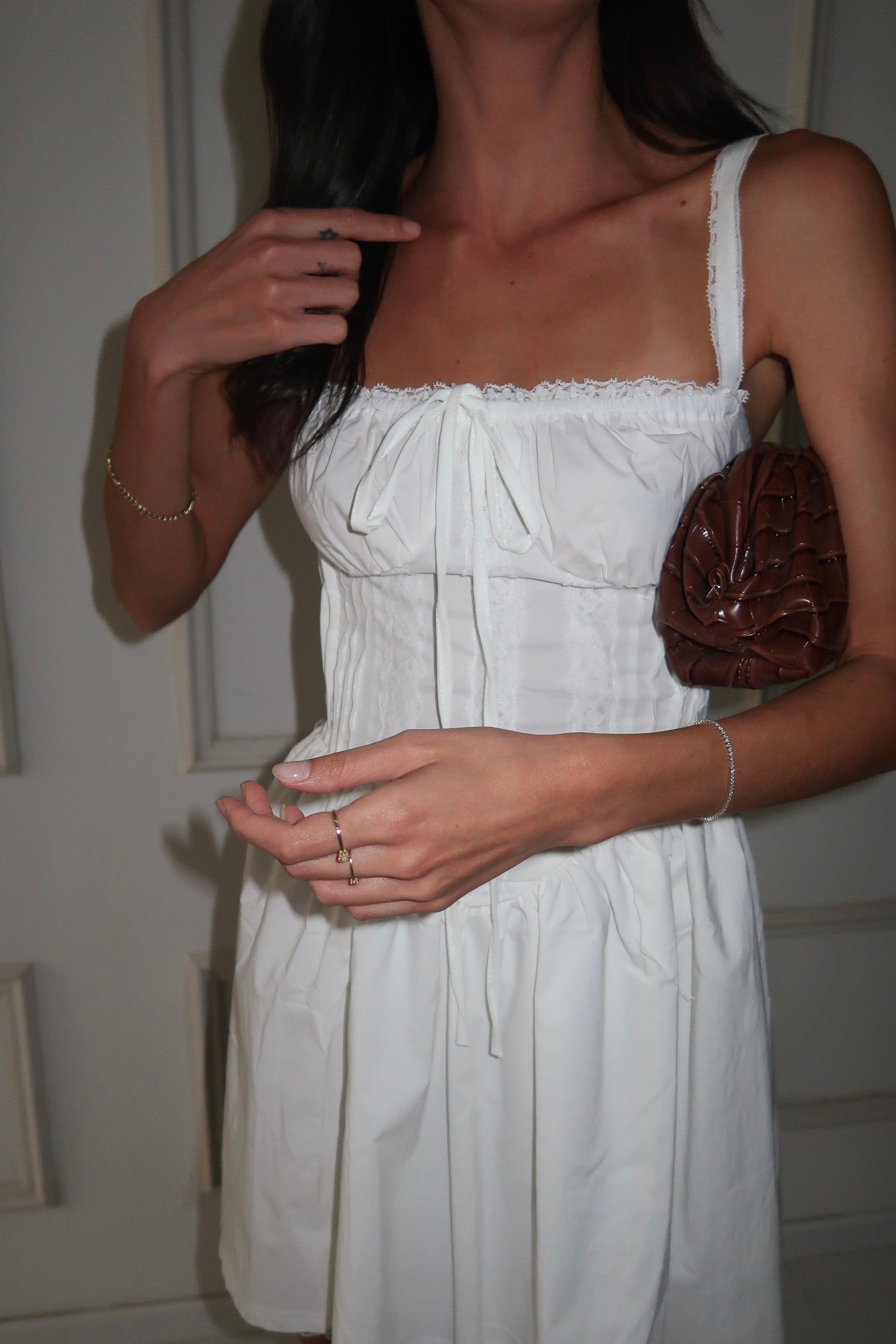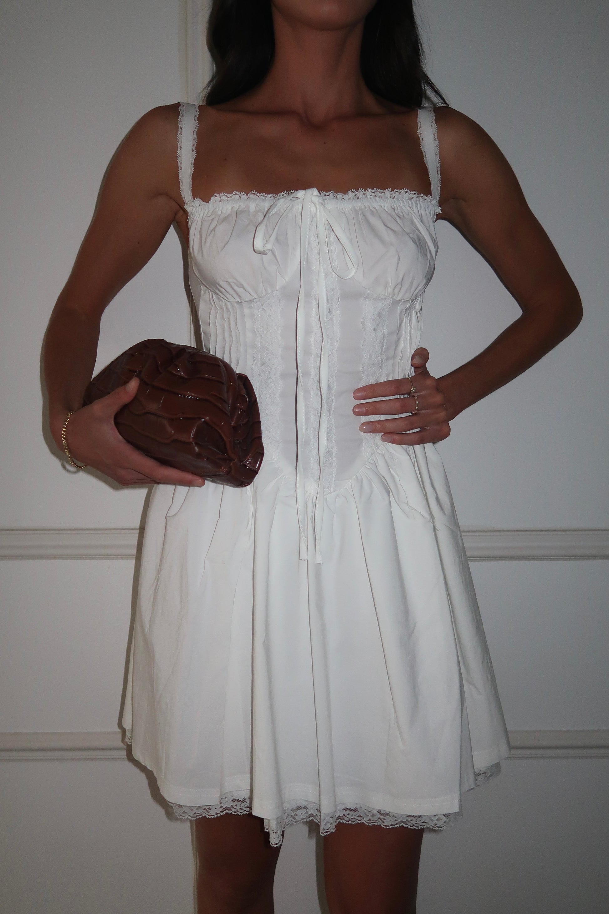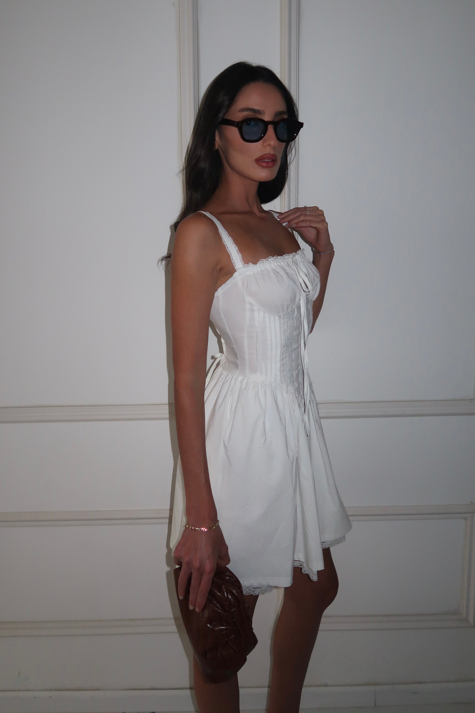 השמלה שכל תשומת הלב עליה. מיני לבנה בגזרת מחוך רכה – חגיגית, נועזת ומדויקת. 🤍